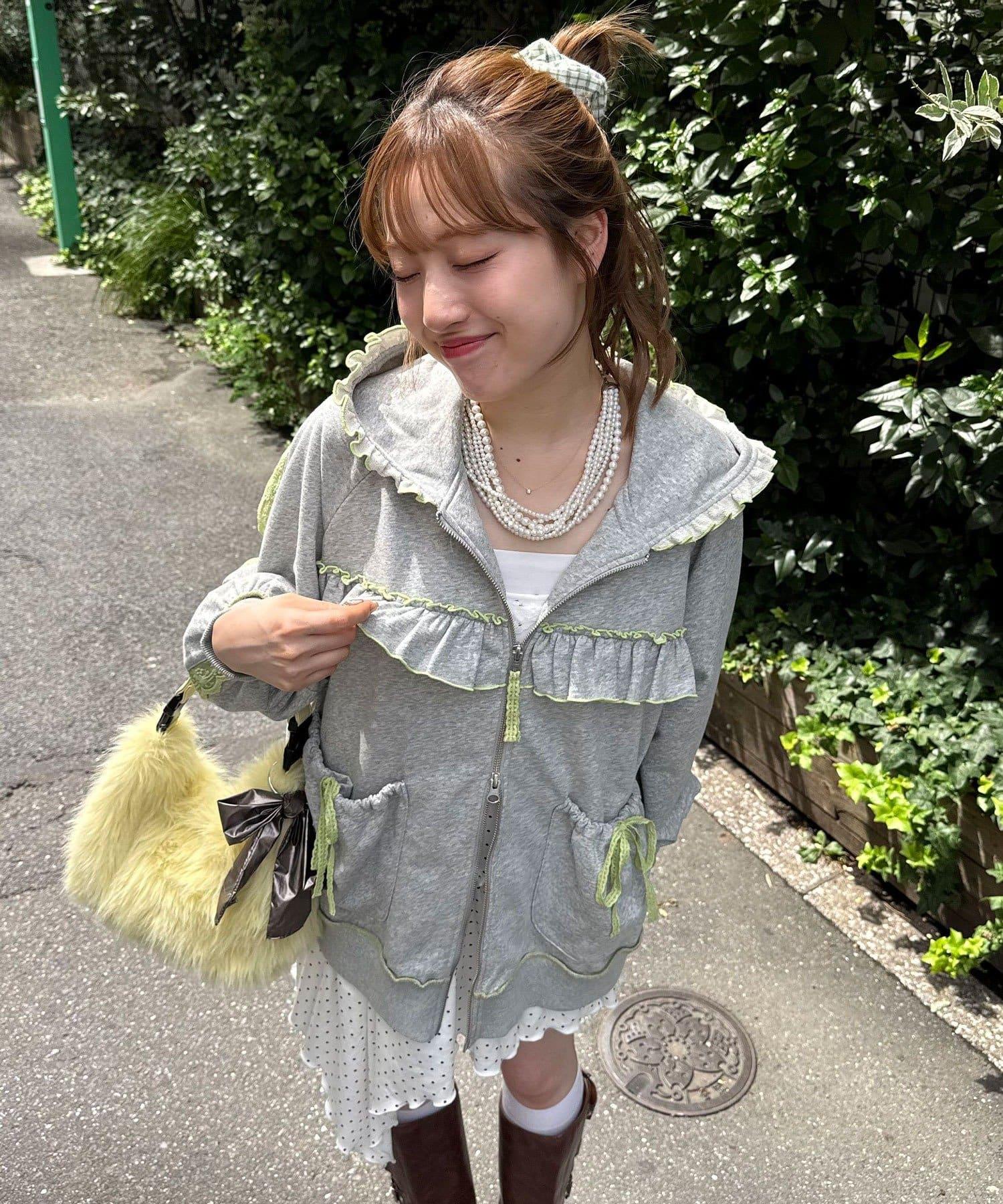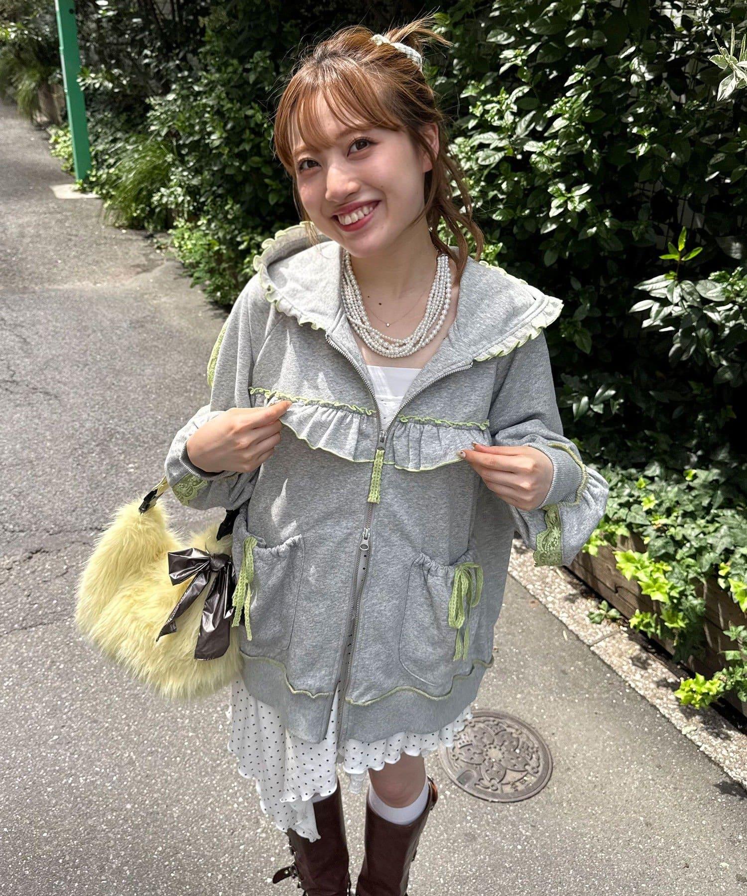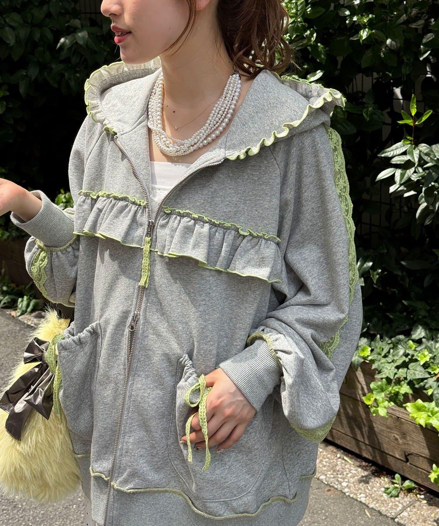 一款甜美的休閒連帽外套,採用運動衫面料,帶有流蘇和蕾絲裝飾。