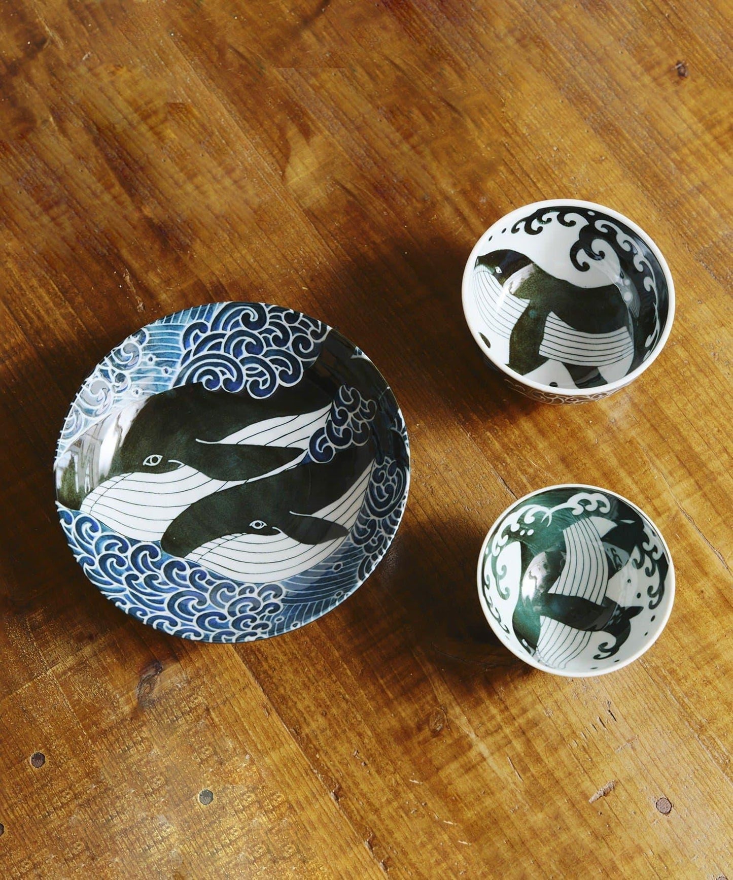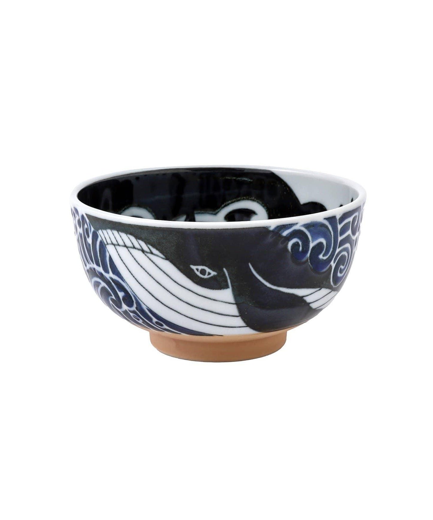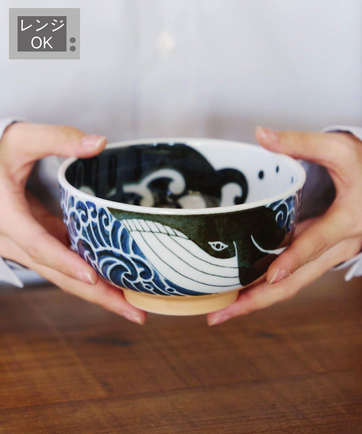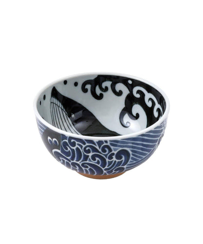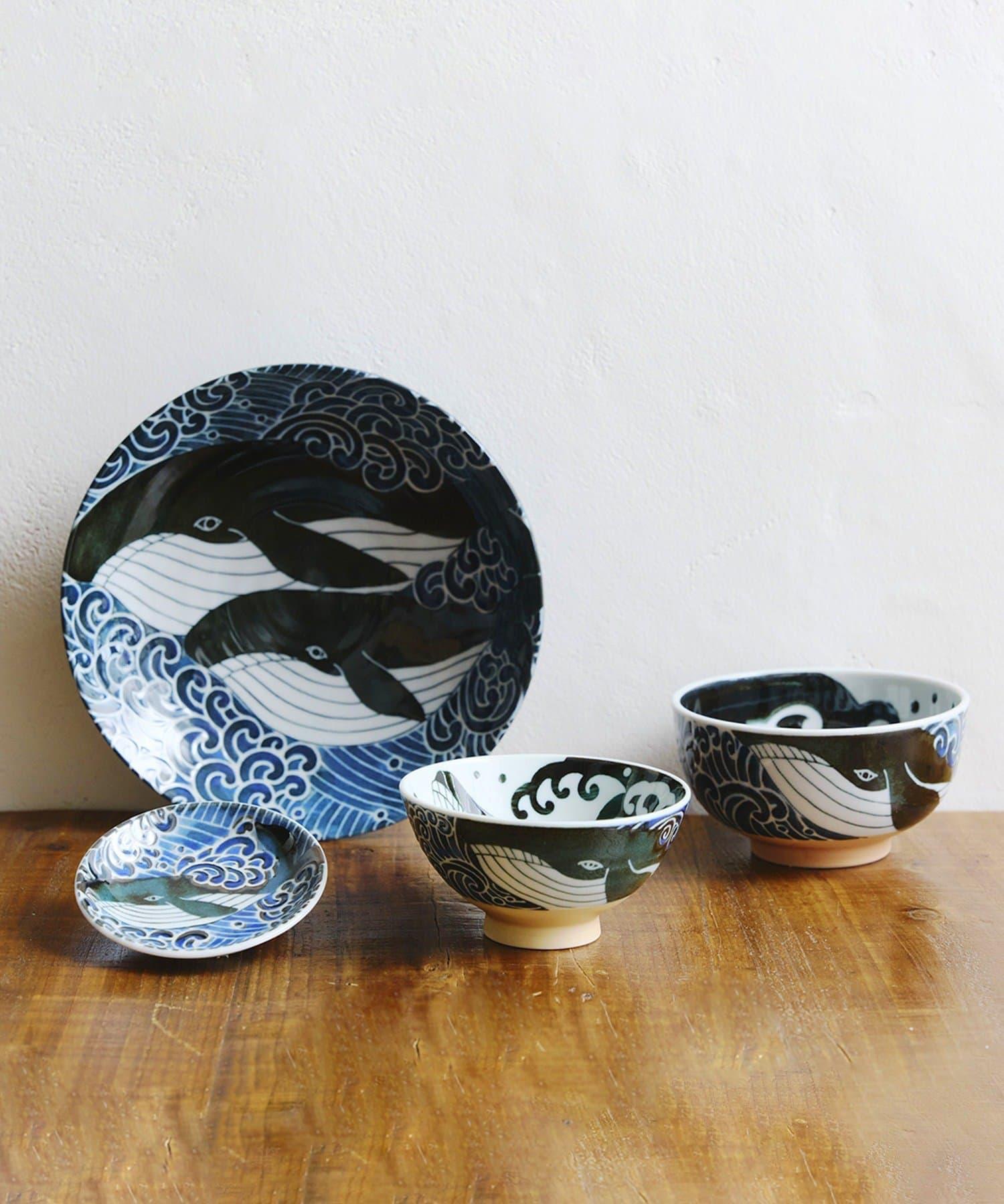 碗的裝飾是一條鯨魚在靛藍色的大海中暢遊。