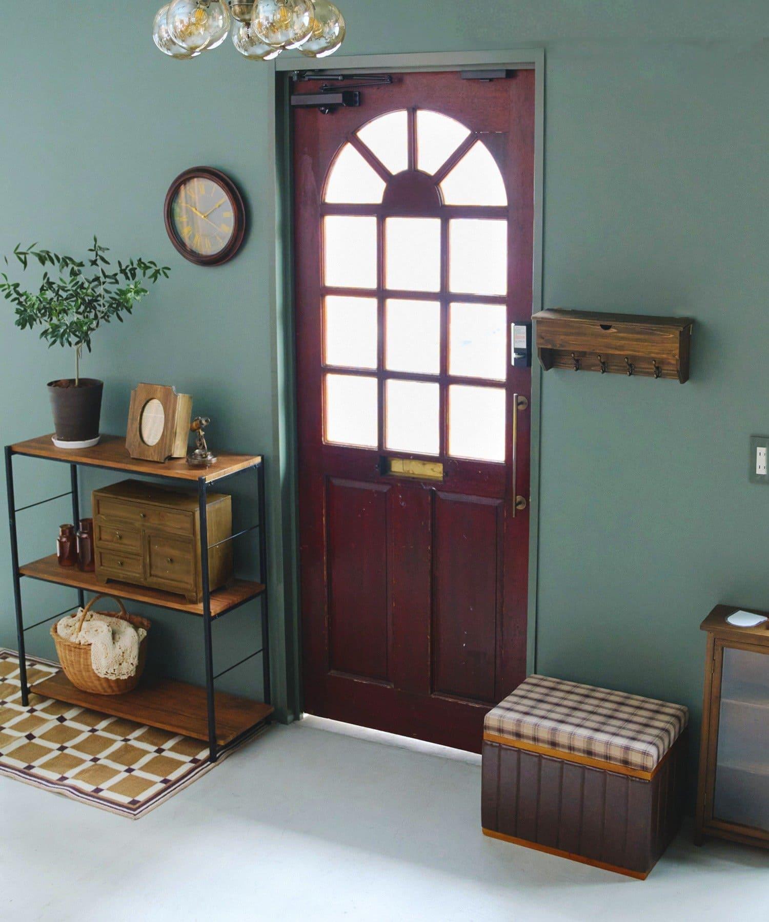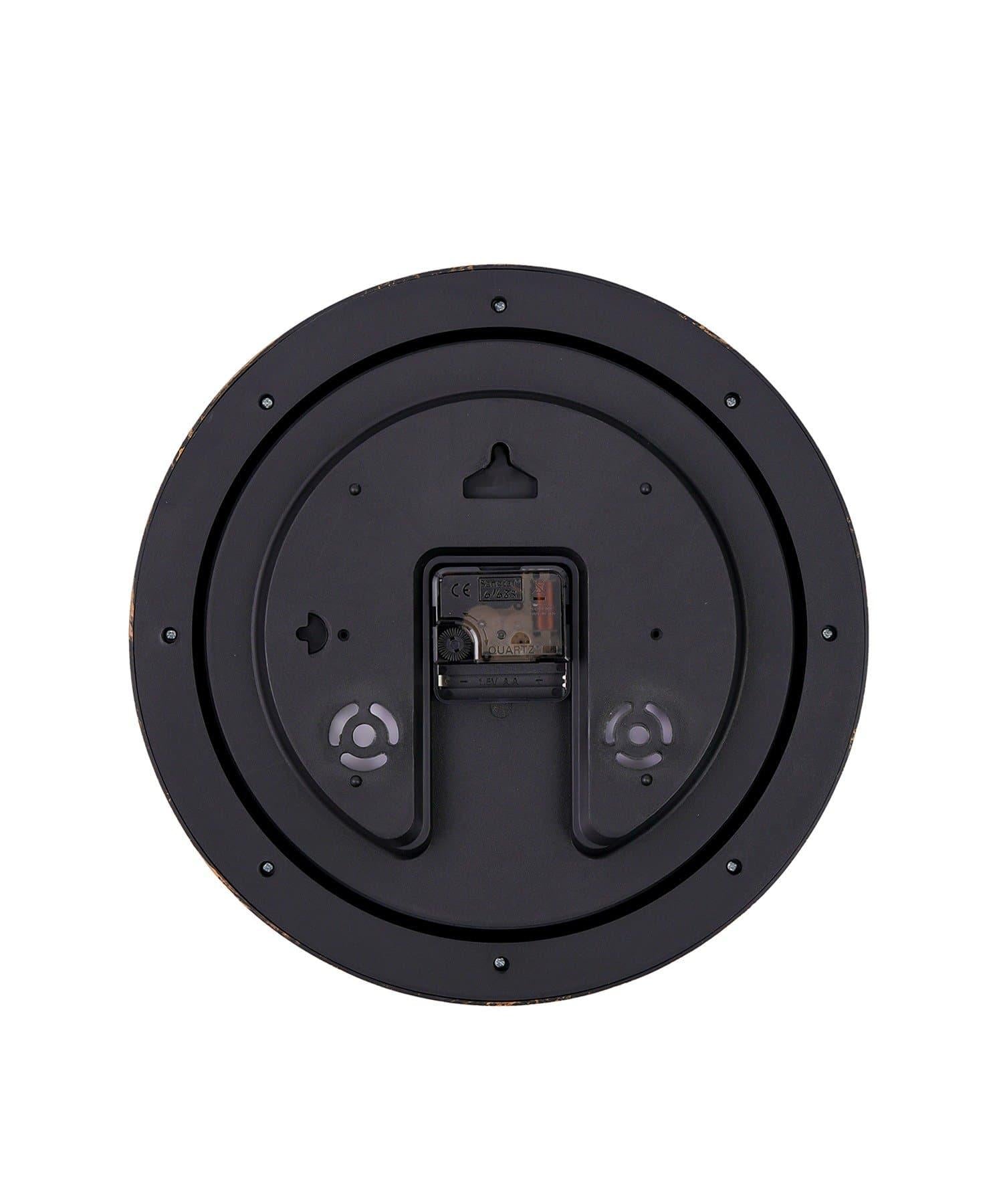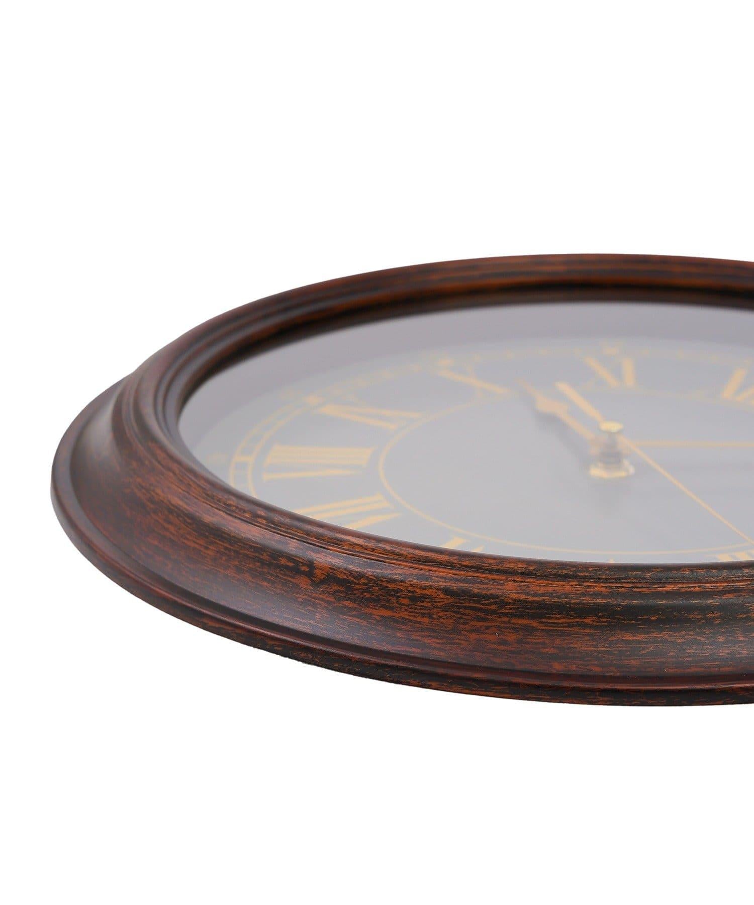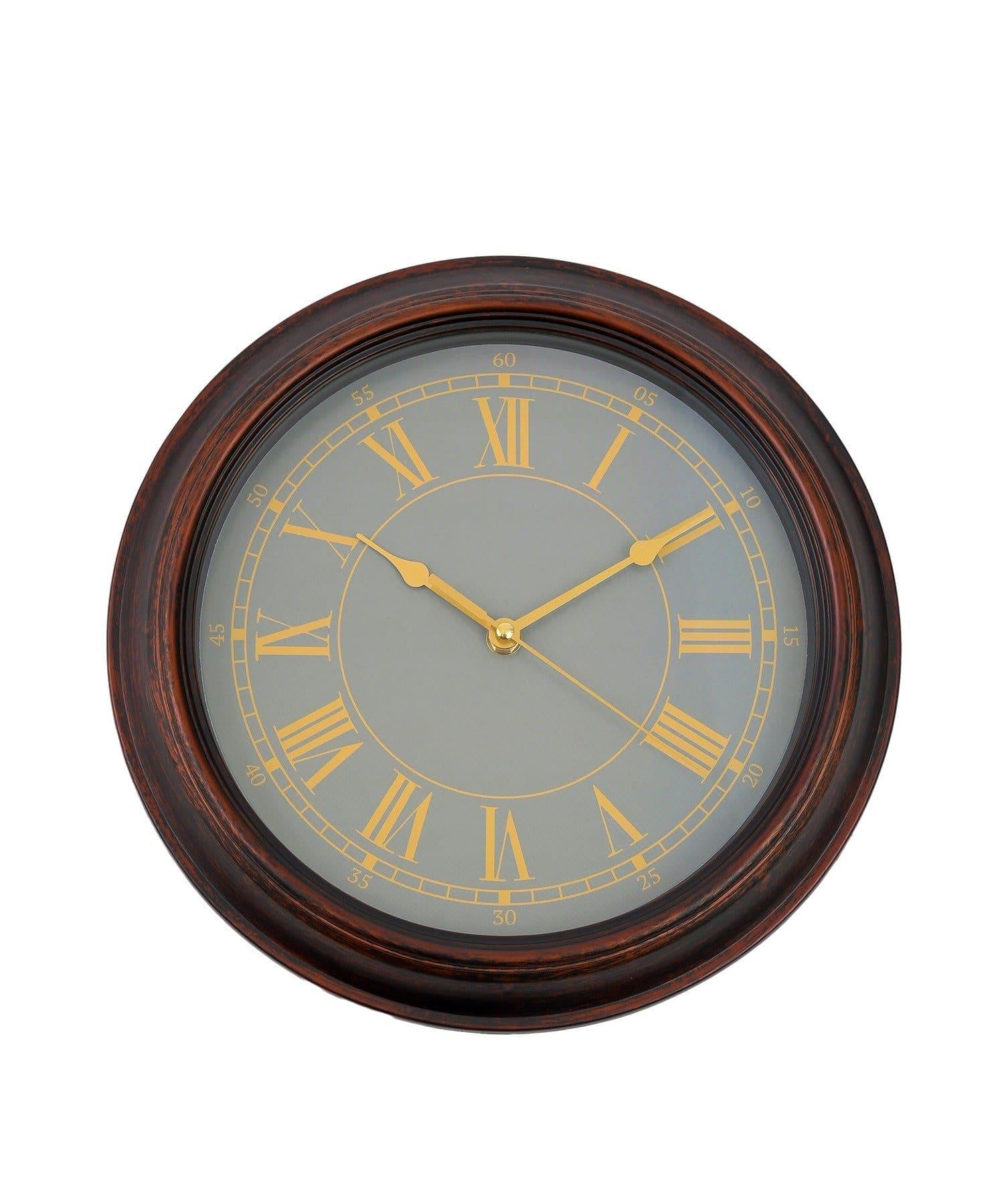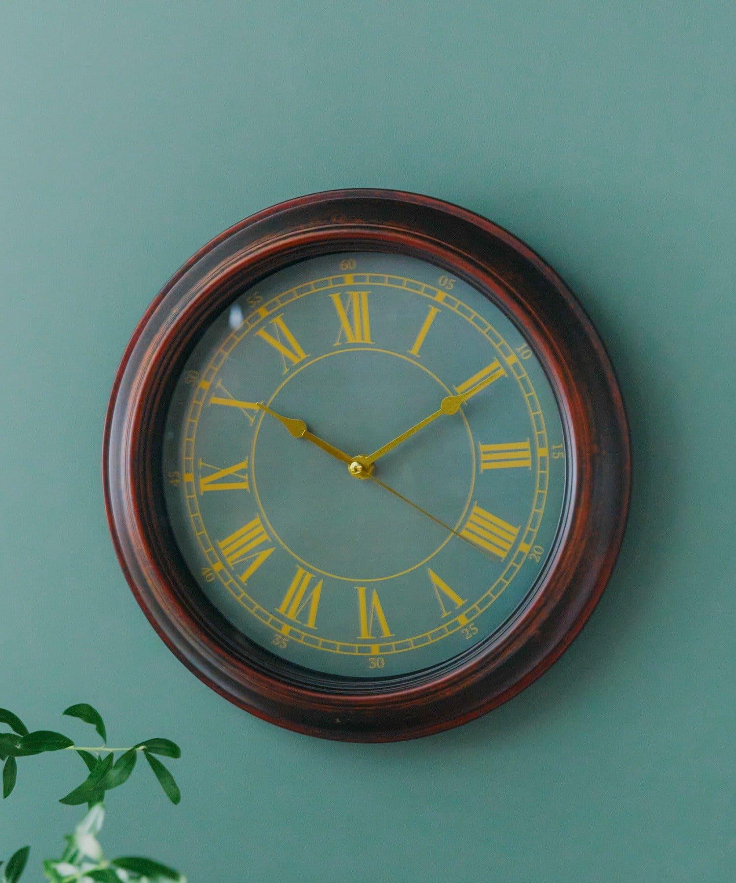 這款古董風格的掛鐘擁有沉穩的棕色框架和深綠色錶盤。