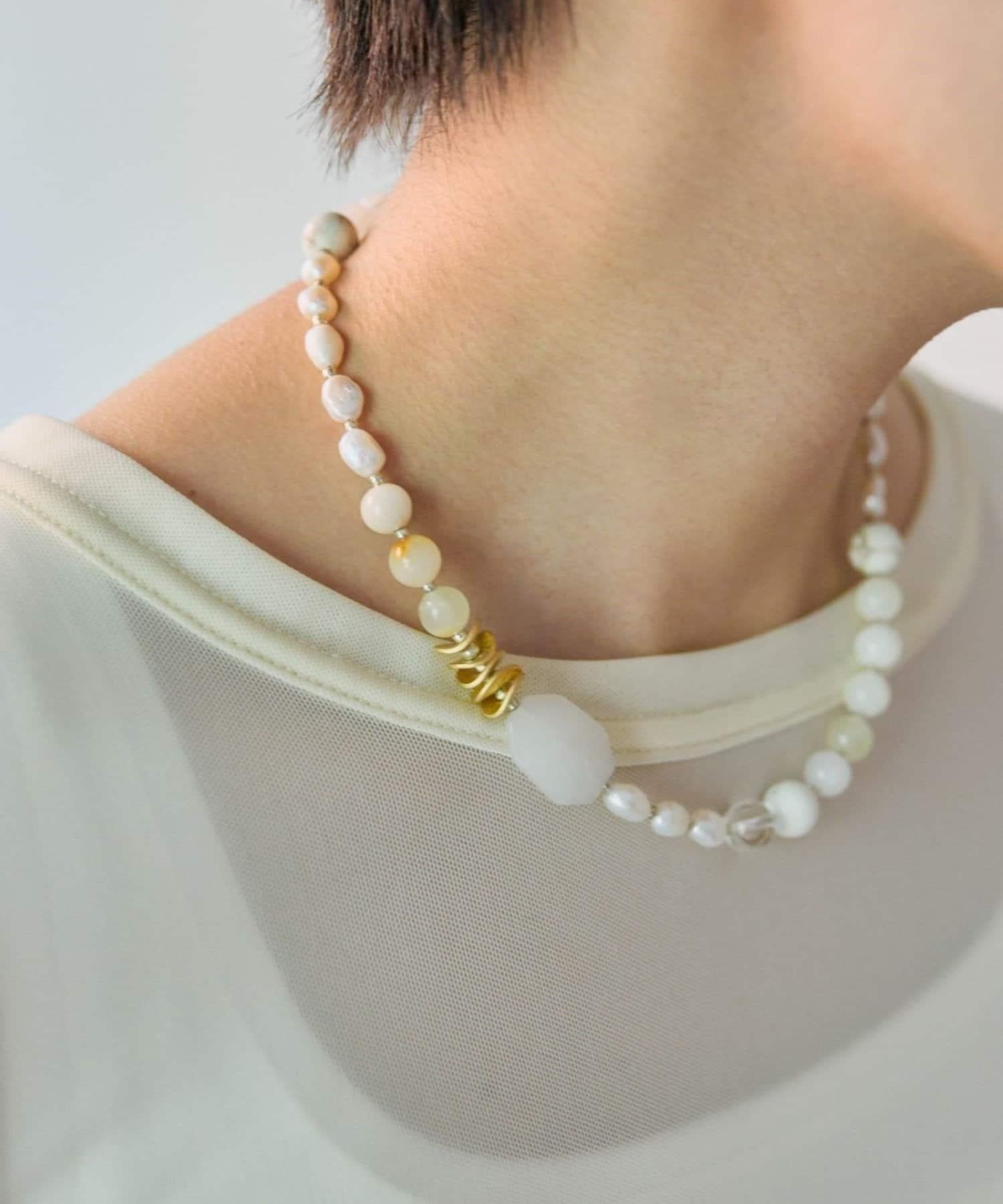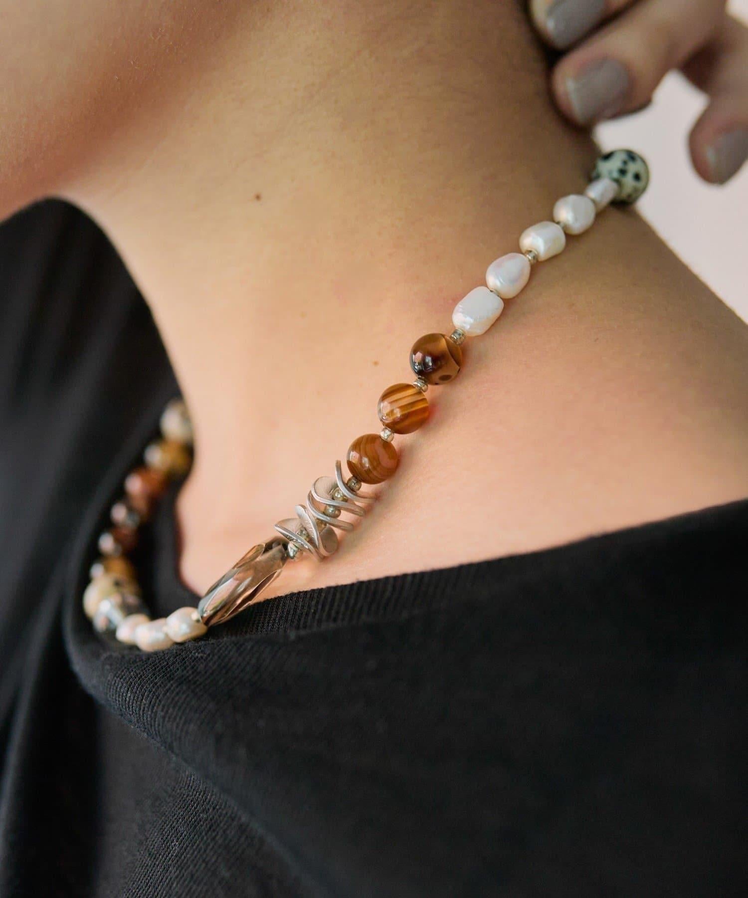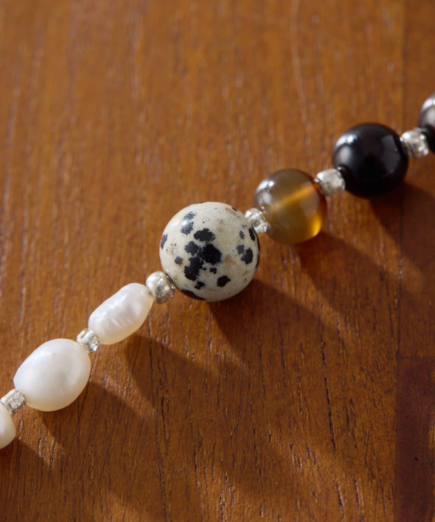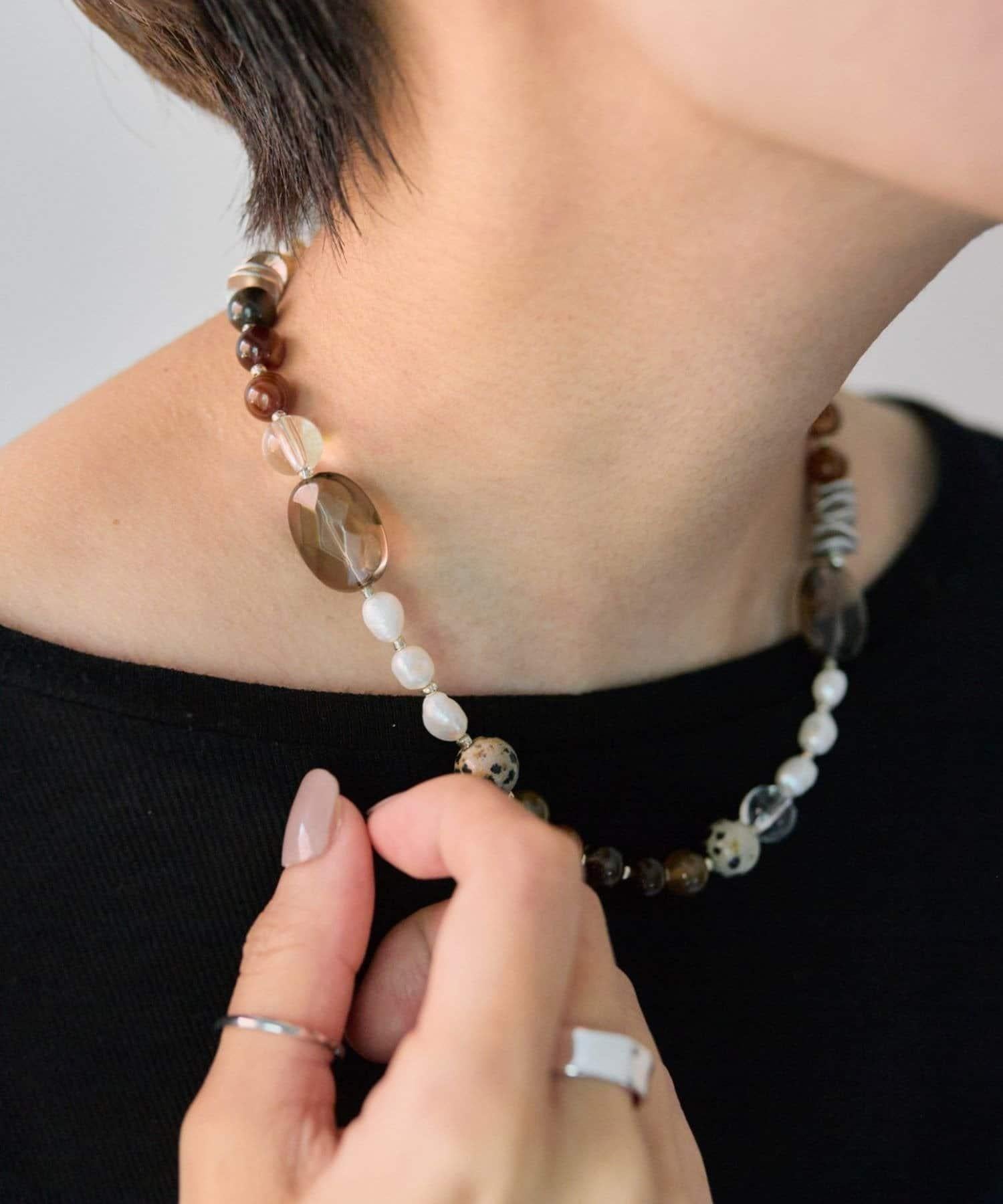 天然寶石的自然花紋和珍珠的柔和光澤是項鍊的亮點。