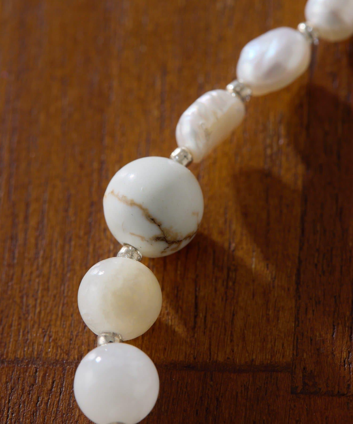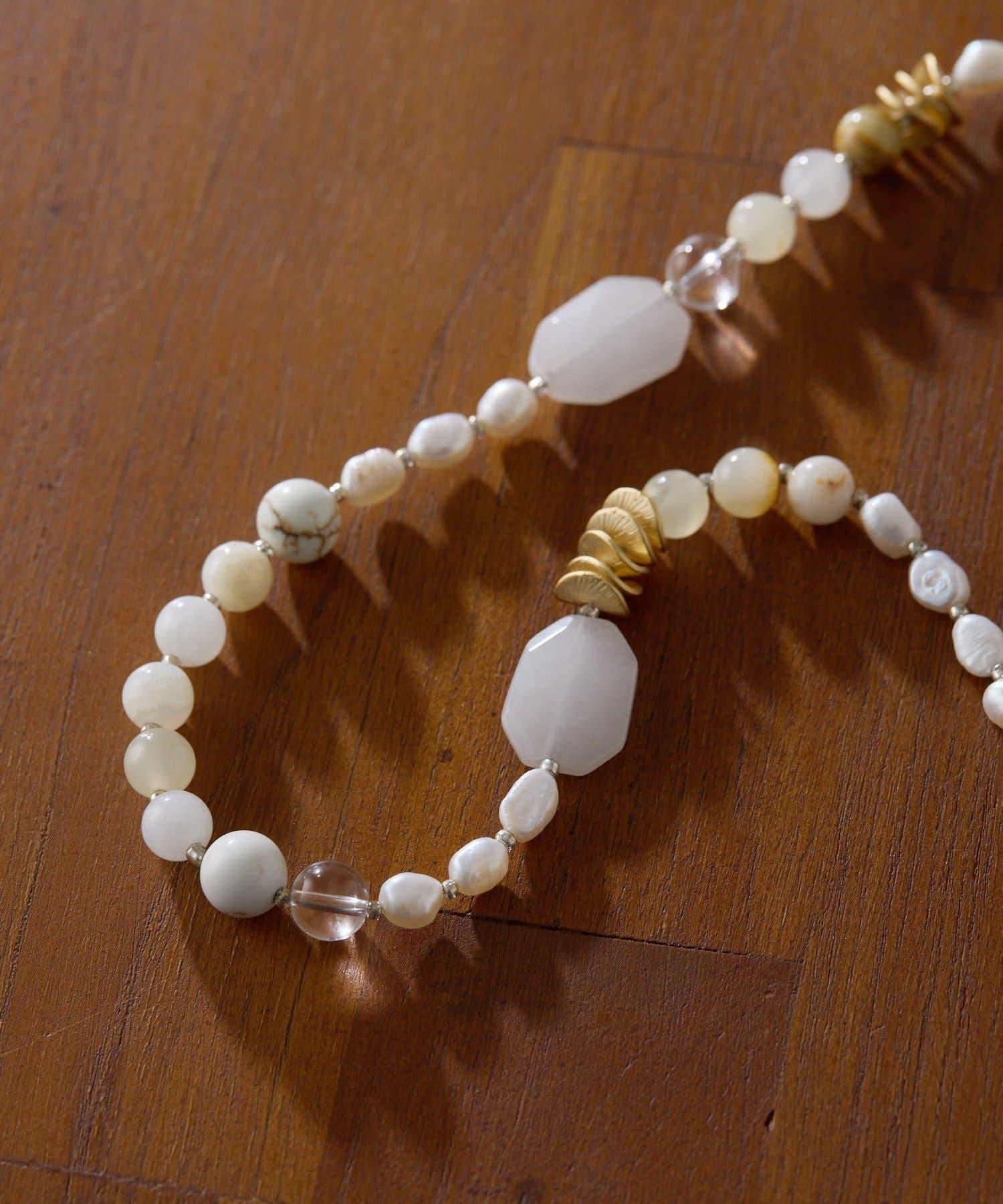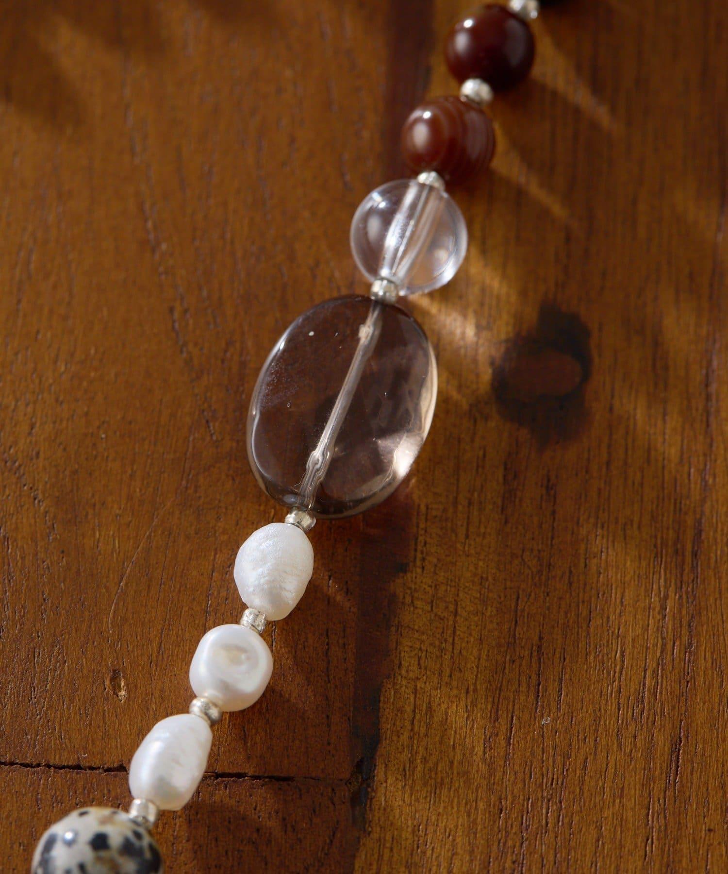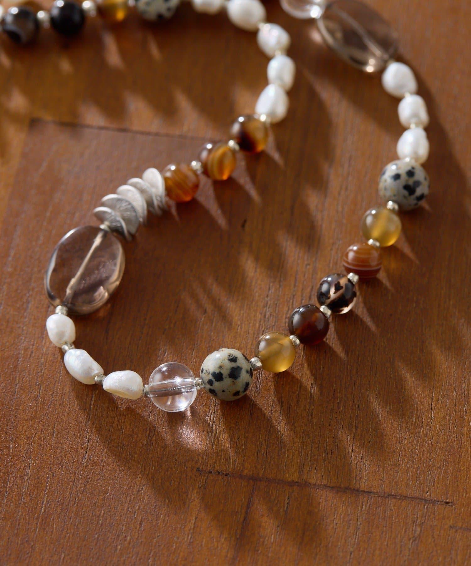 天然寶石的自然花紋和珍珠的柔和光澤是項鍊的亮點。