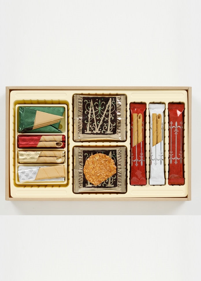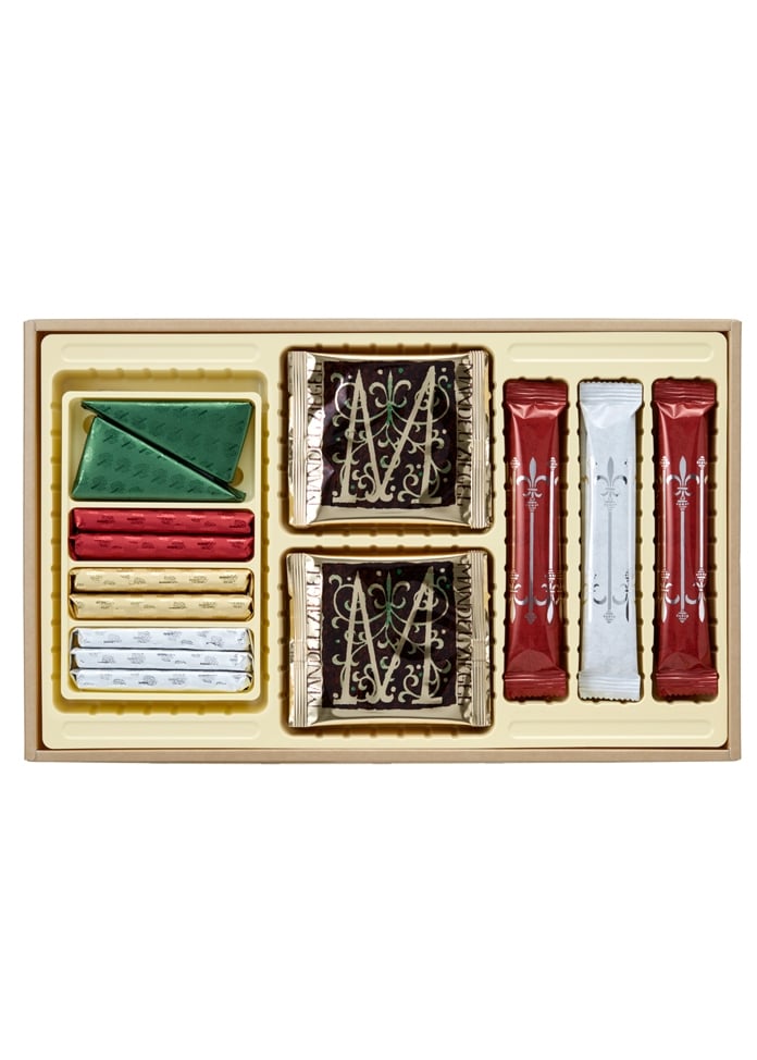 內容或固體含量和總含量 [Ecorse] 4包3個三角形,6包2條,圓形(4包2個牛奶巧克力,4包2個白巧克力) [Mandelchiegel] 10塊 [Monrois] 6包2個杏仁,3包2個榛子,盒子尺寸:250 x 403 x 77 mm,重量 :804g