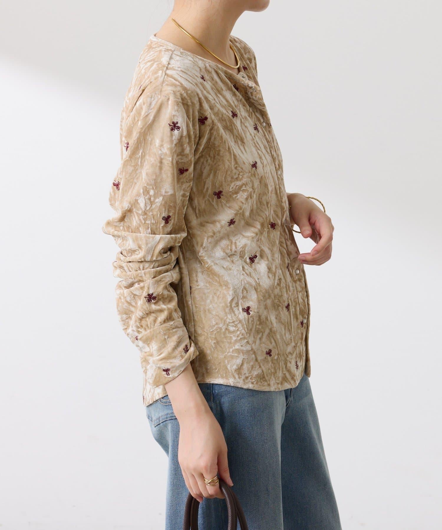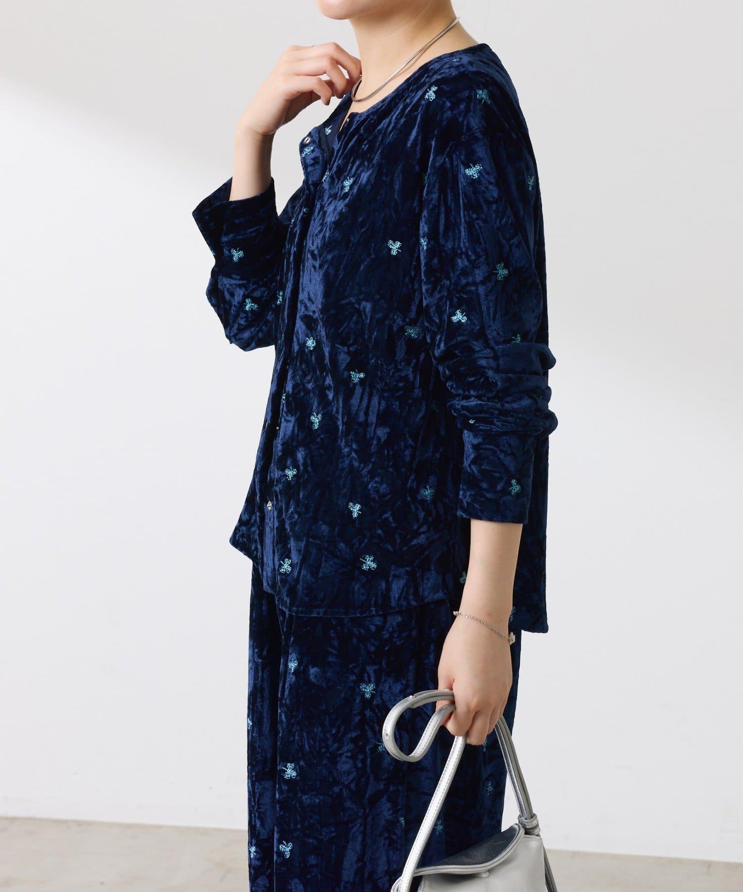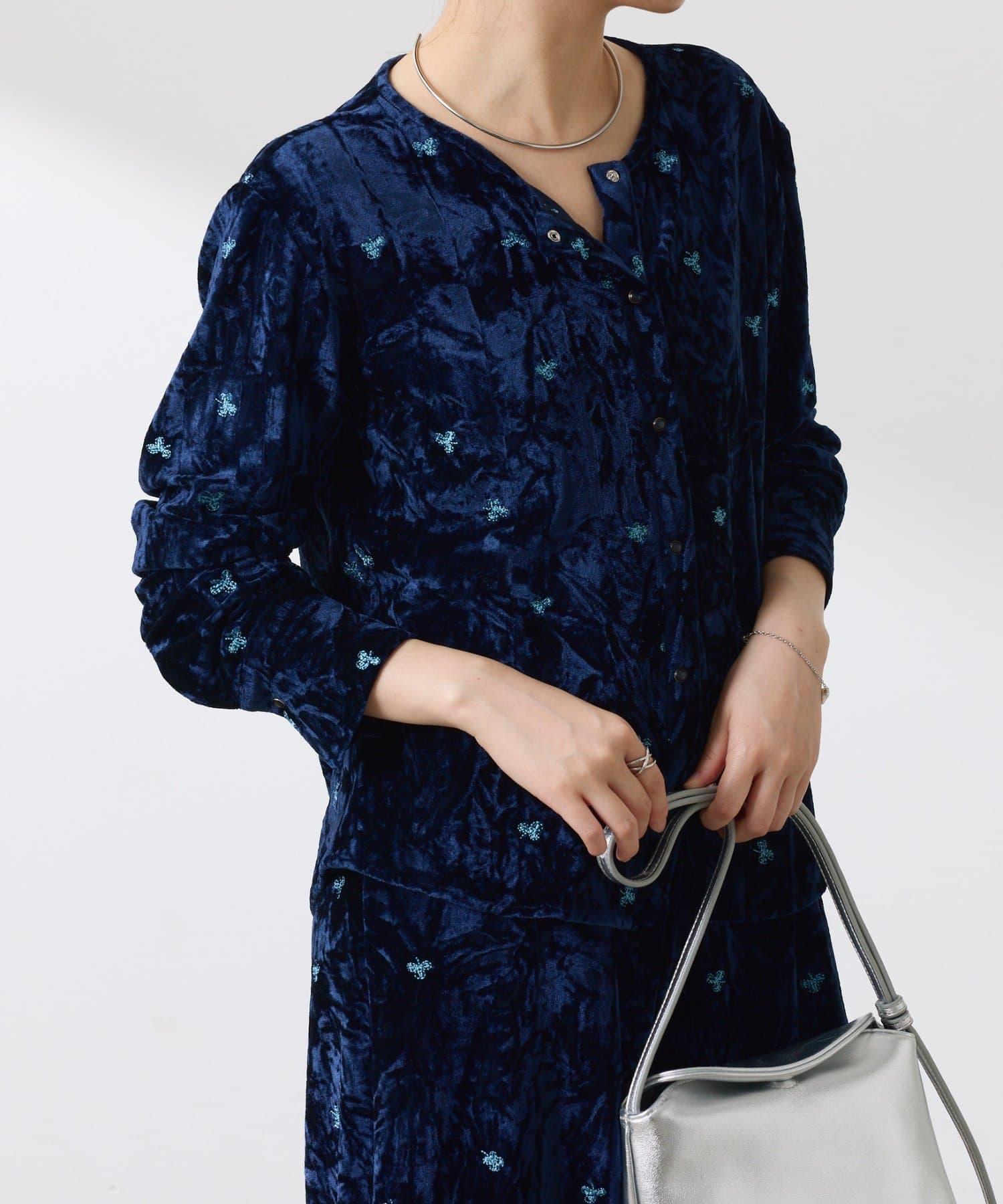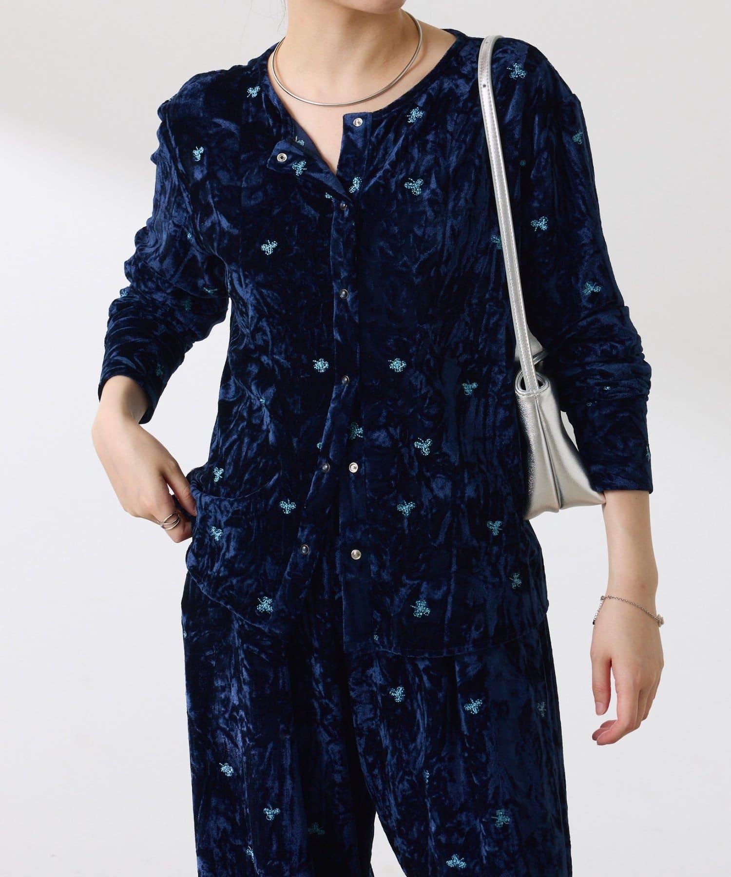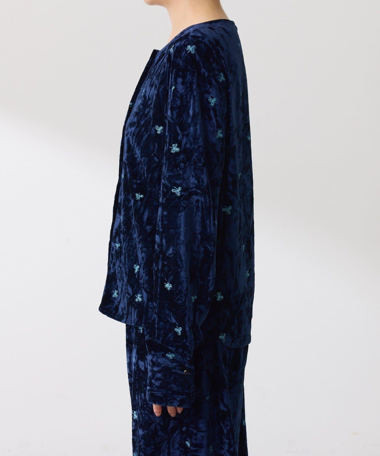 這款開衫採用碎絲絨面料,與其他開衫不同。