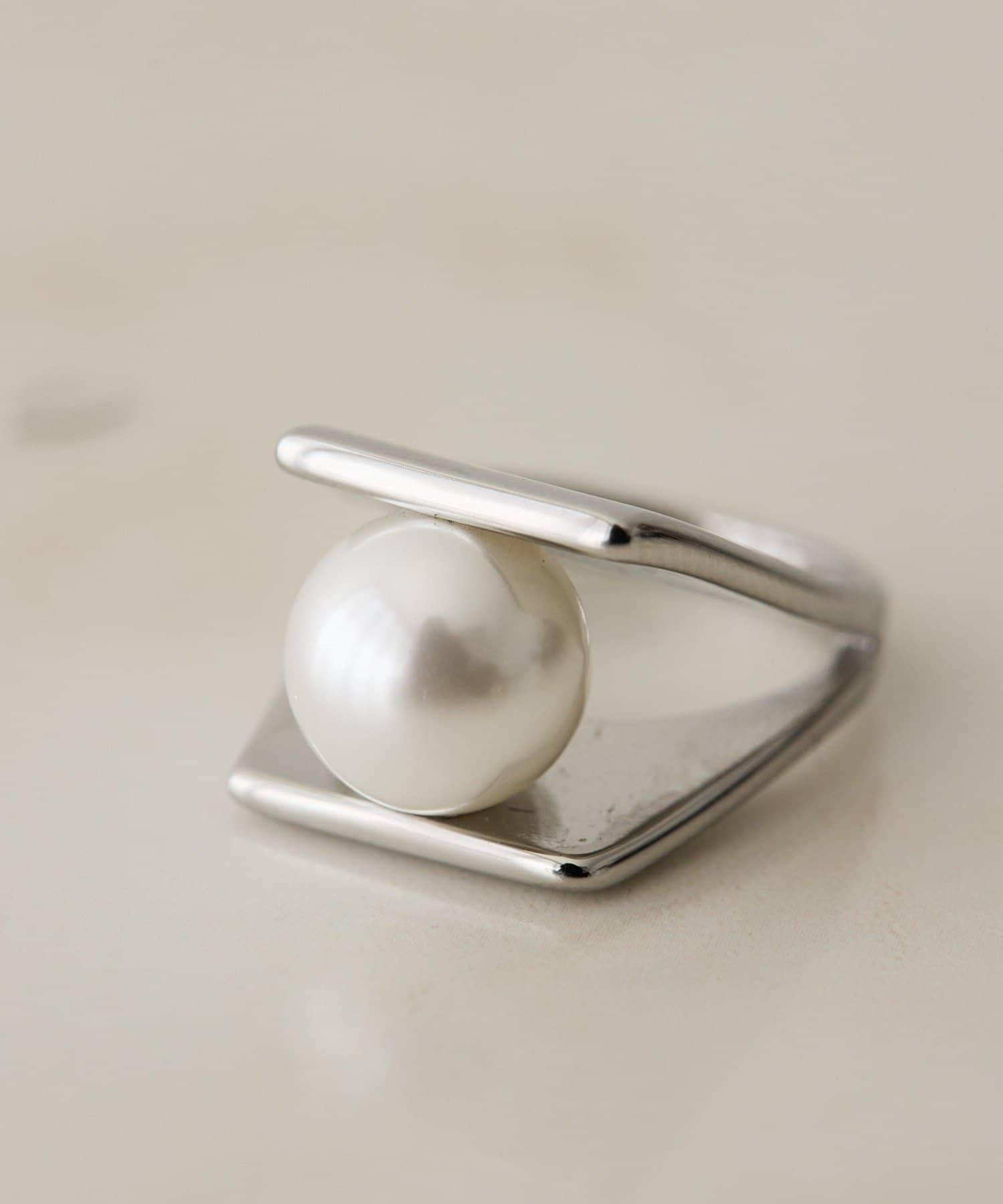 這是一款具有現代藝術元素的戒指,在板狀戒指之間夾著大顆珍珠。