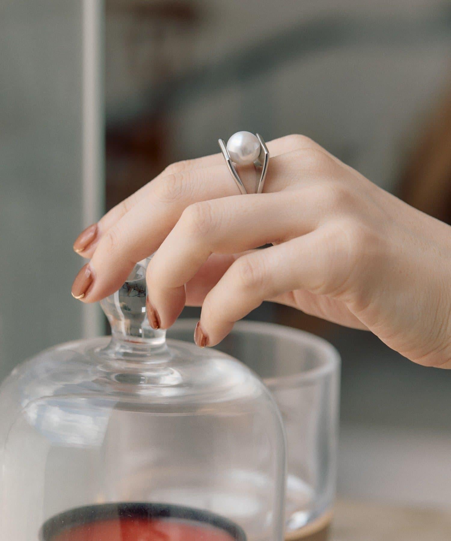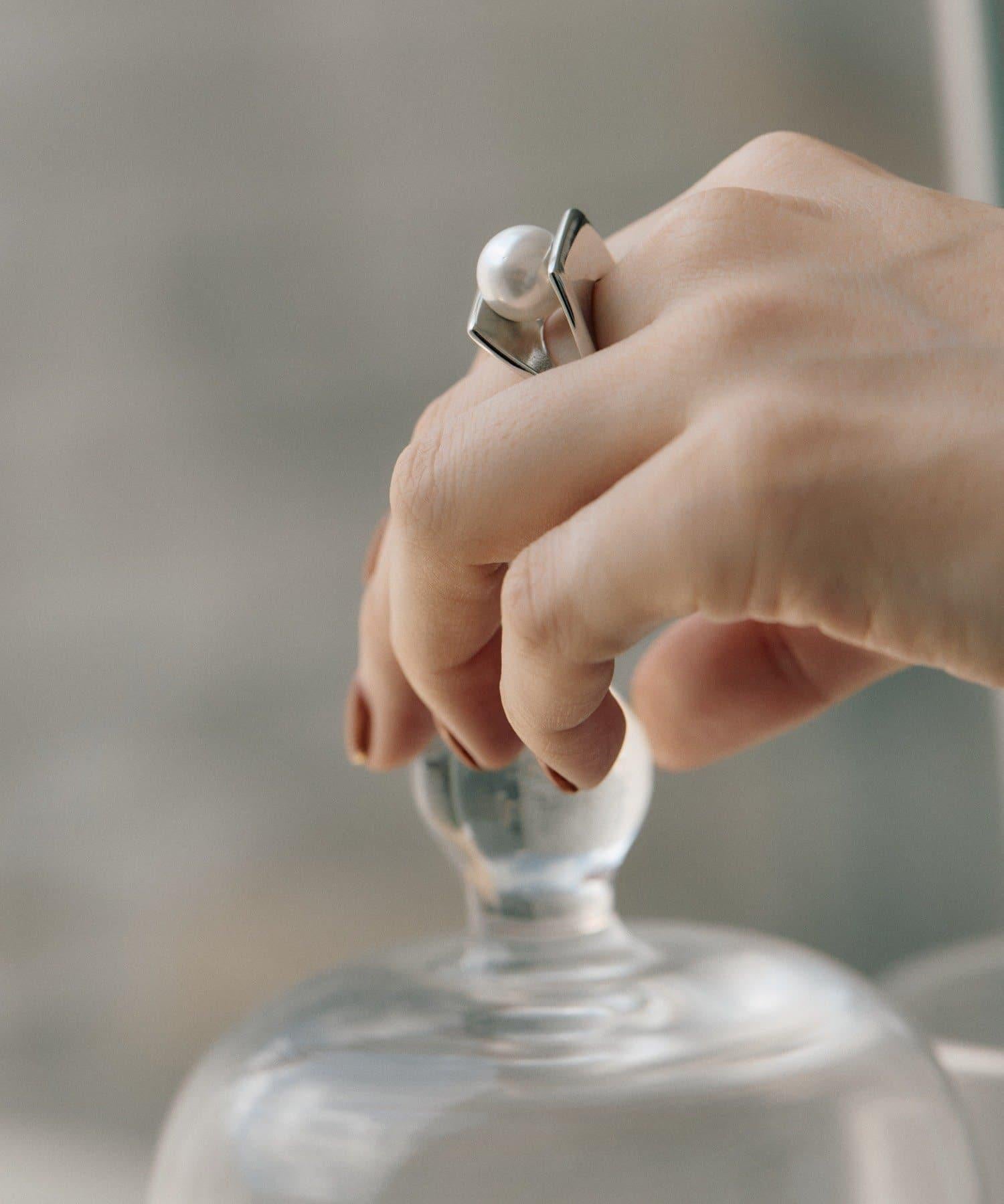 大顆珍珠大膽地夾在板狀戒指之間,為手部增添了精緻的點綴。