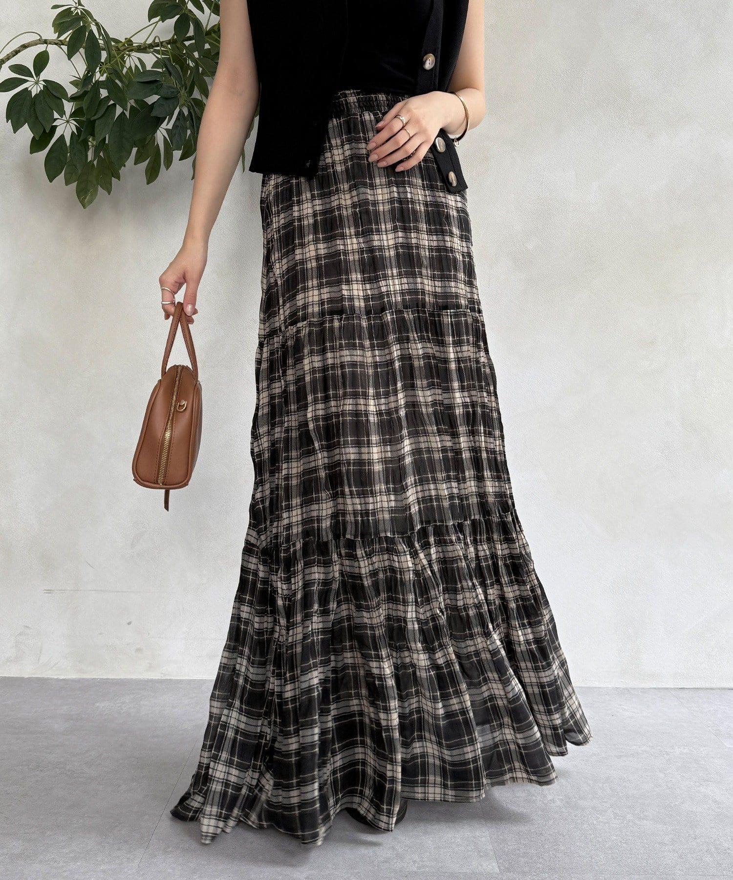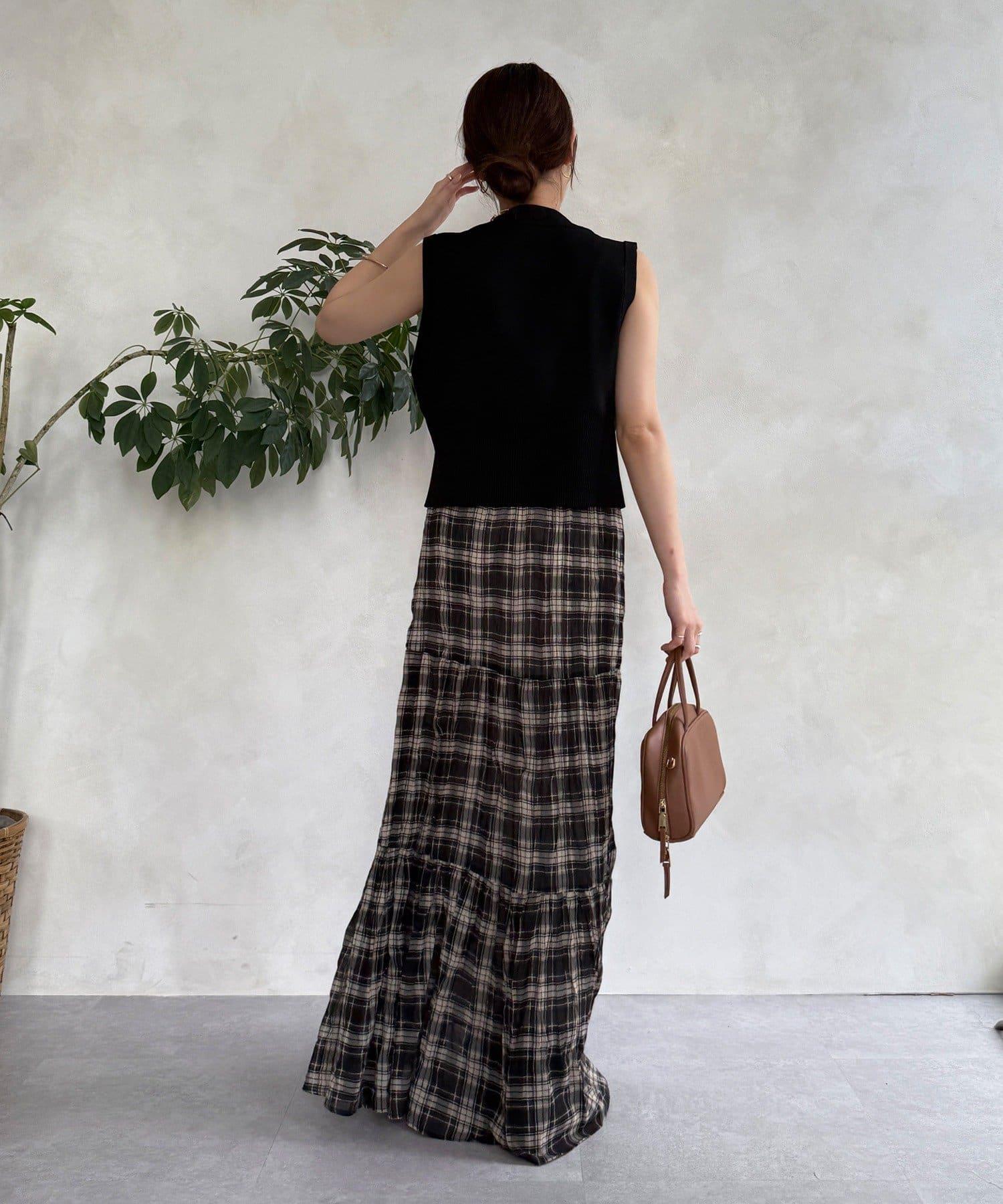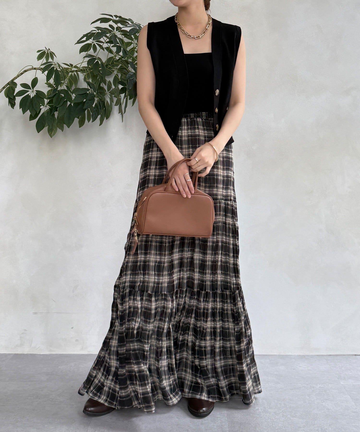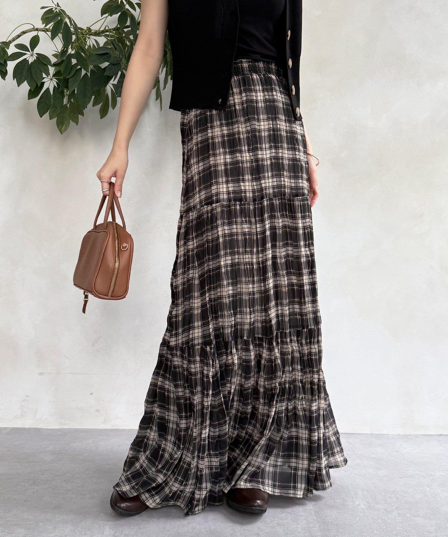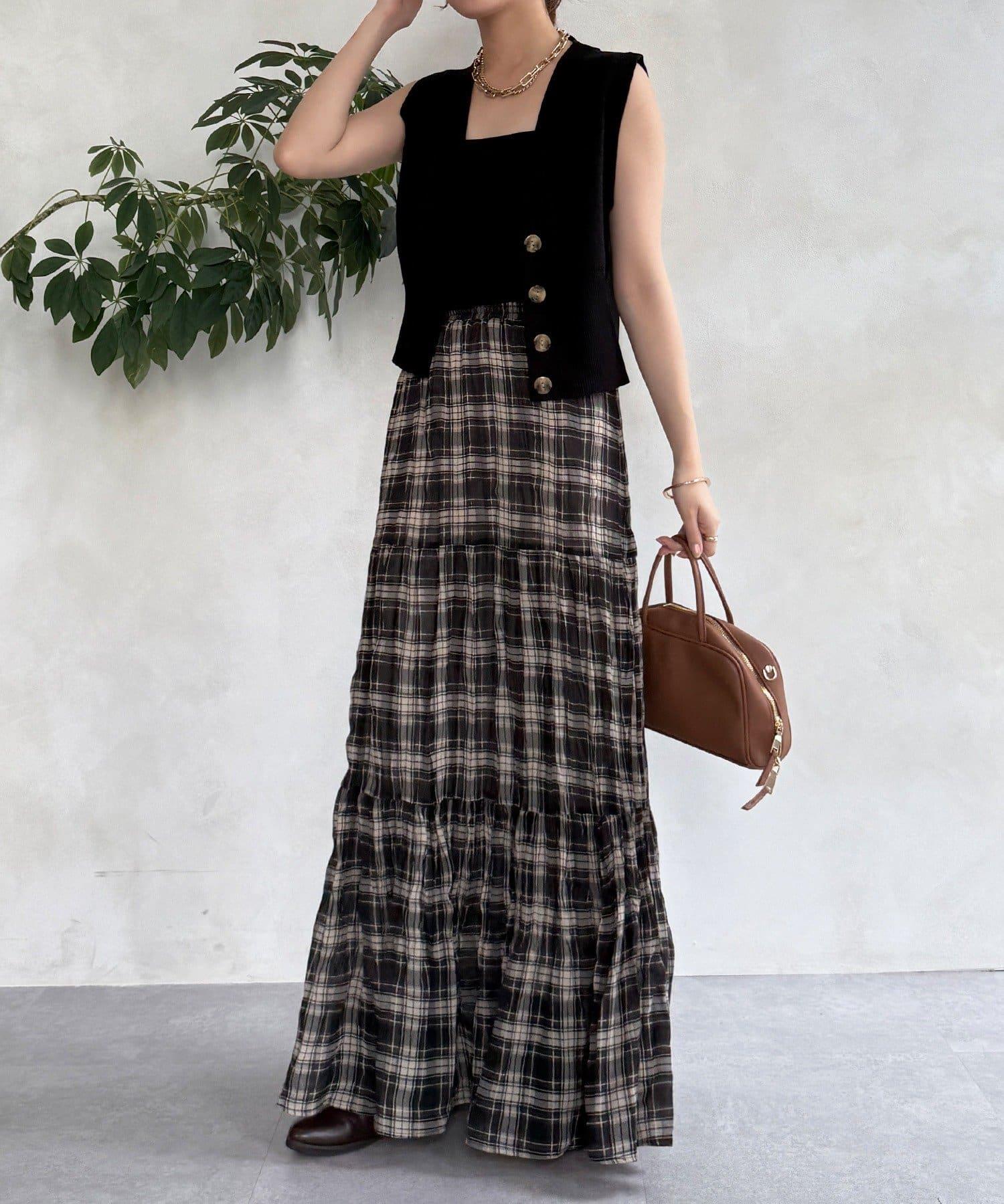格紋圖案給人一種全新的季節氛圍,腰部外擴、下襬外翻的剪裁也是一款極具吸引力的單品。