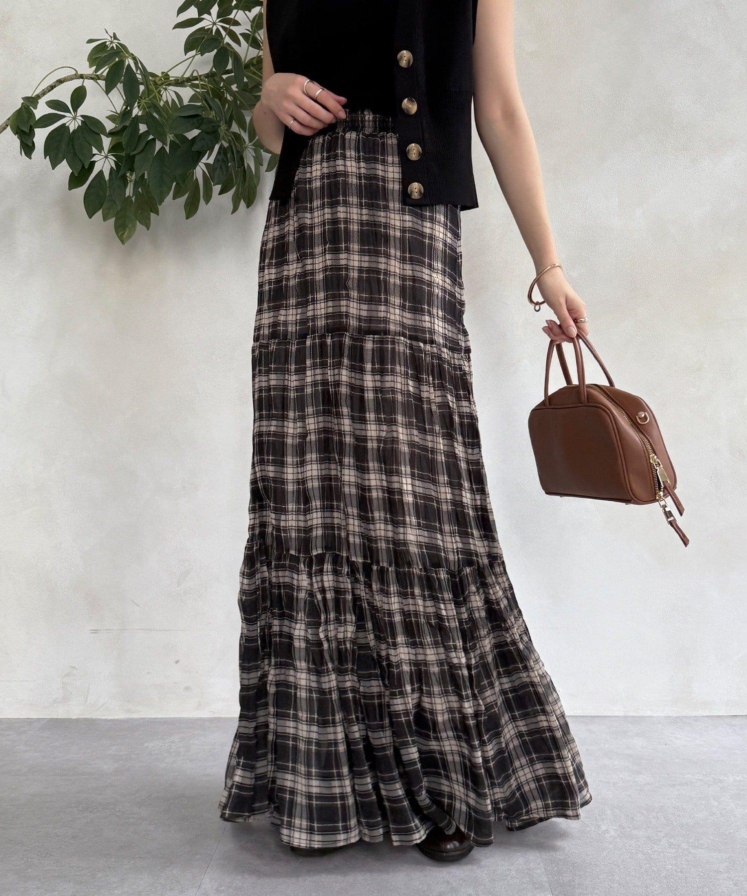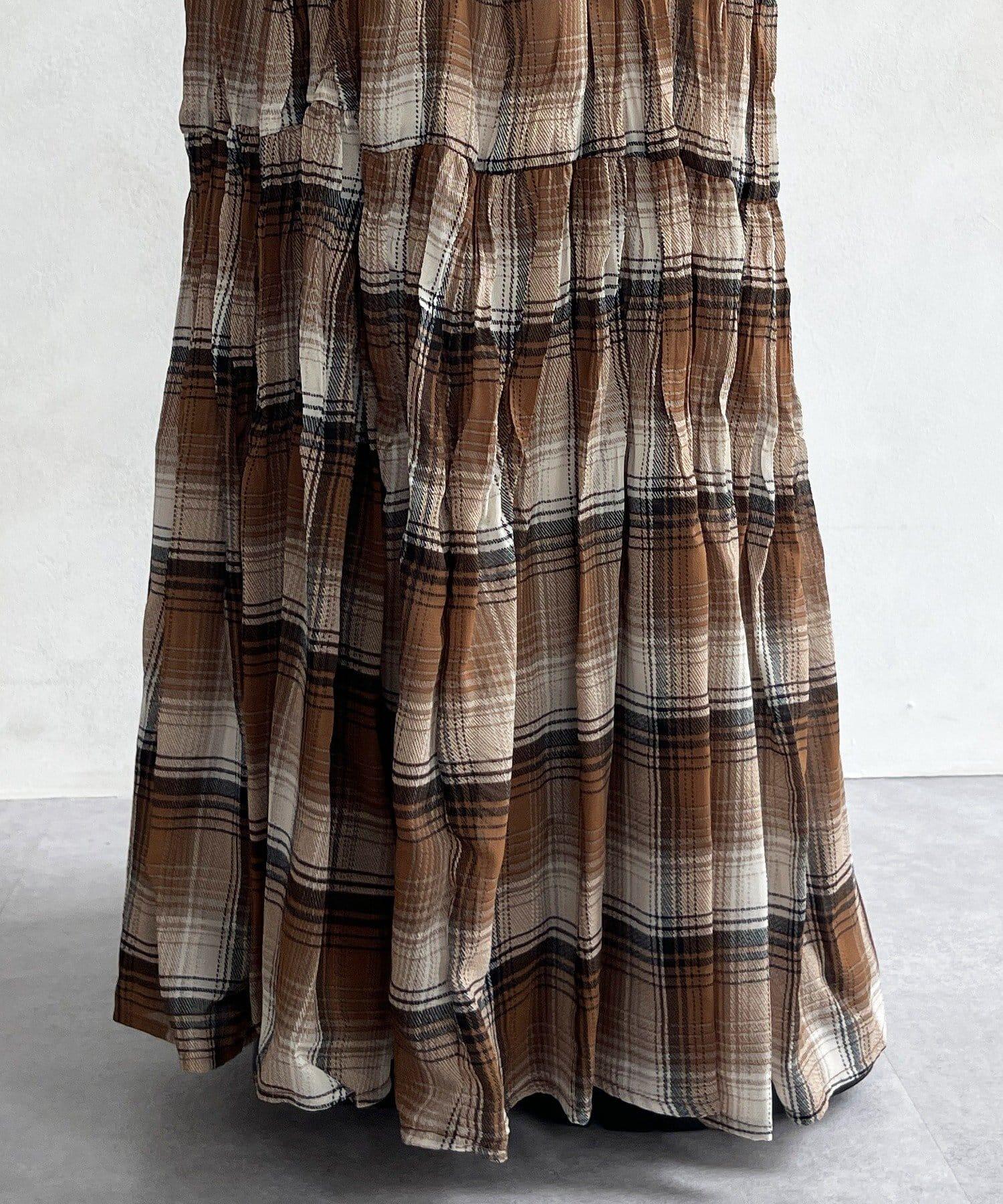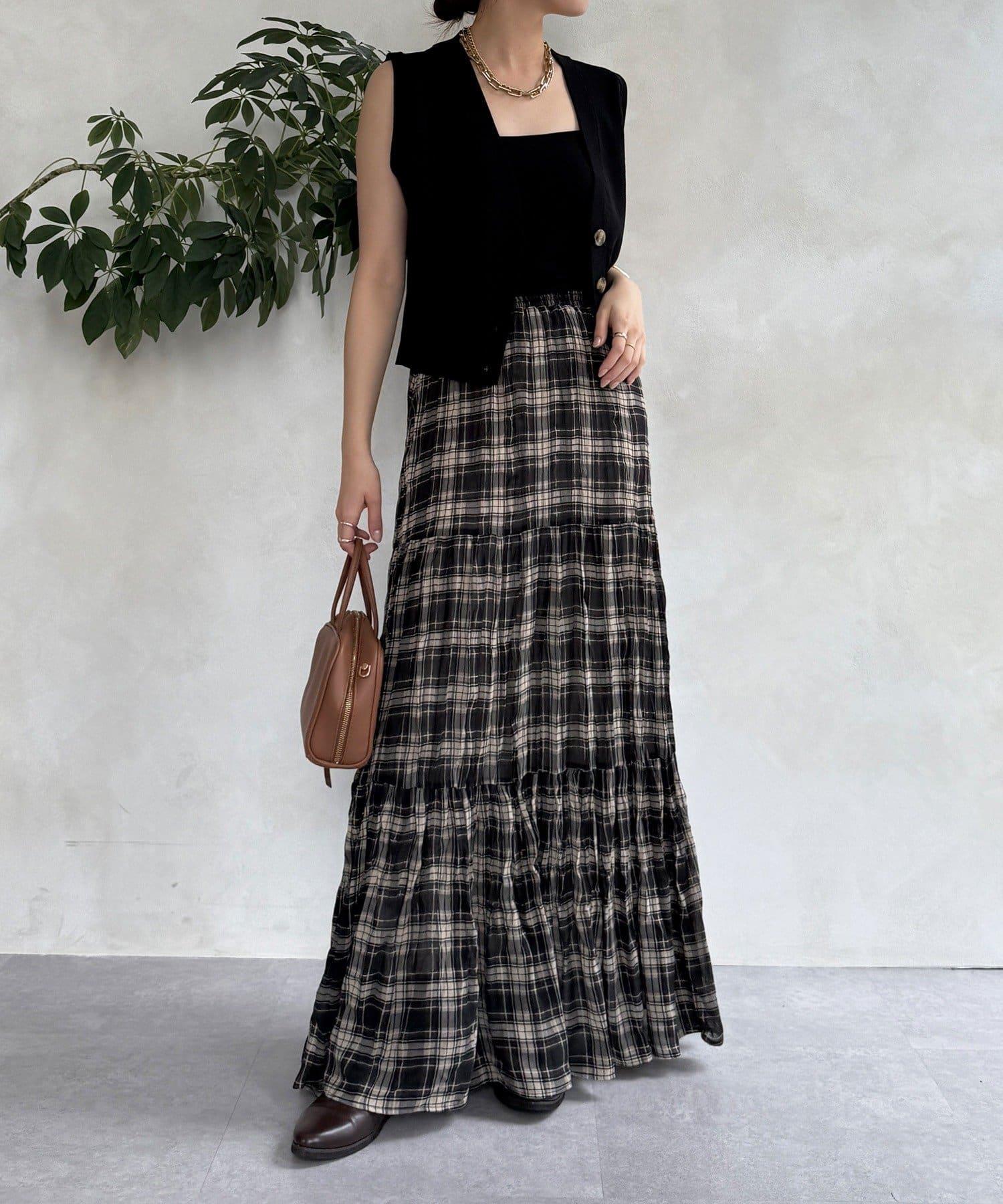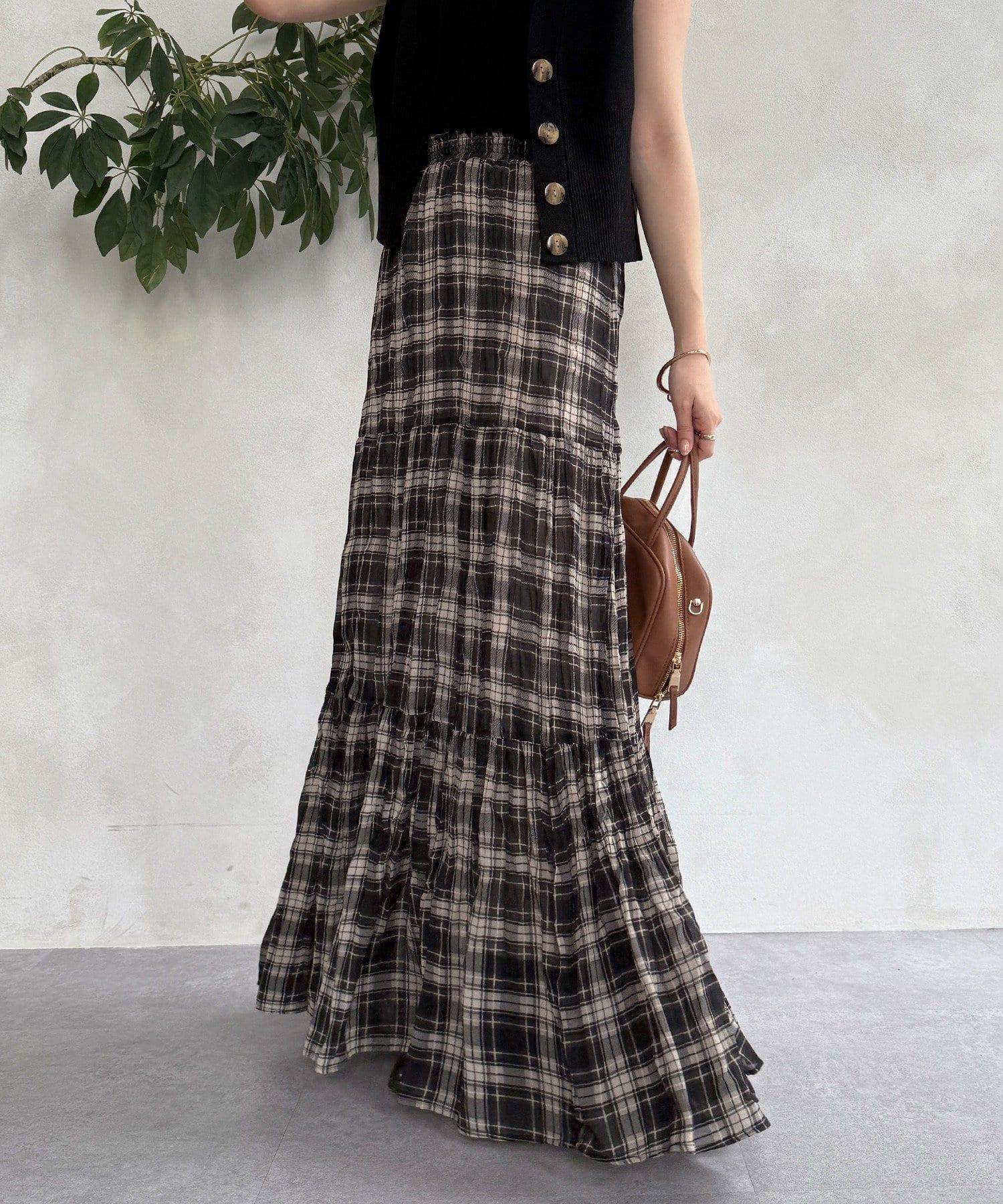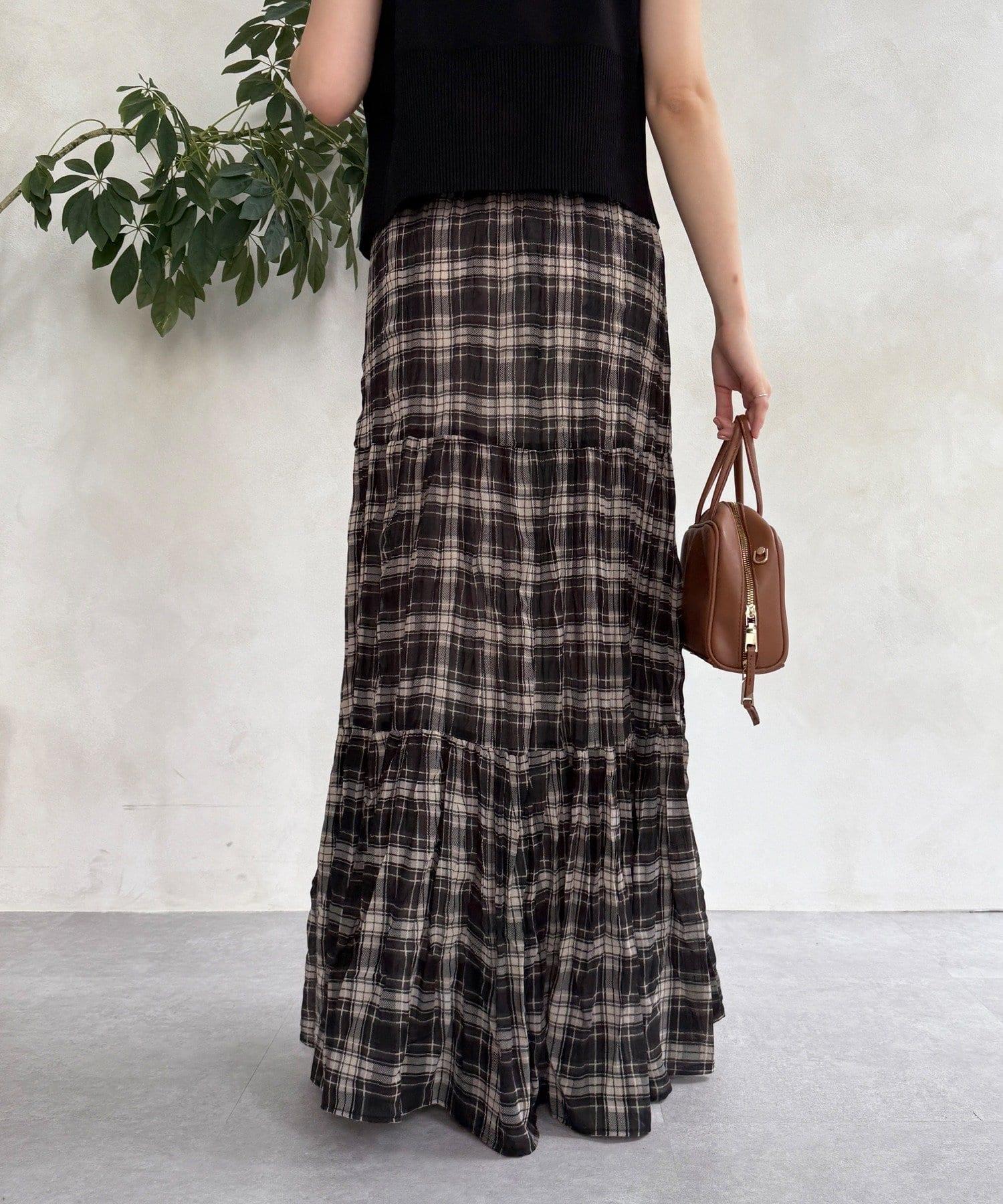 格紋圖案給人一種全新的季節氛圍,腰部外擴、下襬外翻的剪裁也是一款極具吸引力的單品。