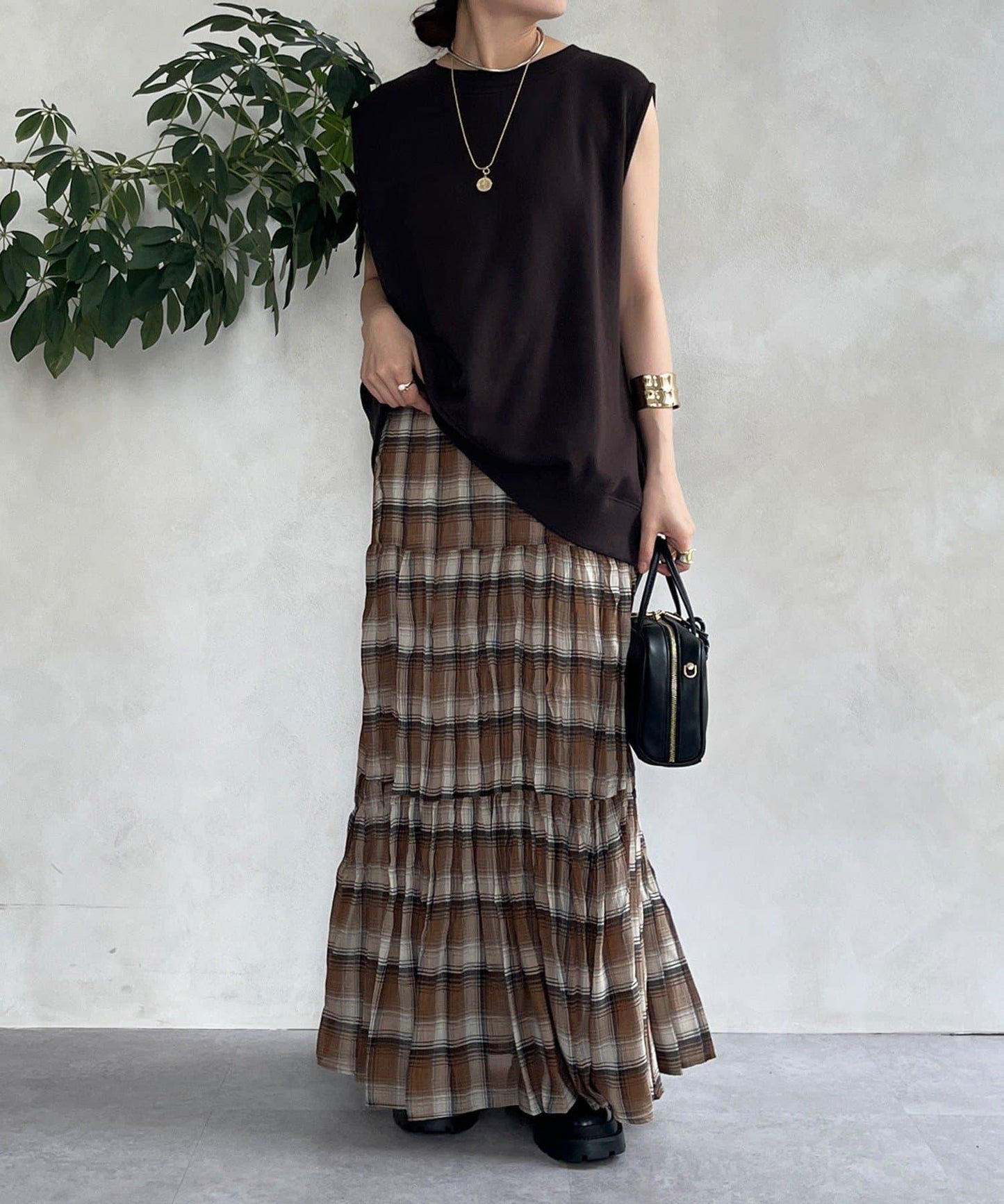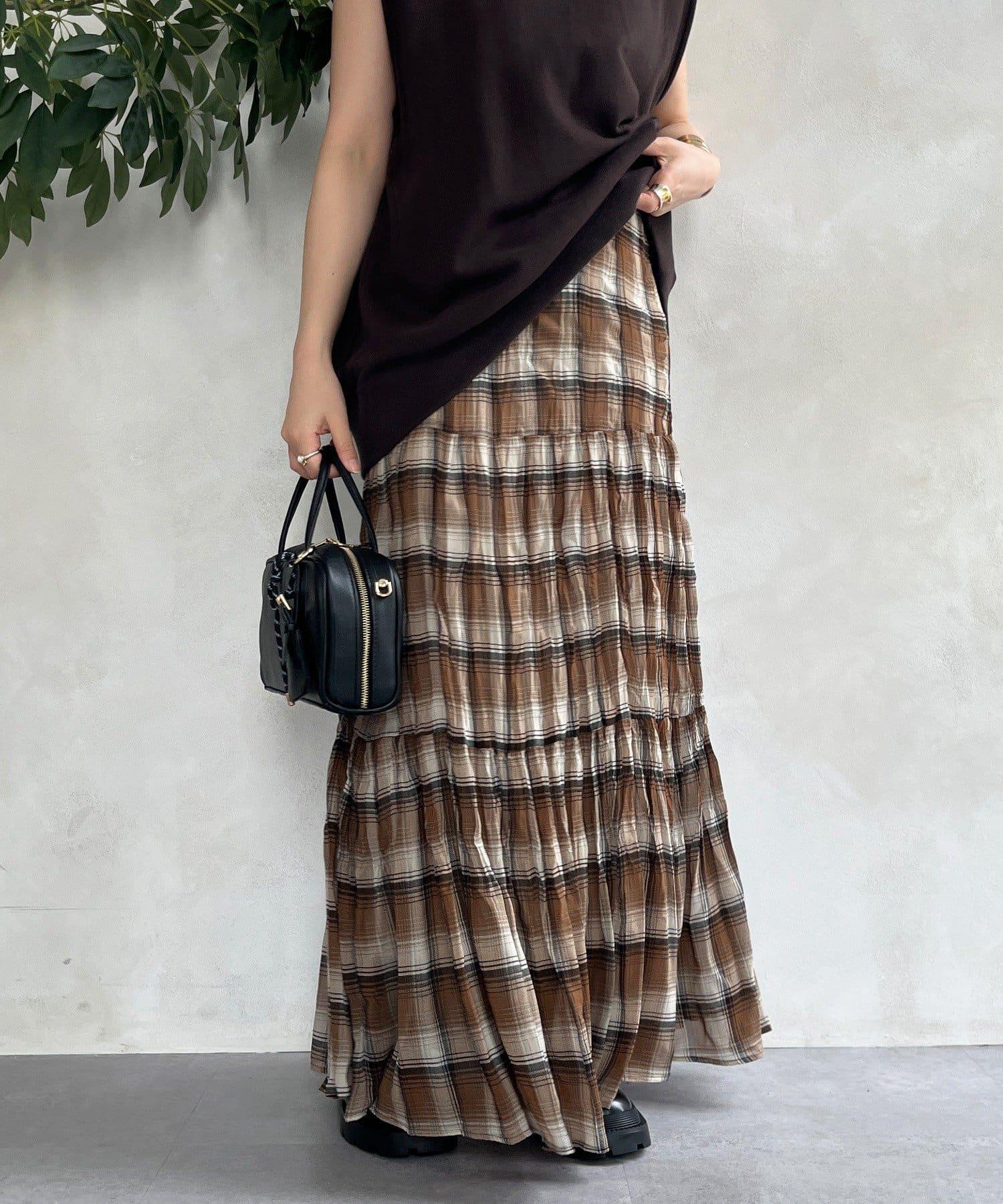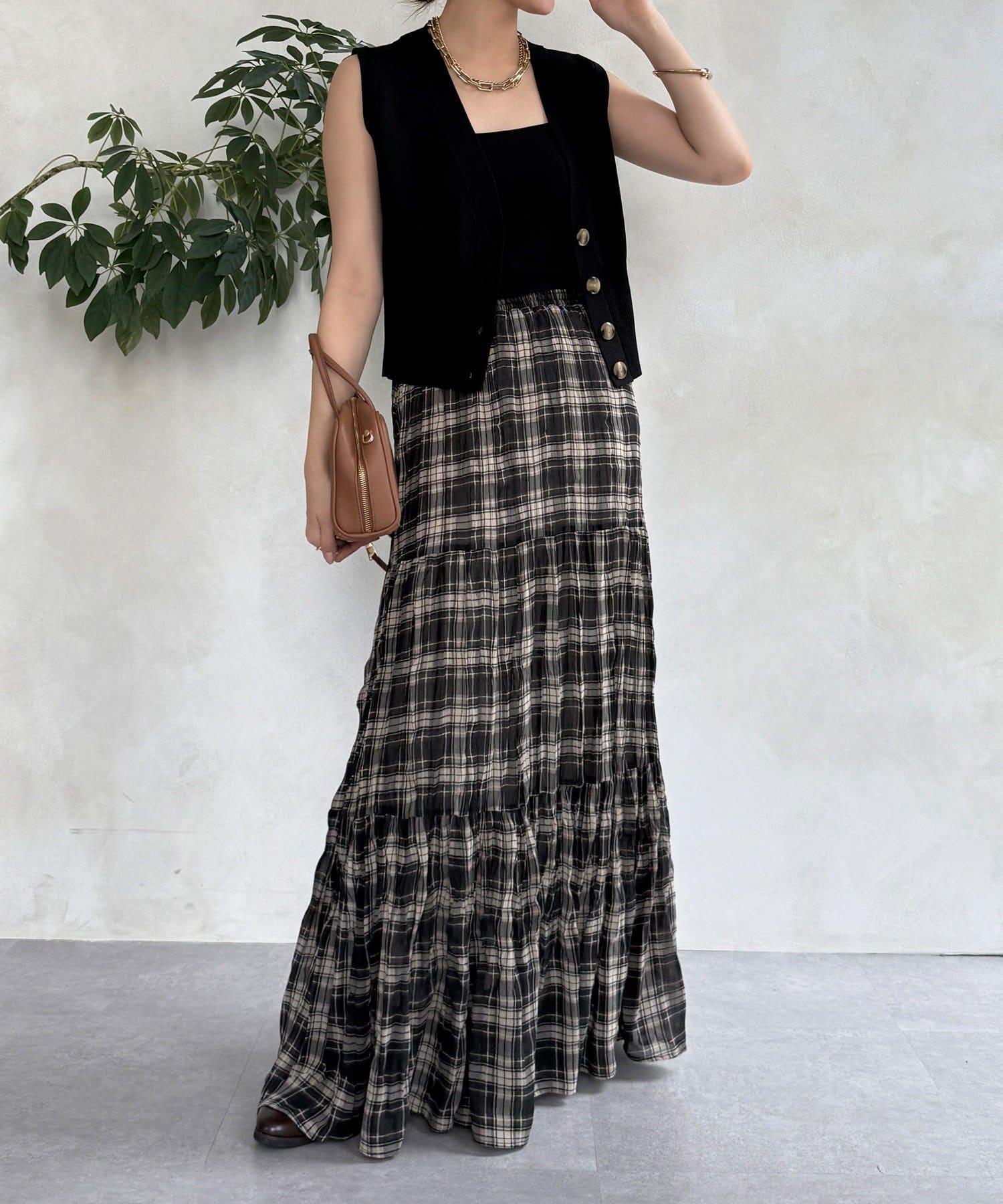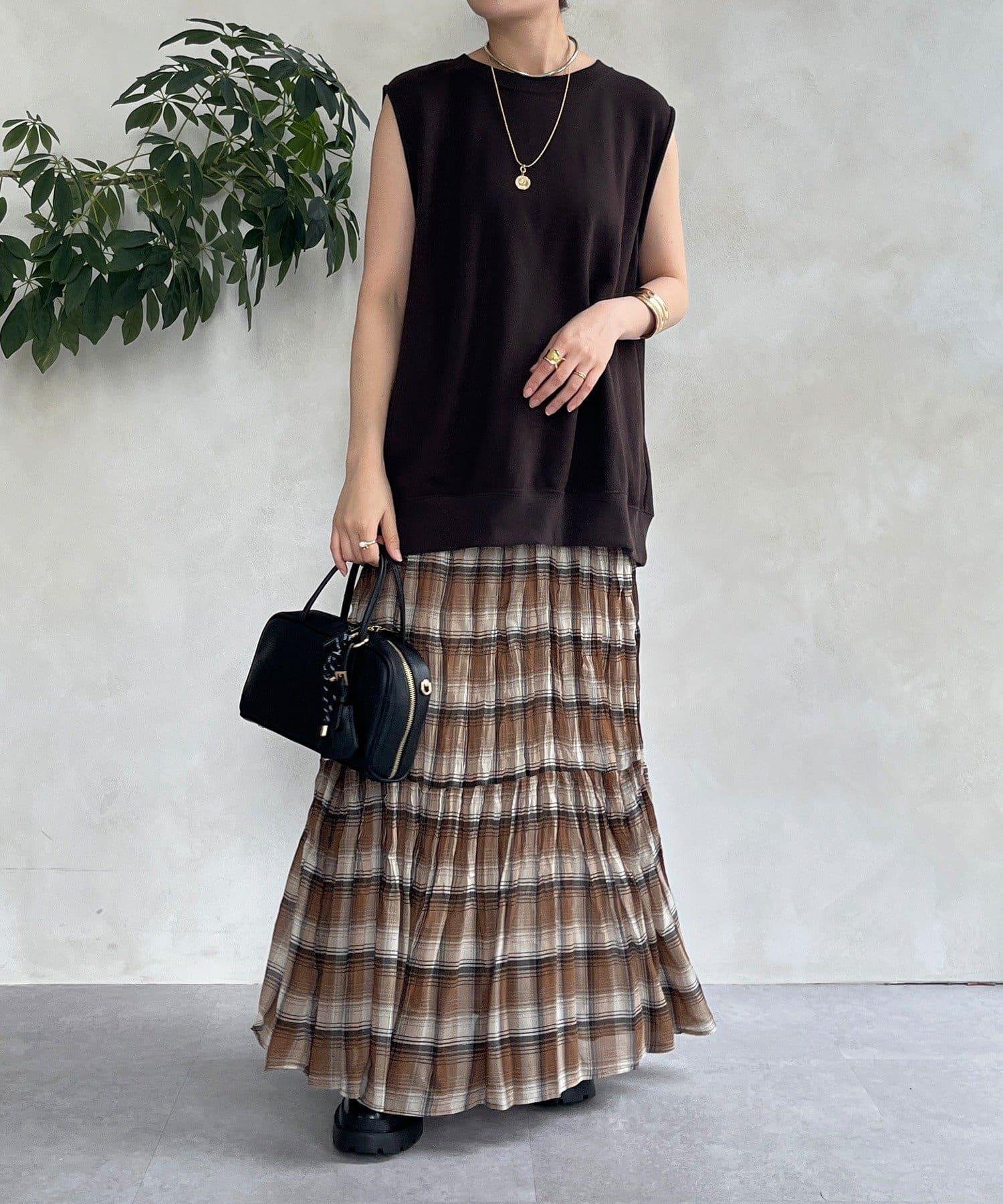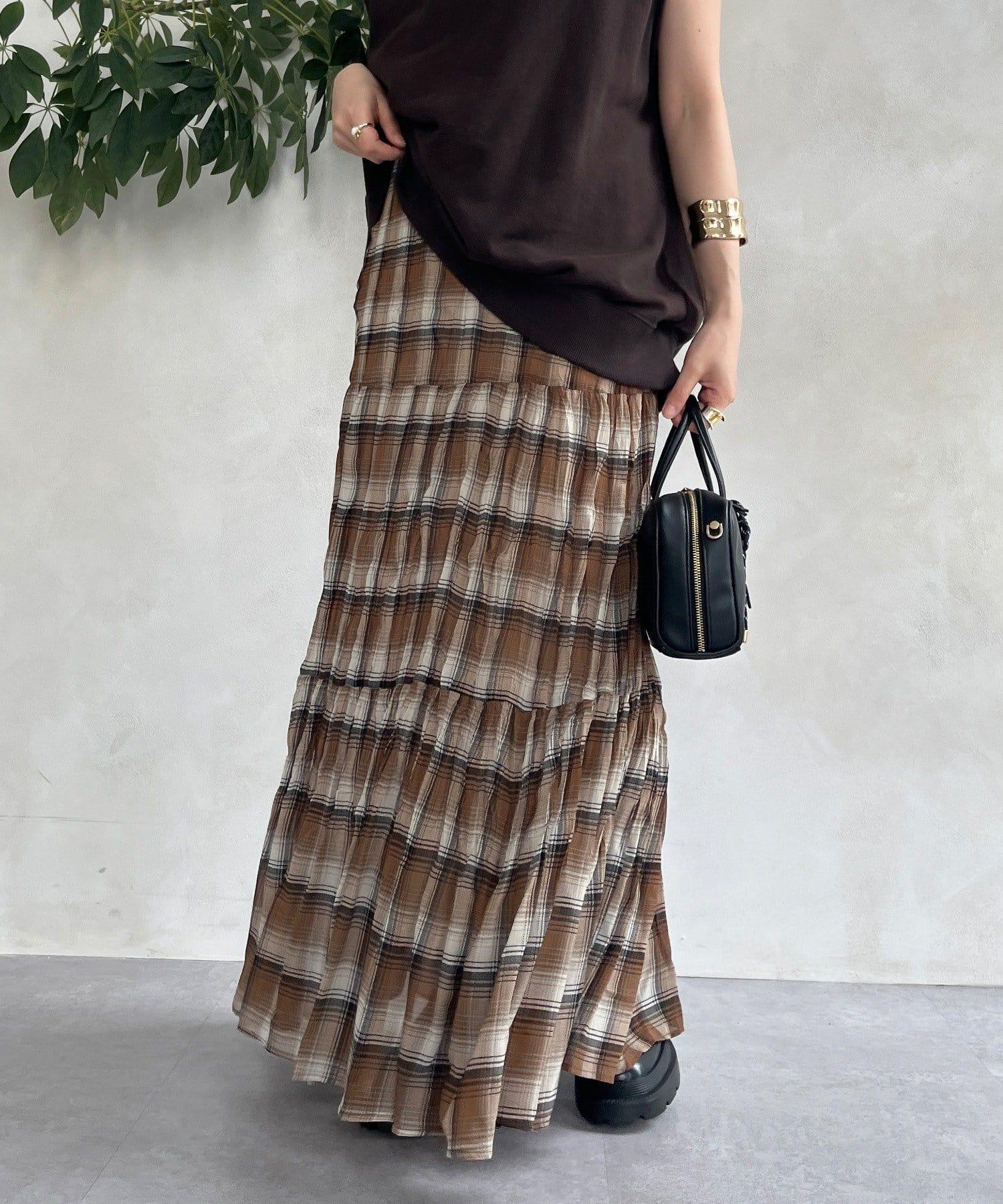 格紋圖案給人一種全新的季節氛圍,腰部外擴、下襬外翻的剪裁也是一款極具吸引力的單品。