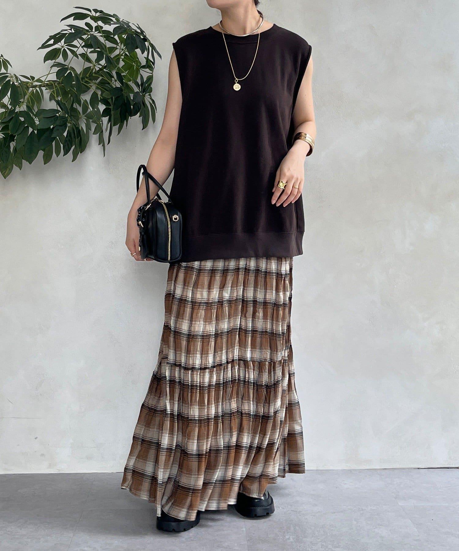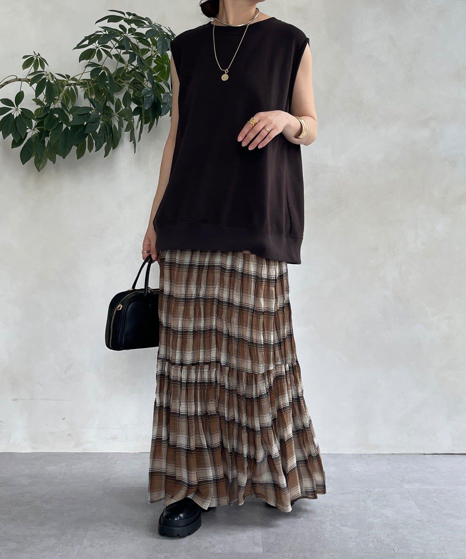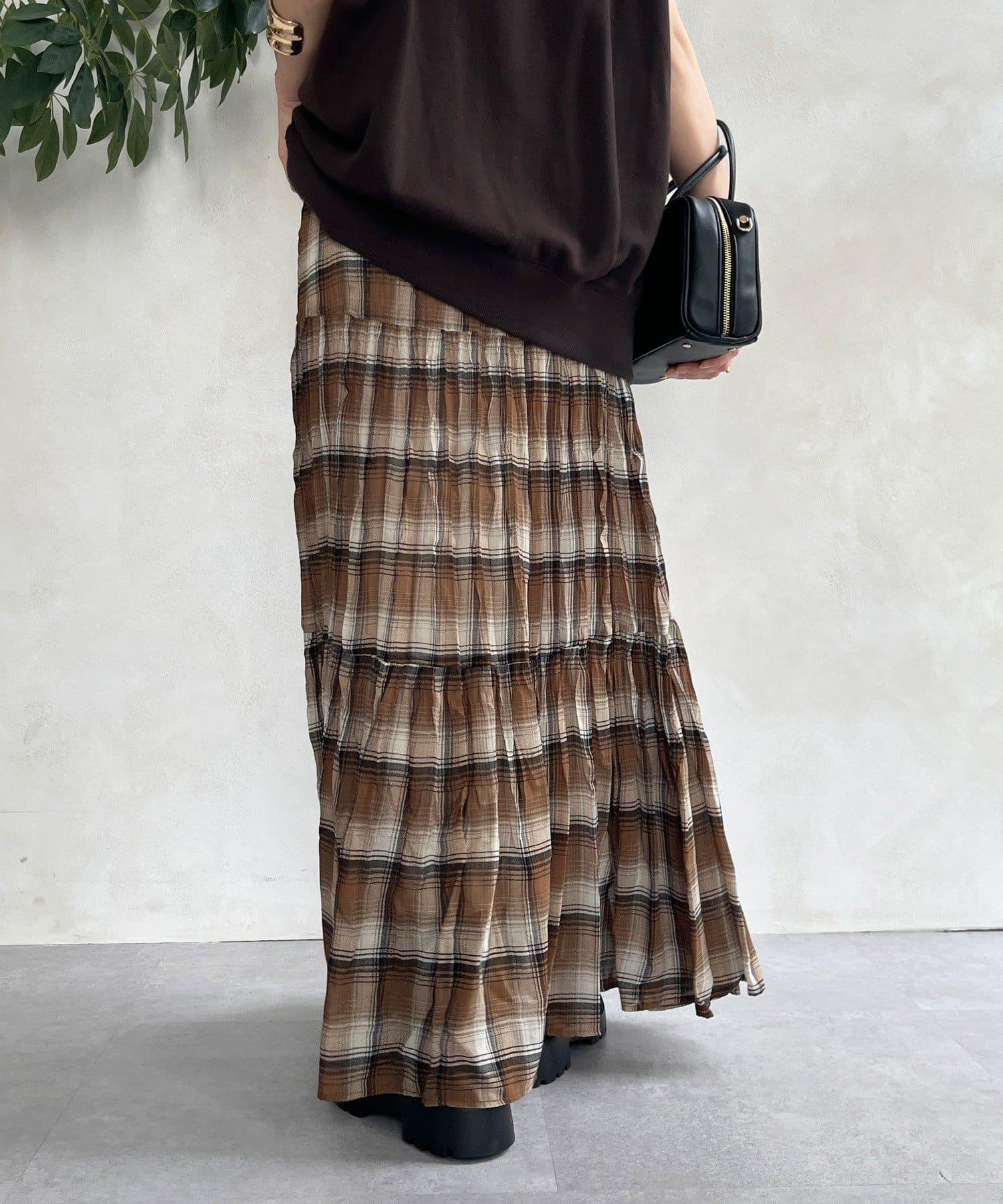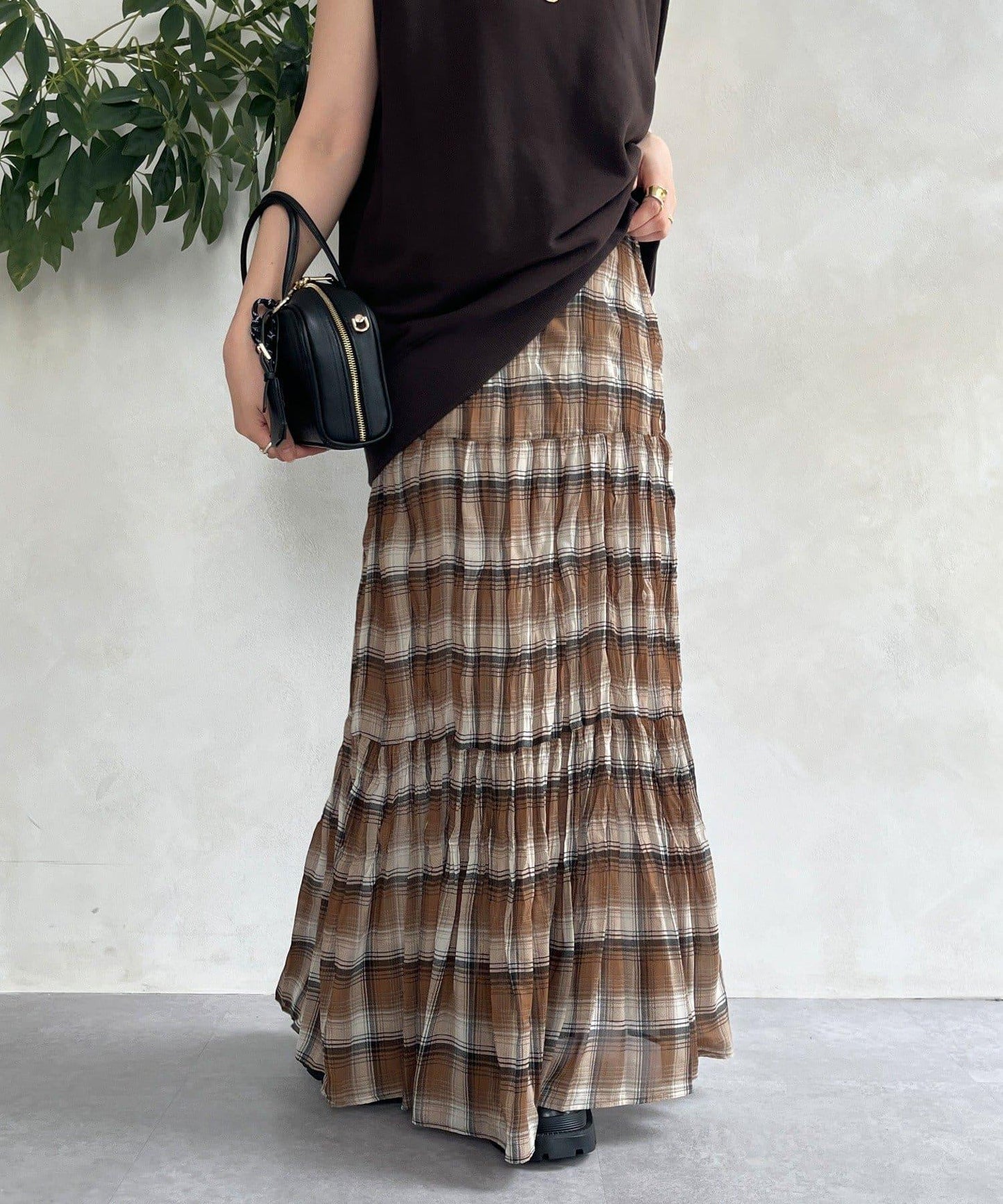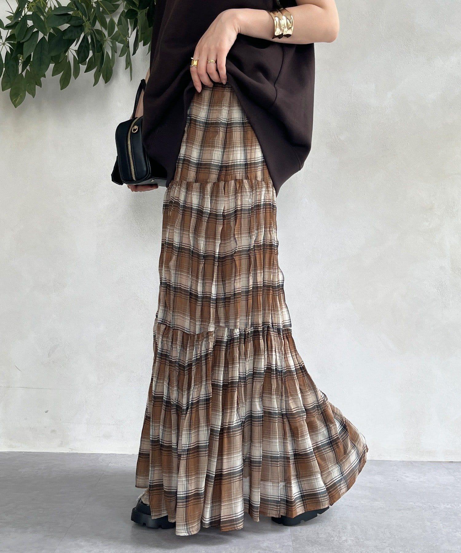 格紋圖案給人一種全新的季節氛圍,腰部外擴、下襬外翻的剪裁也是一款極具吸引力的單品。