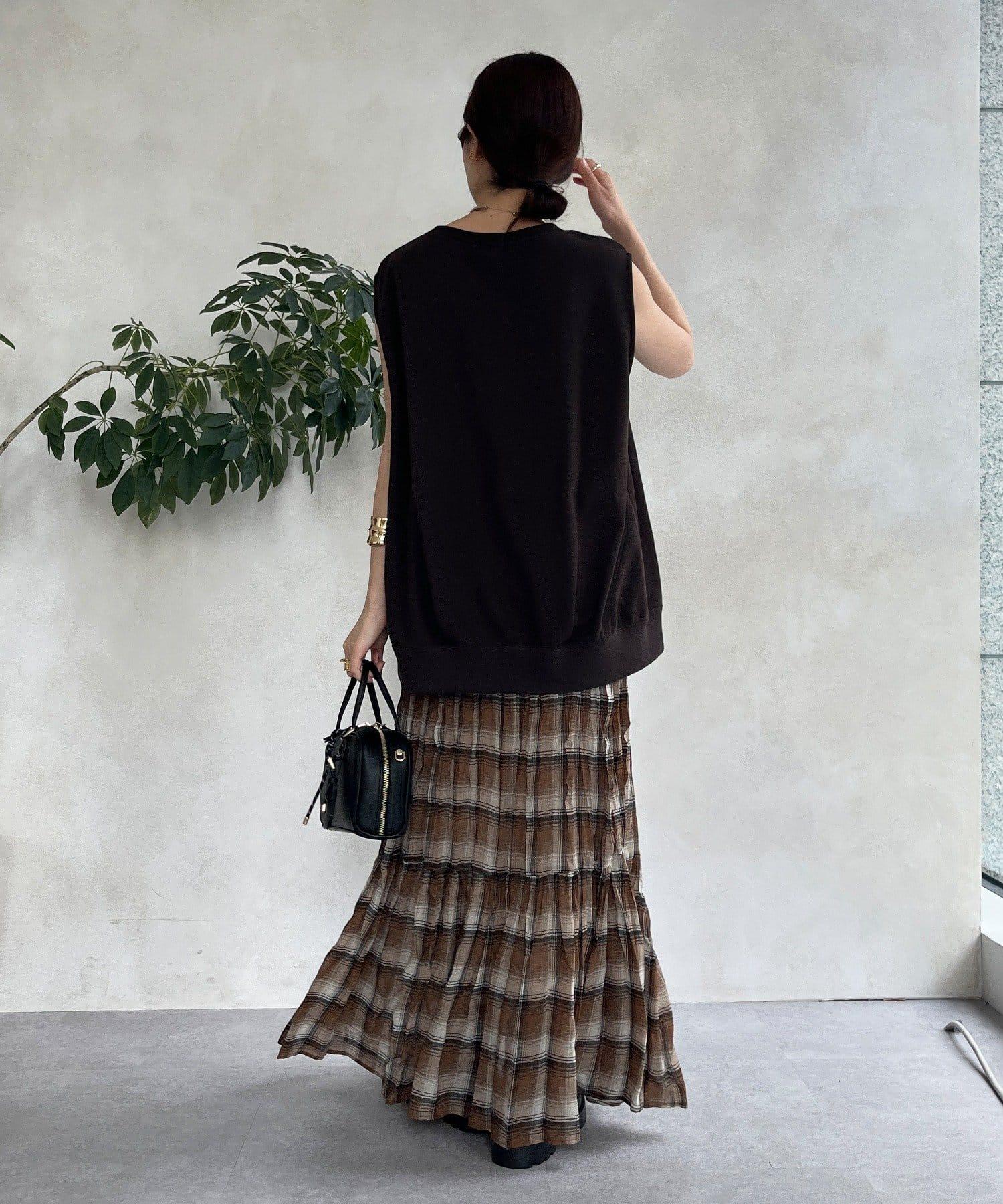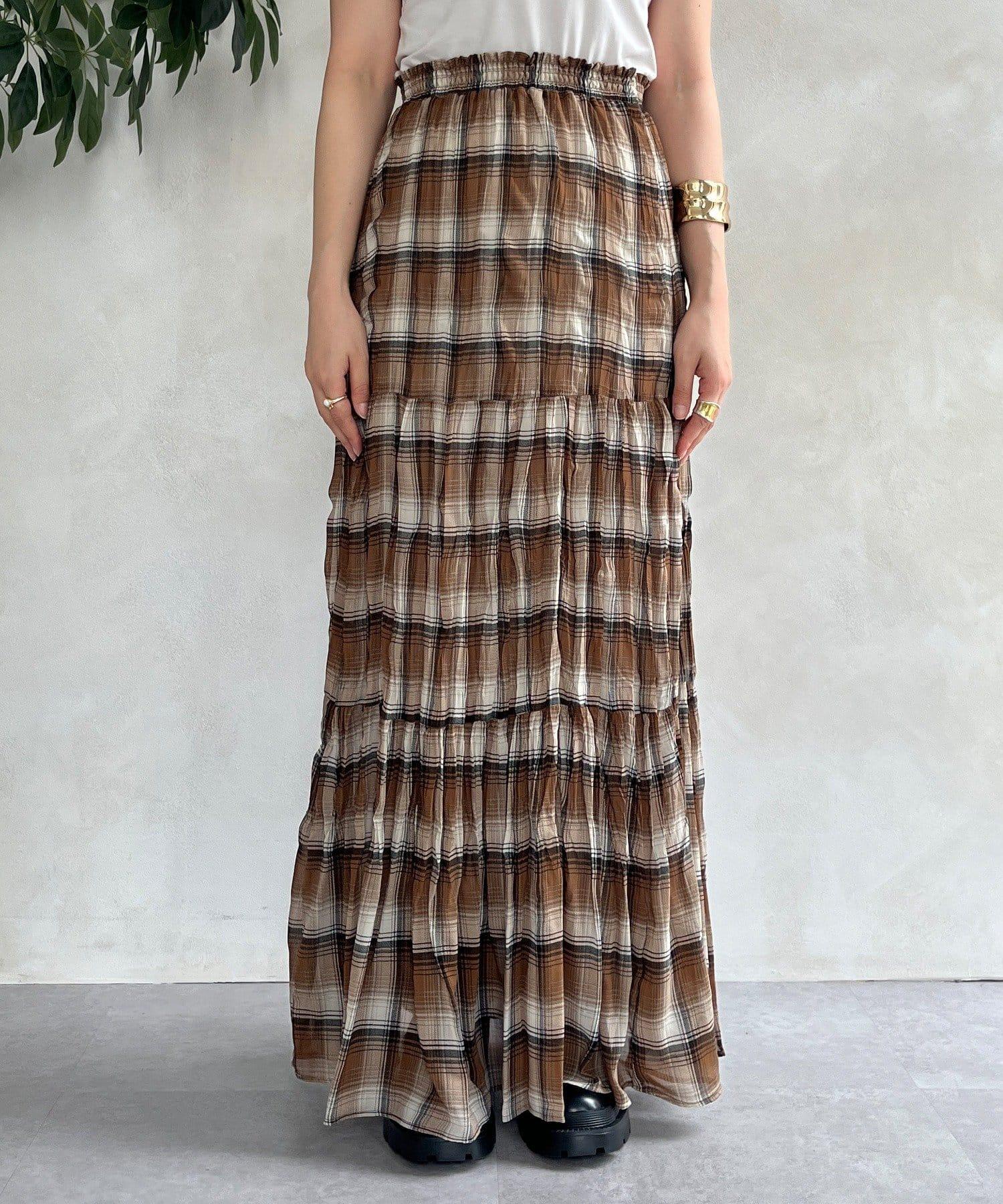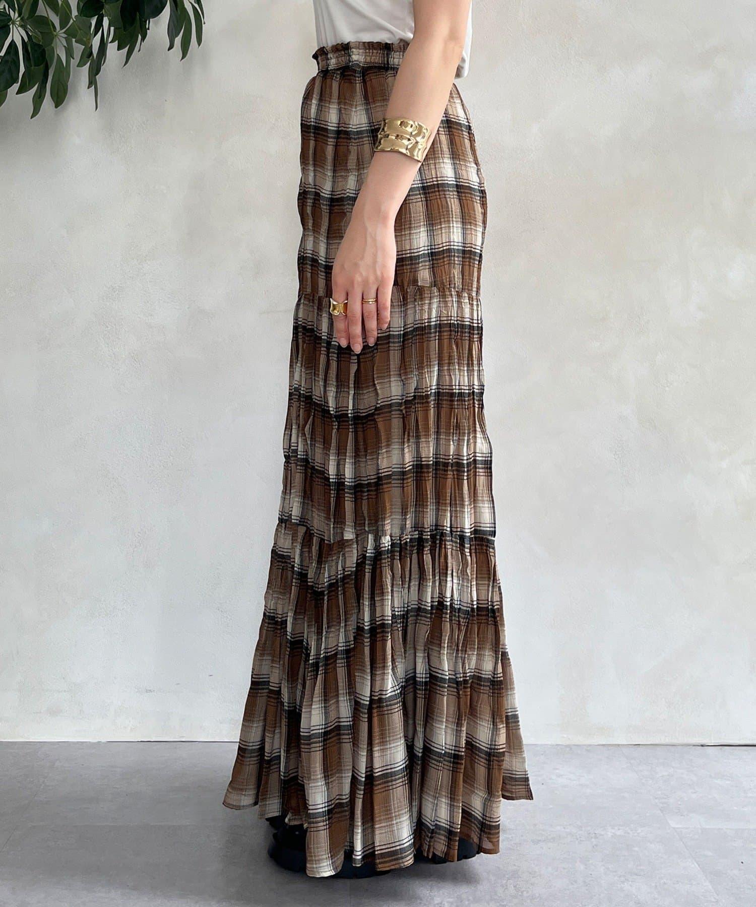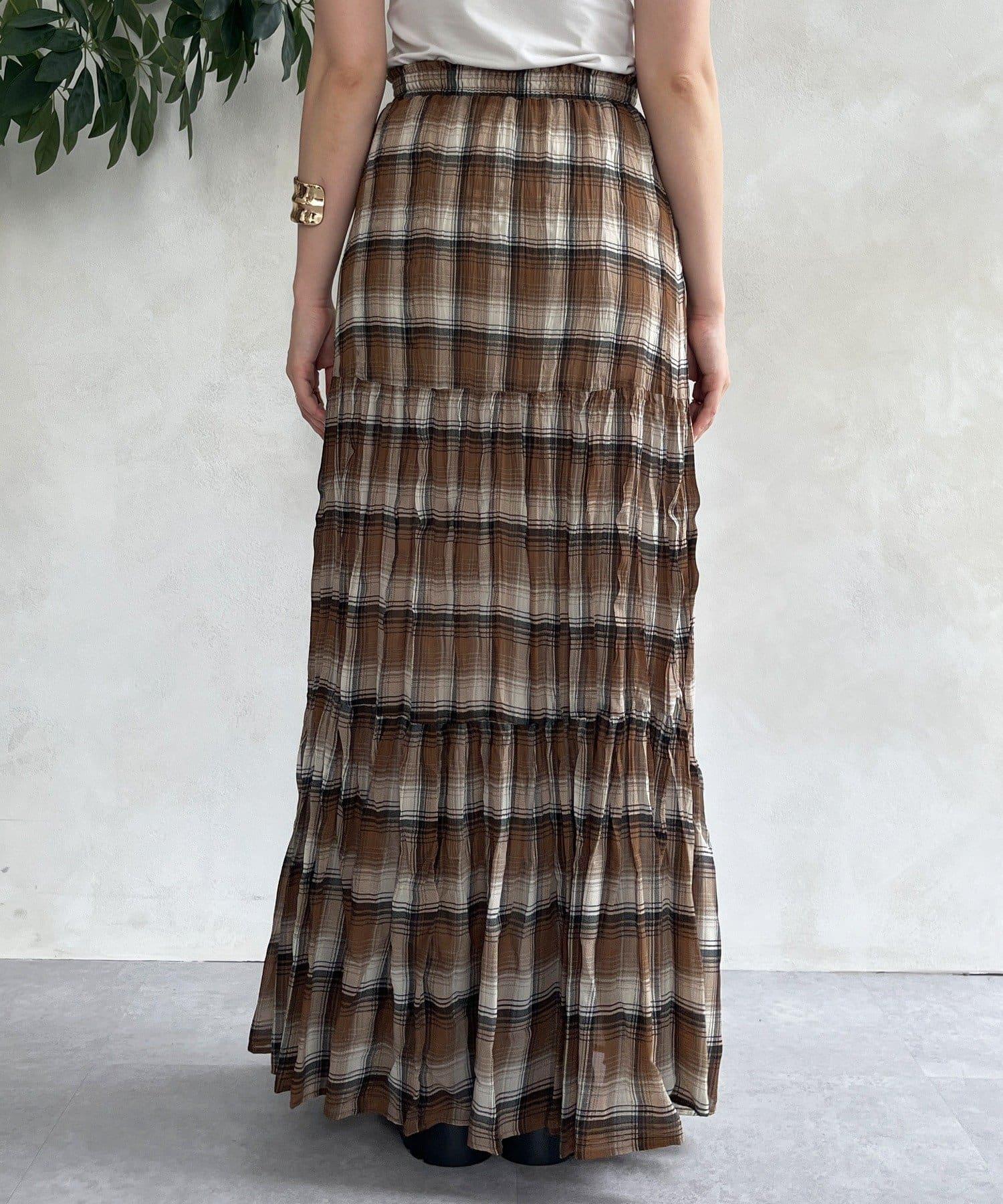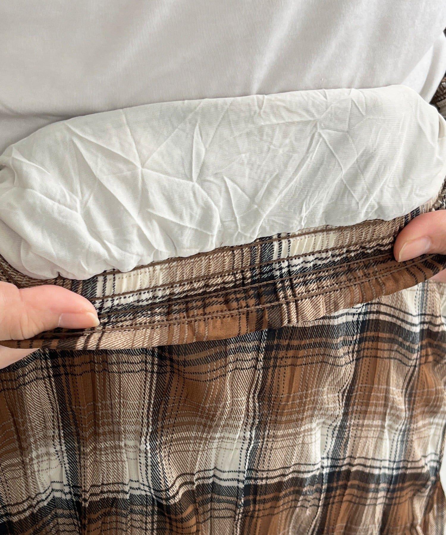 格紋圖案給人一種全新的季節氛圍,腰部外擴、下襬外翻的剪裁也是一款極具吸引力的單品。