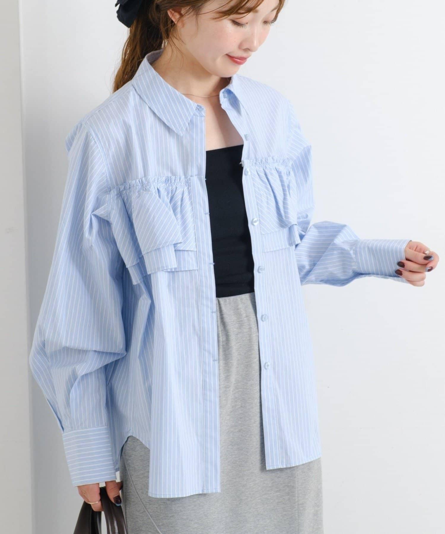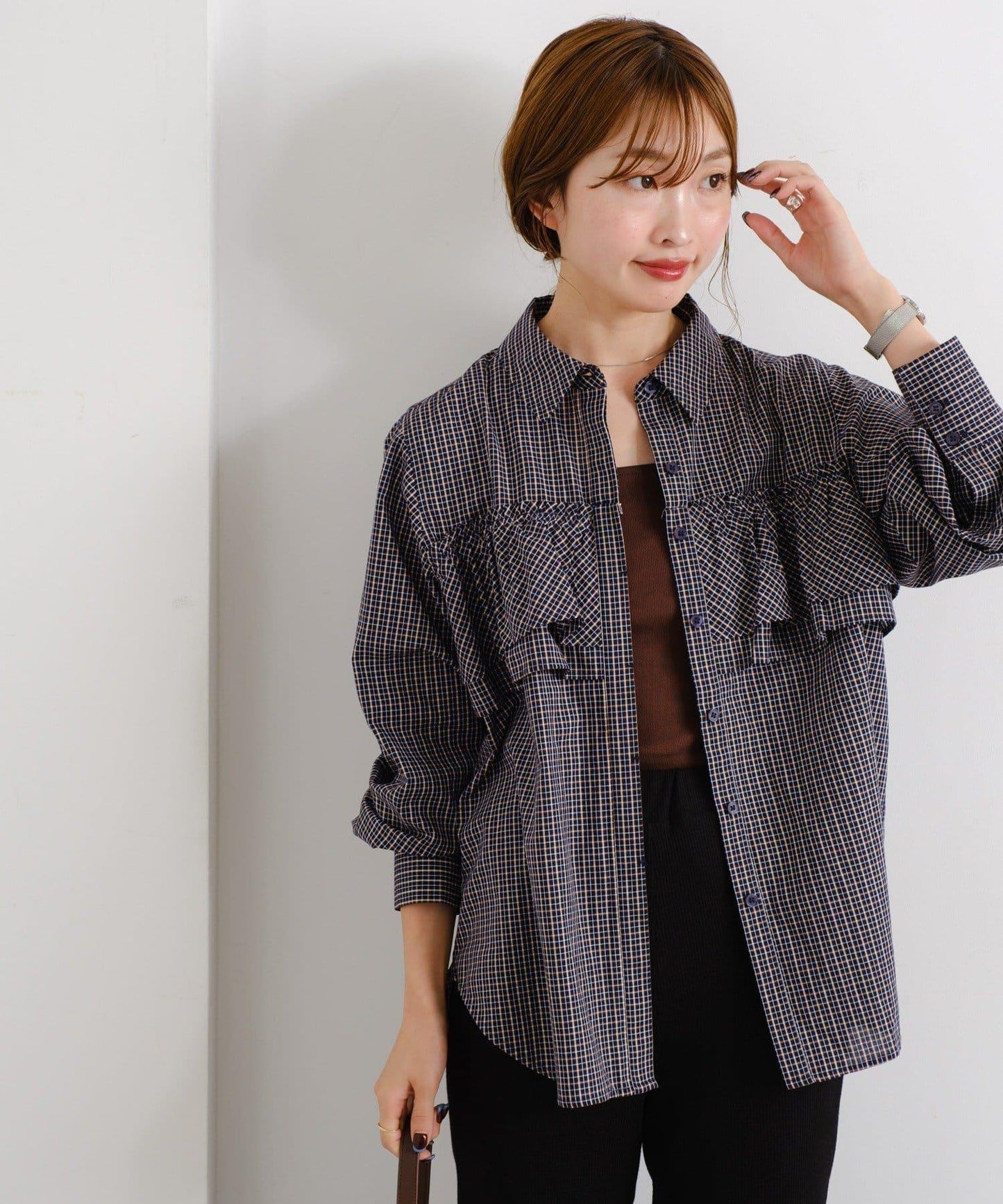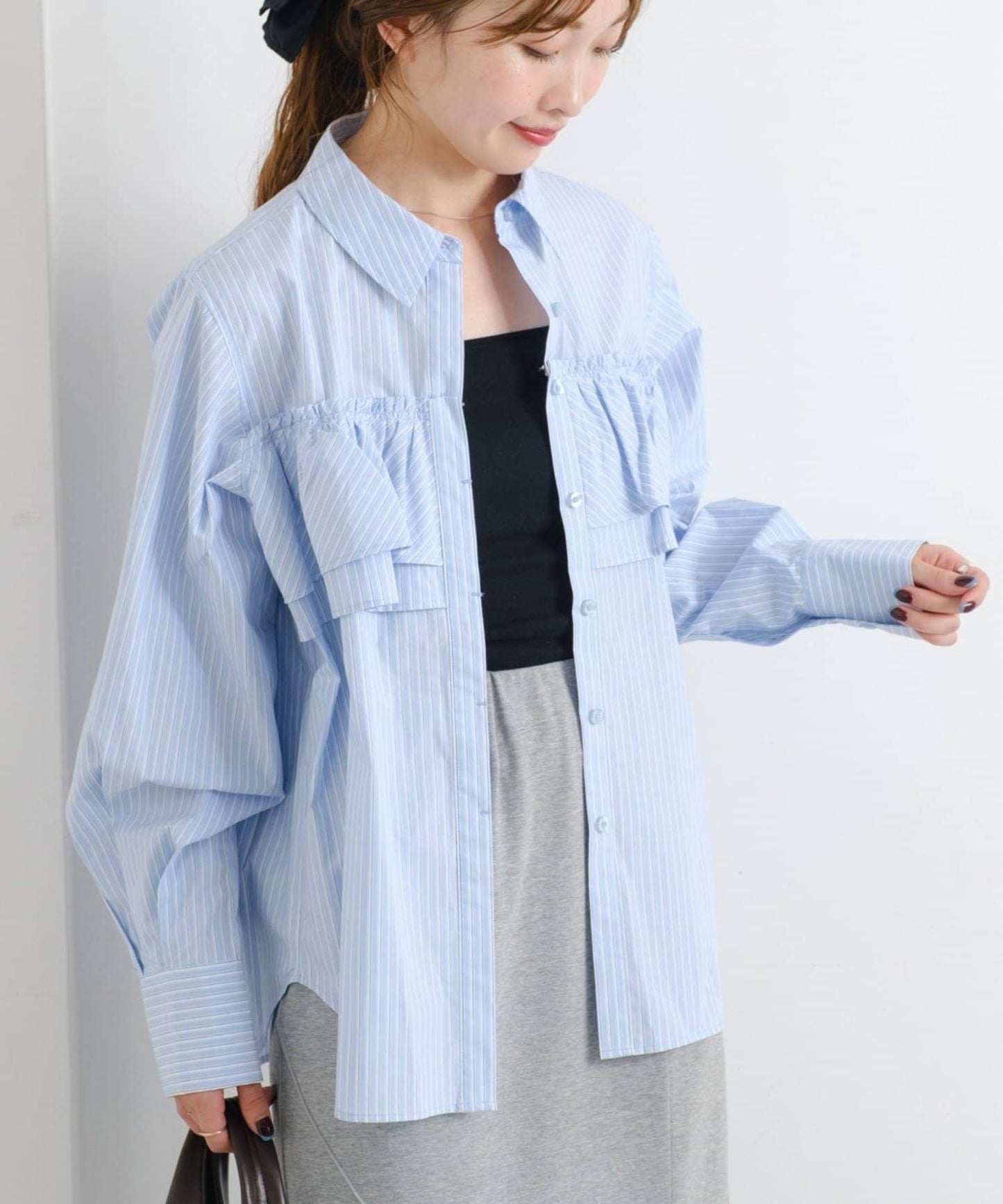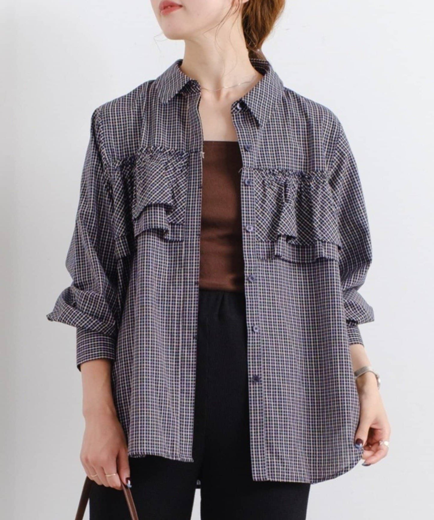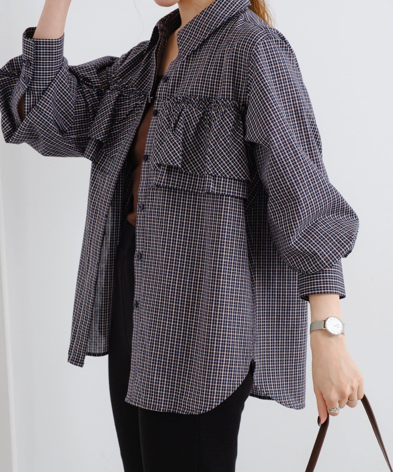 胸前聚攏的荷葉邊增添了女性的柔美,使這款襯衫簡約而不失力量。