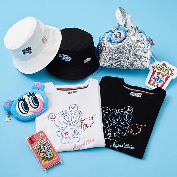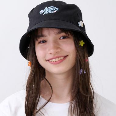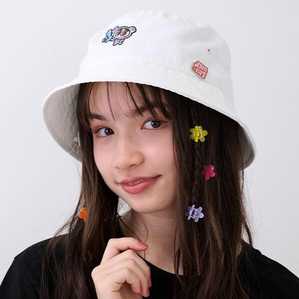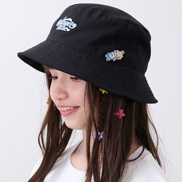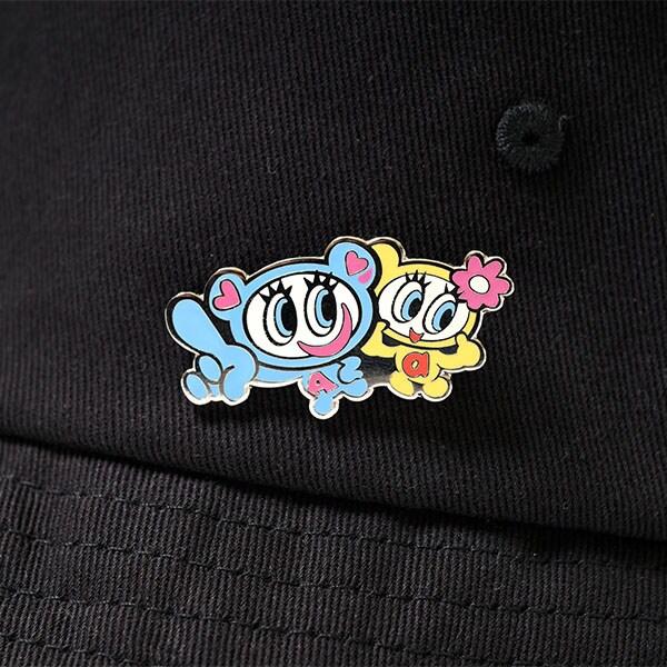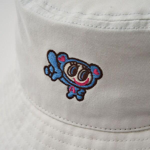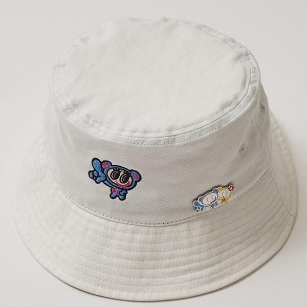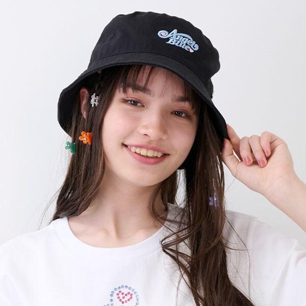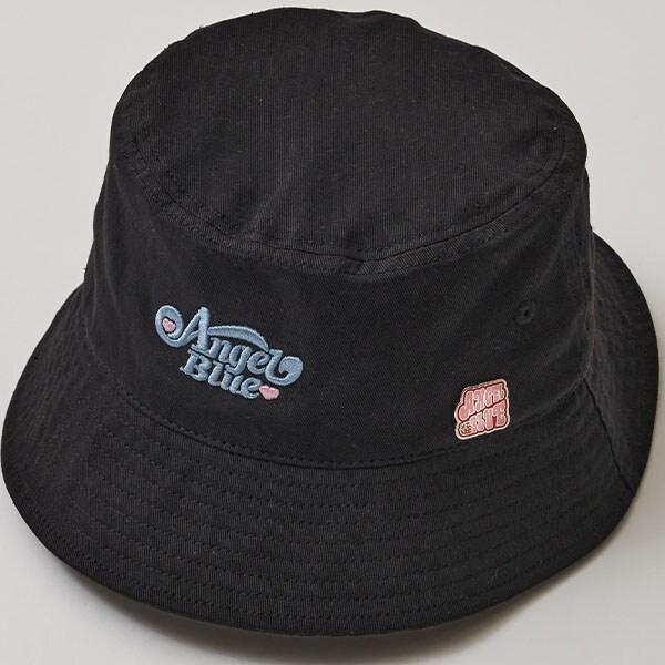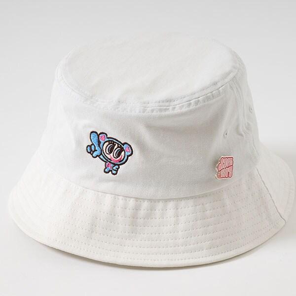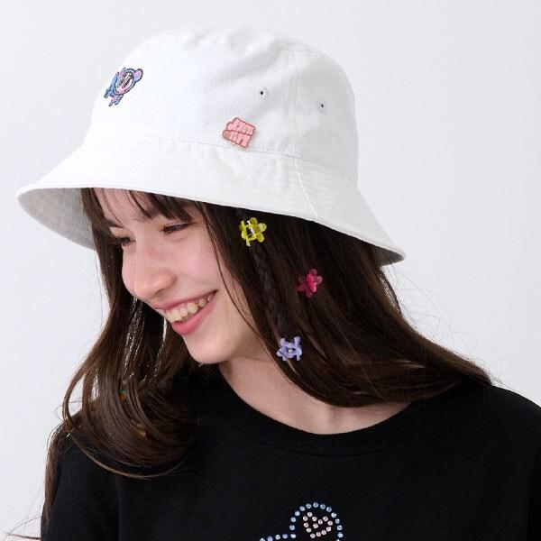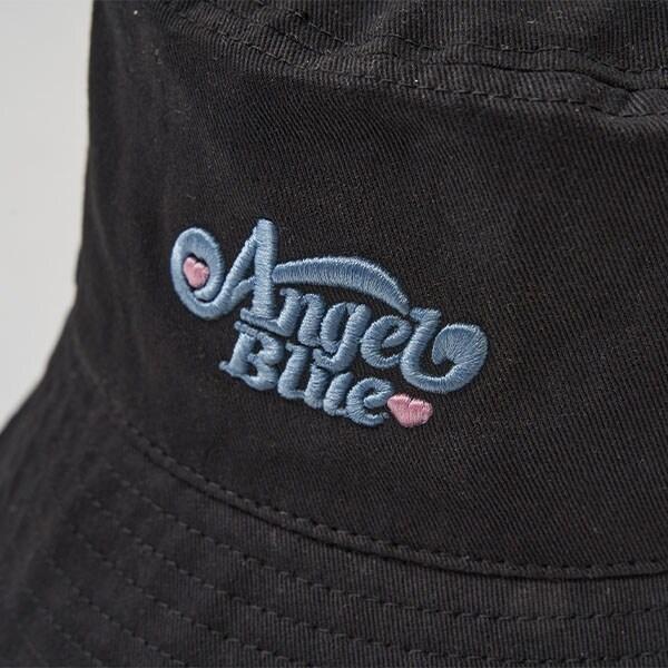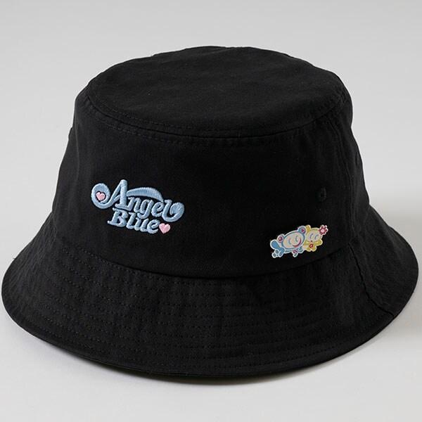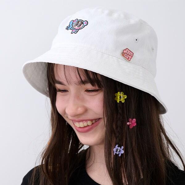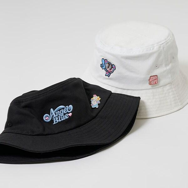 ANGEL BULUE 中村君帶別針徽章的水桶帽。米白色套裝上有中村君的刺繡和標誌 x 草莓別針徽章,黑色套裝上有 3D 標誌刺繡和中村君 x 花子別針徽章。