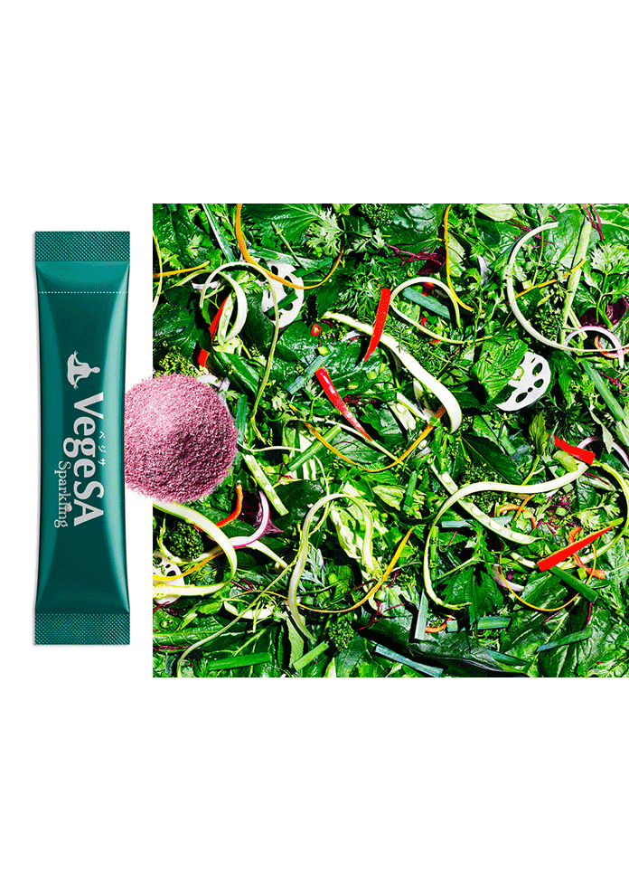 一包所提供的營養成分大約相當於一份蔬菜沙拉的量。(*一份蔬菜沙拉:相當於100克生菜、辣椒、西紅柿、胡蘿蔔、甜椒等)。還添加了超級食品巴西莓(也富含鐵和礦物質)和多酚類物質。獲得專利的泡騰綠葉粉。