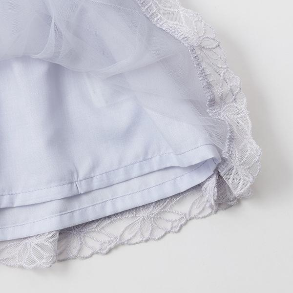 下襬由三層薄紗製成,蕾絲在薄紗之間若隱若現。