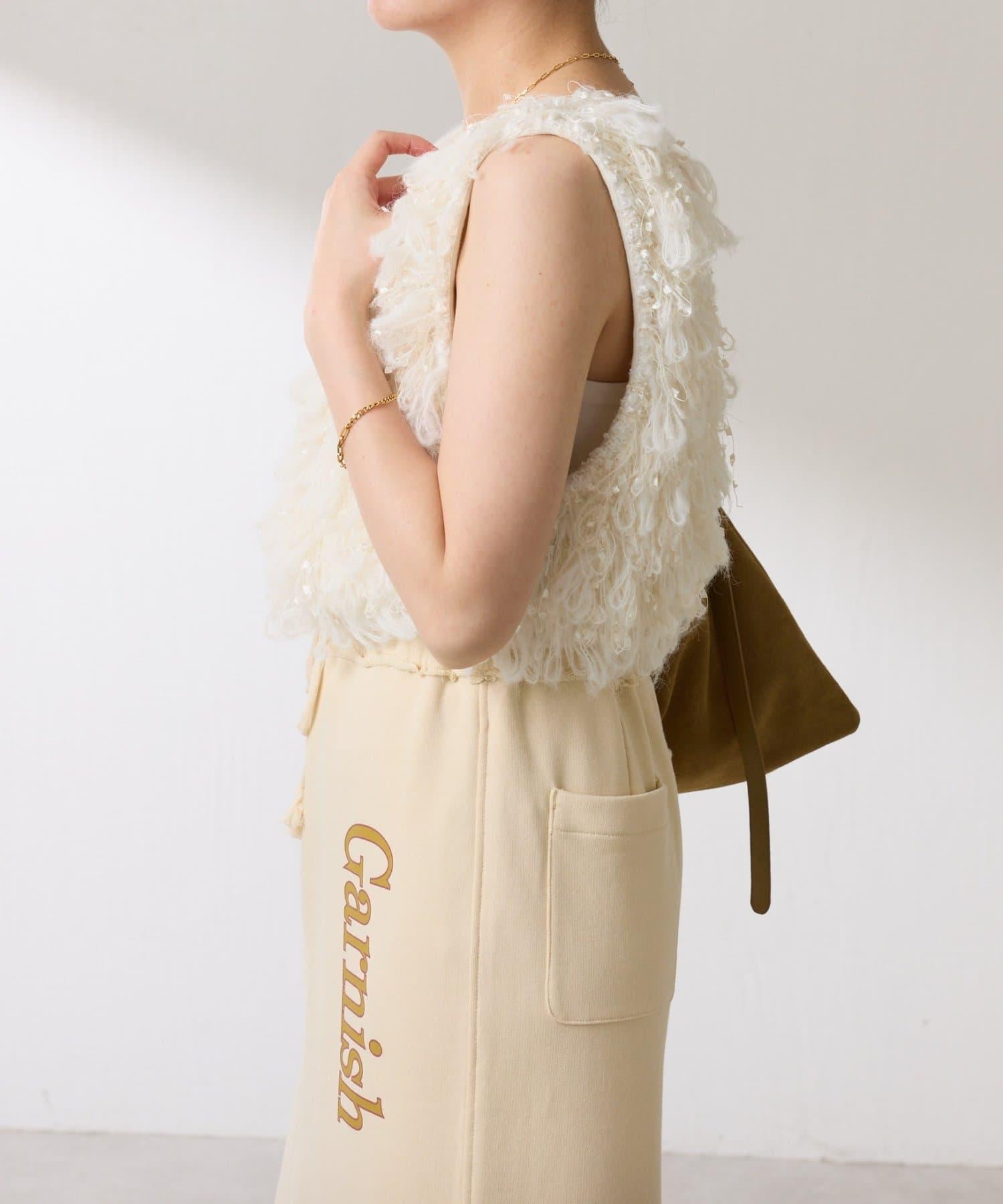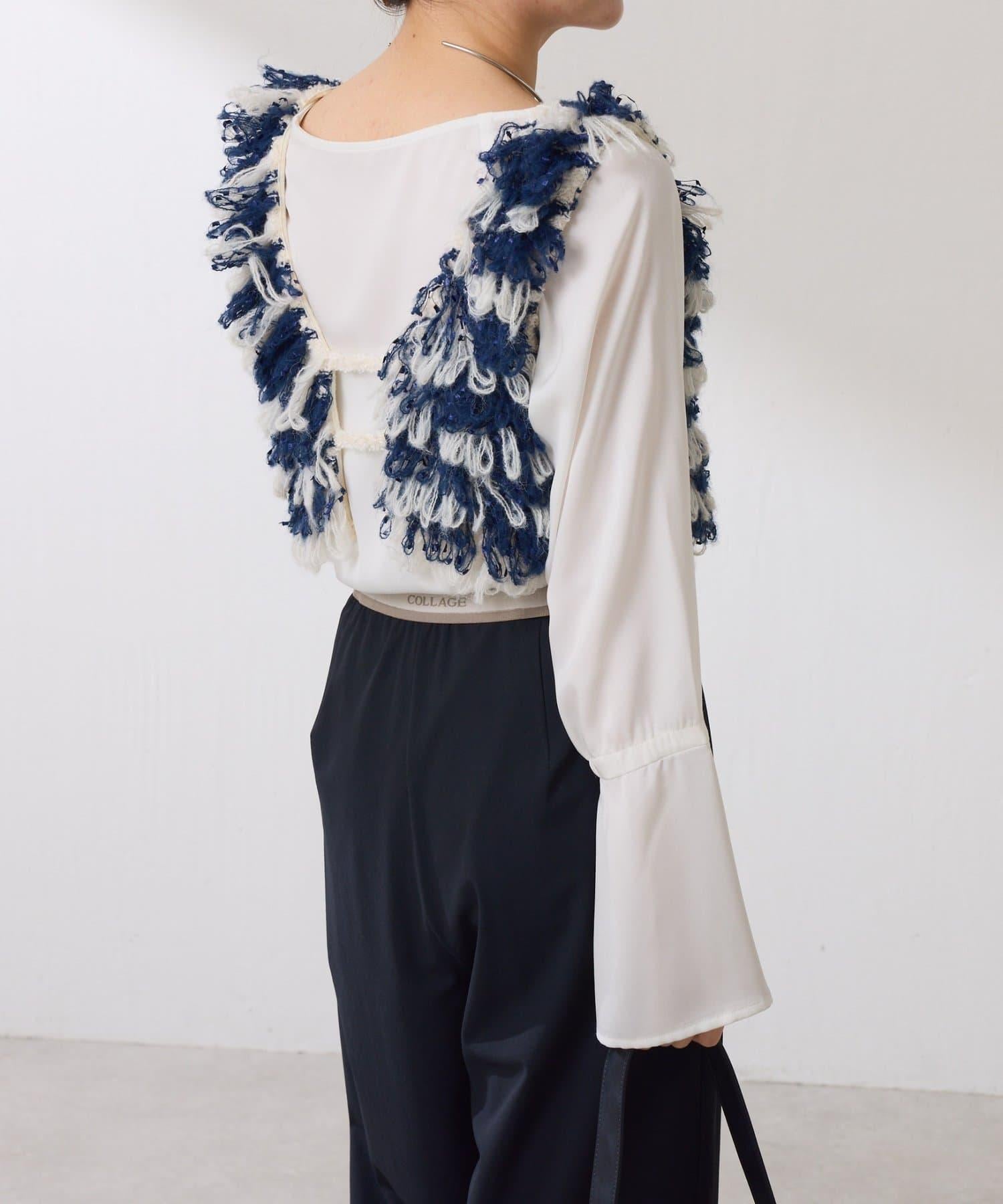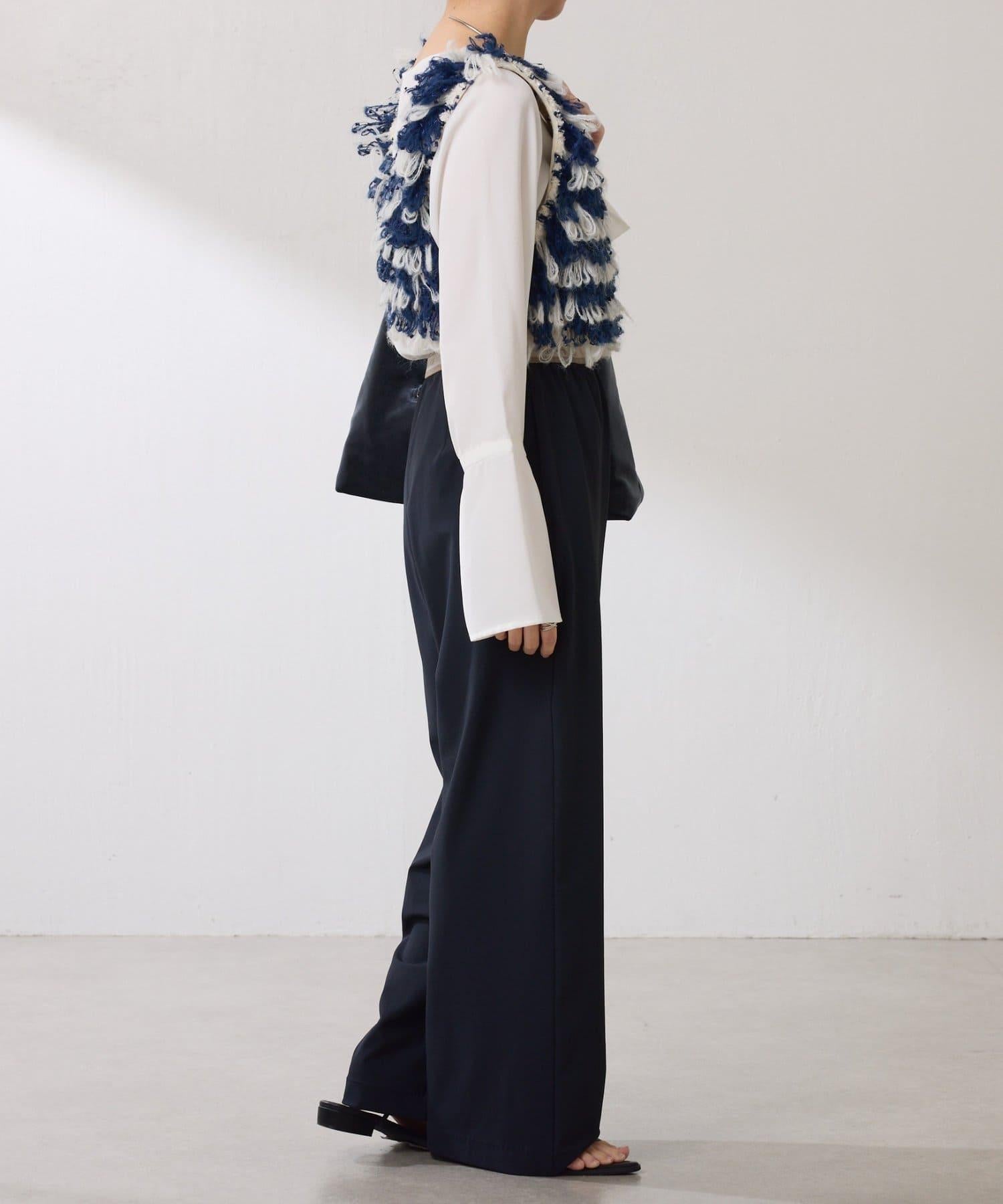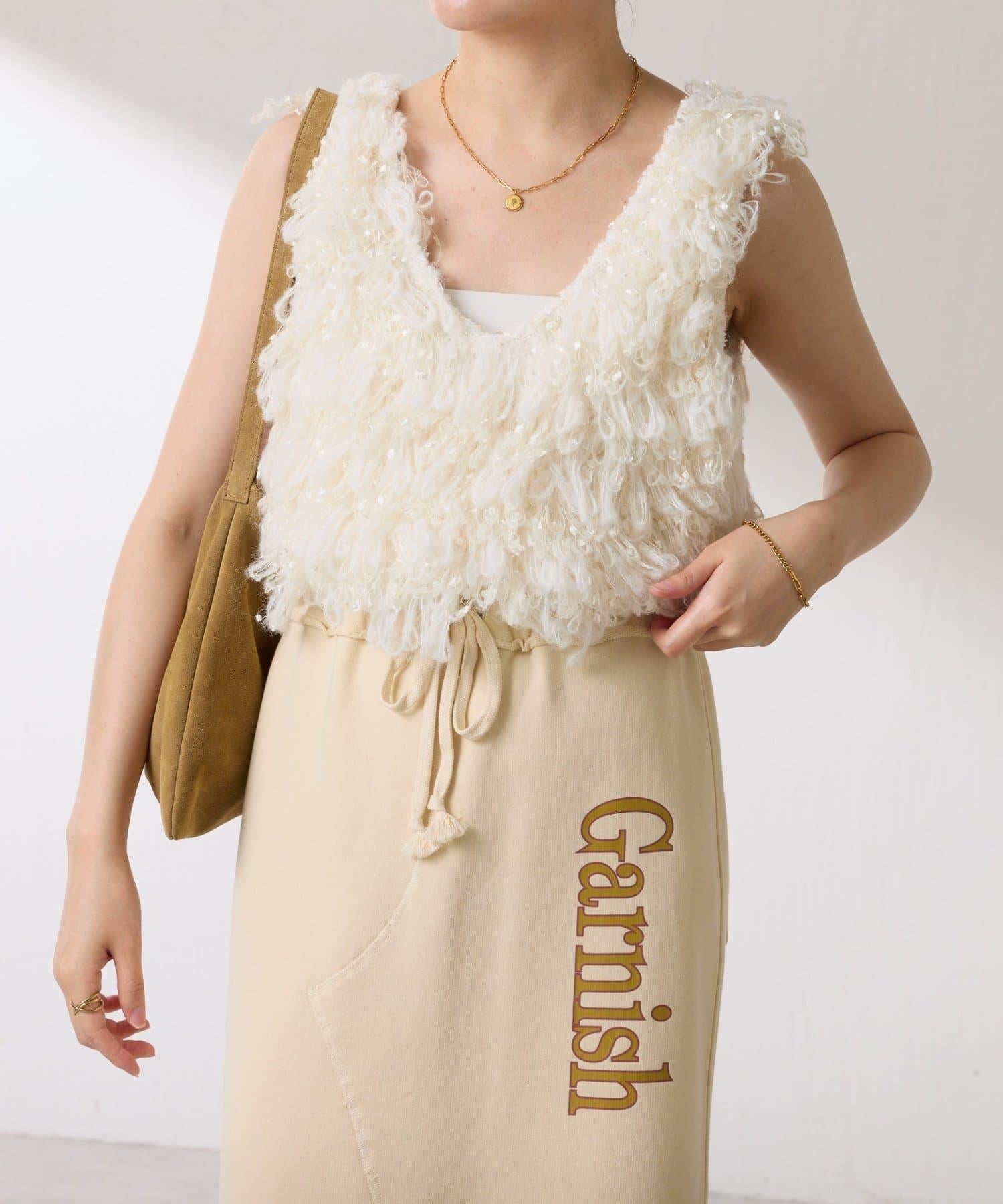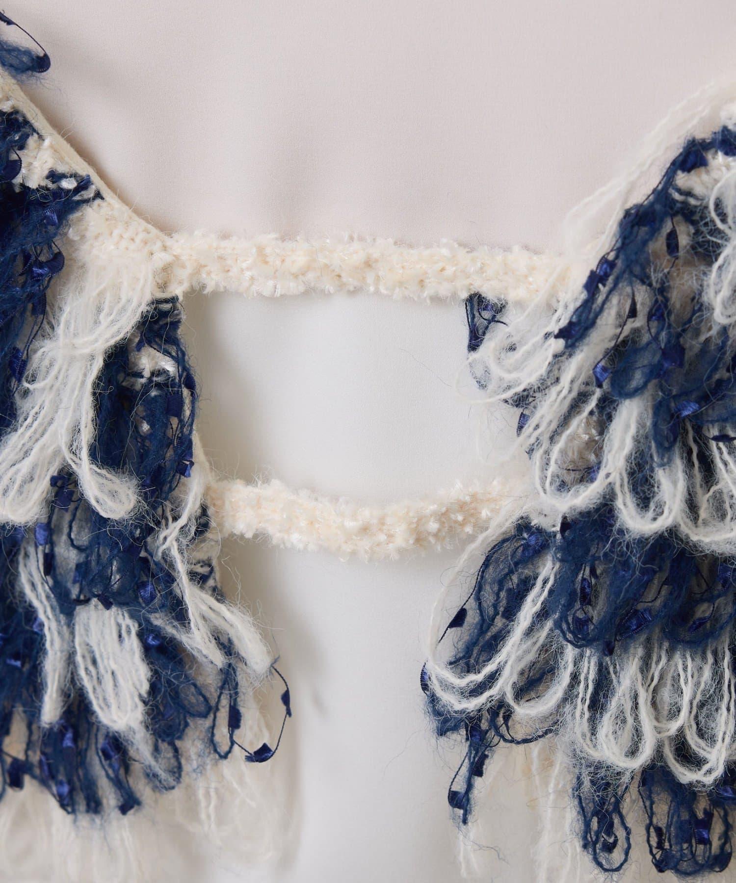 這款剪裁針織馬甲採用兩種紗線以線圈的形式編織成邊框。
