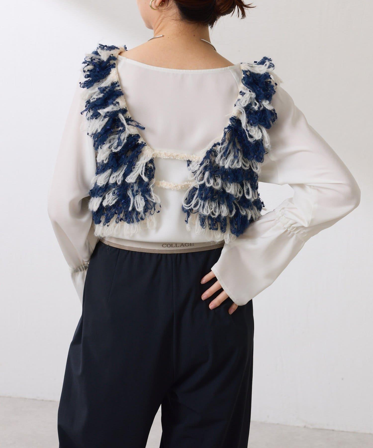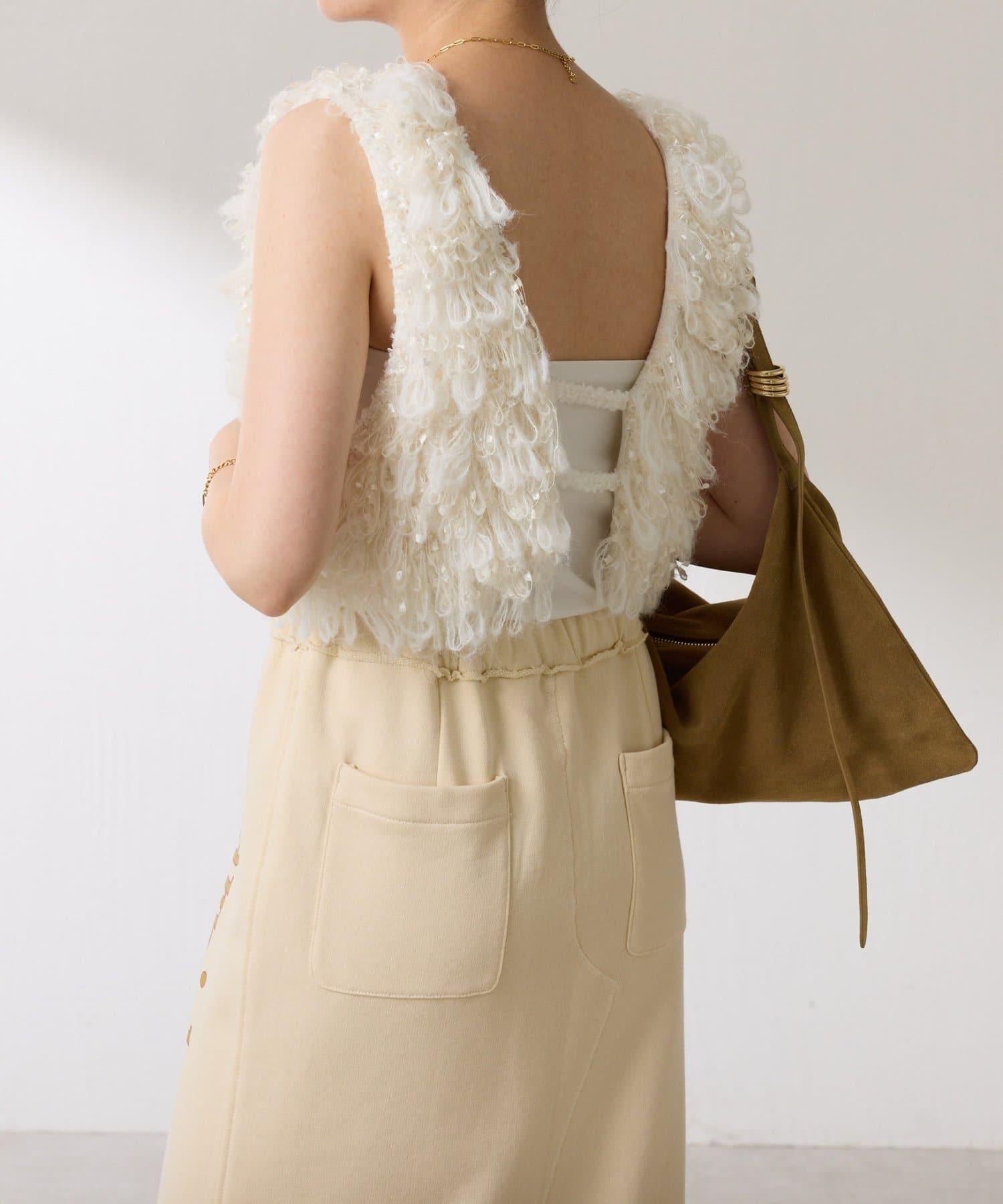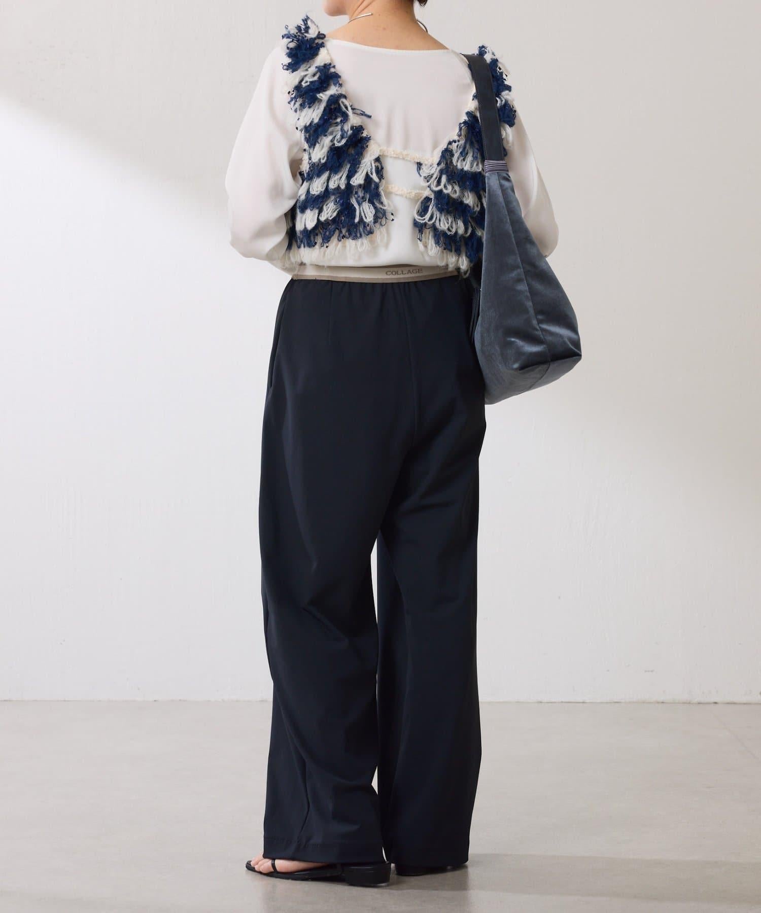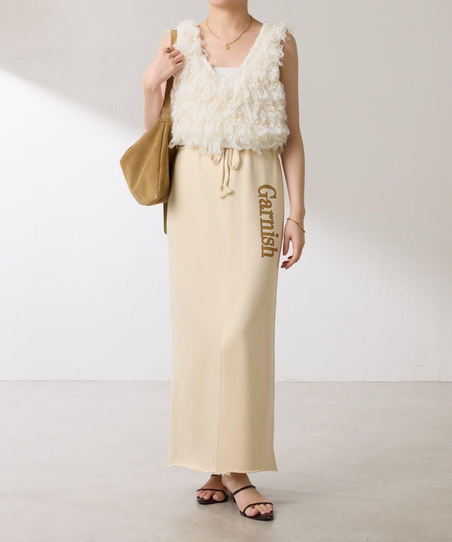 這款剪裁針織馬甲採用兩種紗線以線圈的形式編織成邊框。