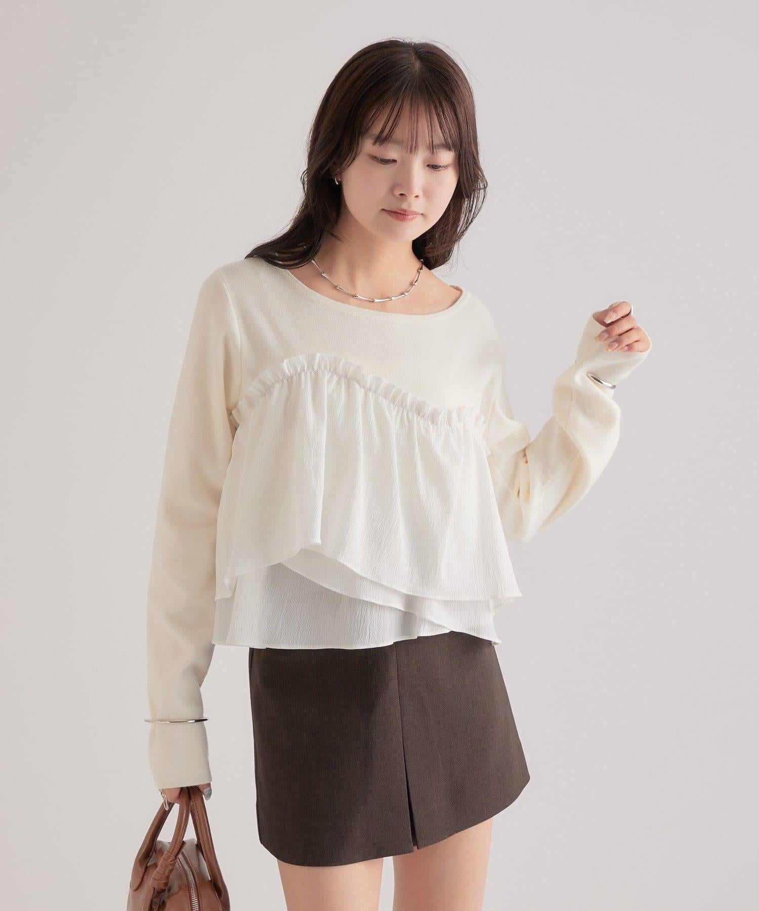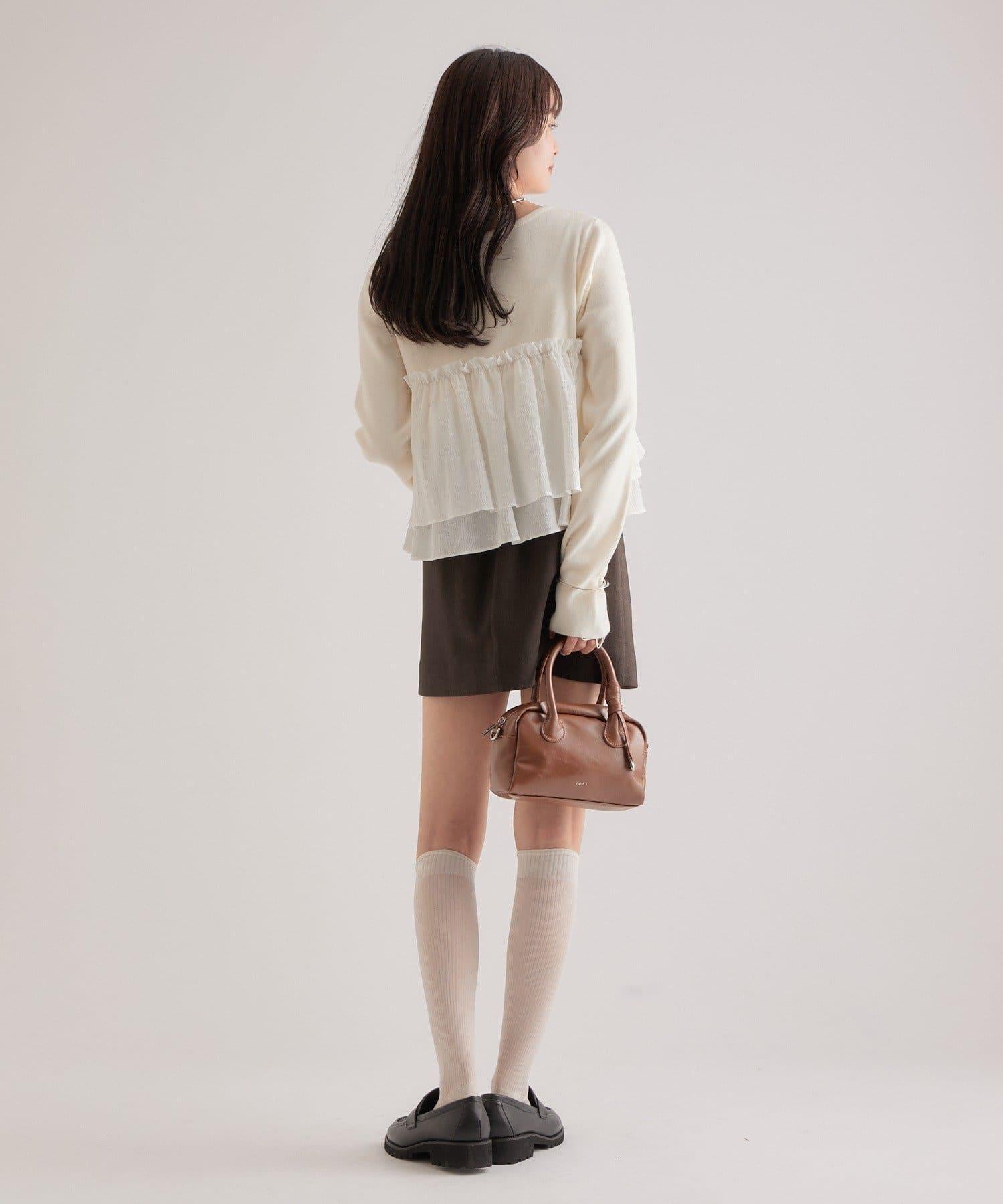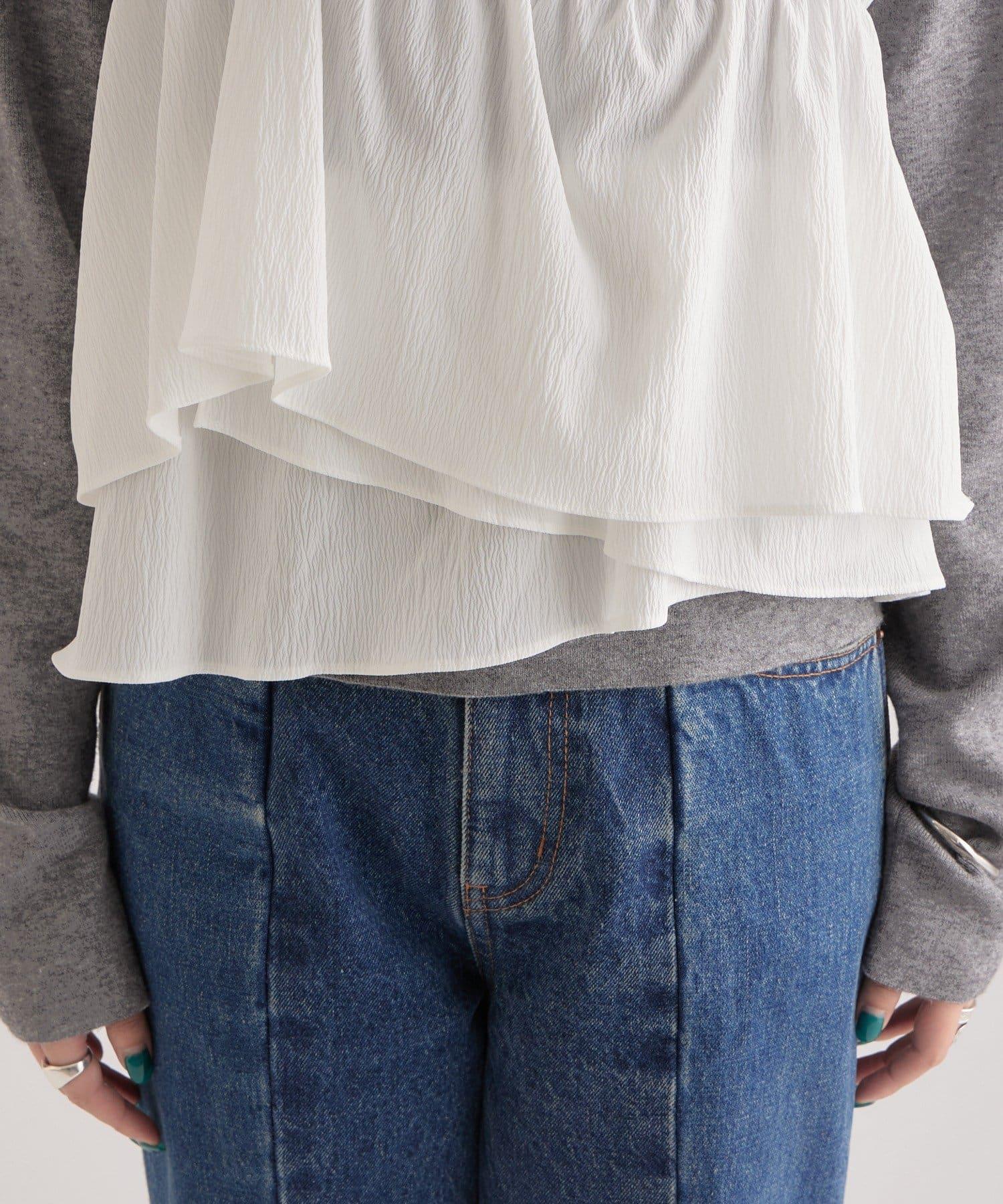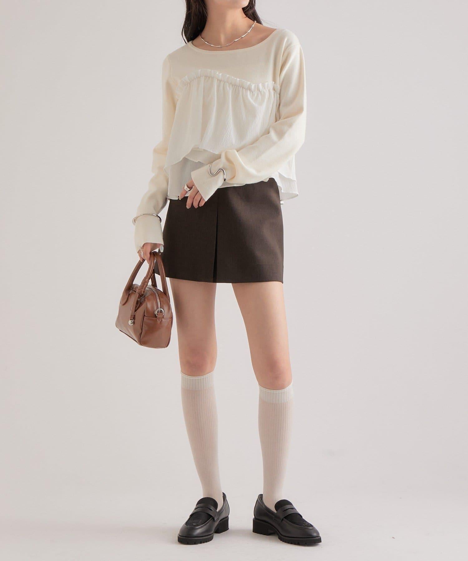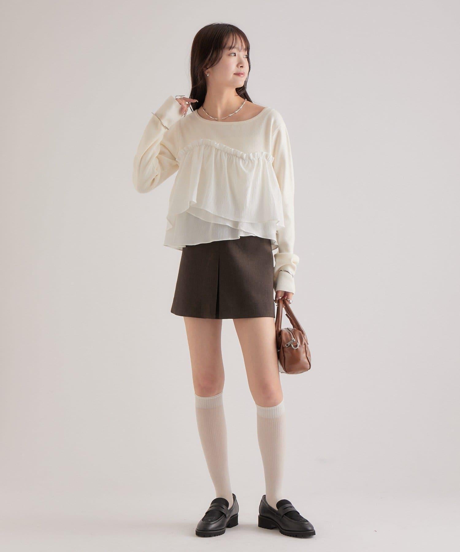 荷葉邊還能遮住腰部,所以和緊身打底褲很搭!