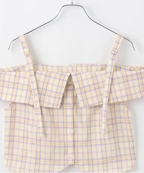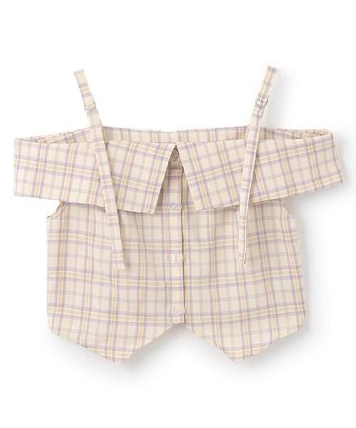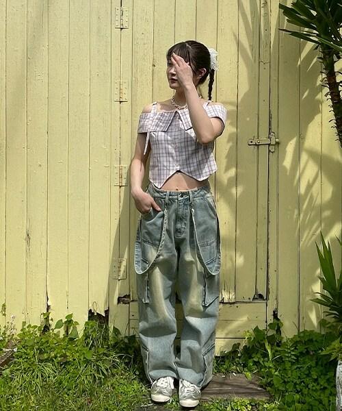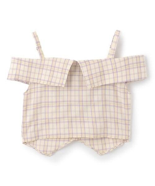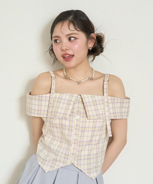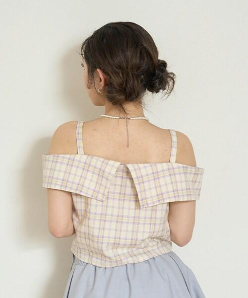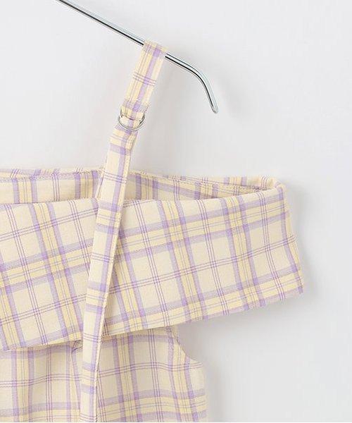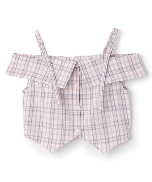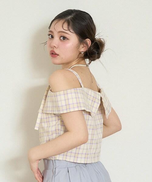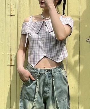 肩部細膩的腰帶繫帶和粉色格紋使其成為一款完美的少女風格單品☆這種設計讓肌膚得以展現,給人一種韓式ONNI風格的感覺。