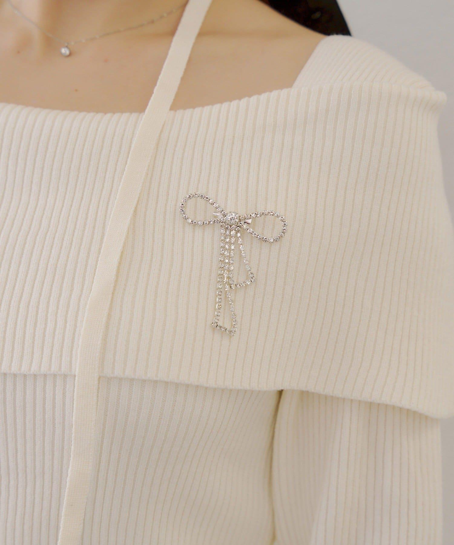 附帶的絲帶圖案胸針突出了協調性,為服裝增色不少。