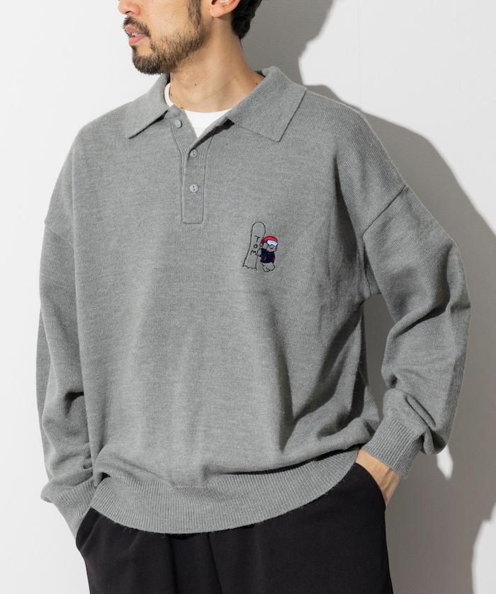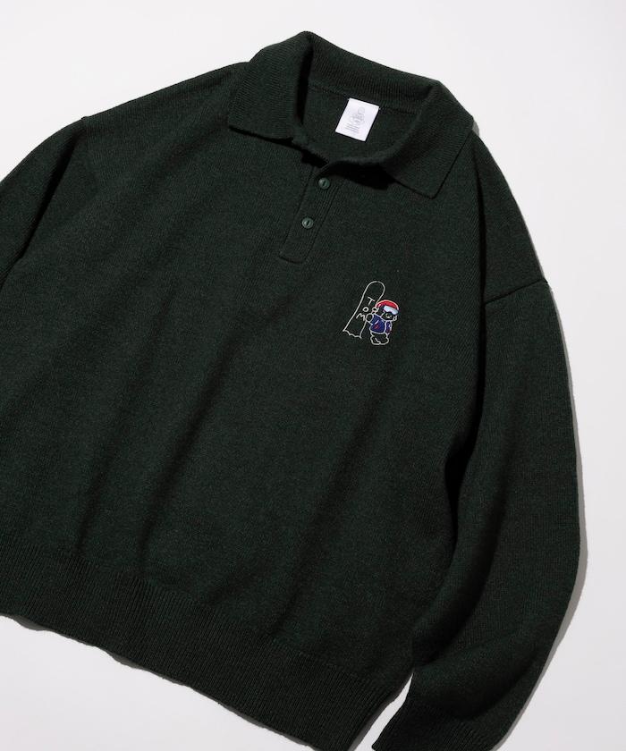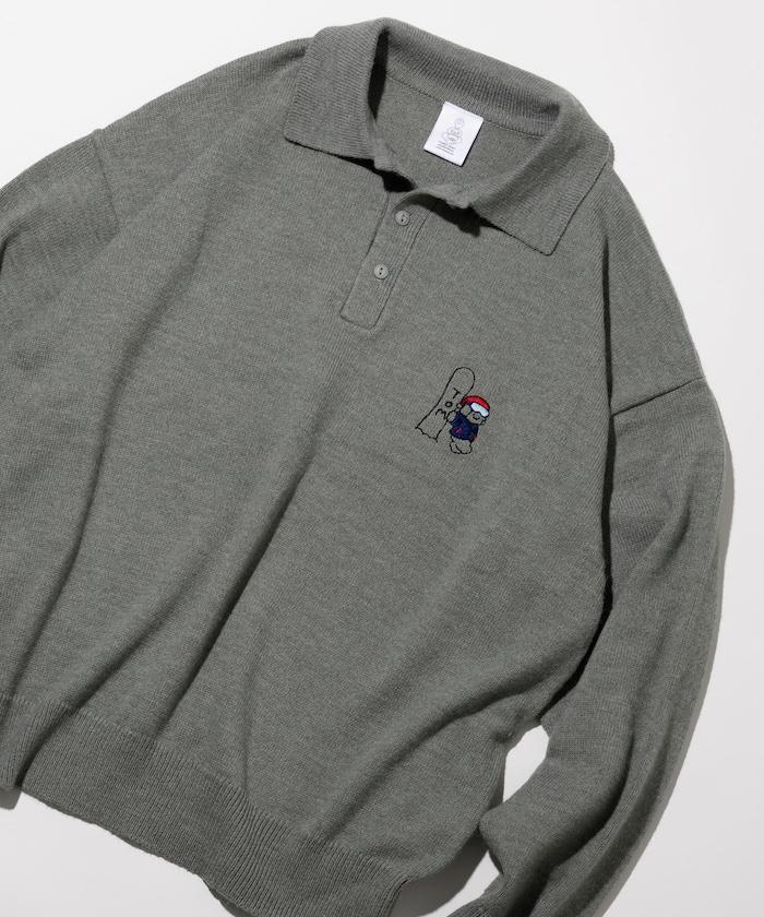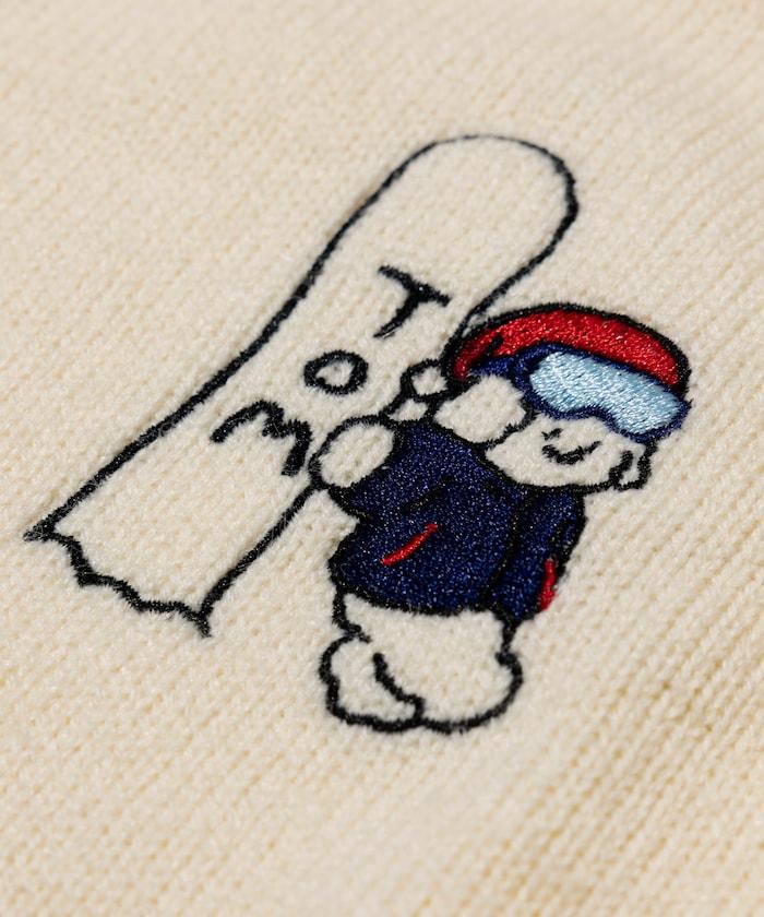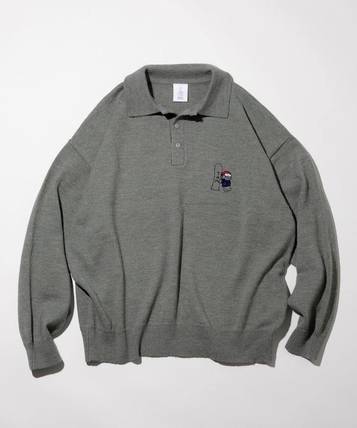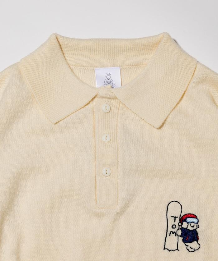 Polo領針織衫上繡有 tombonia 標誌性的手持滑雪板的 Mook 插畫。