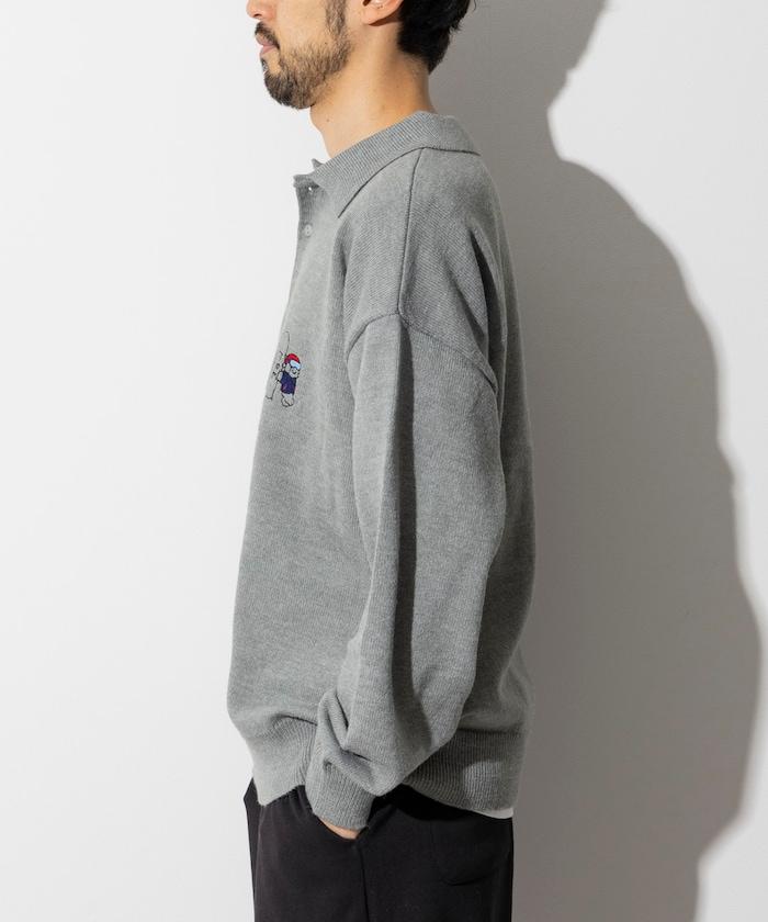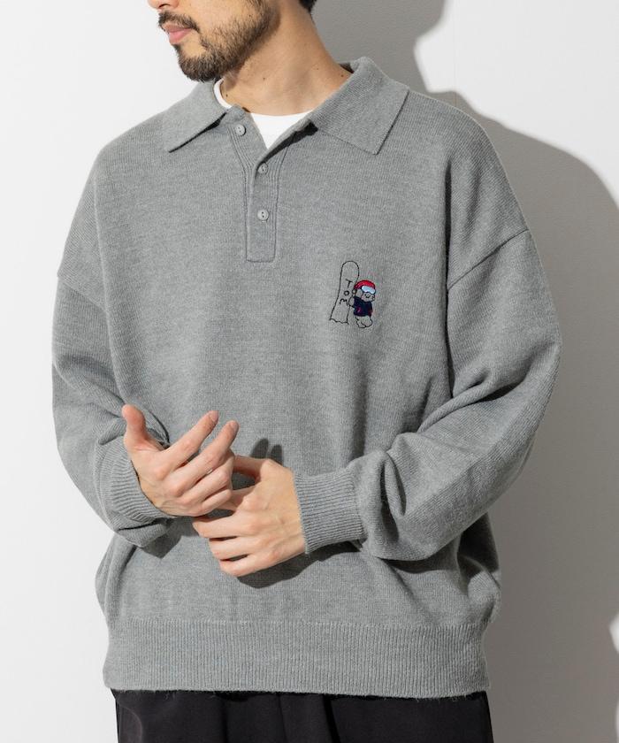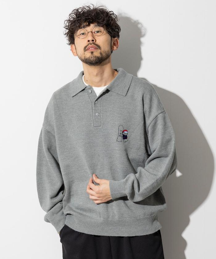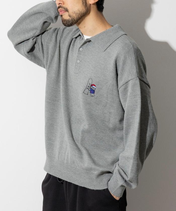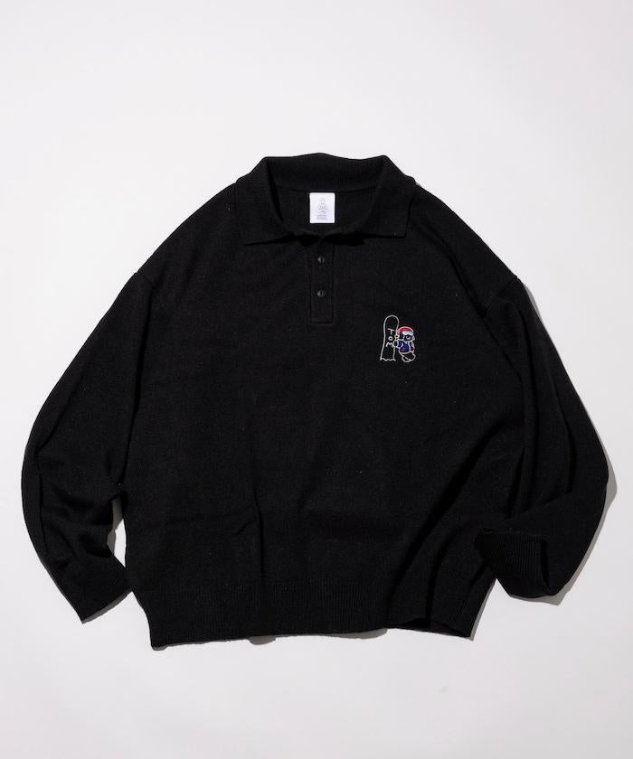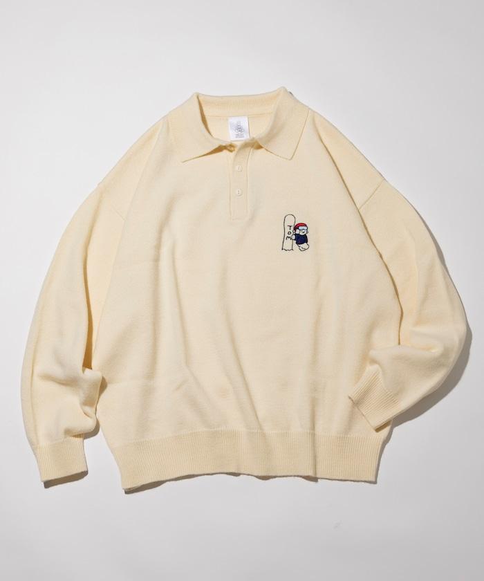 Polo領針織衫上繡有 tombonia 標誌性的手持滑雪板的 Mook 插畫。