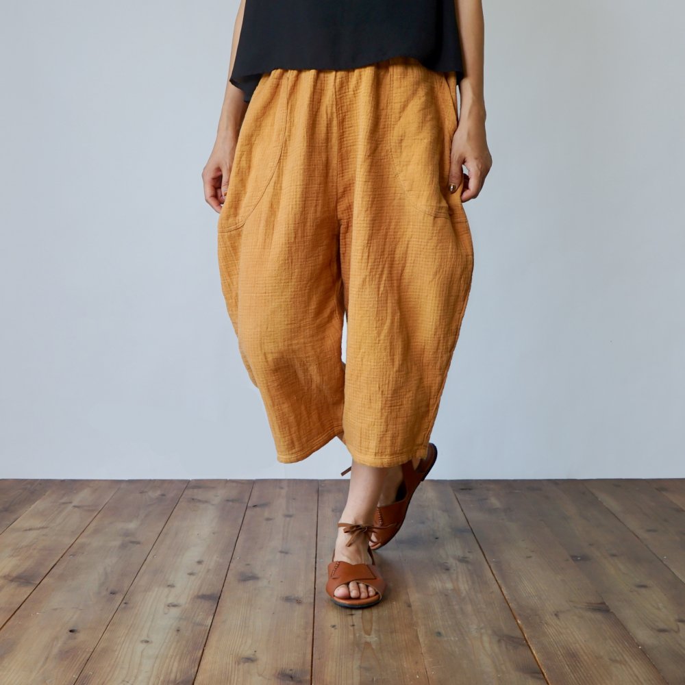 七分褲紗布氣球褲/橙色/知多棉 格子圖案紗布