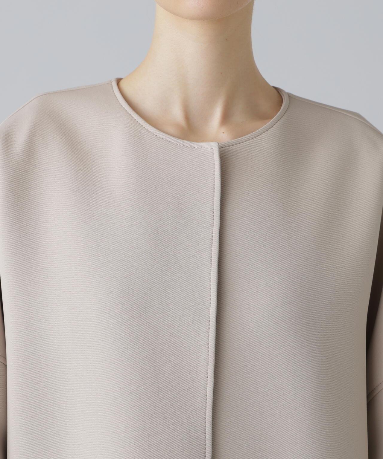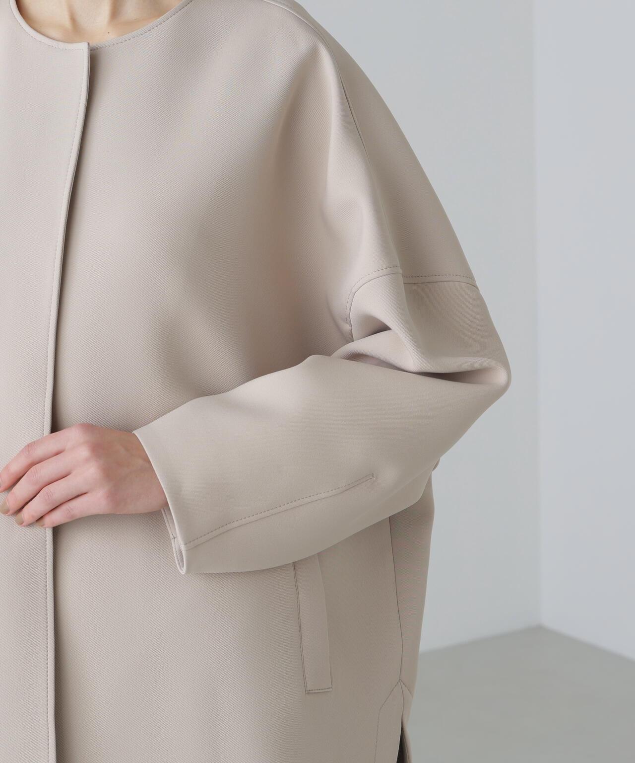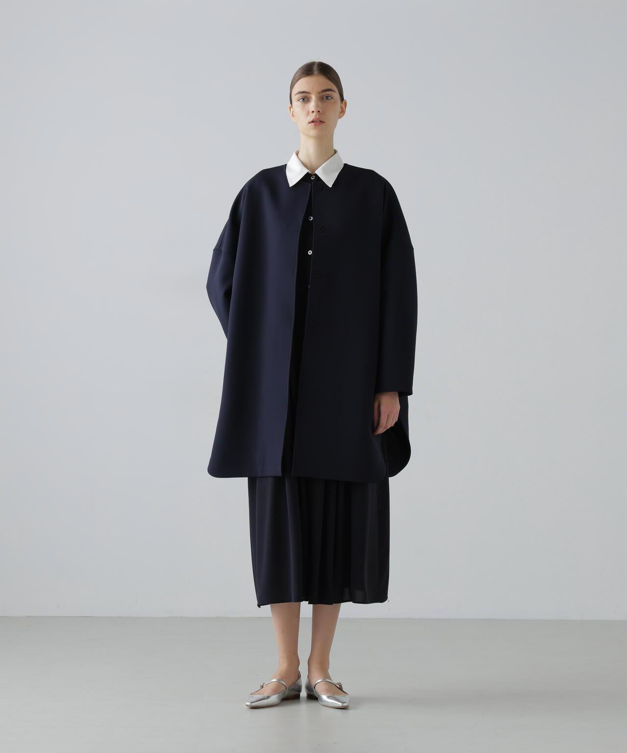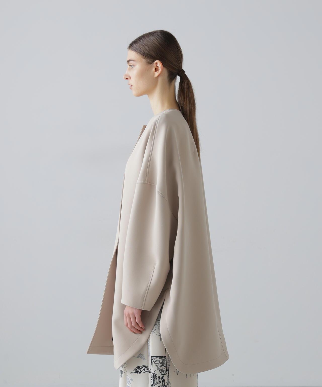 空氣雙層織物無領大衣,具有貼身感這款無領大衣採用 Spondech 輕質面料製成。這款大衣的輪廓給人以寬敞、圓潤的感覺。採用膨體滌綸加工紗線製成,具有獨特的回彈感,通過spondex和高度的三重結構表現出來。