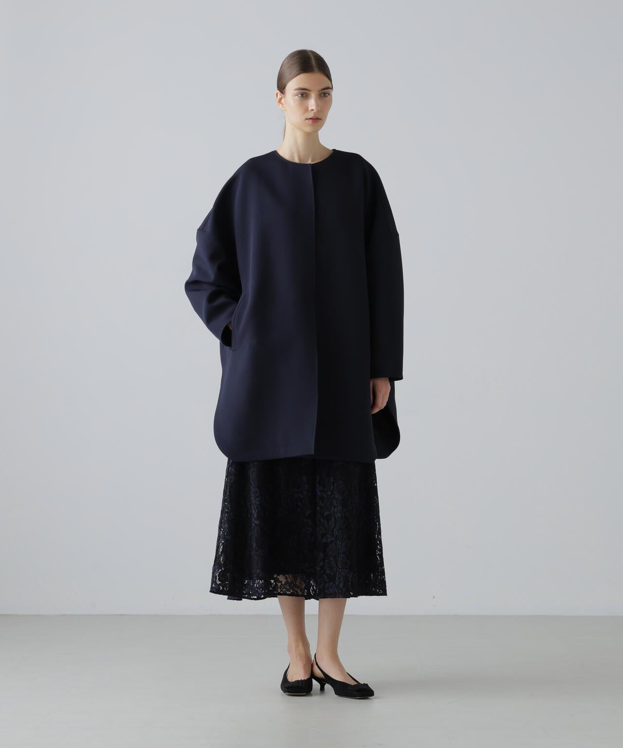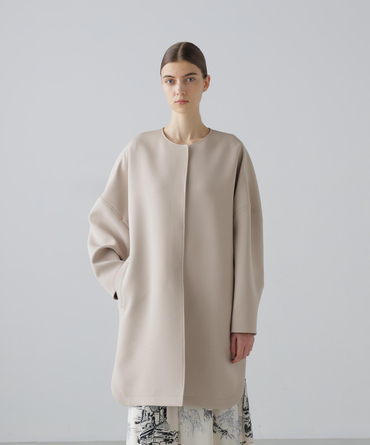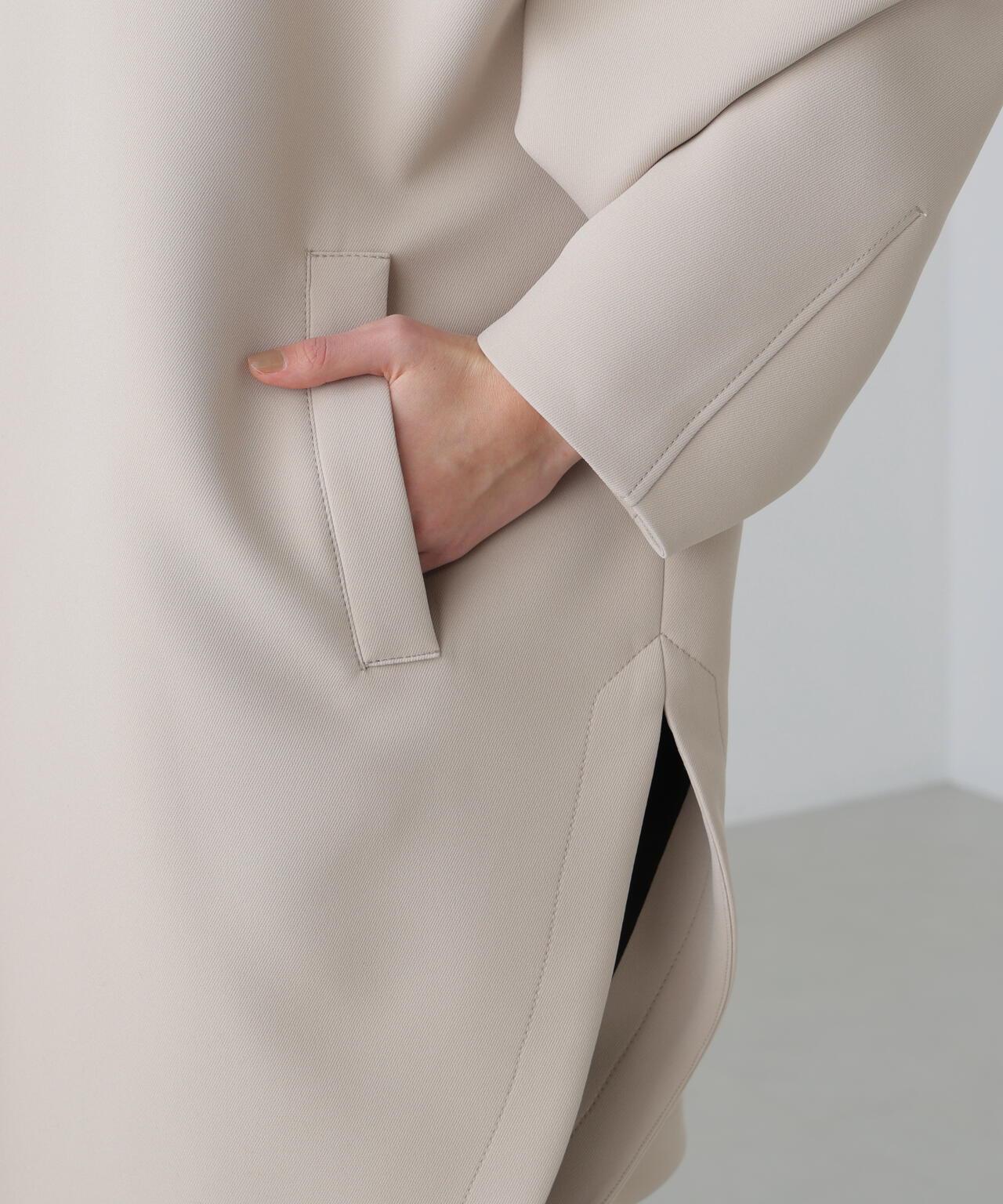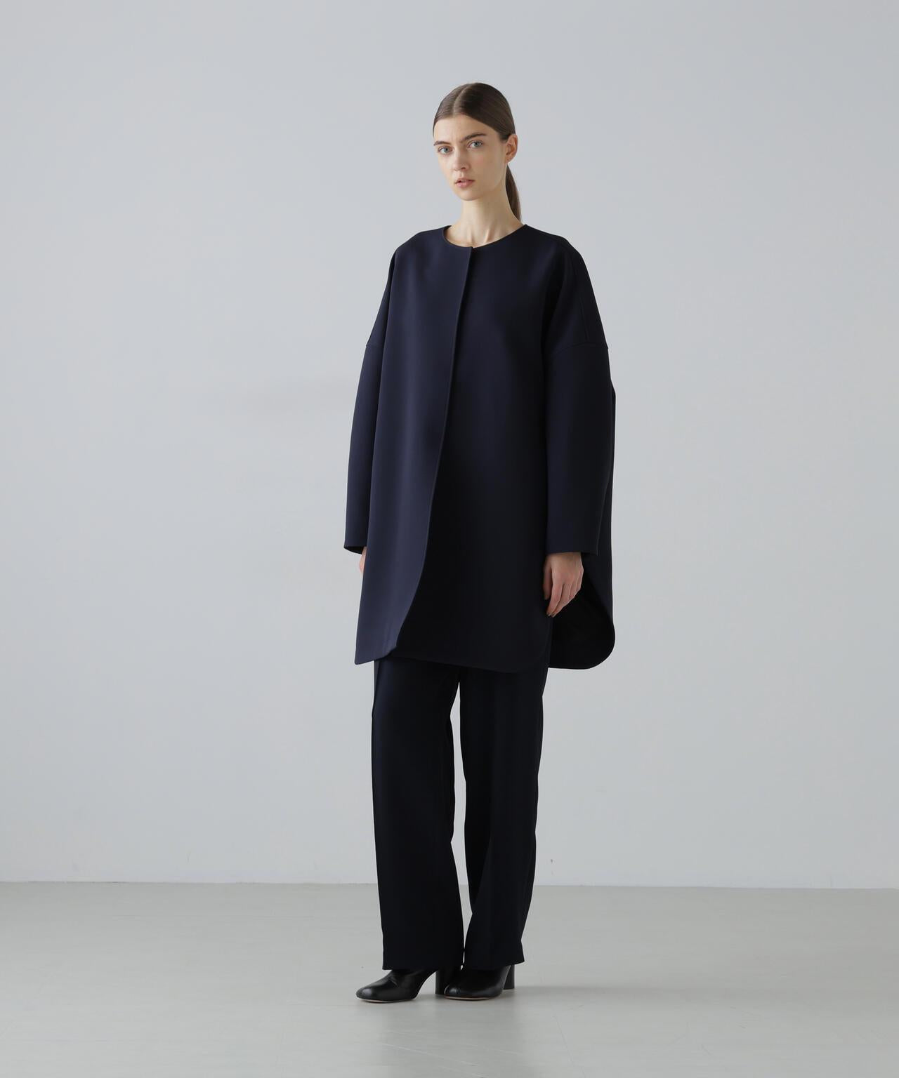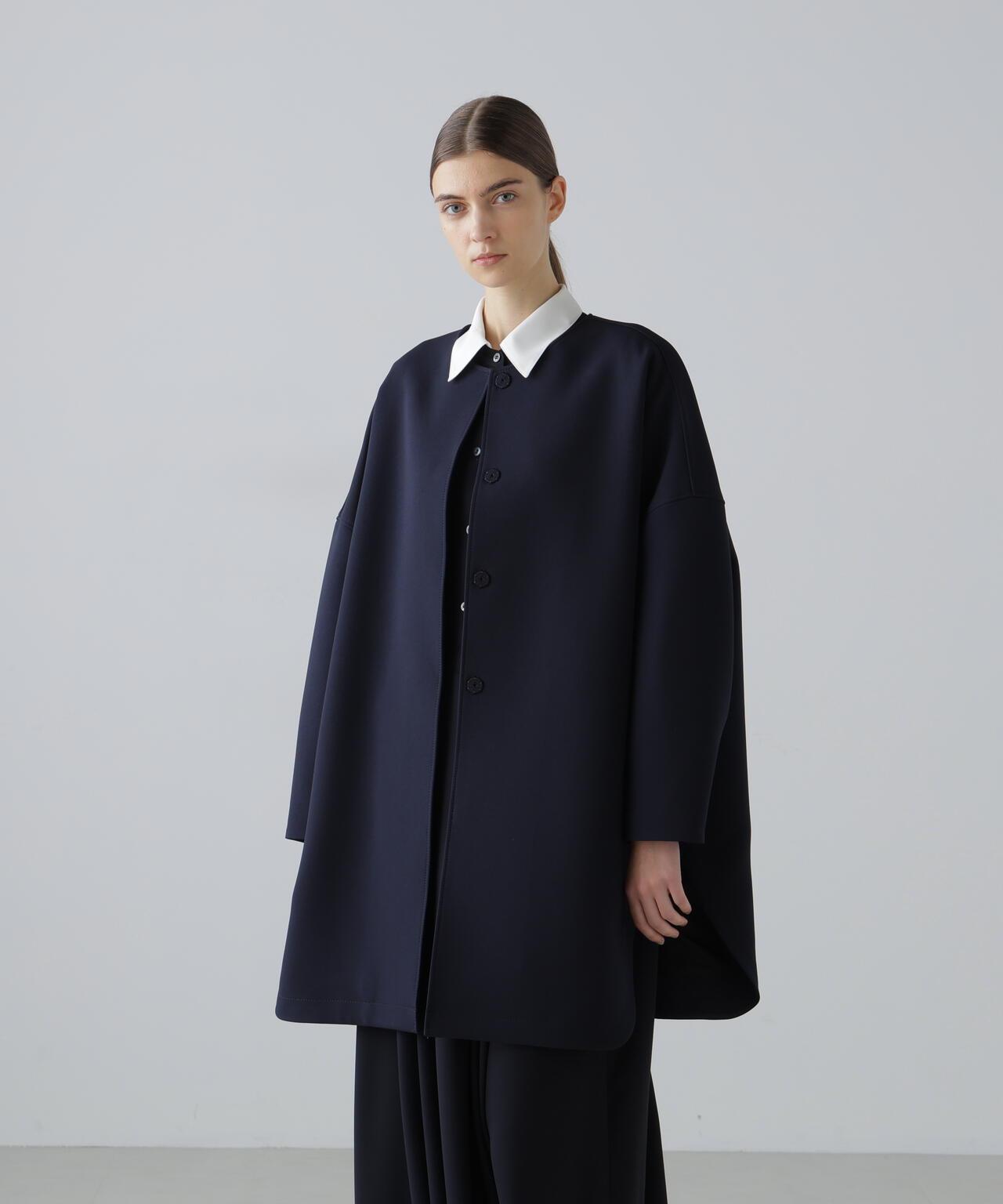 空氣雙層織物無領大衣,具有貼身感這款無領大衣採用 Spondech 輕質面料製成。這款大衣的輪廓給人以寬敞、圓潤的感覺。採用膨體滌綸加工紗線製成,具有獨特的回彈感,通過spondex和高度的三重結構表現出來。