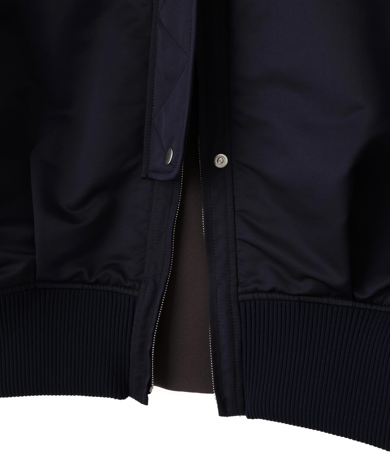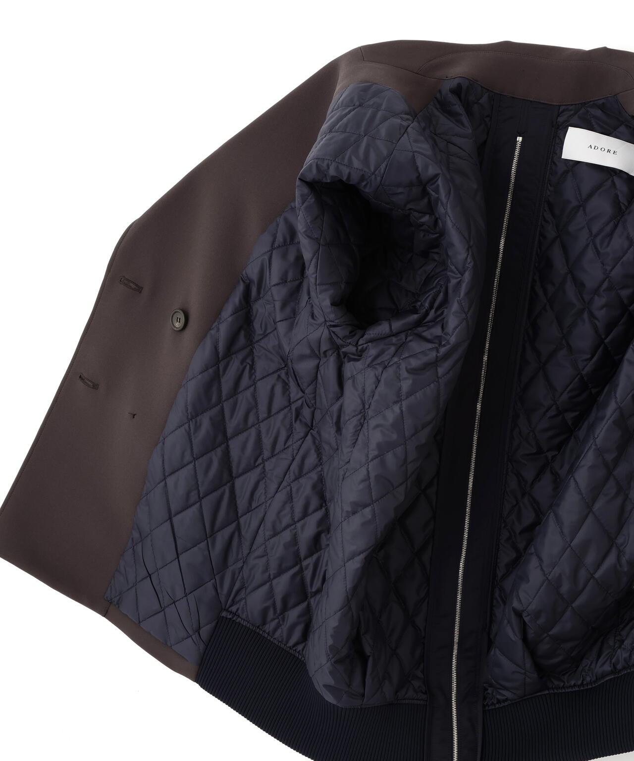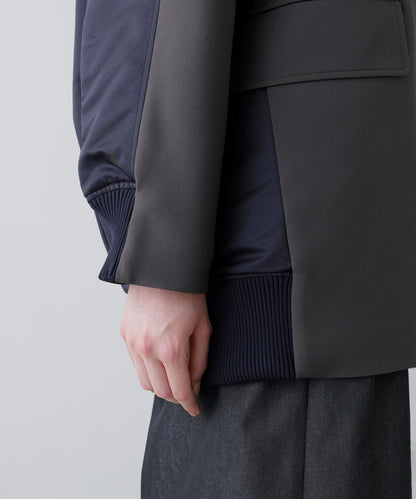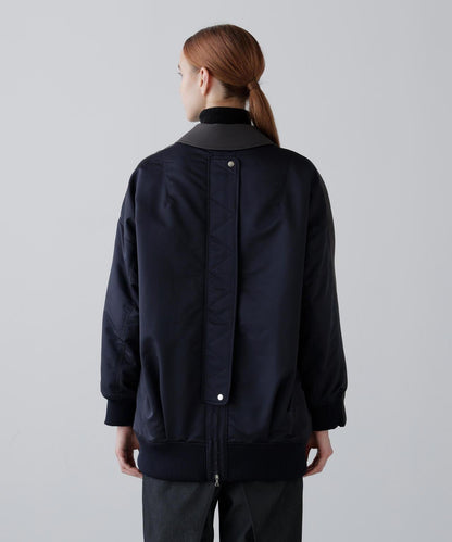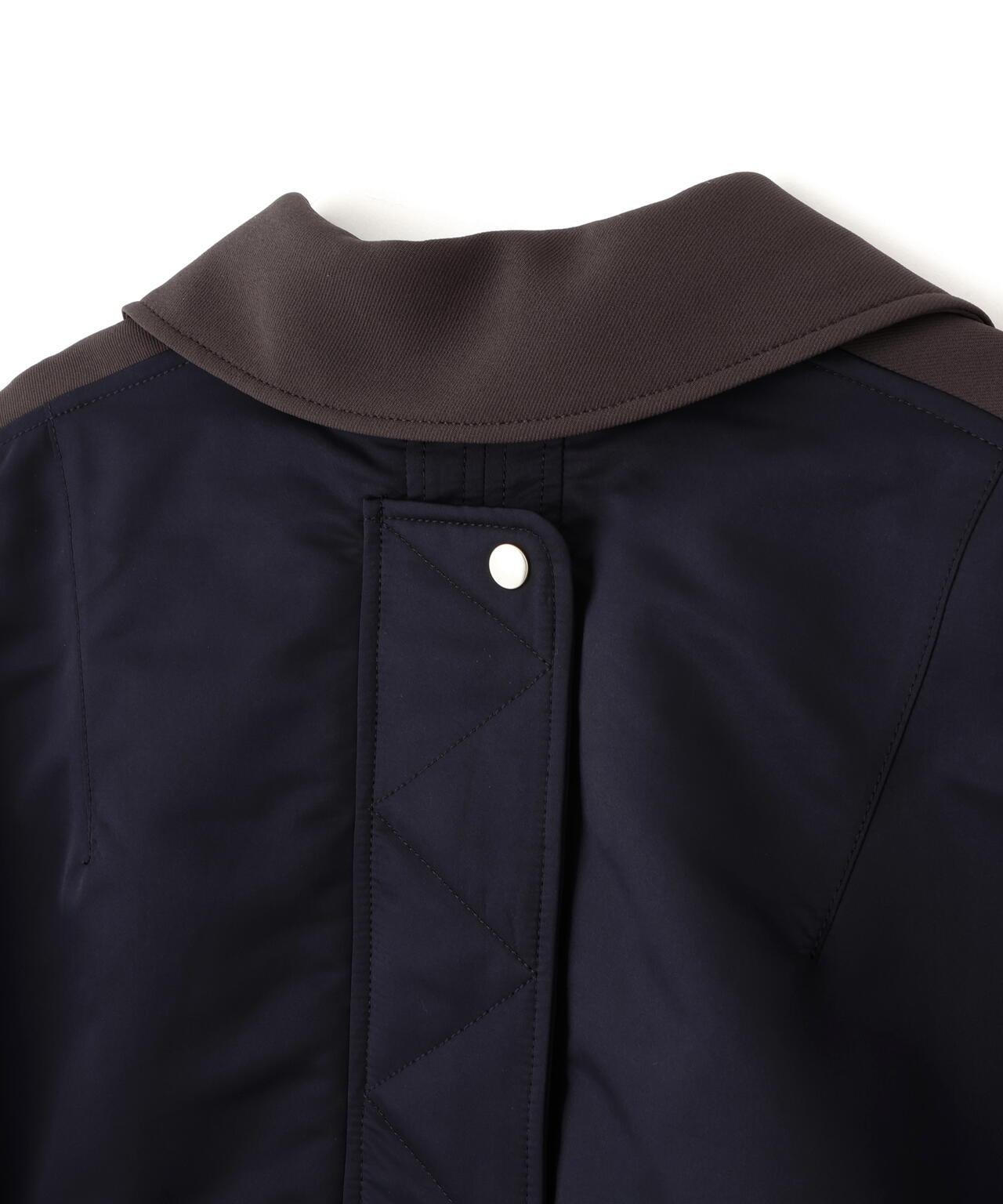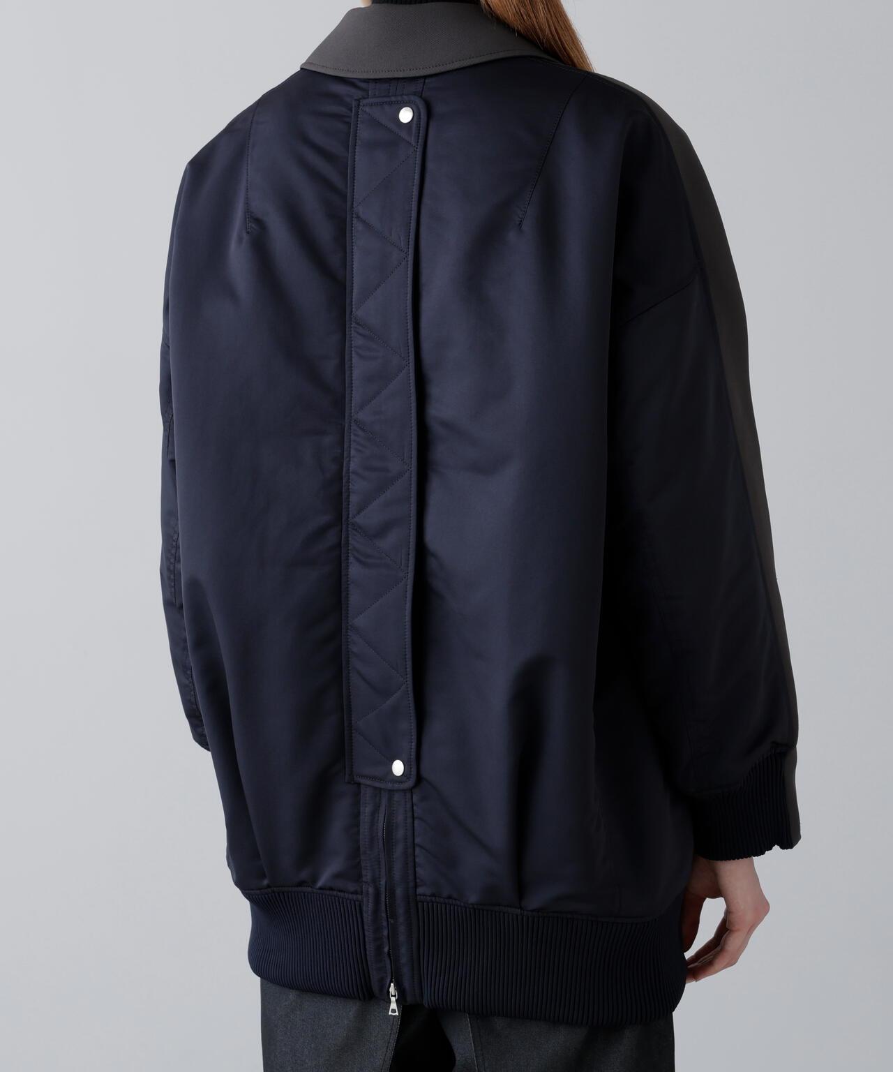 三層交叉塔夫綢組合夾克,結構廓形設計夾克的前襟為厚合成纖維面料,後襟為輕薄塔夫綢面料。略帶繭型的剪裁融合了雙層夾克和寬鬆夾克的元素。絎縫棉襯裡。採用柔軟亮澤的塔夫綢面料製成,密度高,具有獨特的回彈感,這種面料使用了膨鬆的滌綸加工紗線和三重結構的spondish和高度。