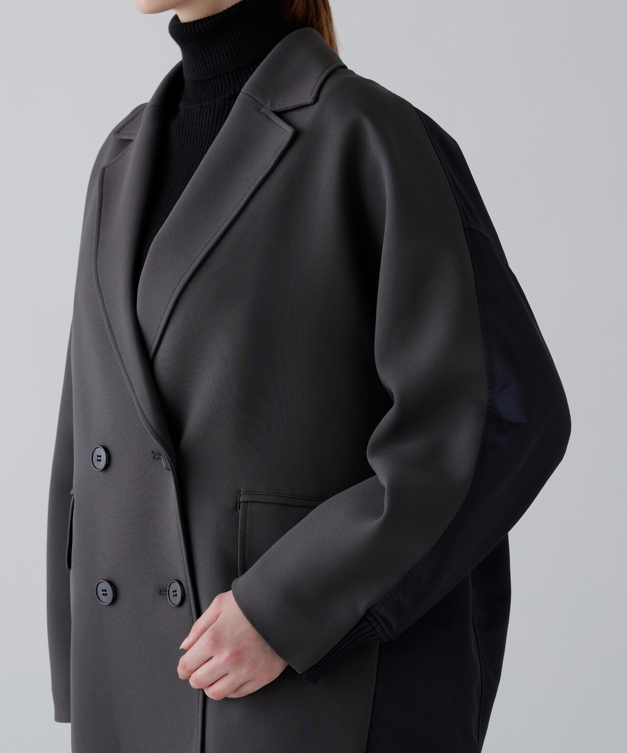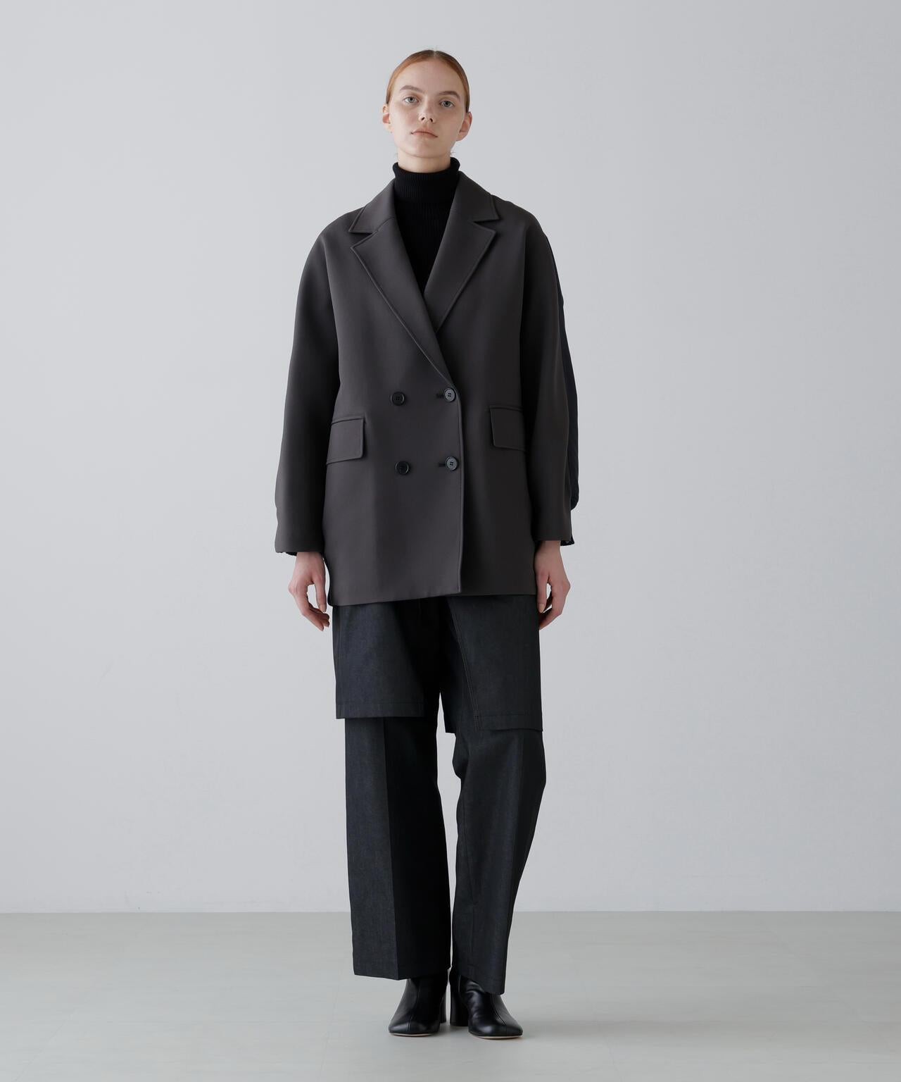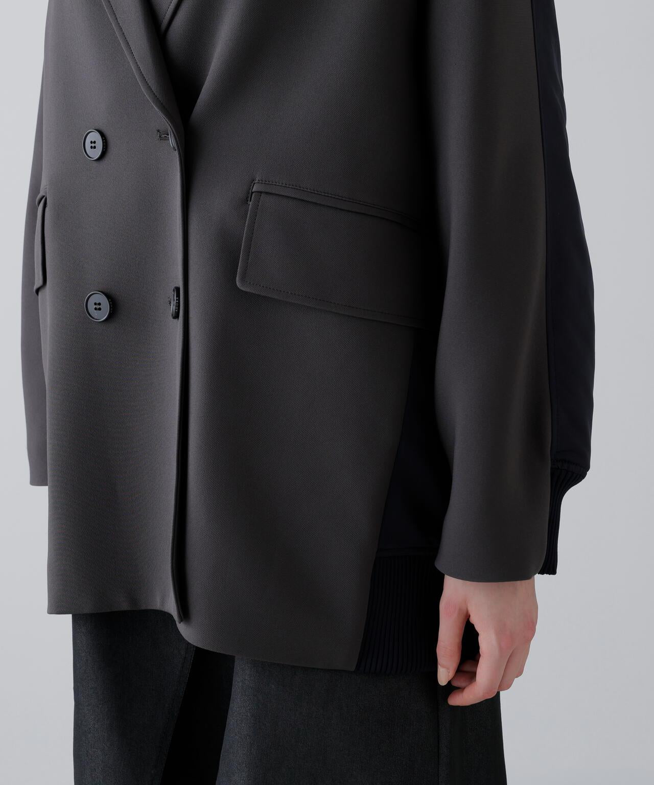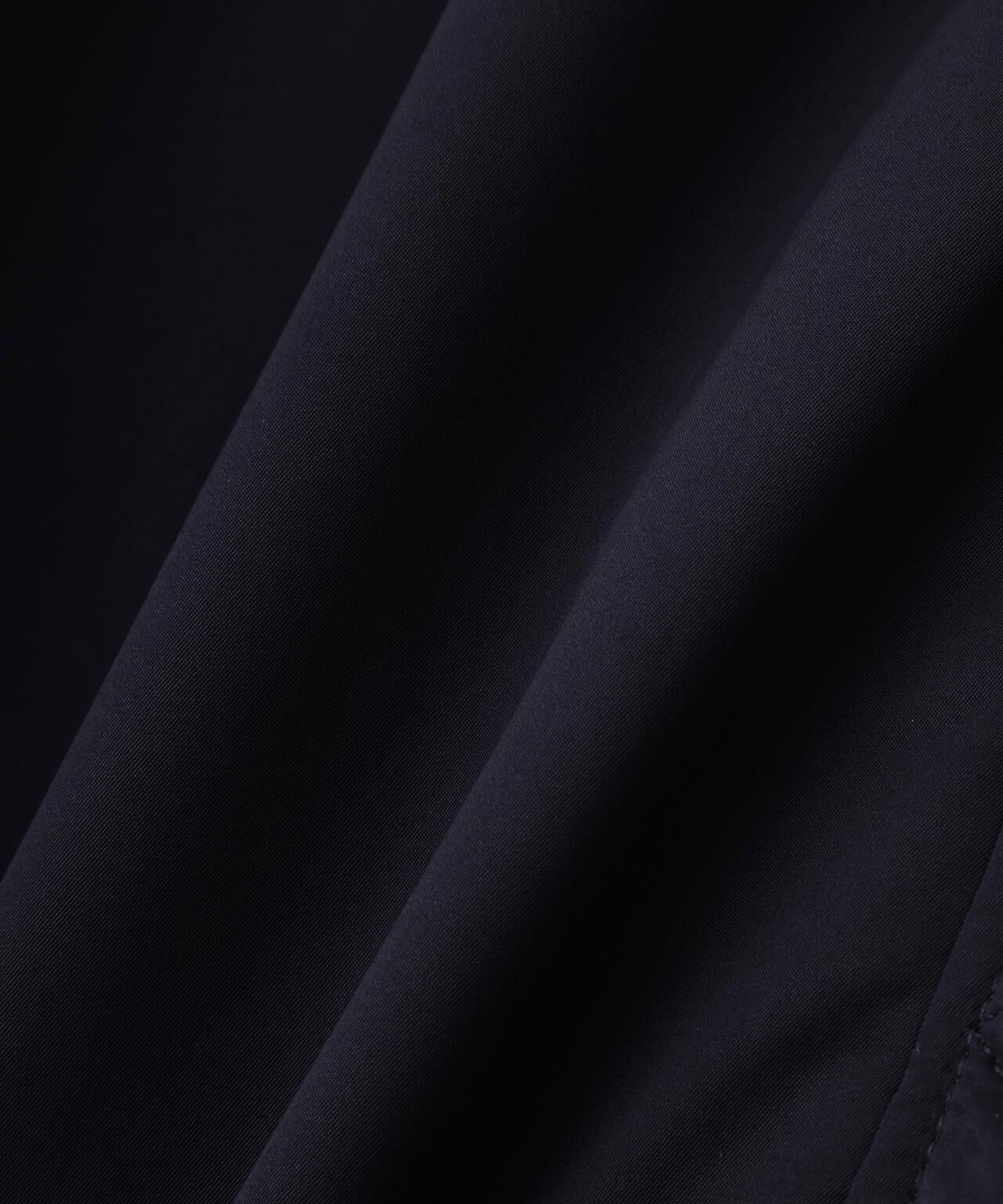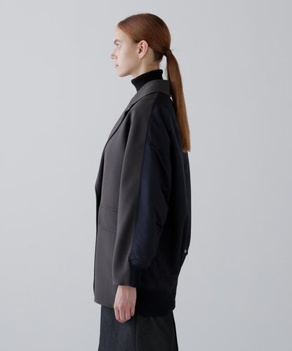 三層交叉塔夫綢組合夾克,結構廓形設計夾克的前襟為厚合成纖維面料,後襟為輕薄塔夫綢面料。略帶繭型的剪裁融合了雙層夾克和寬鬆夾克的元素。絎縫棉襯裡。採用柔軟亮澤的塔夫綢面料製成,密度高,具有獨特的回彈感,這種面料使用了膨鬆的滌綸加工紗線和三重結構的spondish和高度。