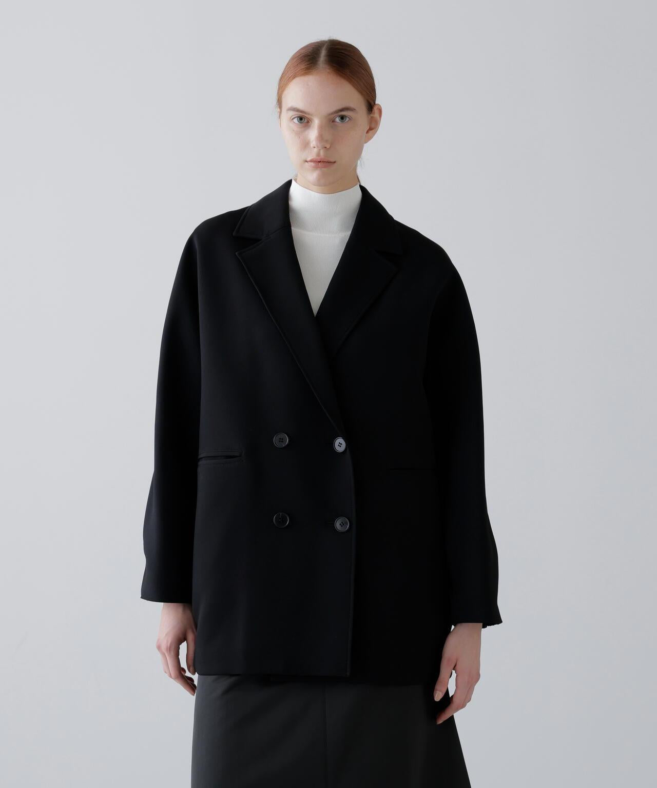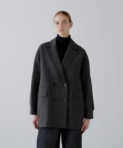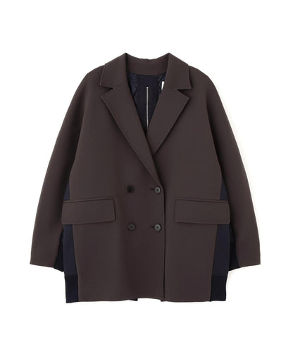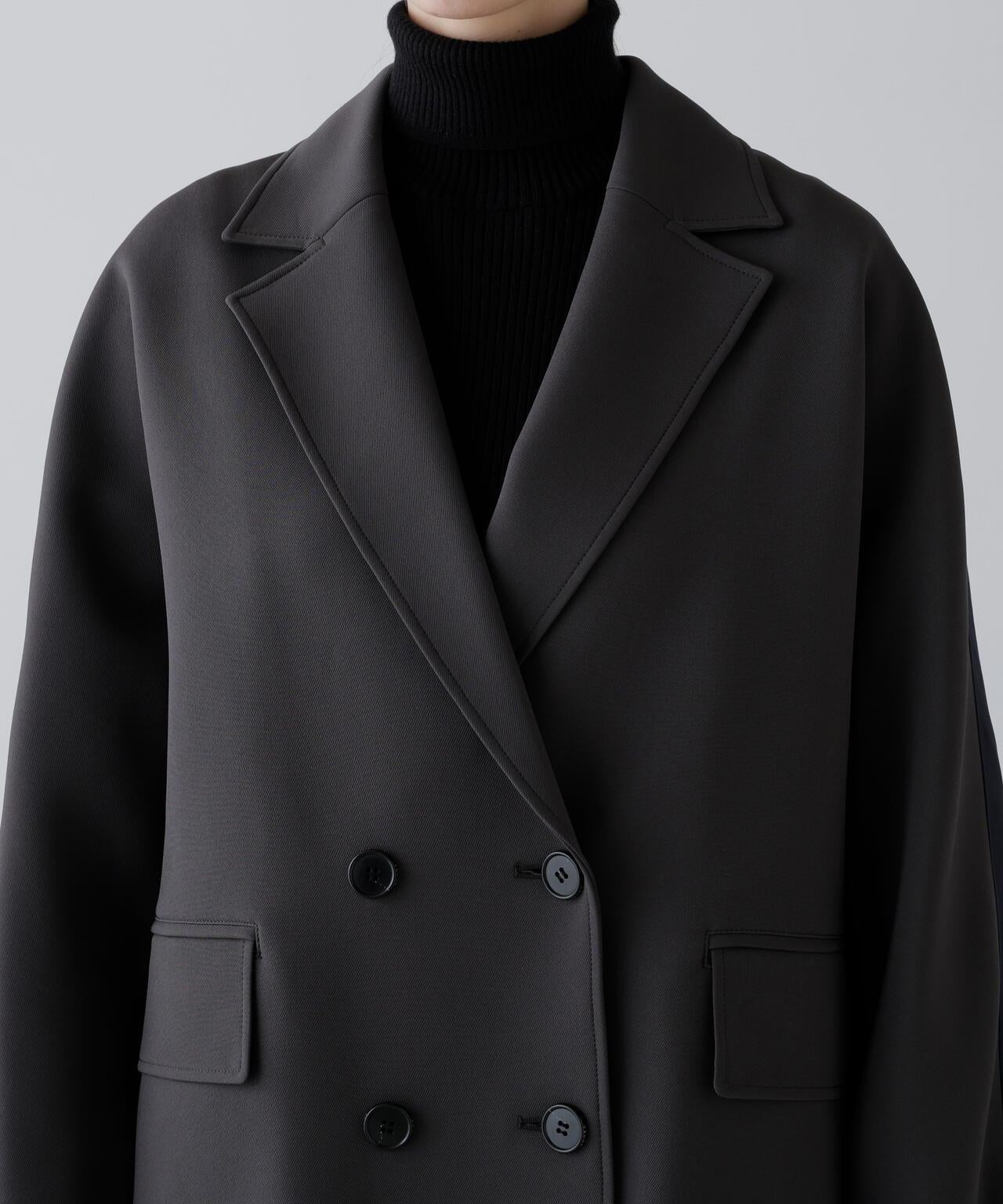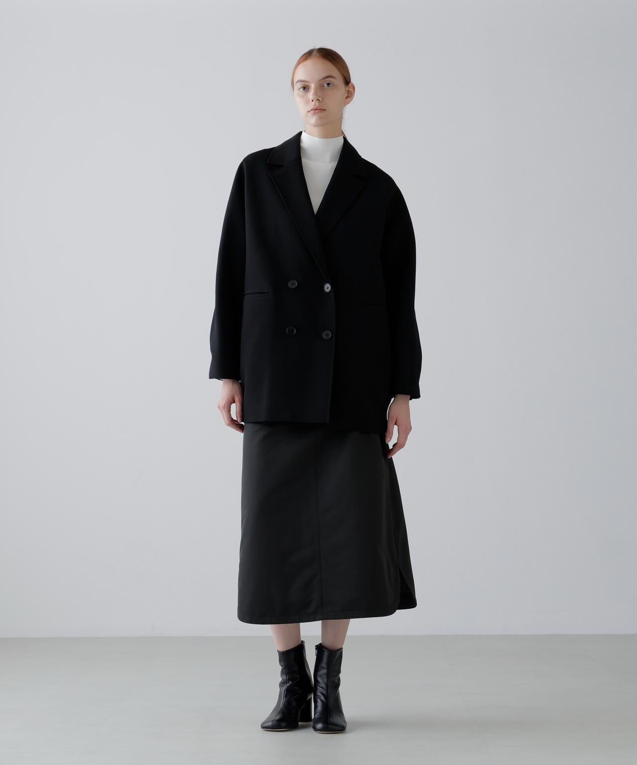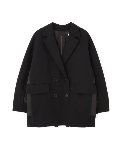 三層交叉塔夫綢組合夾克,結構廓形設計夾克的前襟為厚合成纖維面料,後襟為輕薄塔夫綢面料。略帶繭型的剪裁融合了雙層夾克和寬鬆夾克的元素。絎縫棉襯裡。採用柔軟亮澤的塔夫綢面料製成,密度高,具有獨特的回彈感,這種面料使用了膨鬆的滌綸加工紗線和三重結構的spondish和高度。