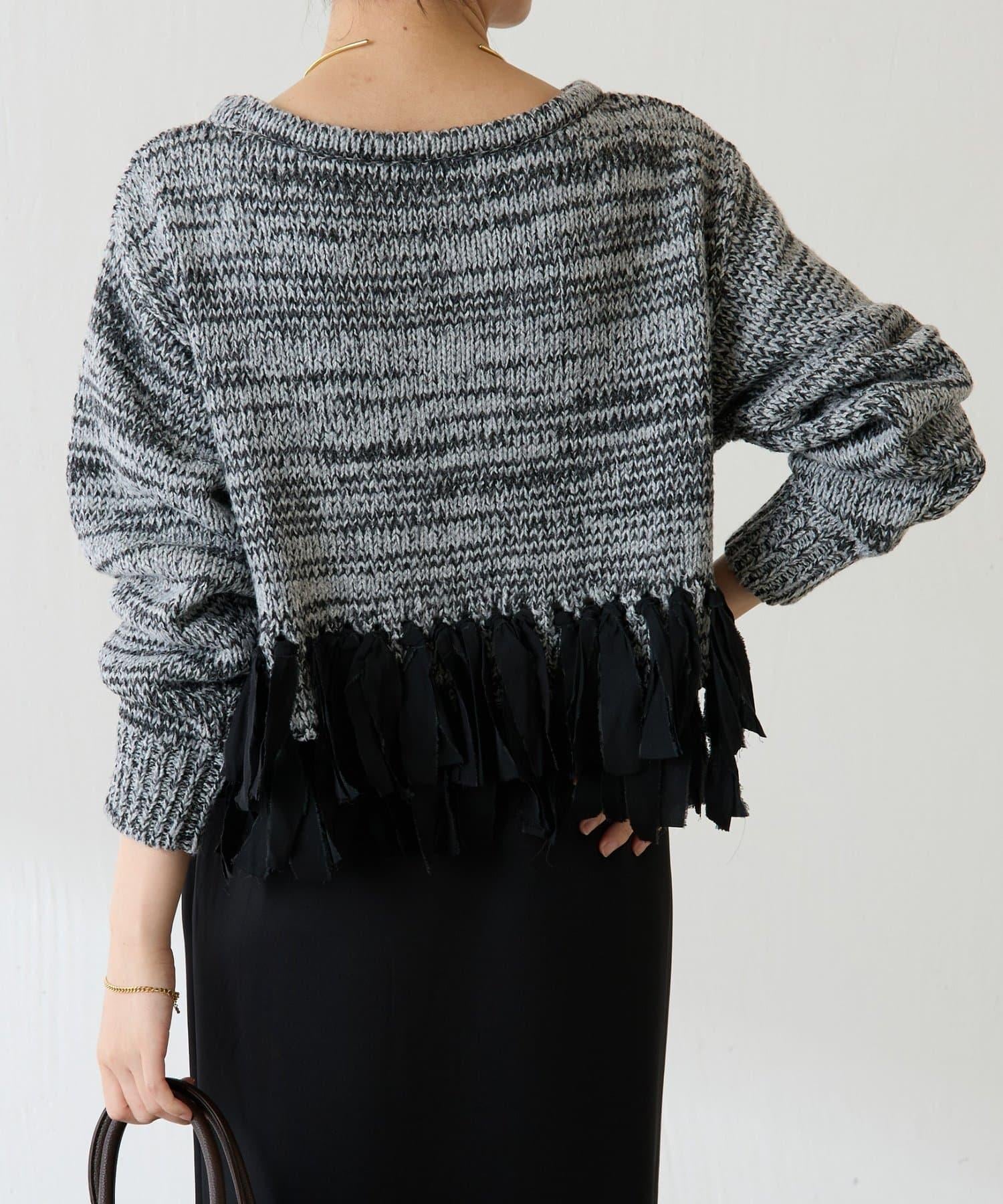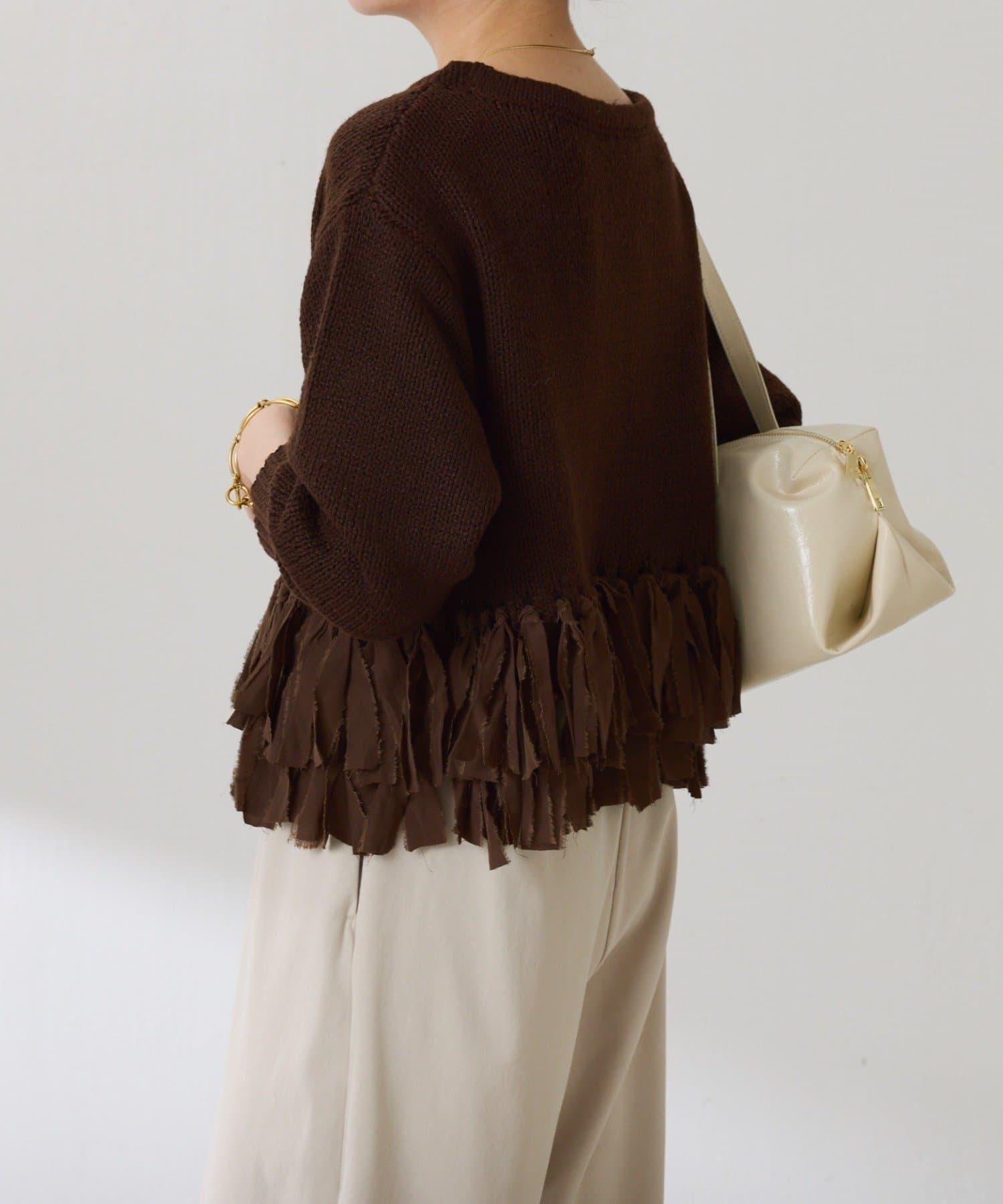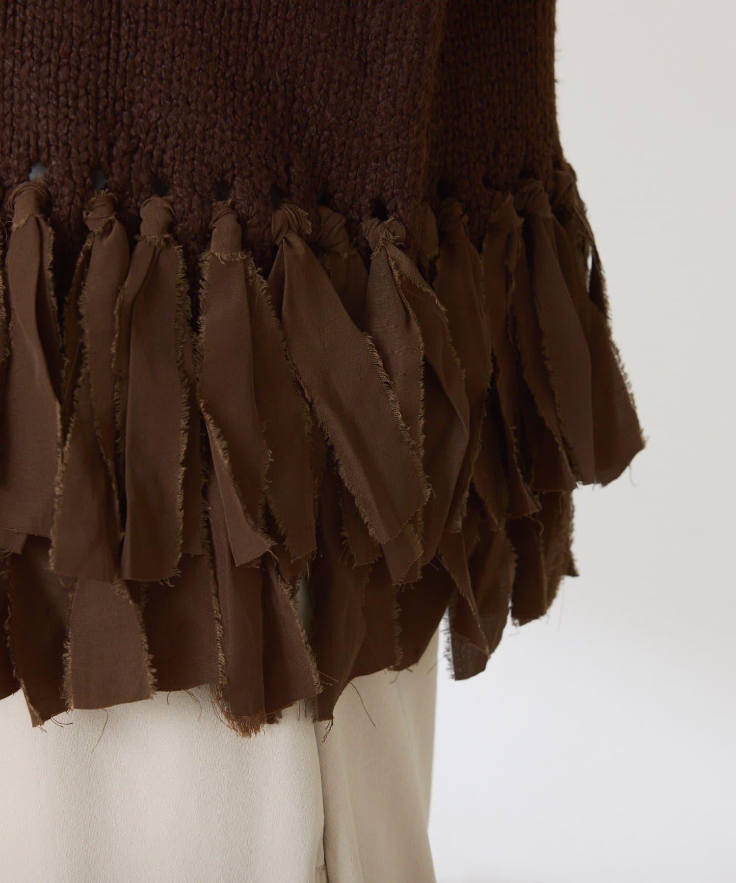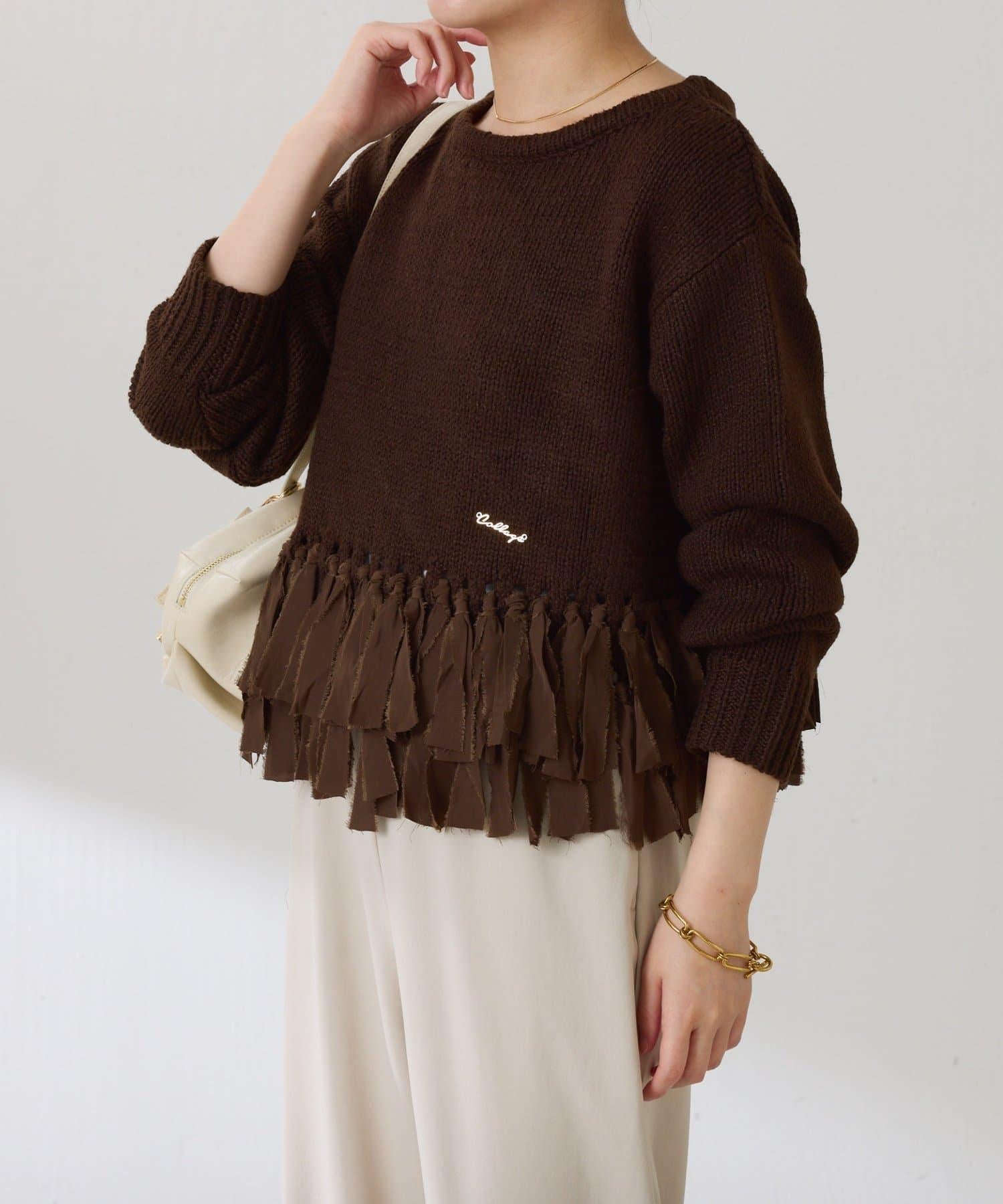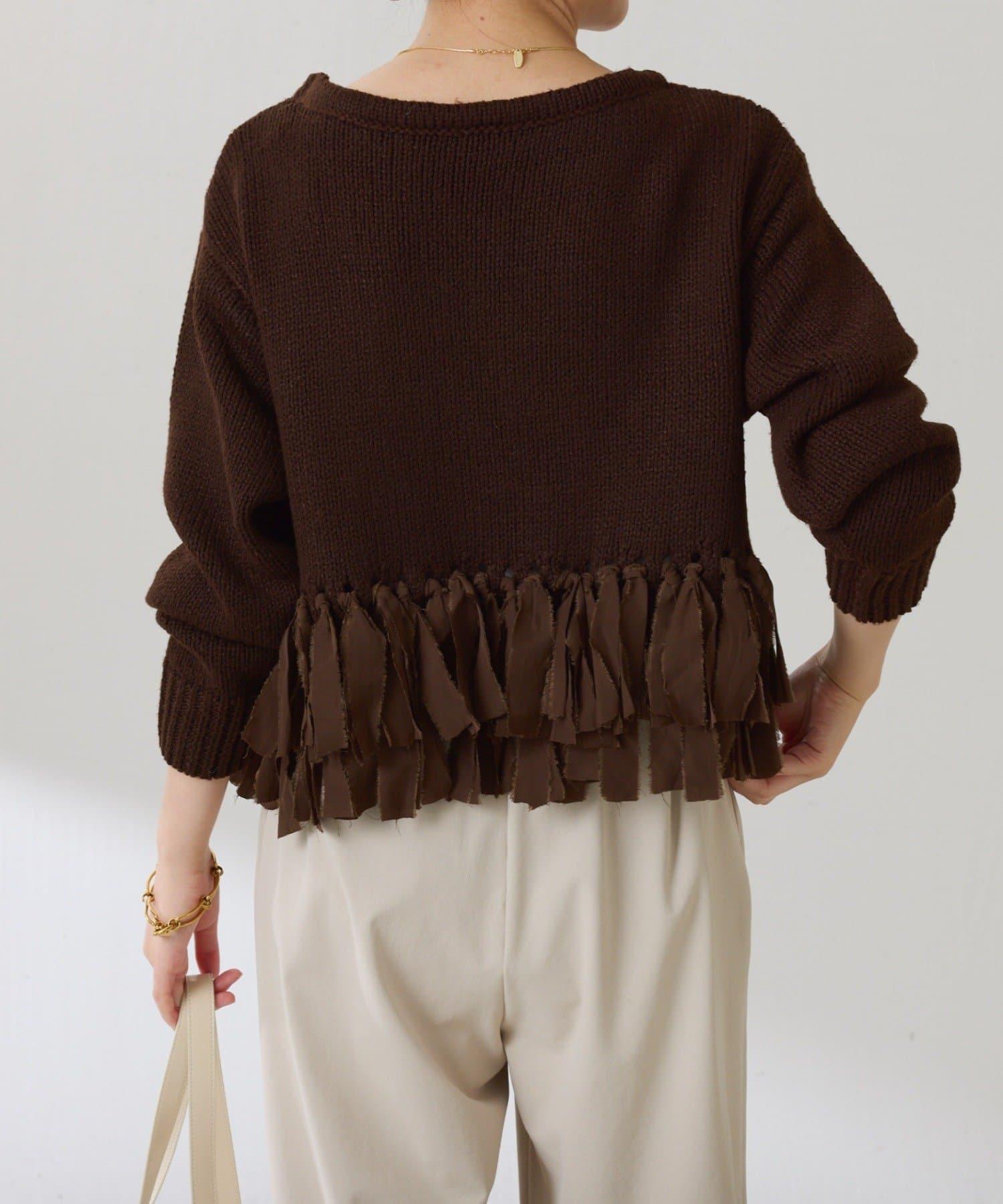 這款針織衫的下襬繫有絲帶,並有不同材質的流蘇。