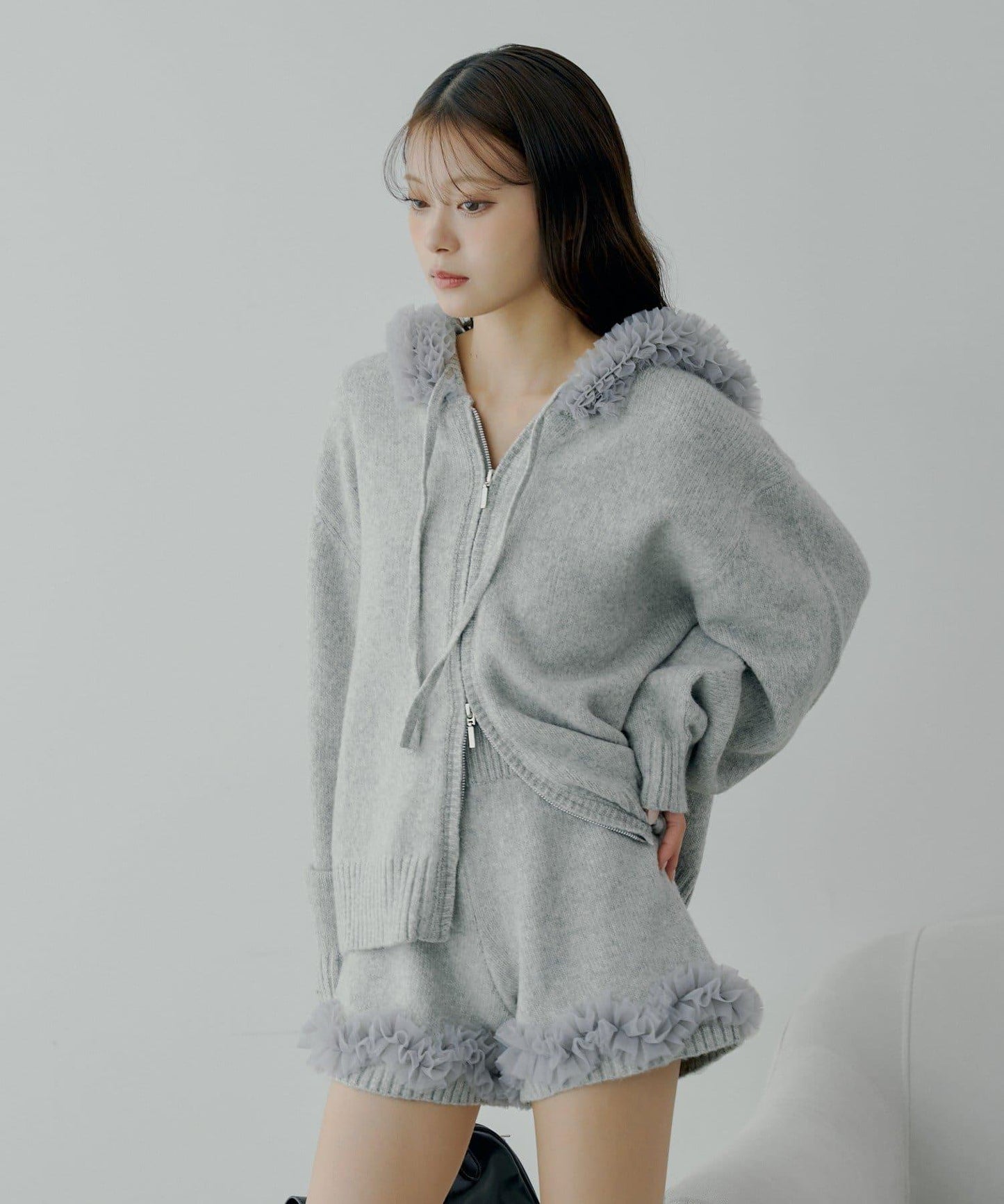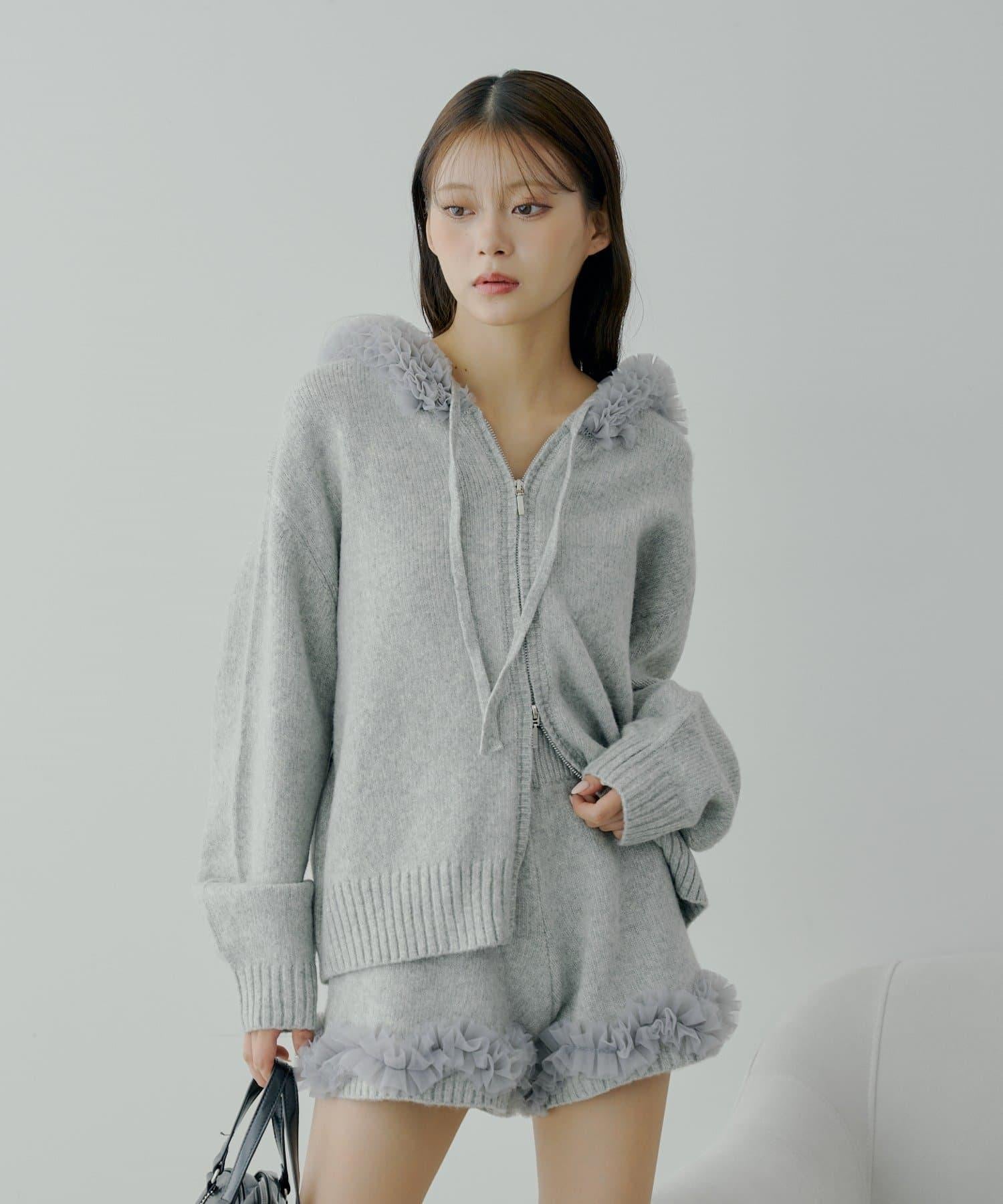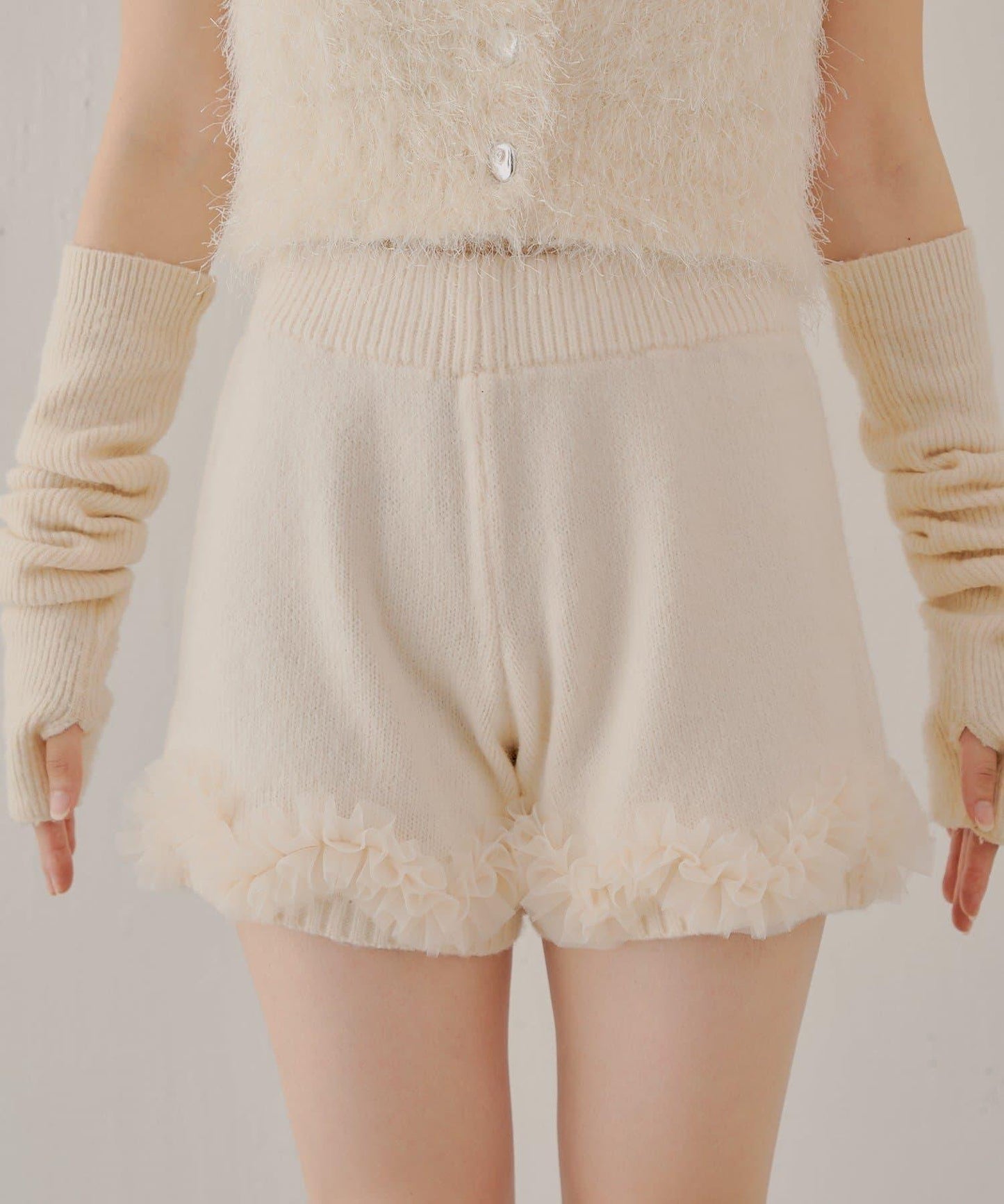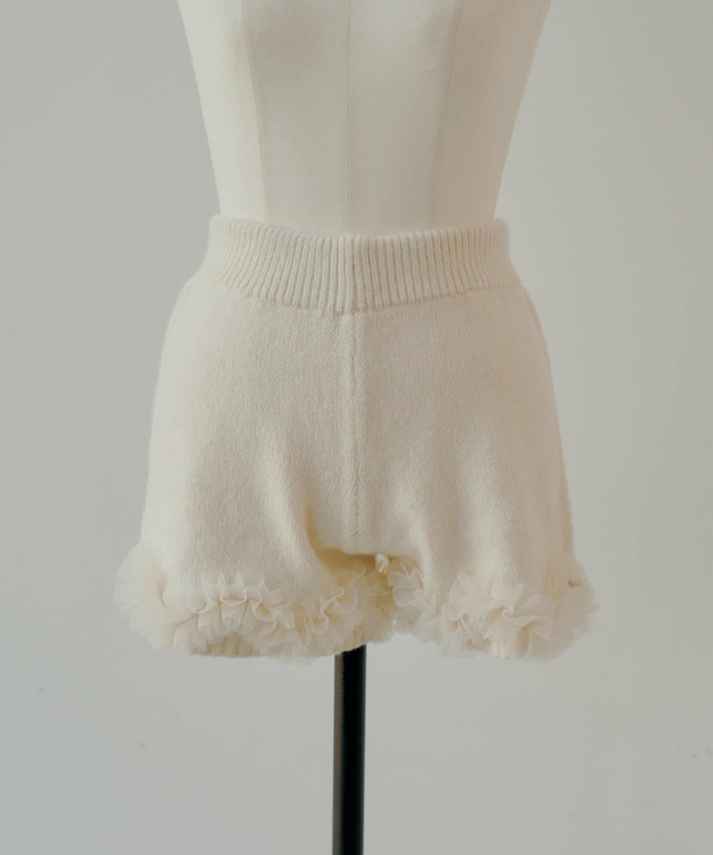 薄紗荷葉邊在行走時輕輕搖曳,為這款簡潔的針織短褲增添了一絲魅力。