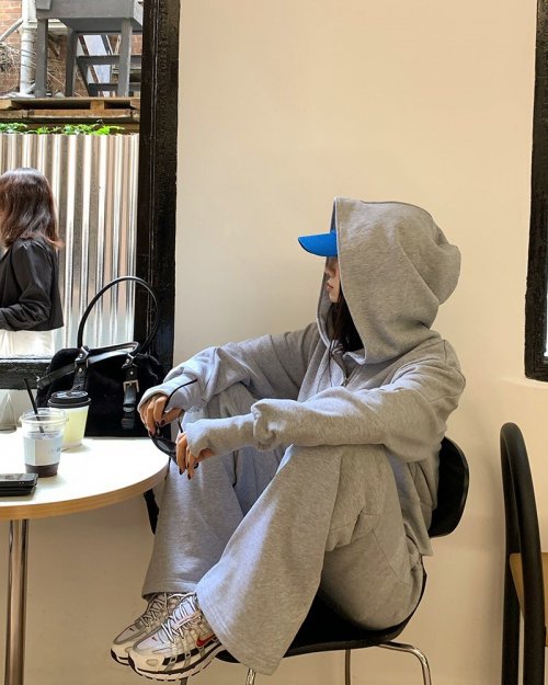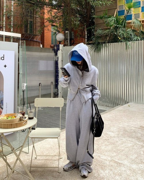 不對稱拉鍊衛衣套裝 灰色[特價] (CT6626)