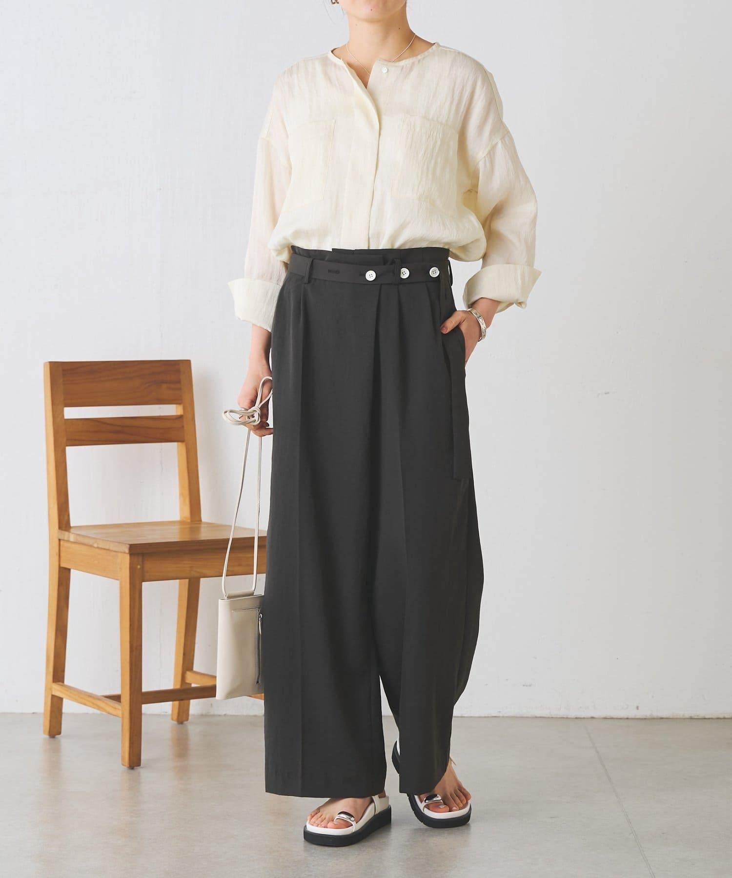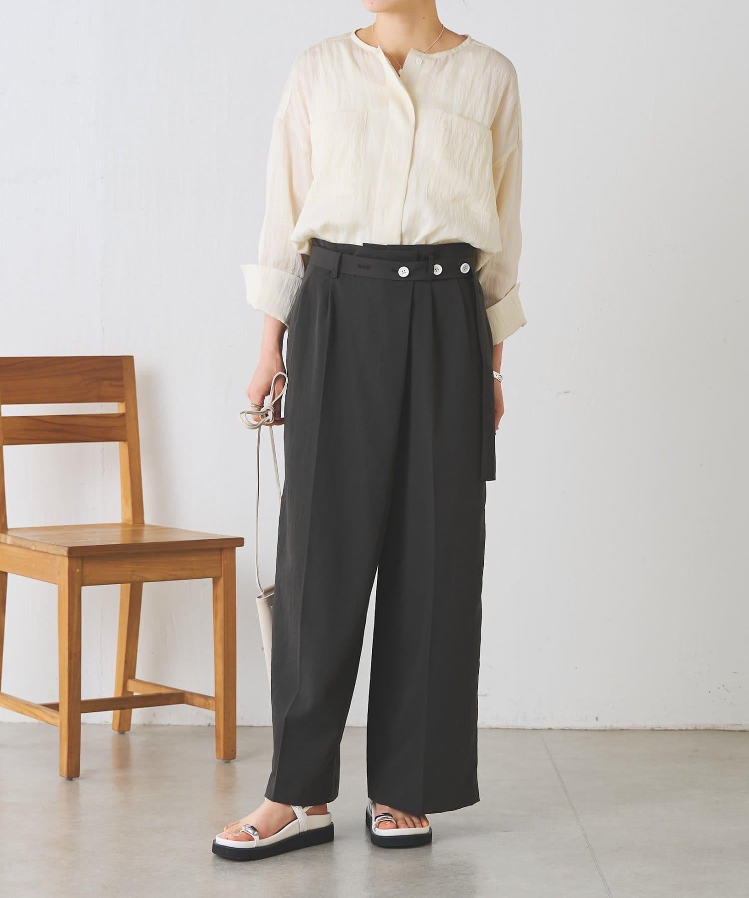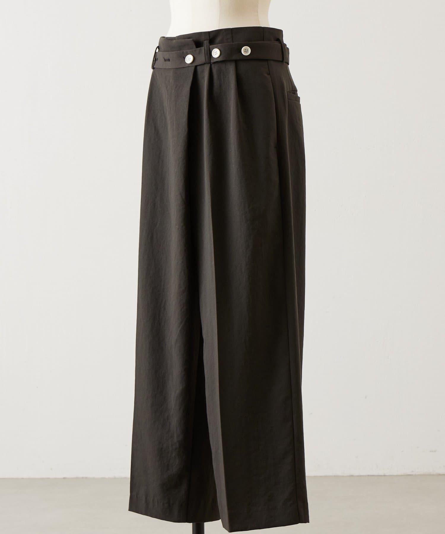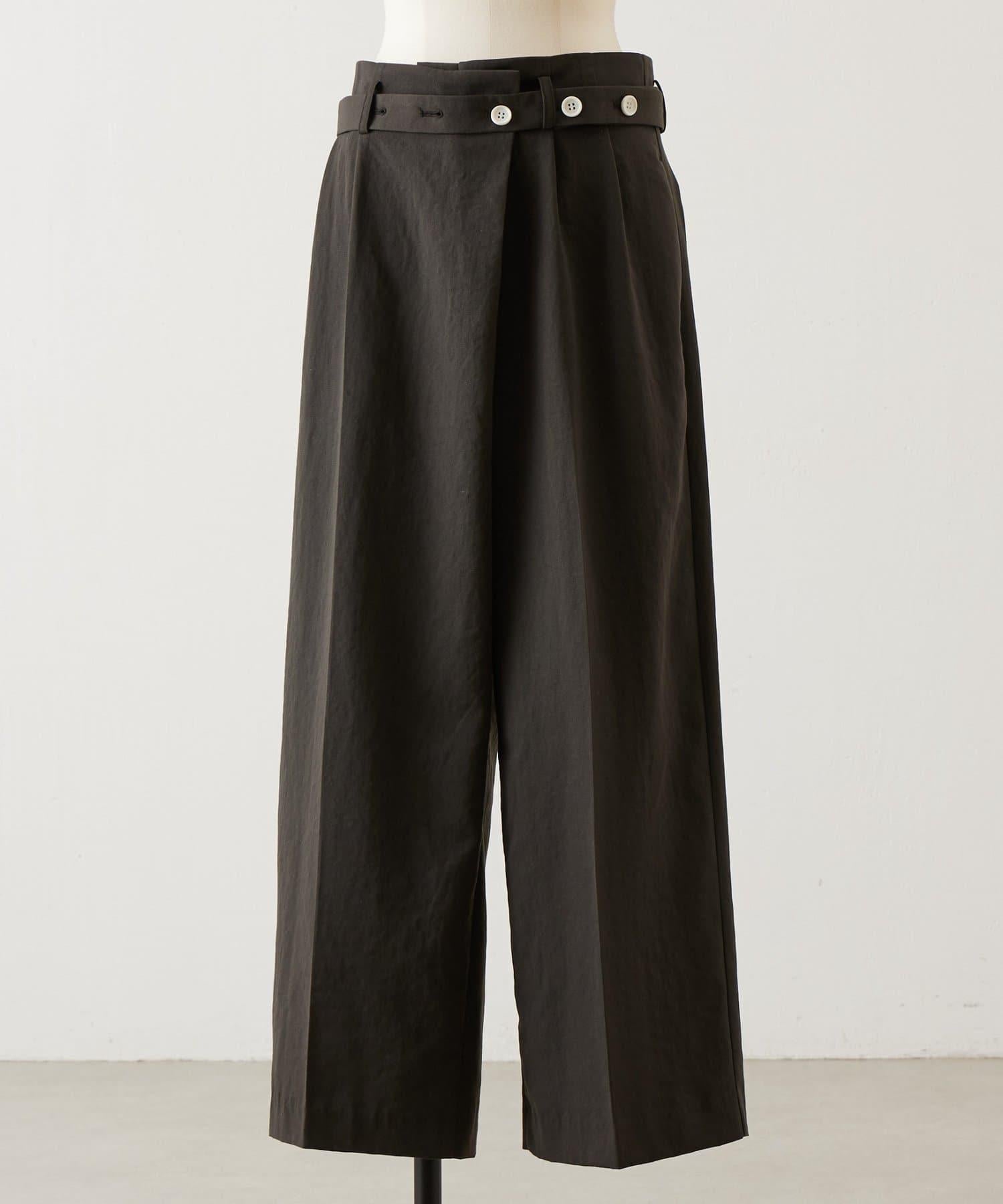 寬鬆長褲,採用醒目的不對稱設計,腰部前開口偏向一側。