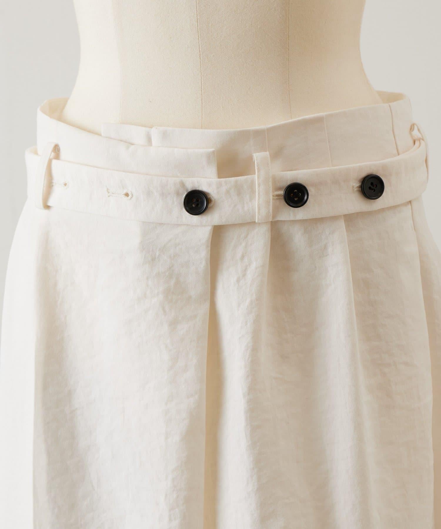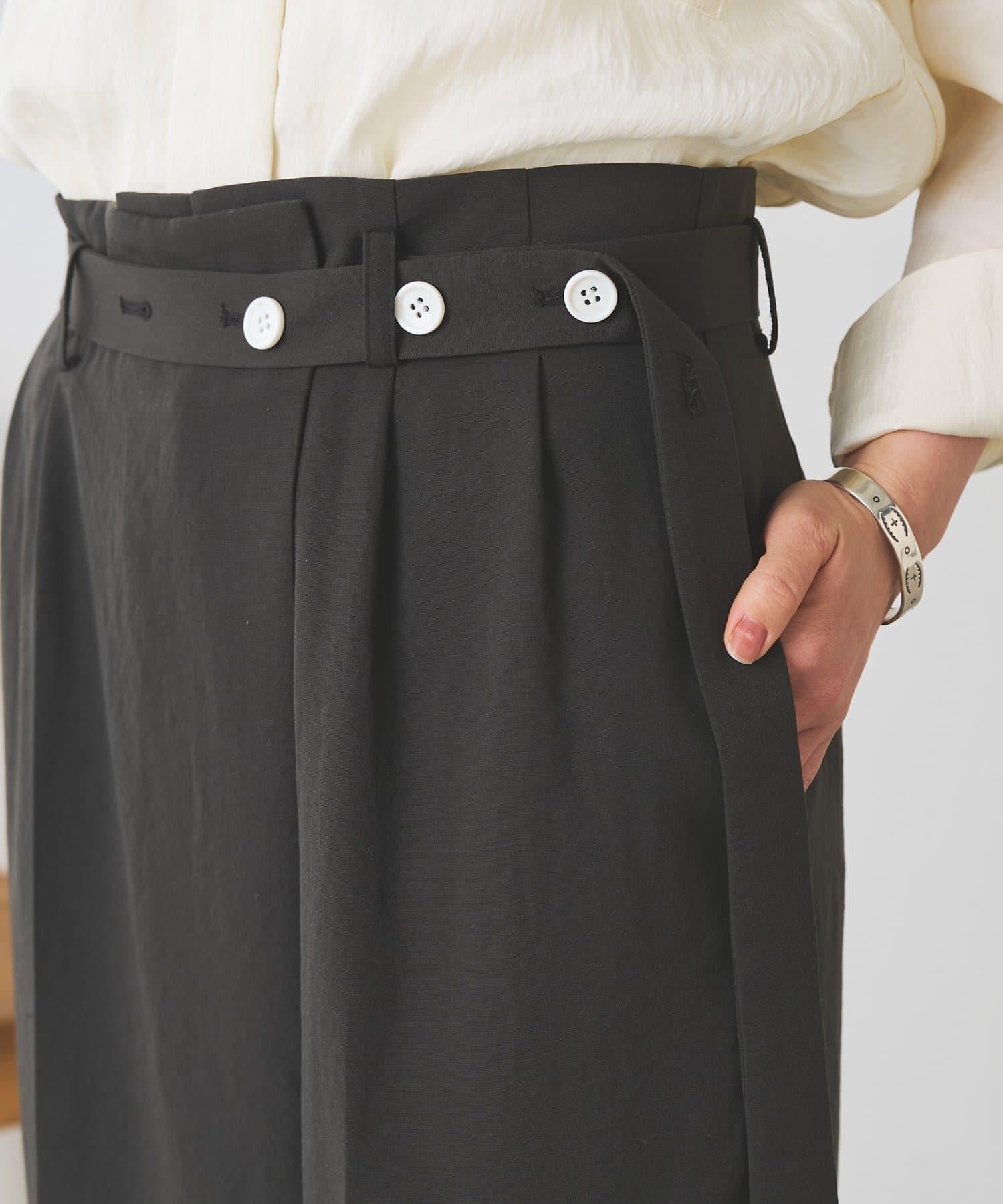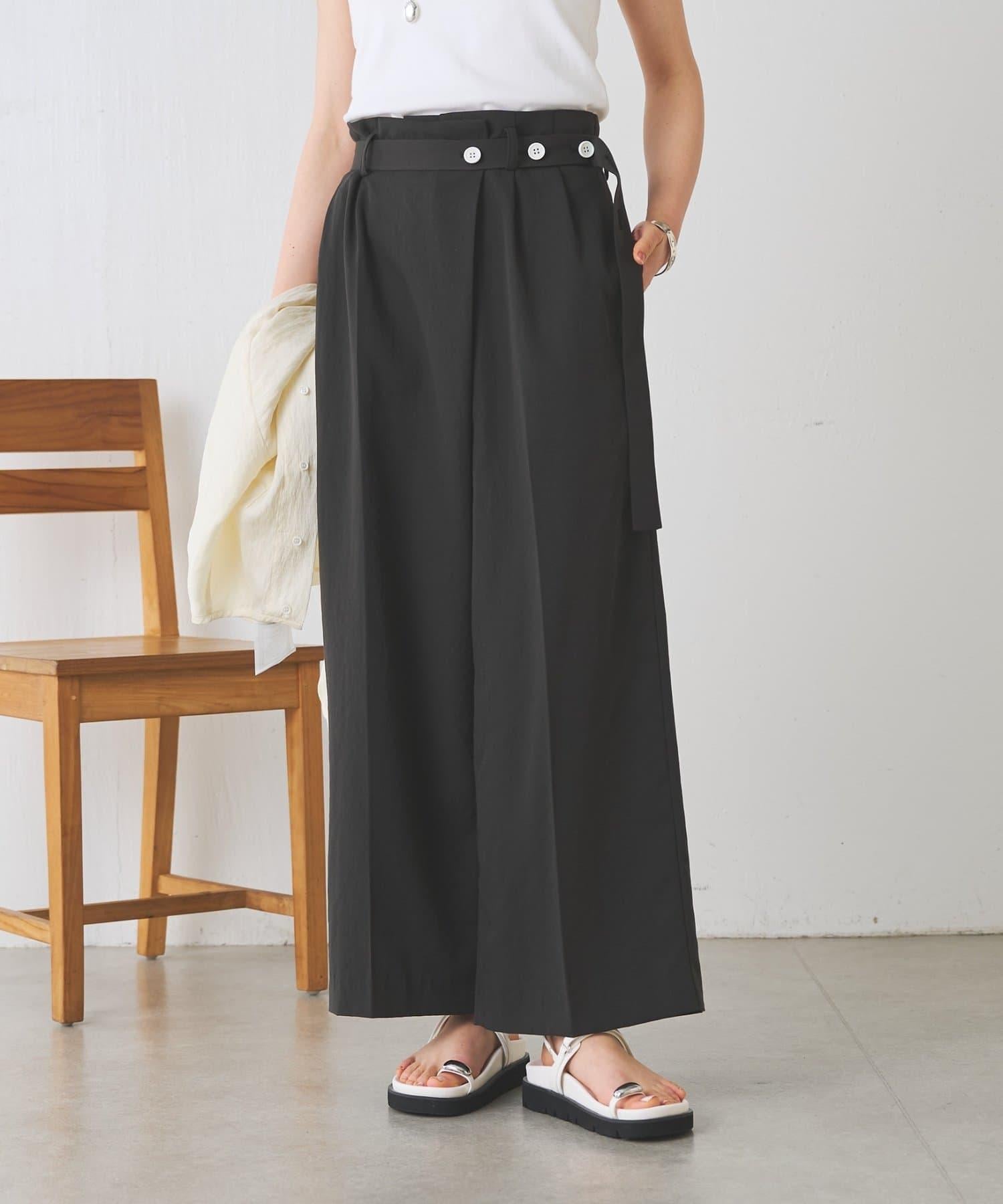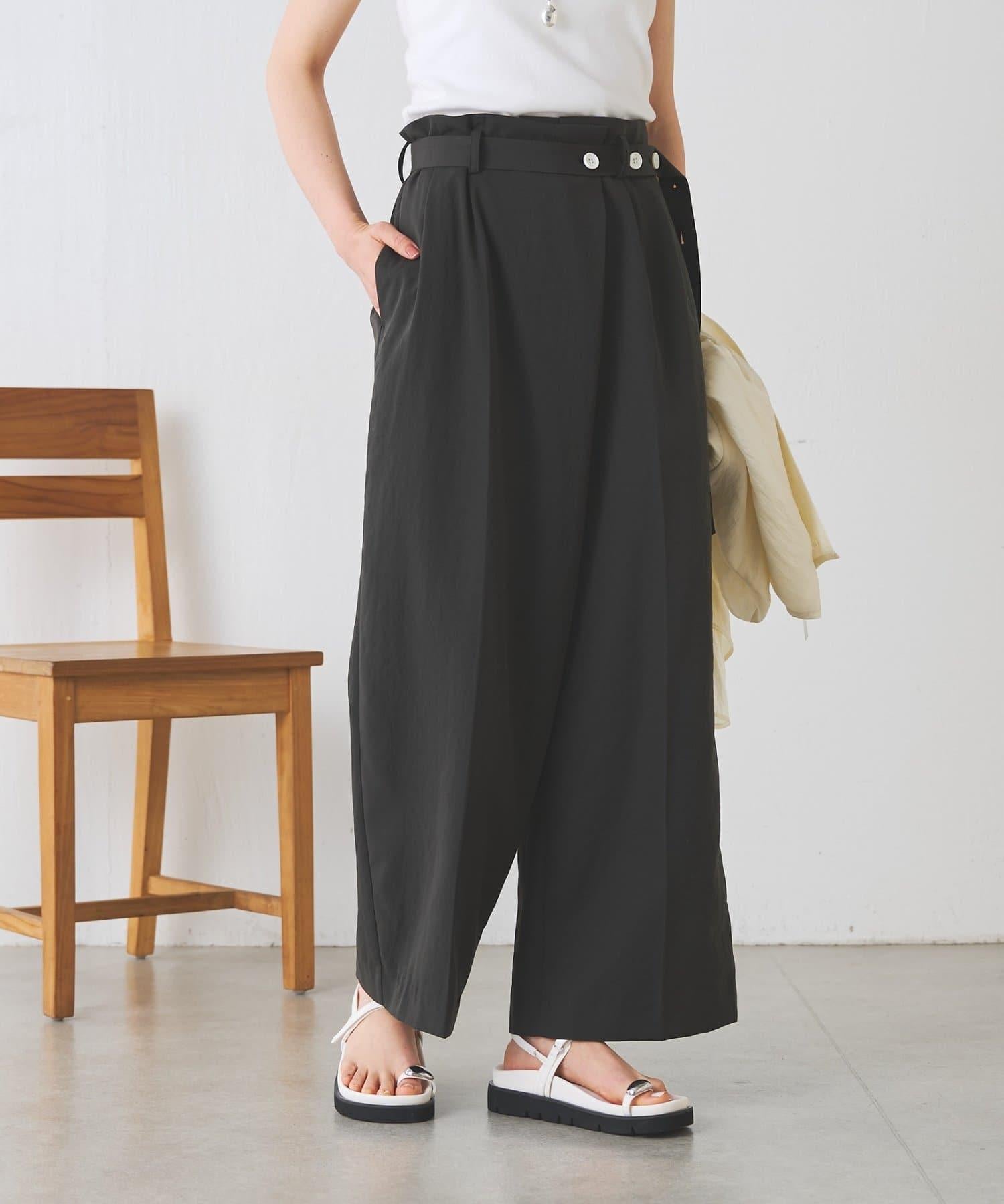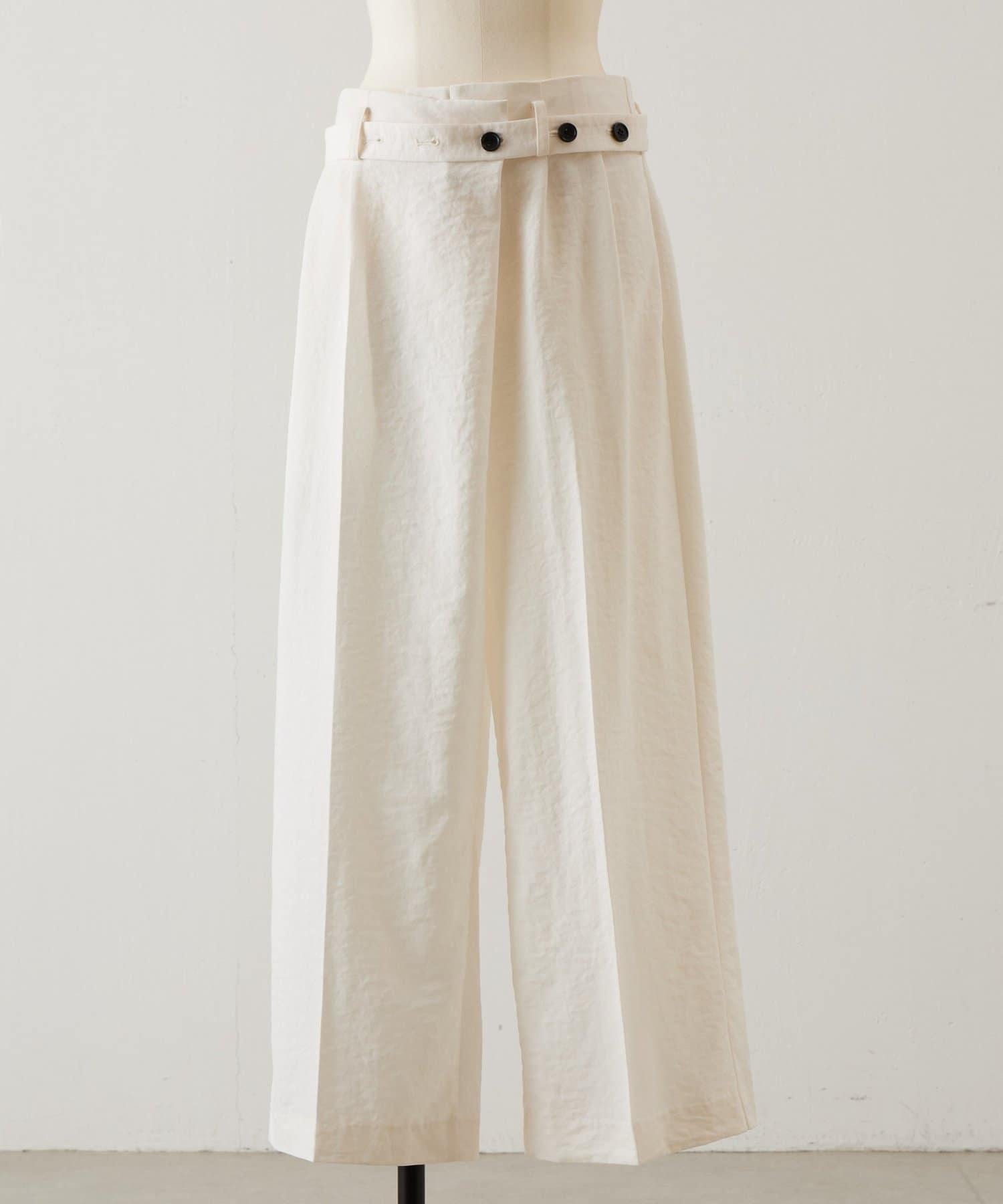 寬鬆長褲,採用醒目的不對稱設計,腰部前開口偏向一側。