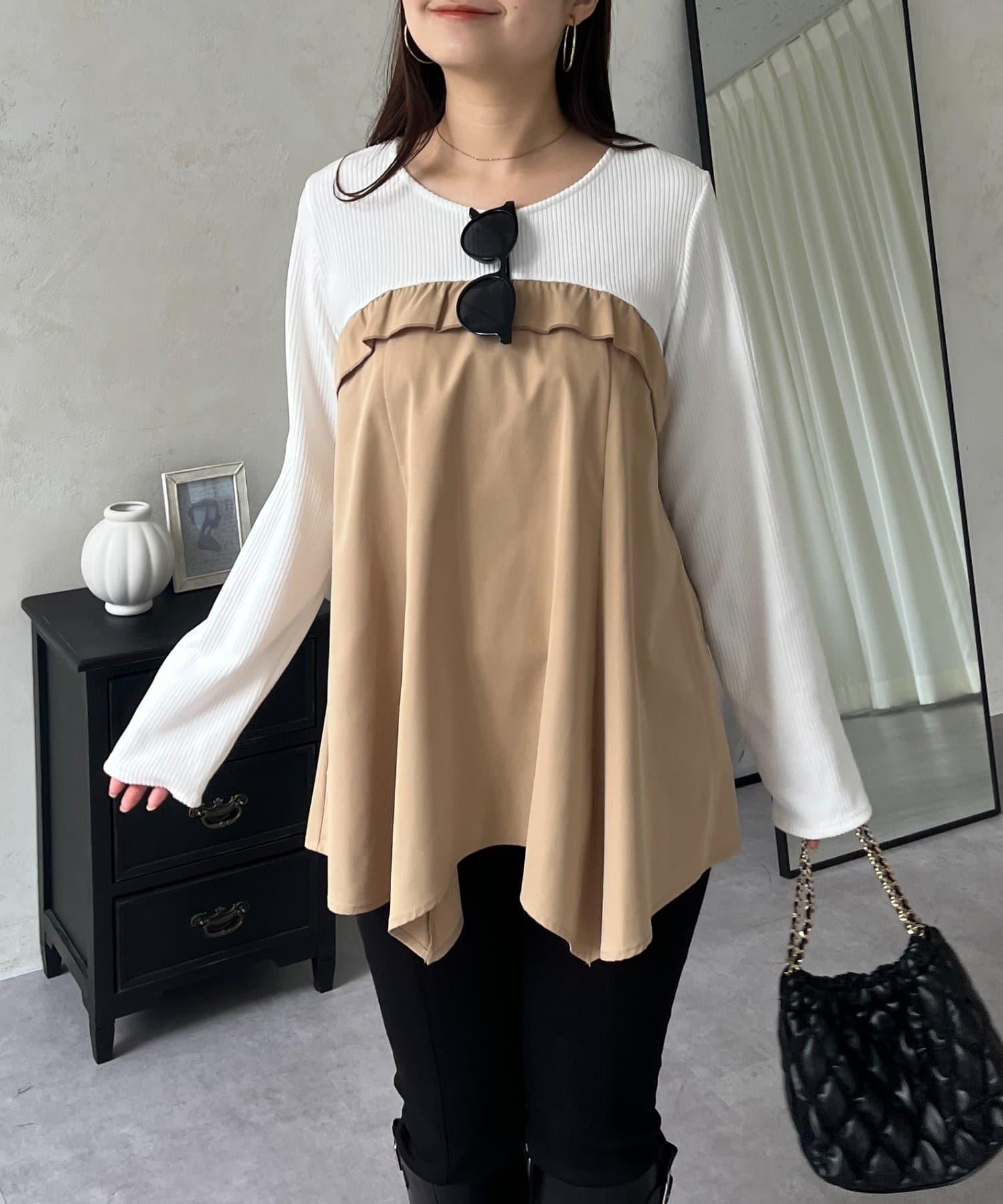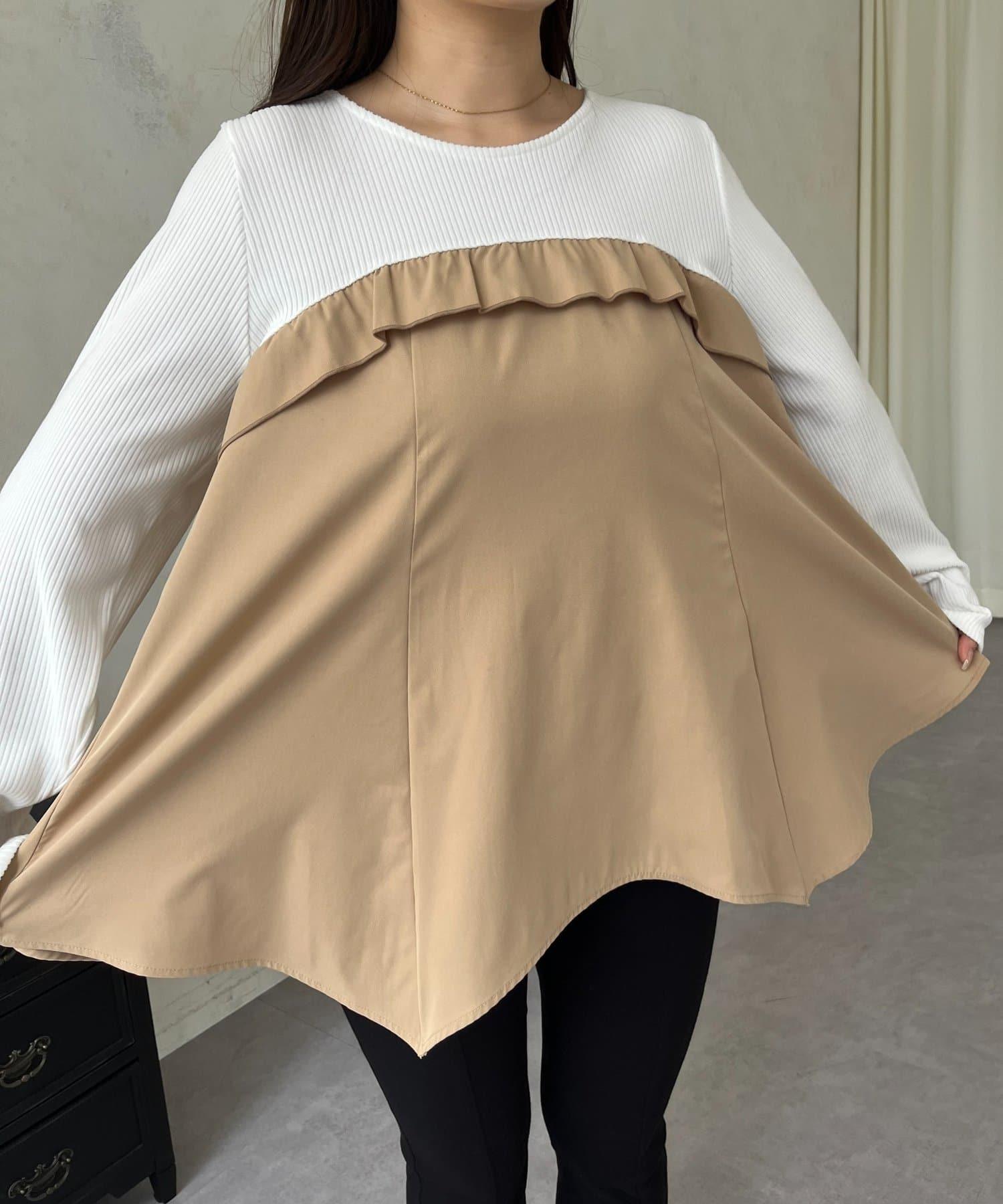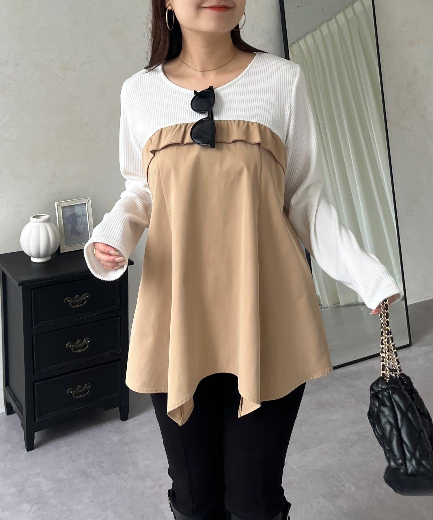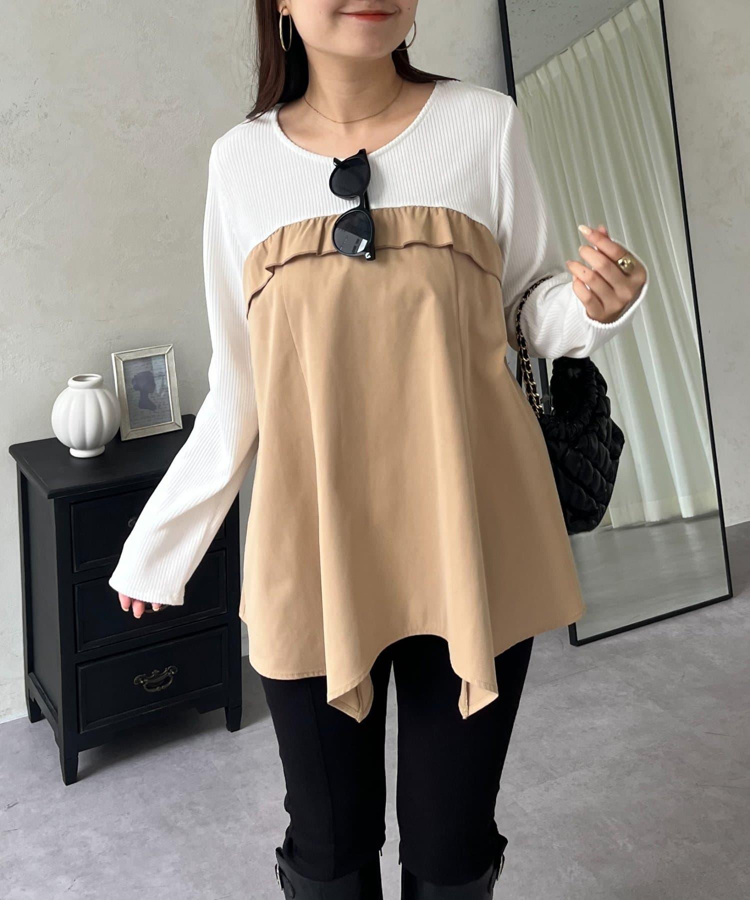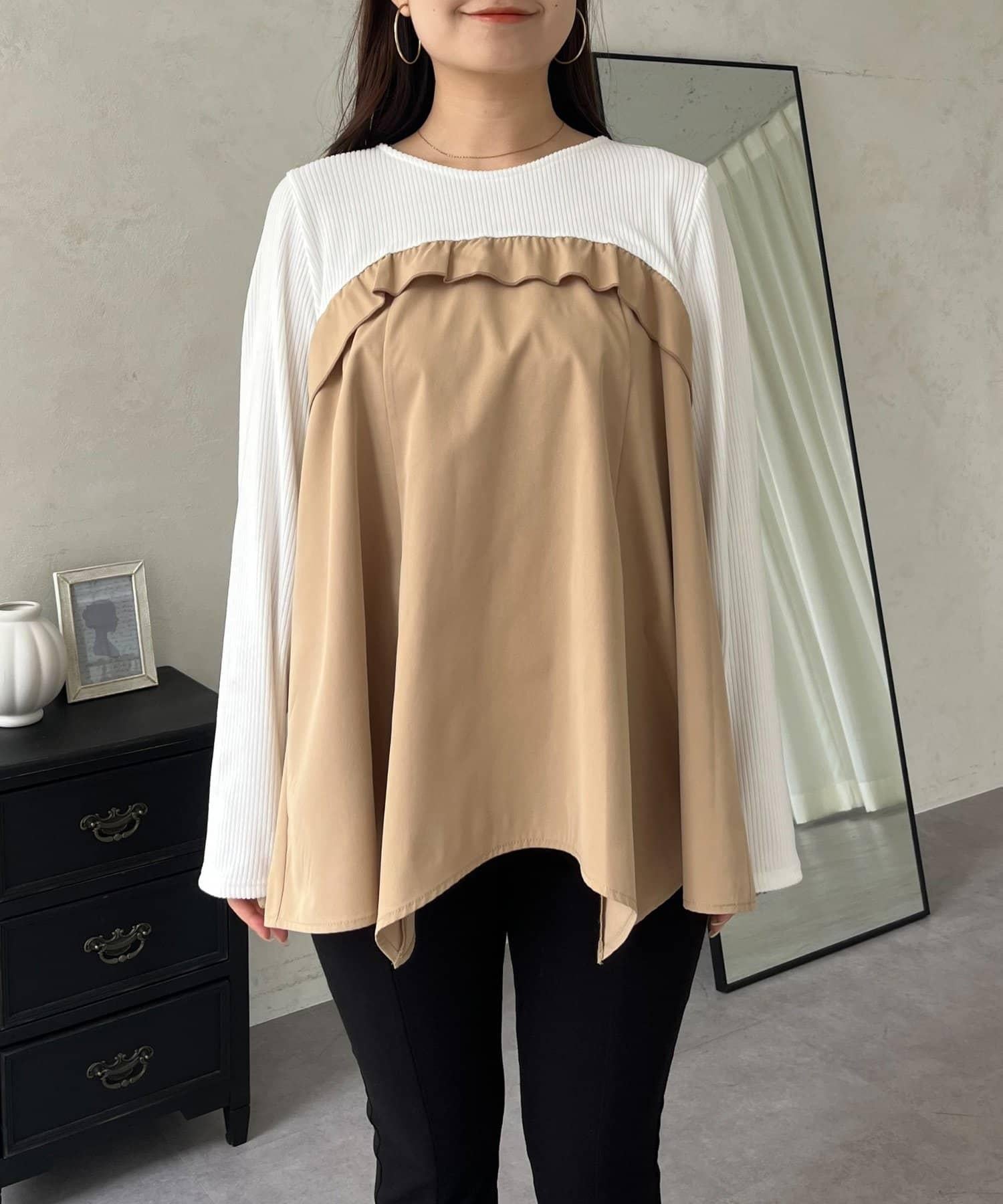 不規則下襬荷葉邊拼接A字羅紋長袖T恤