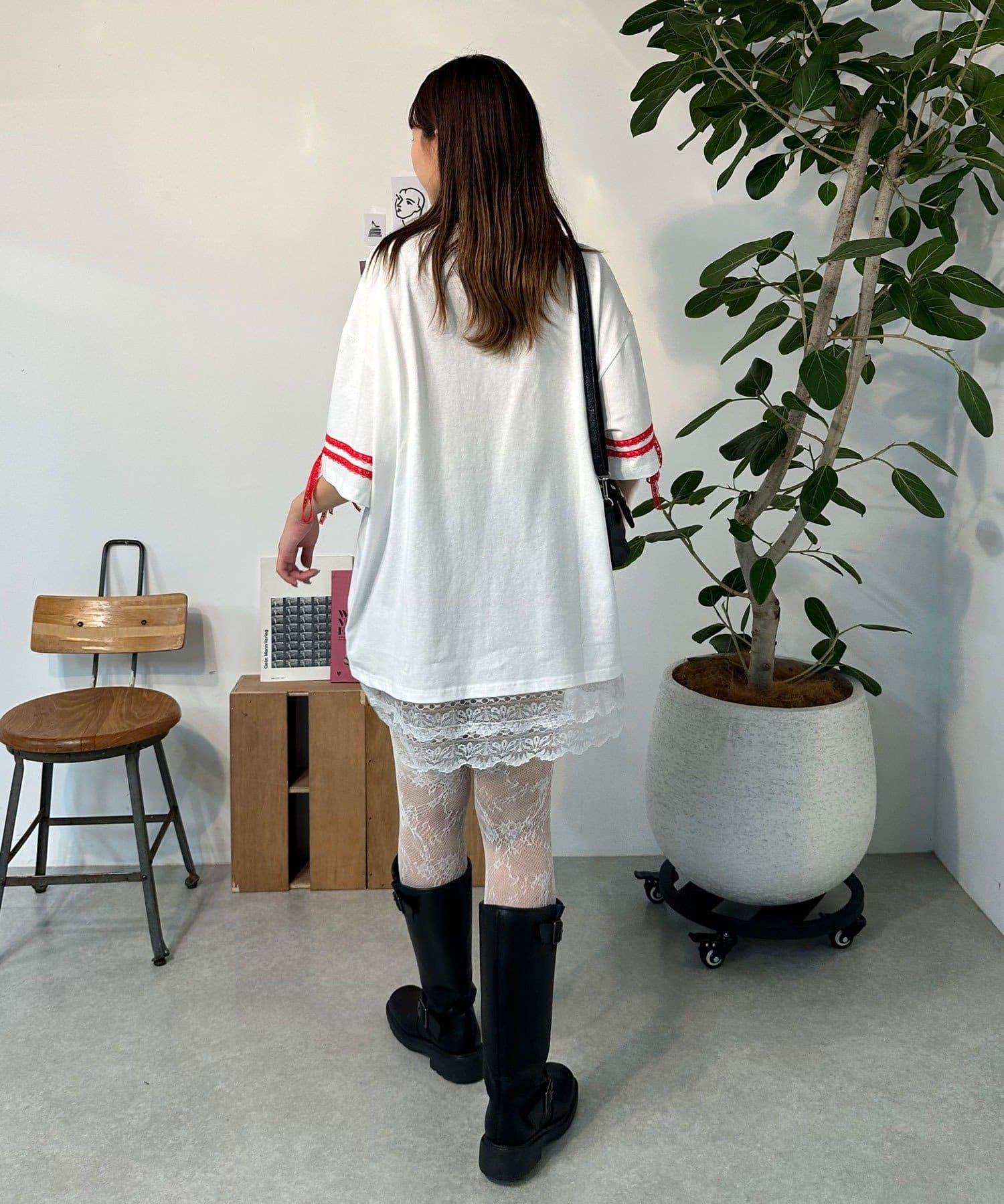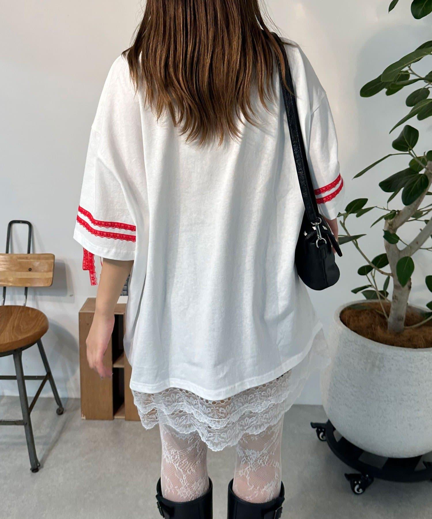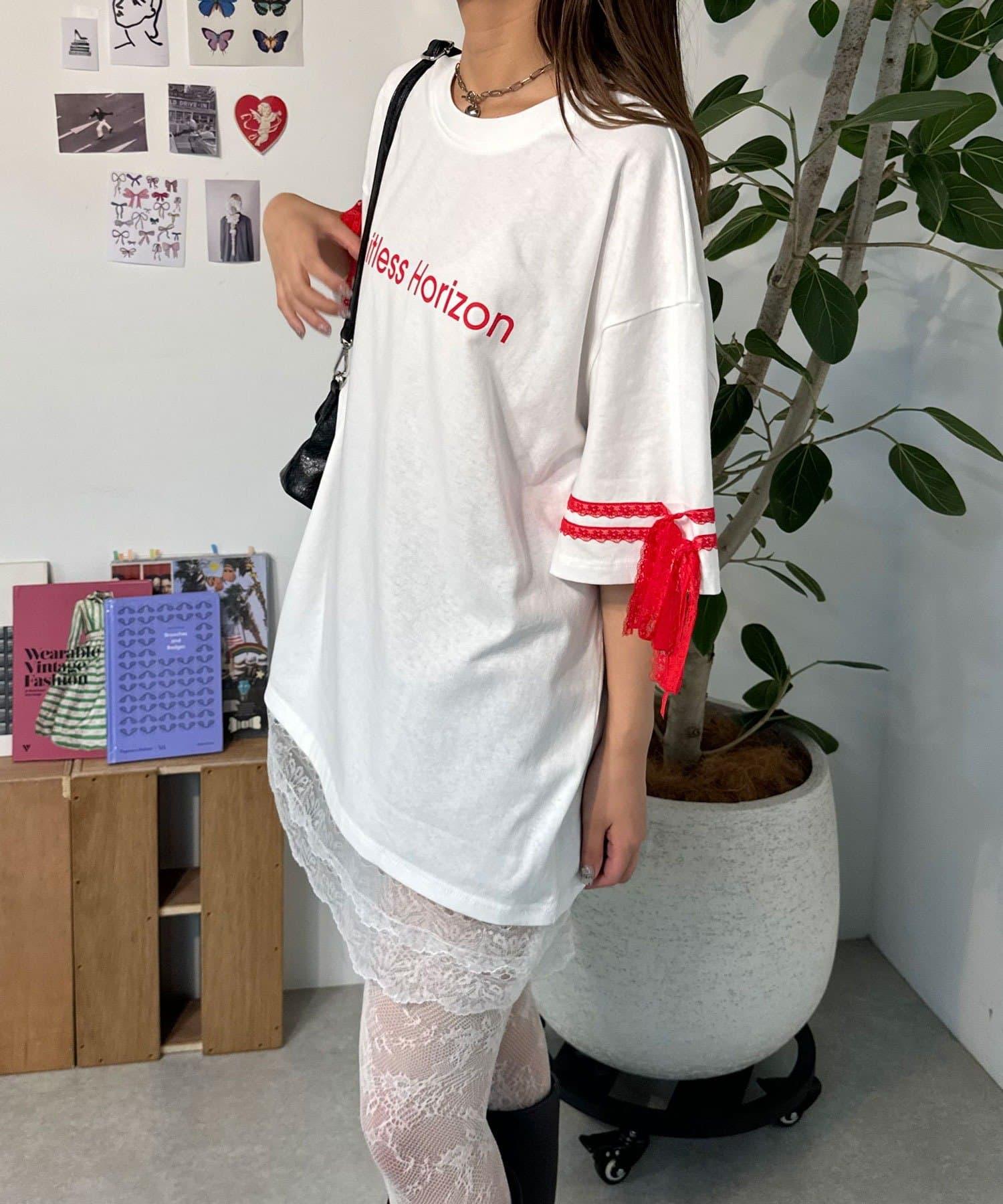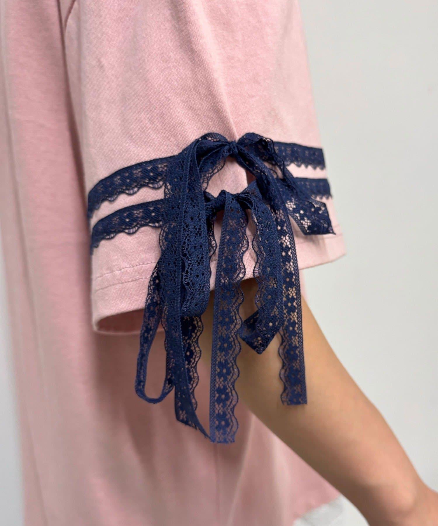 這款設計感十足的 T 恤印有徽標圖案,袖子上的絲帶和蕾絲帶更顯可愛。