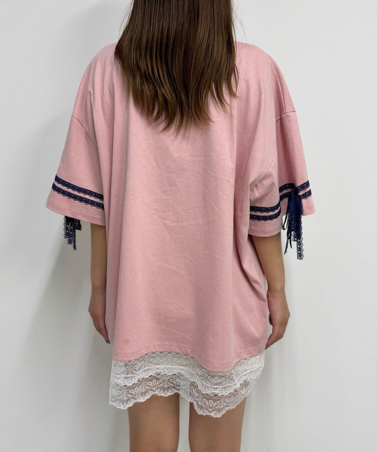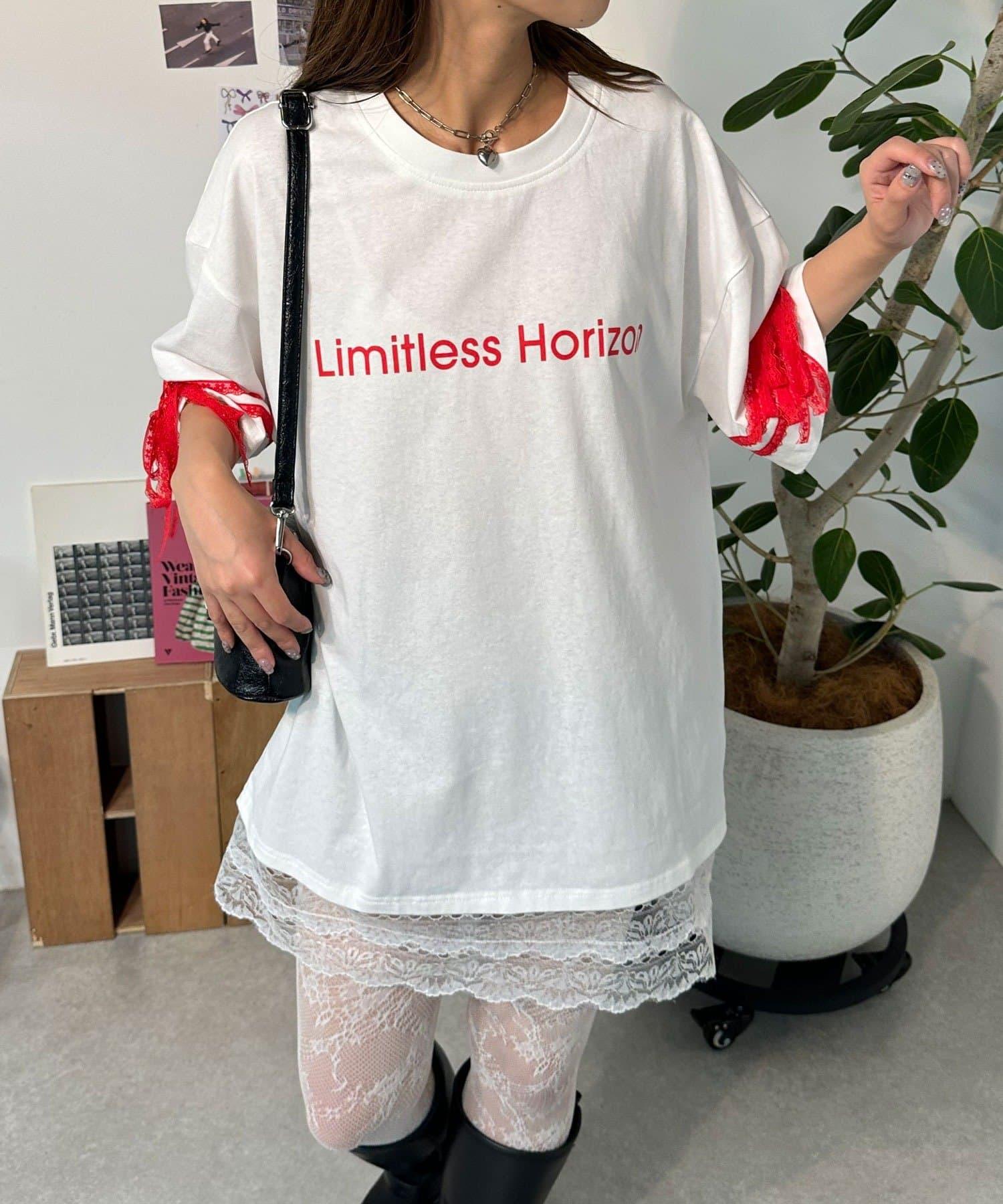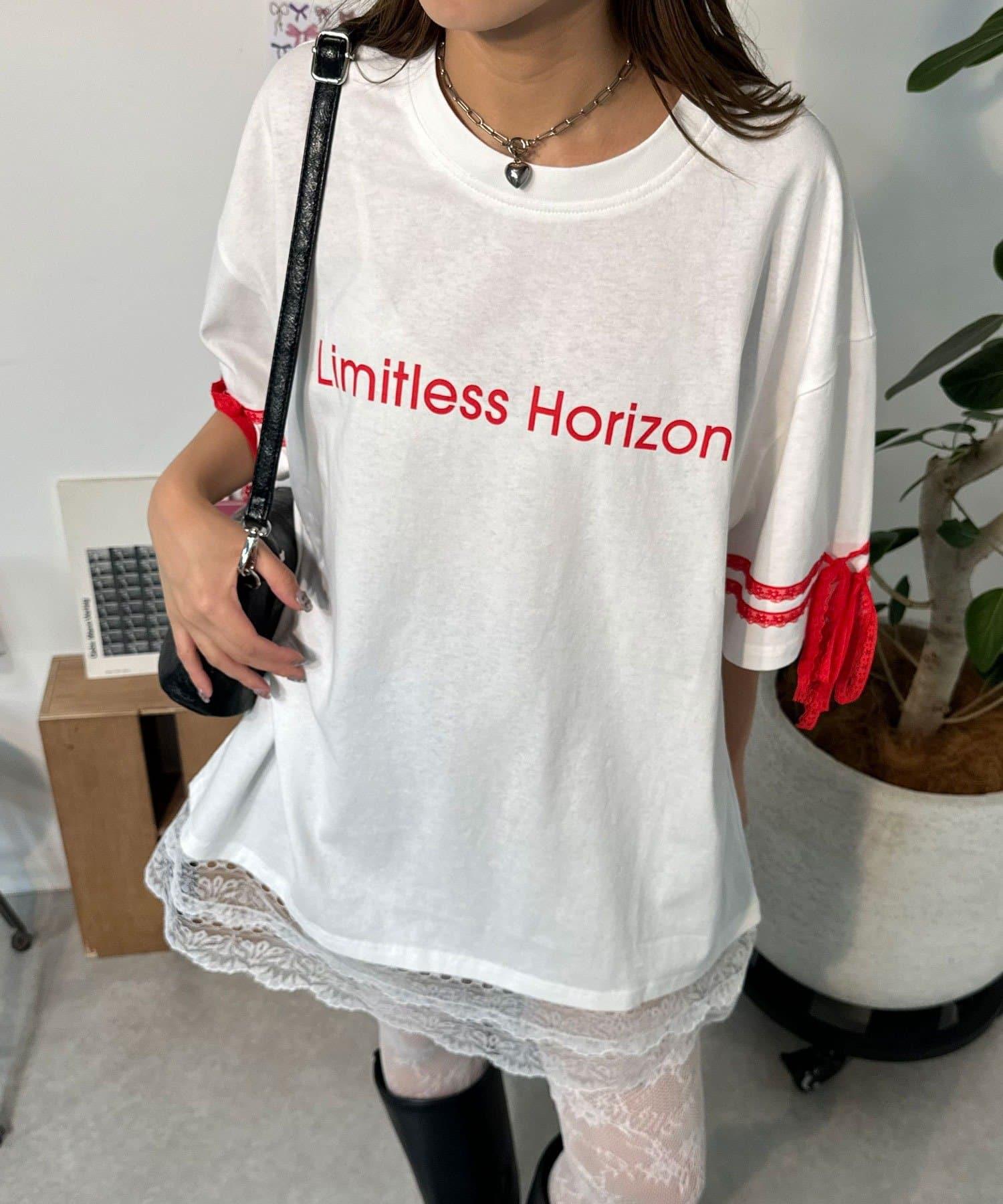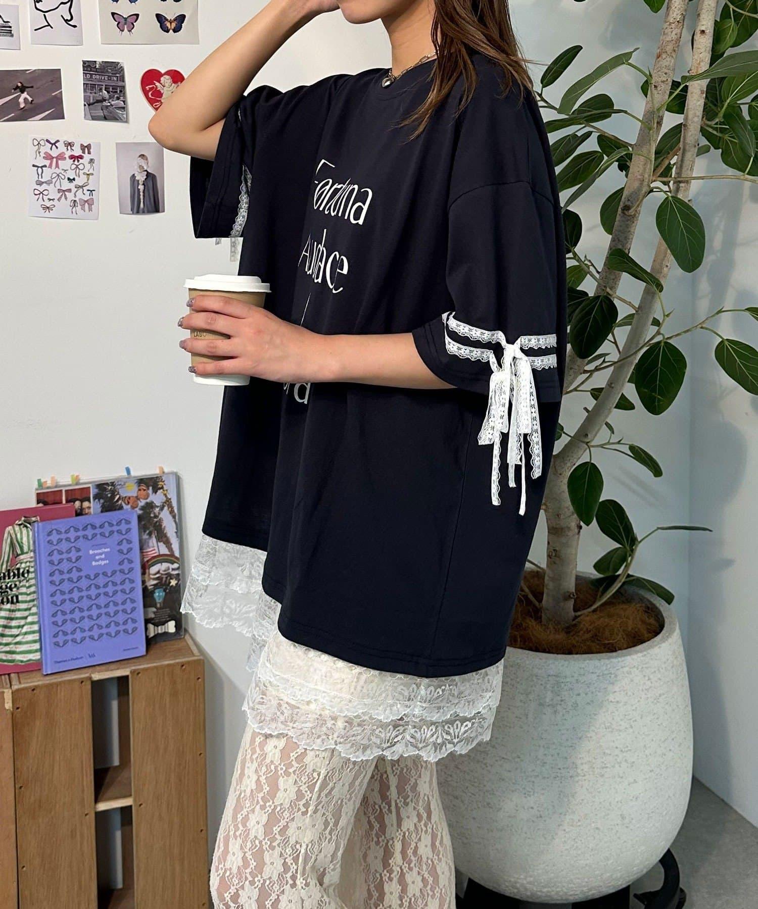 這款設計感十足的 T 恤印有徽標圖案,袖子上的絲帶和蕾絲帶更顯可愛。