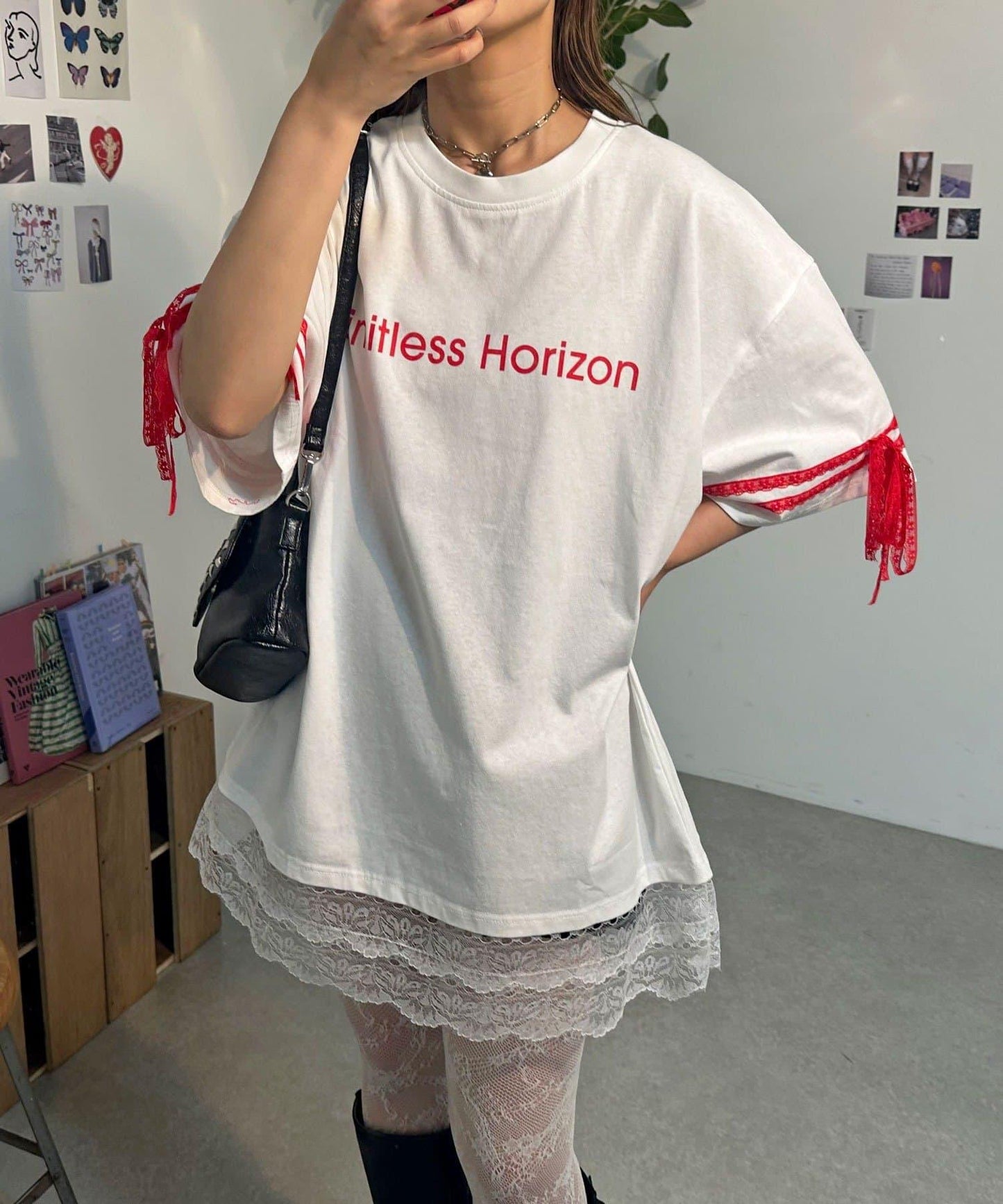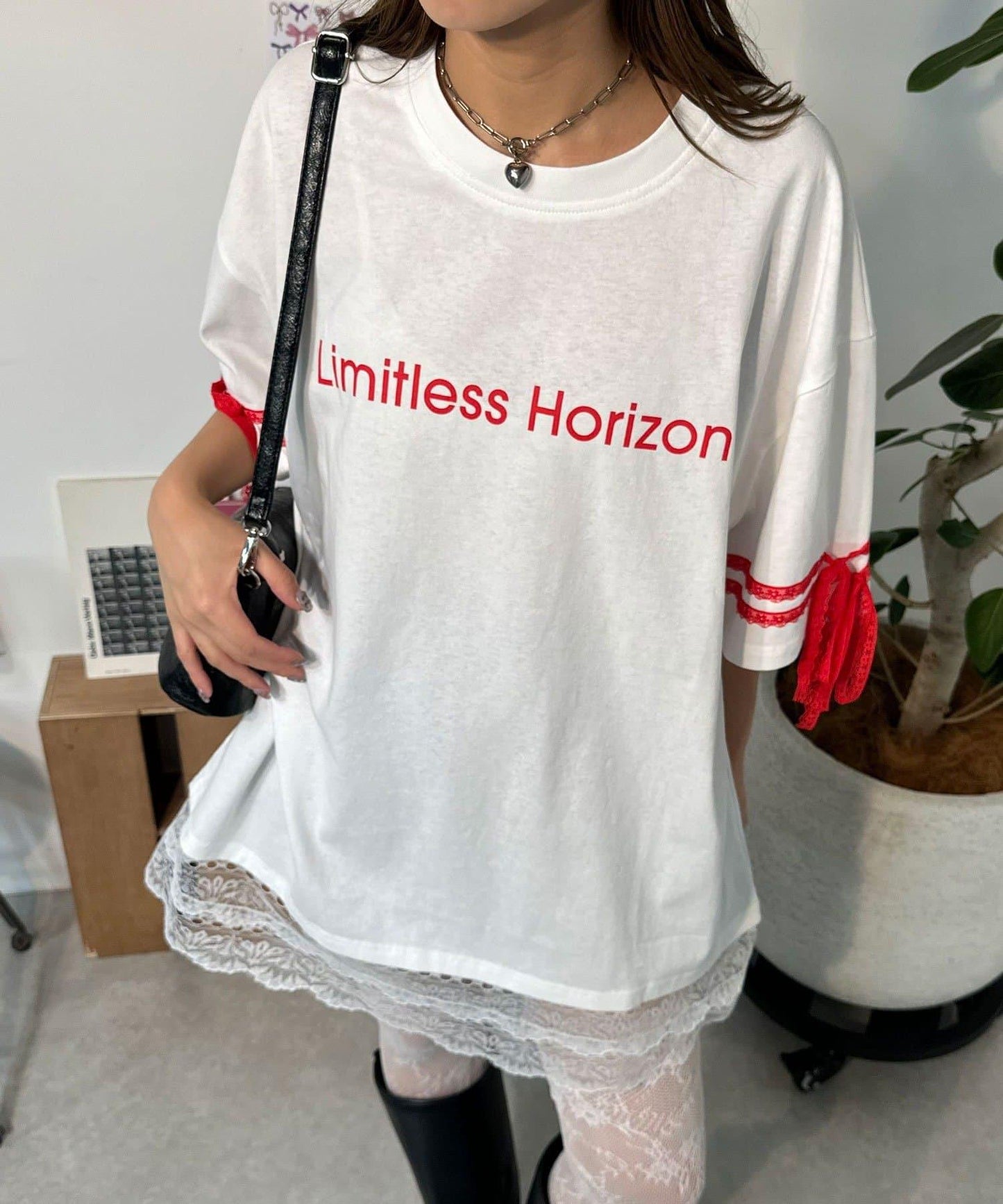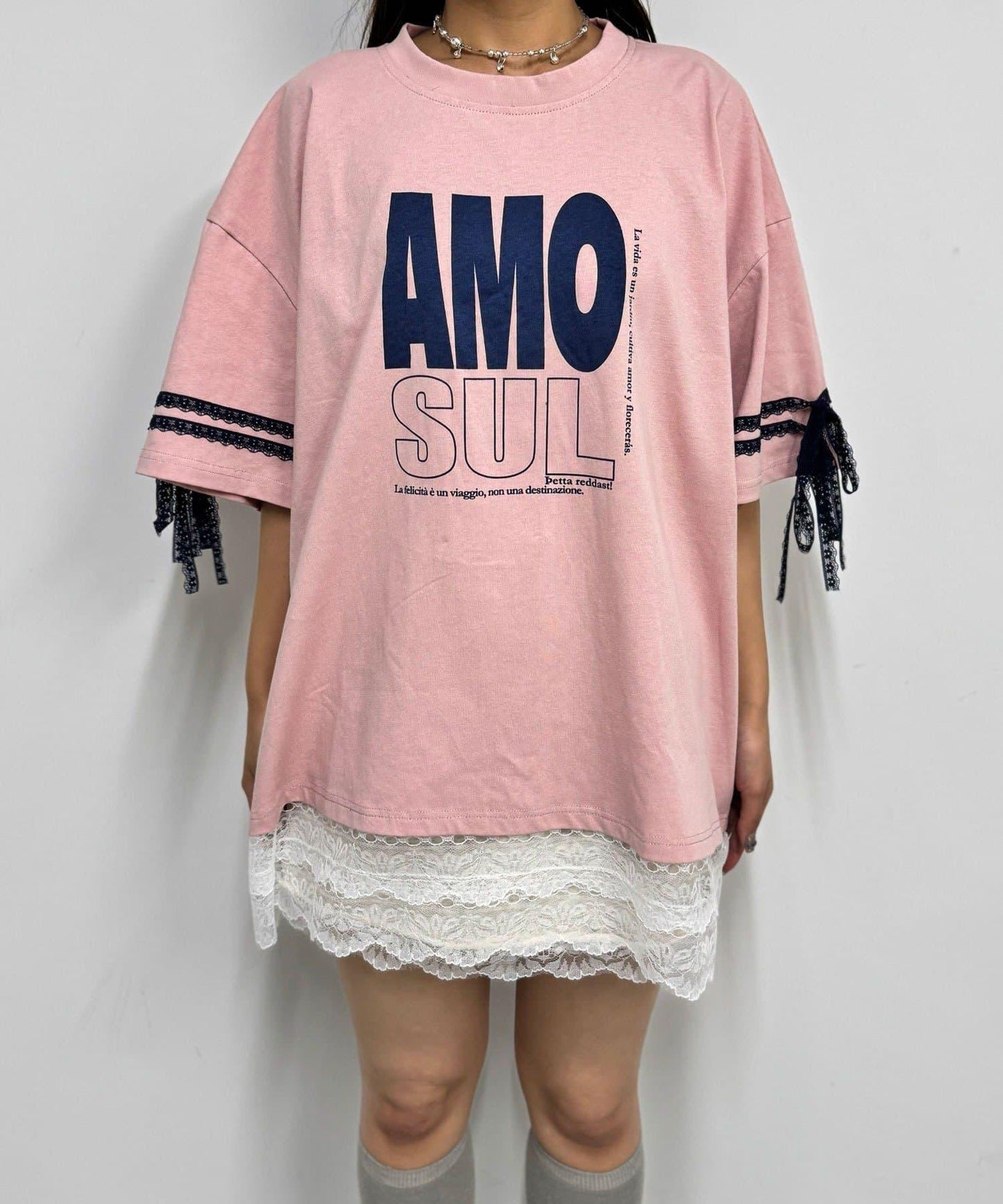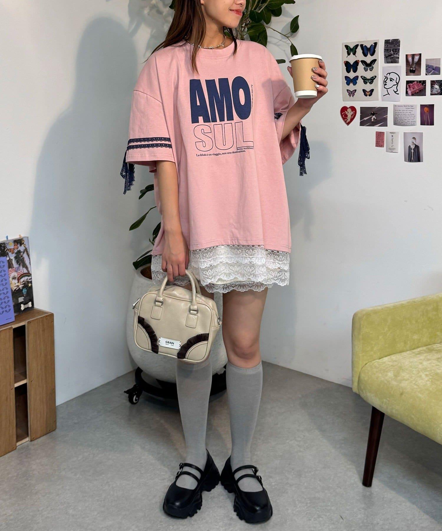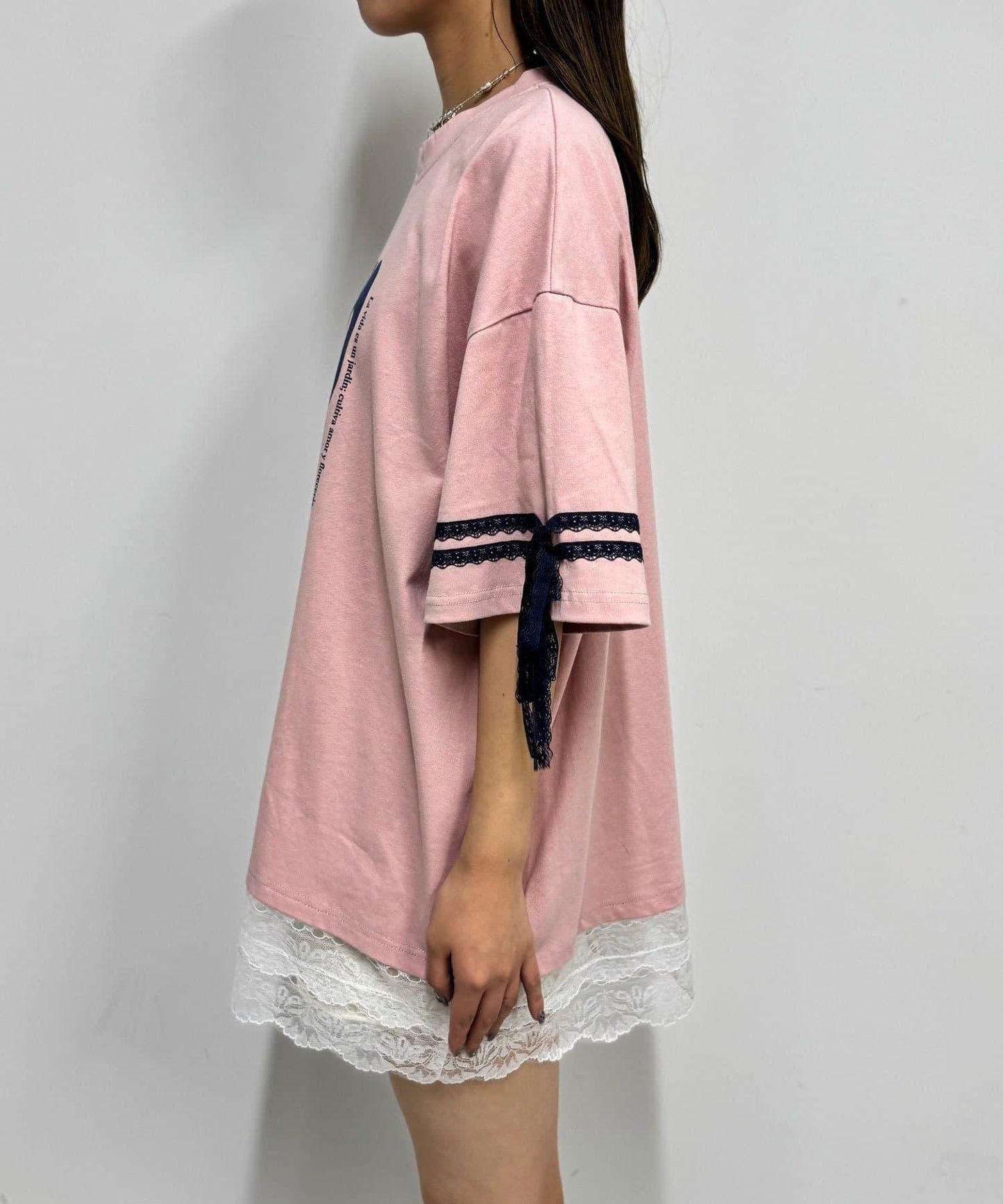 這款設計感十足的 T 恤印有徽標圖案,袖子上的絲帶和蕾絲帶更顯可愛。