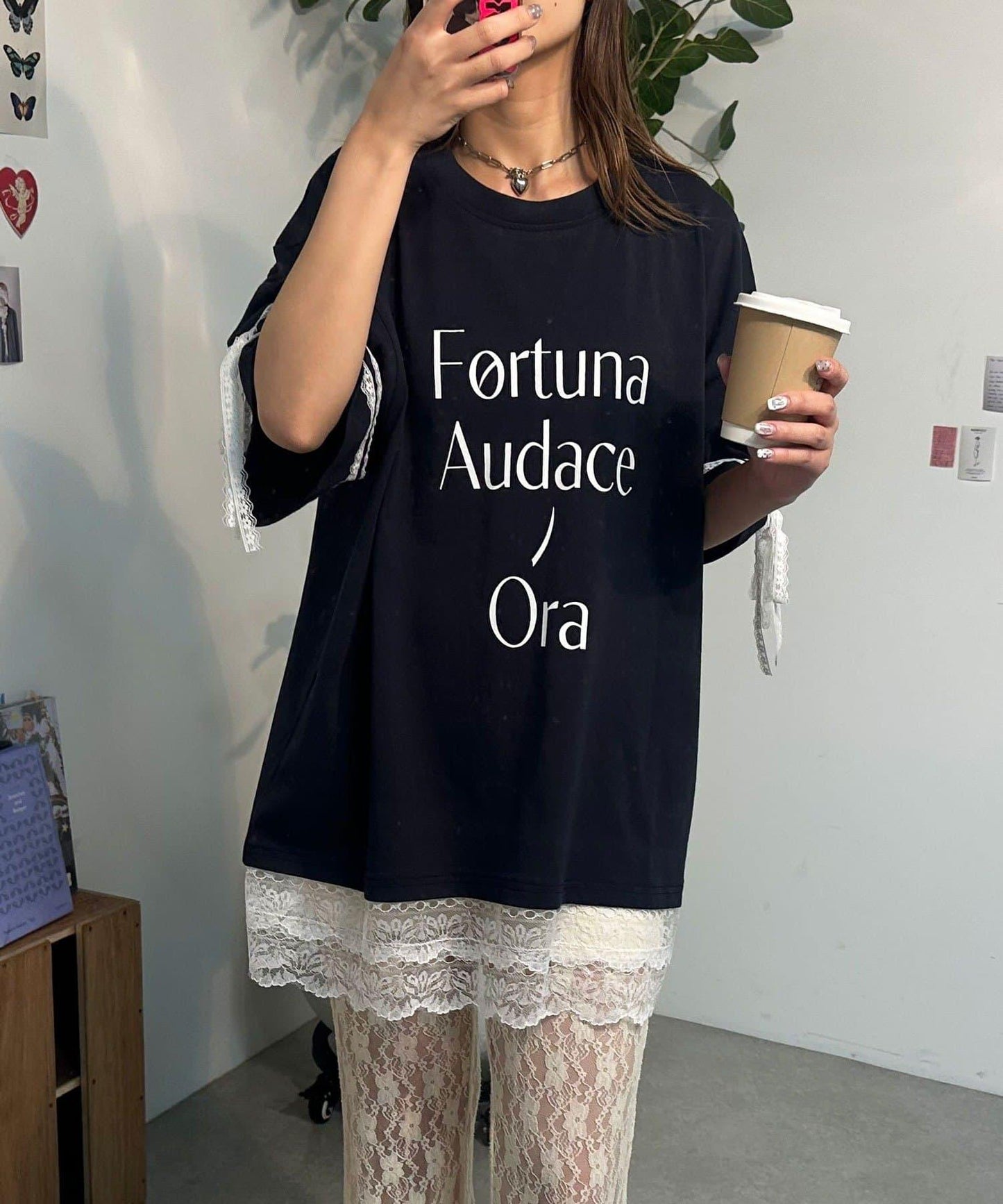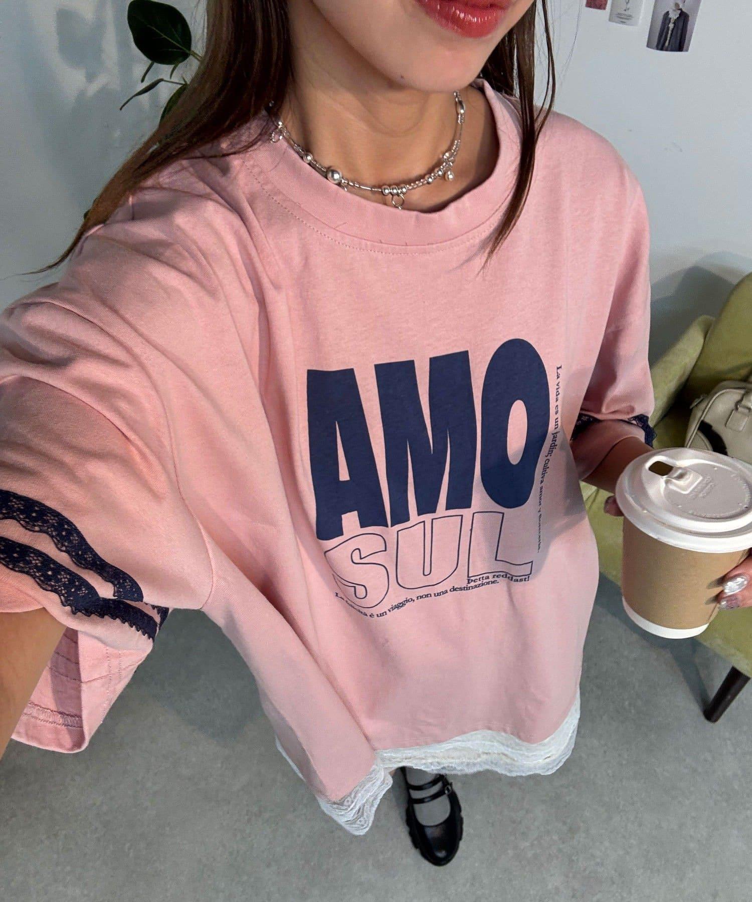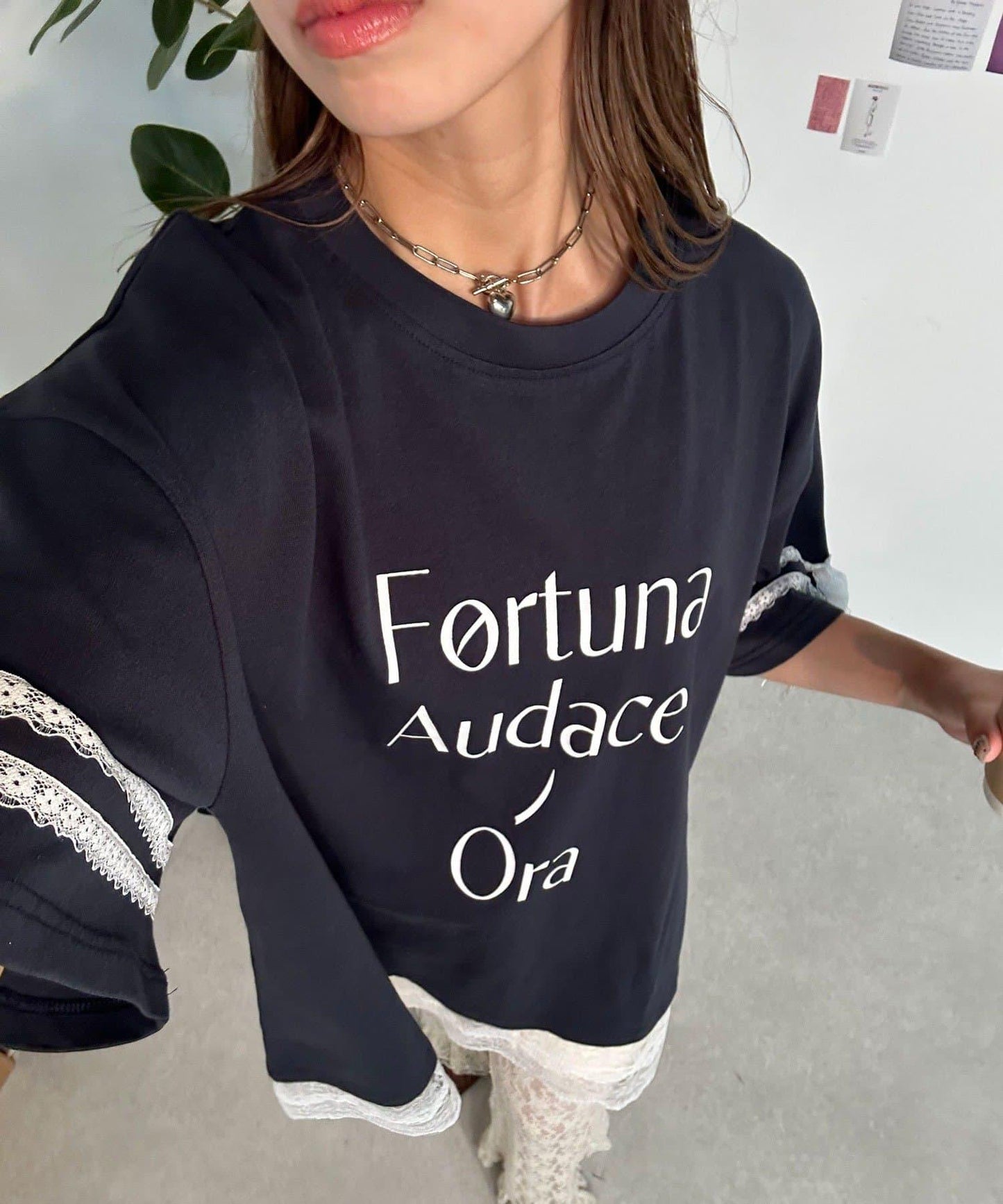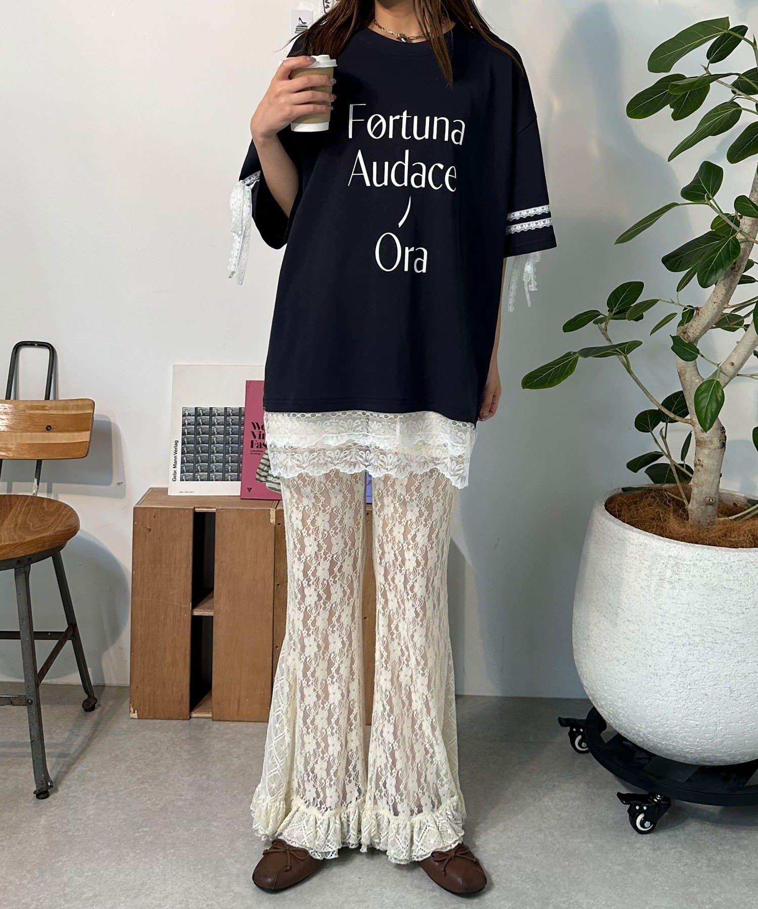 這款設計感十足的 T 恤印有徽標圖案,袖子上的絲帶和蕾絲帶更顯可愛。