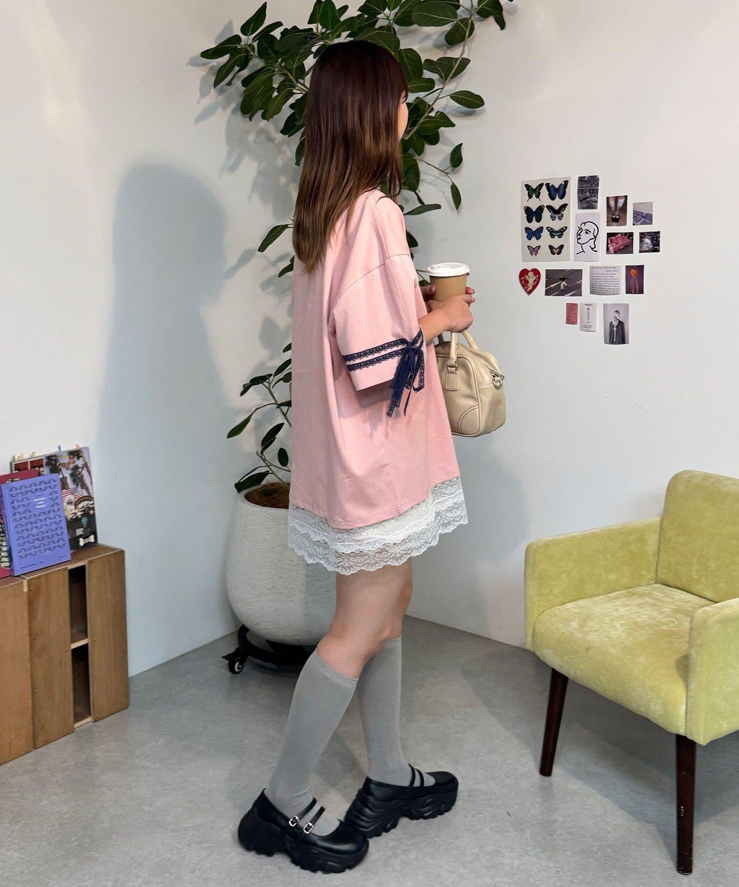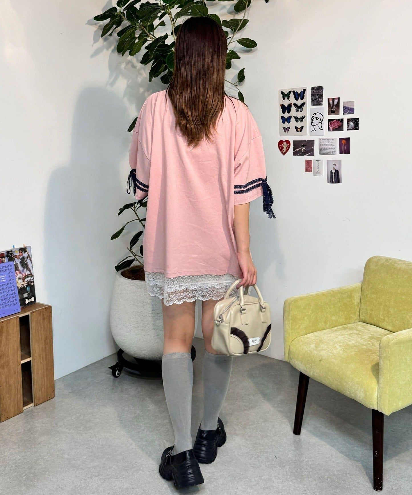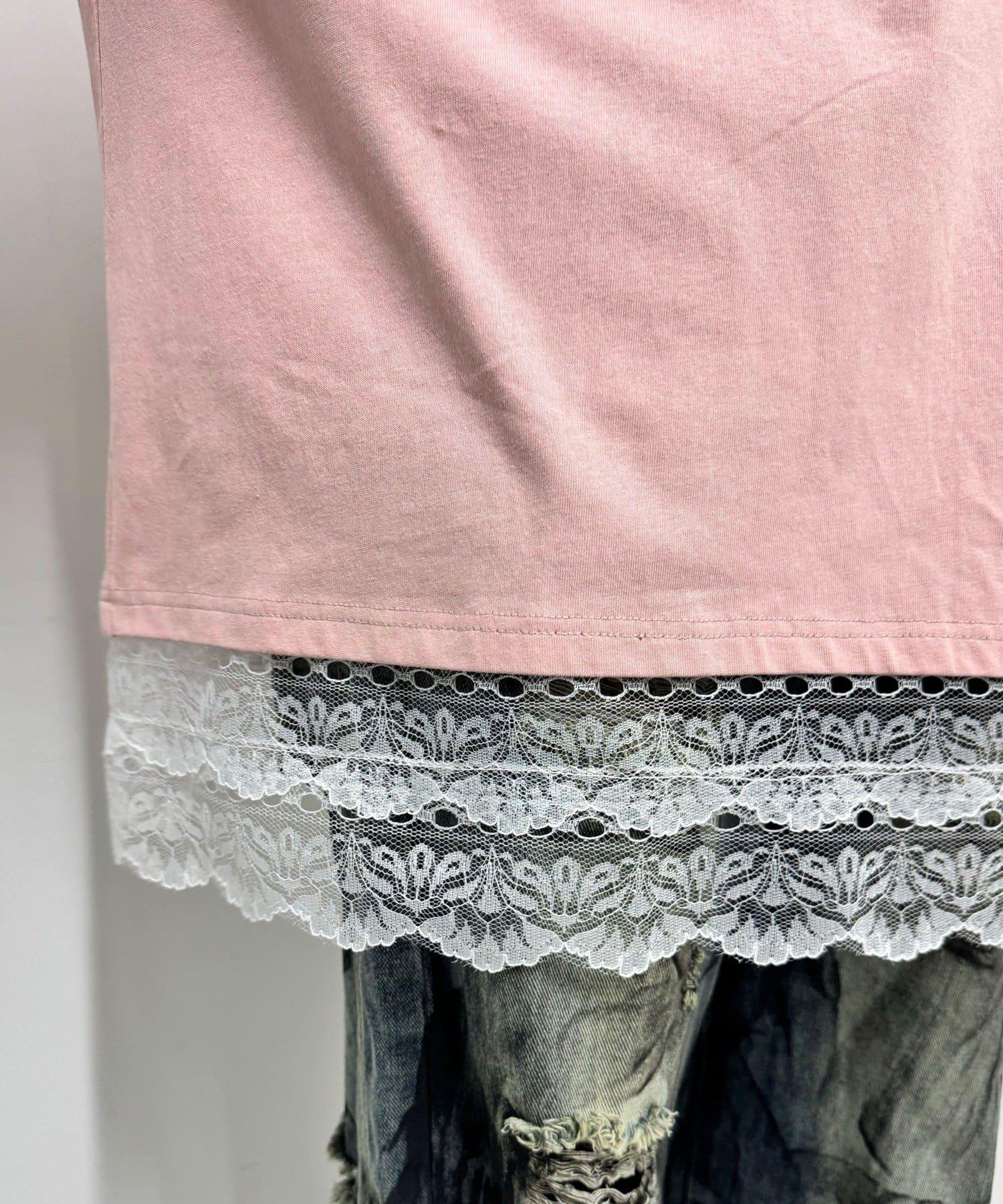 【中性款】蝴蝶結袖蕾絲疊層T恤連衣裙