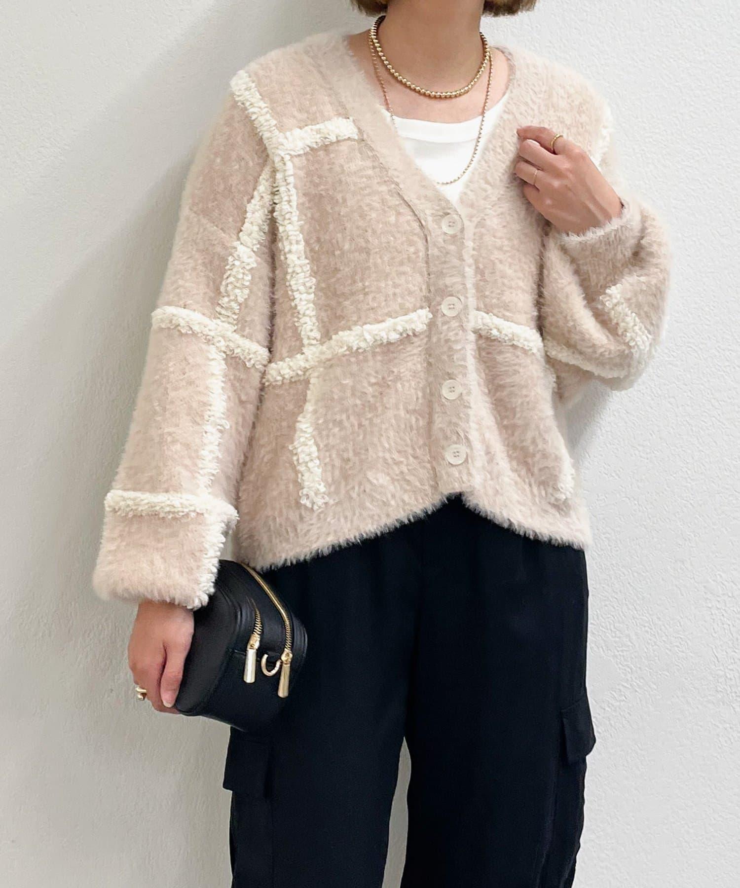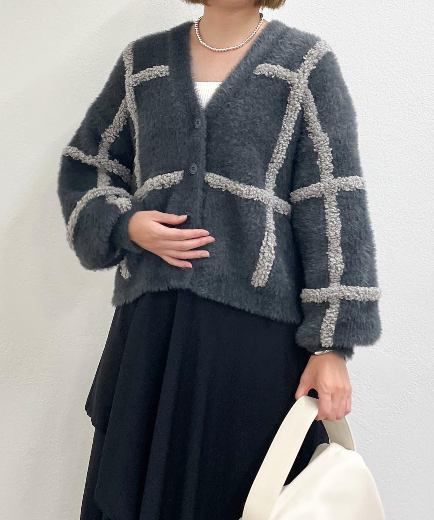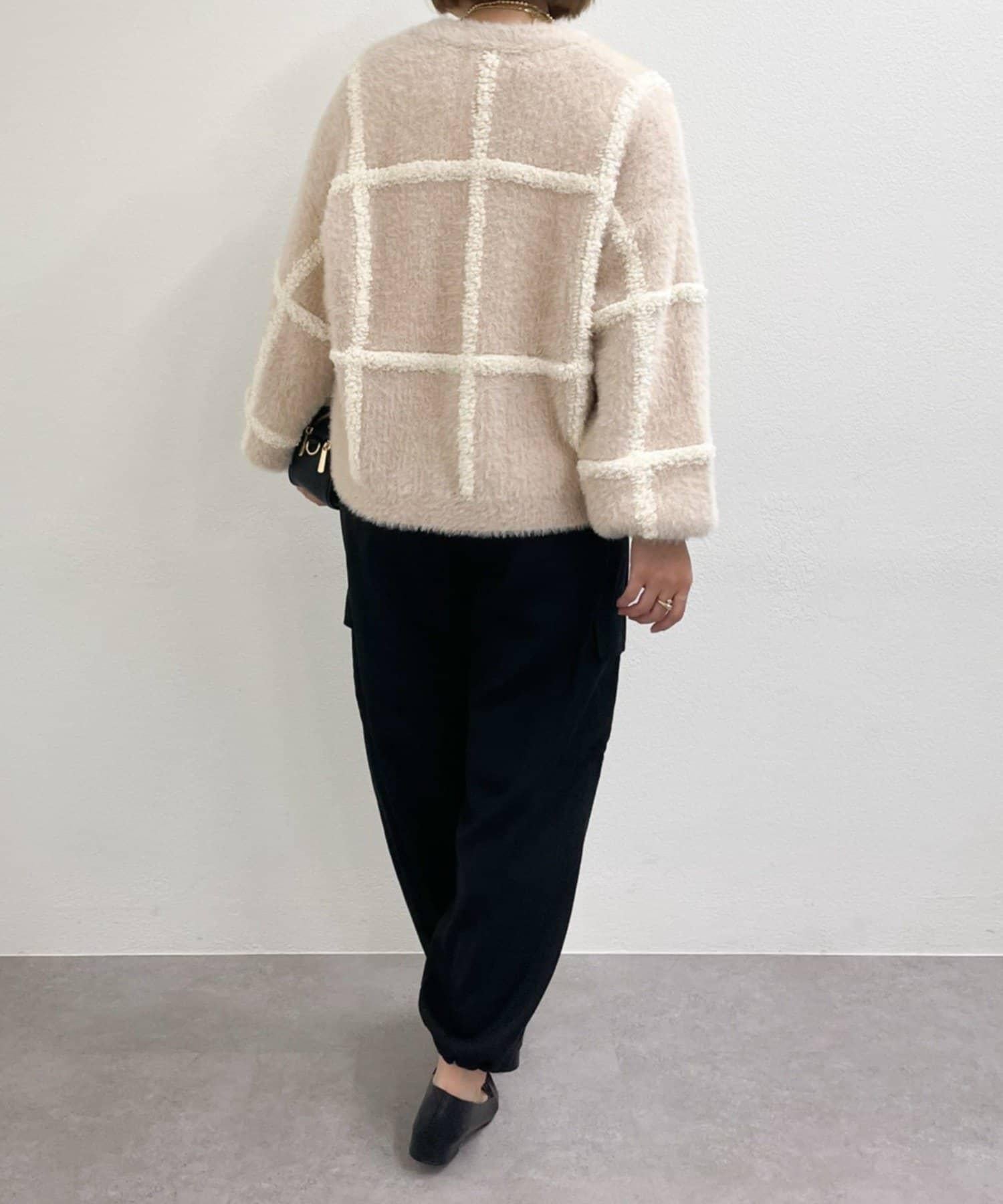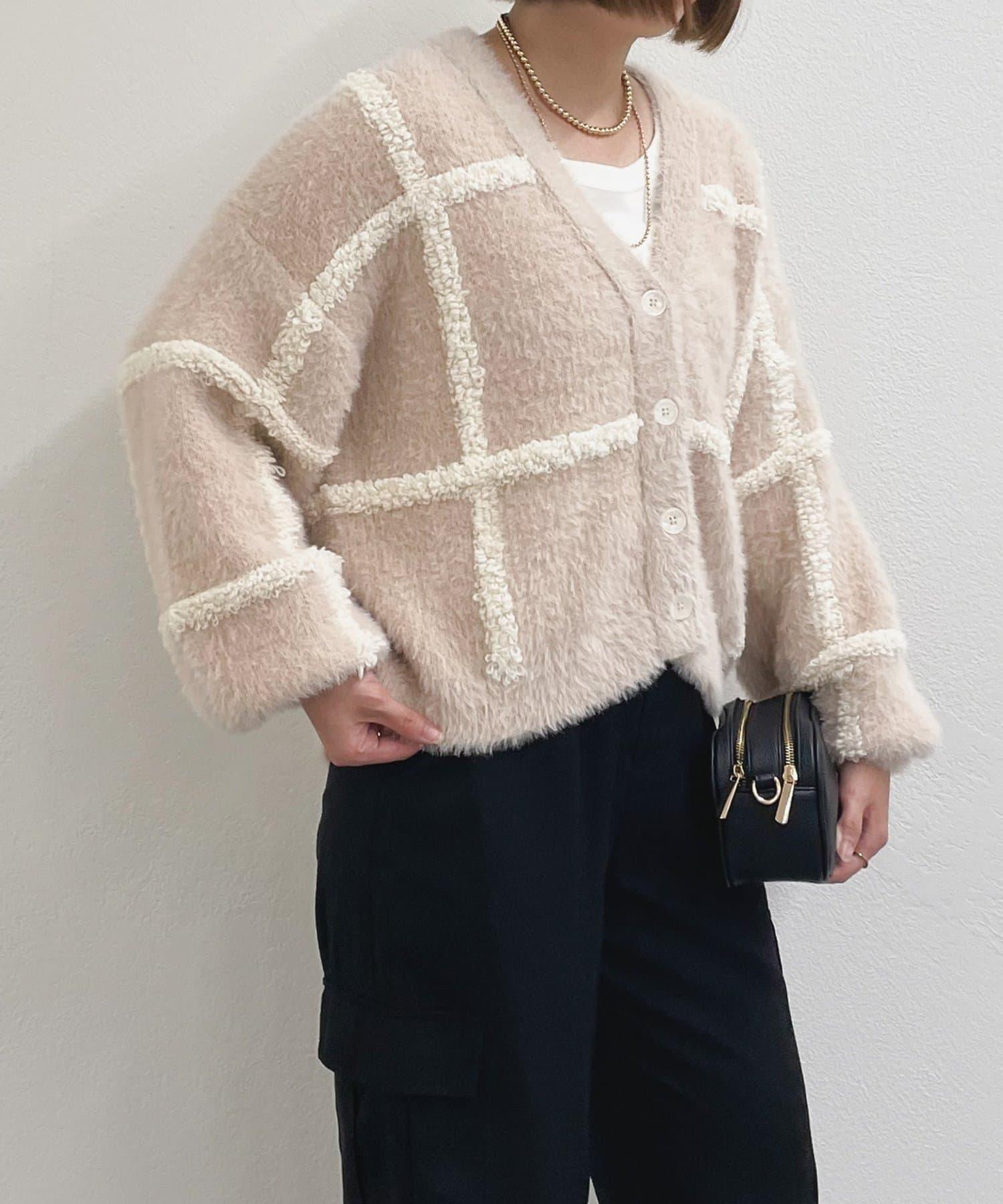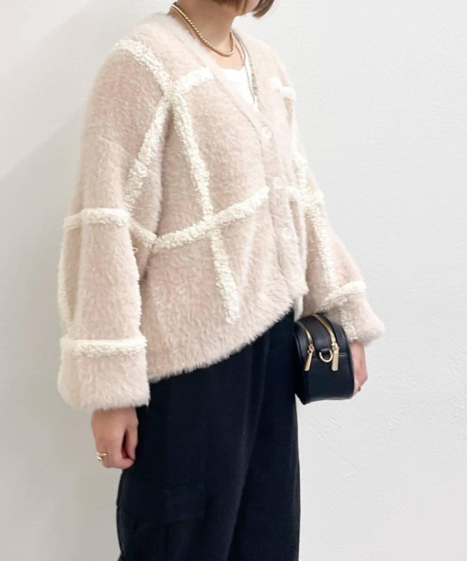 針織開衫衣身寬大,長度略短,可搭配任何下裝。