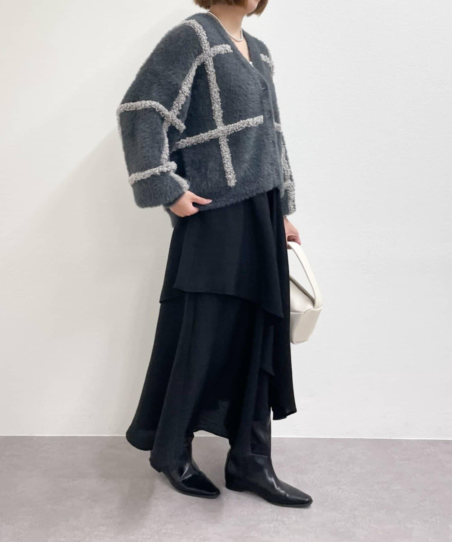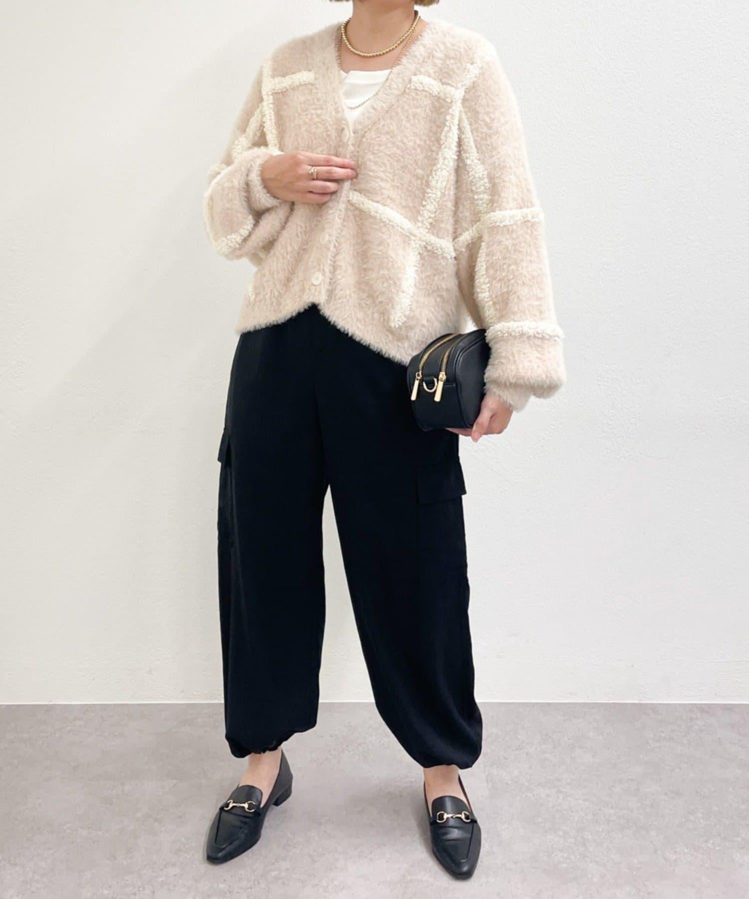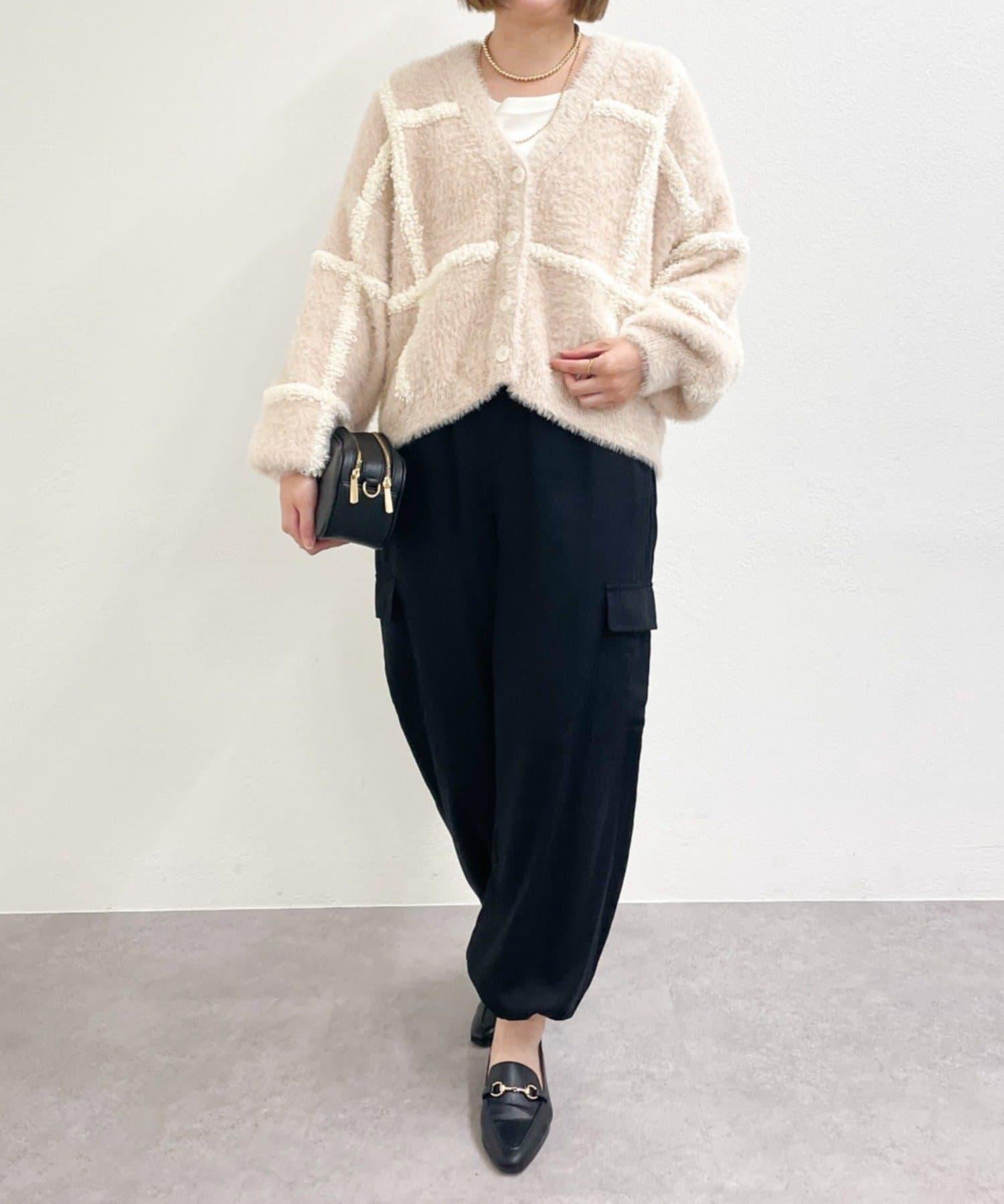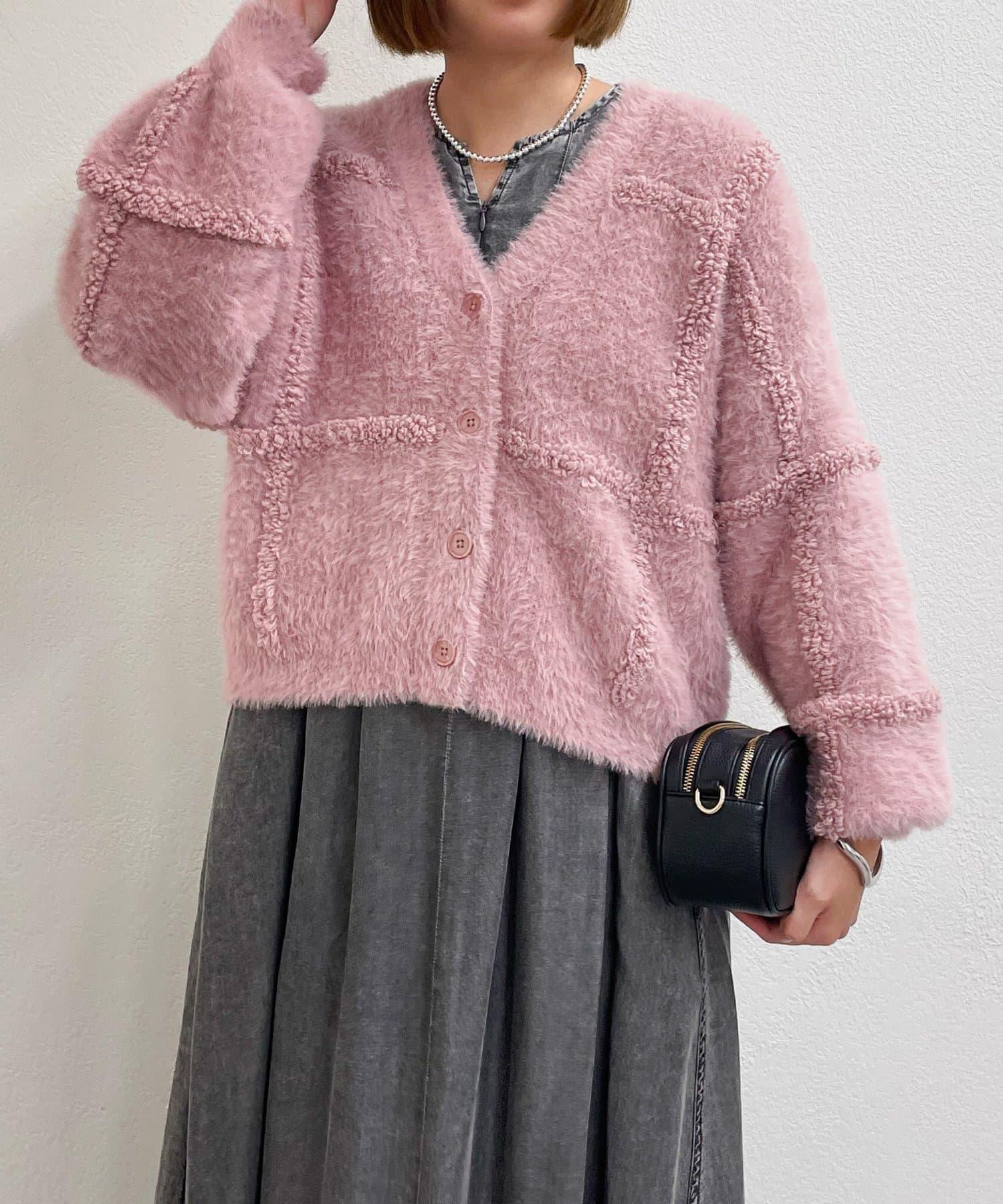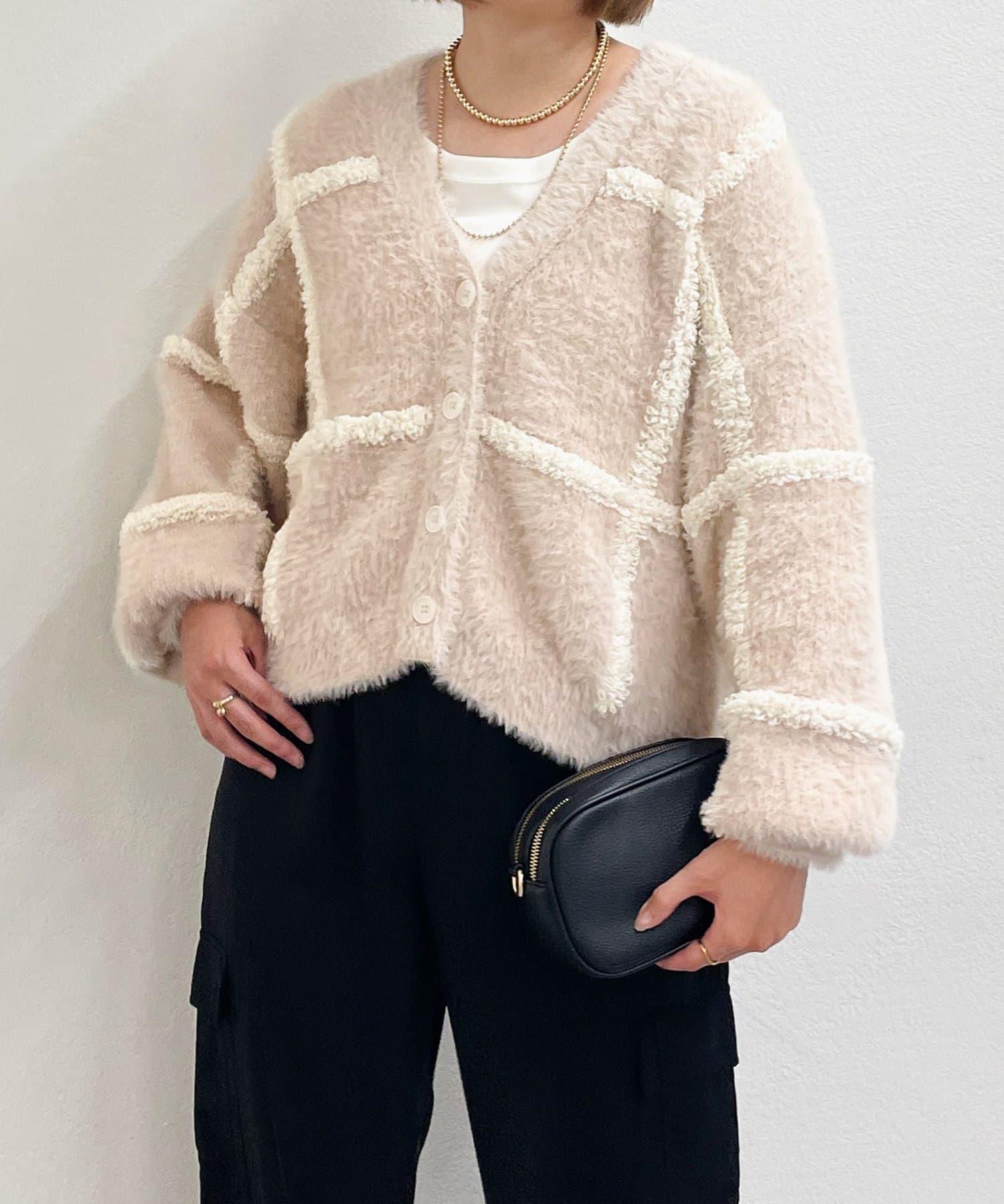針織開衫衣身寬大,長度略短,可搭配任何下裝。