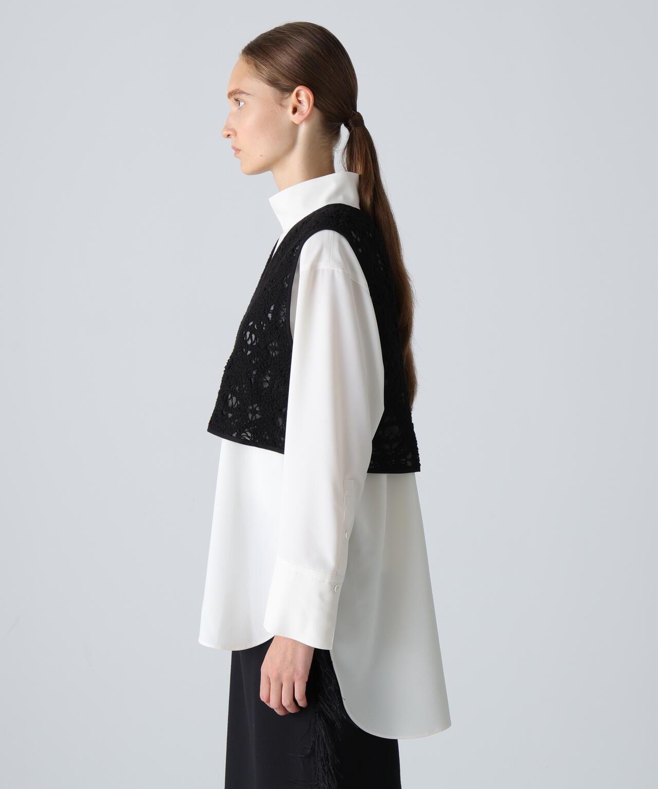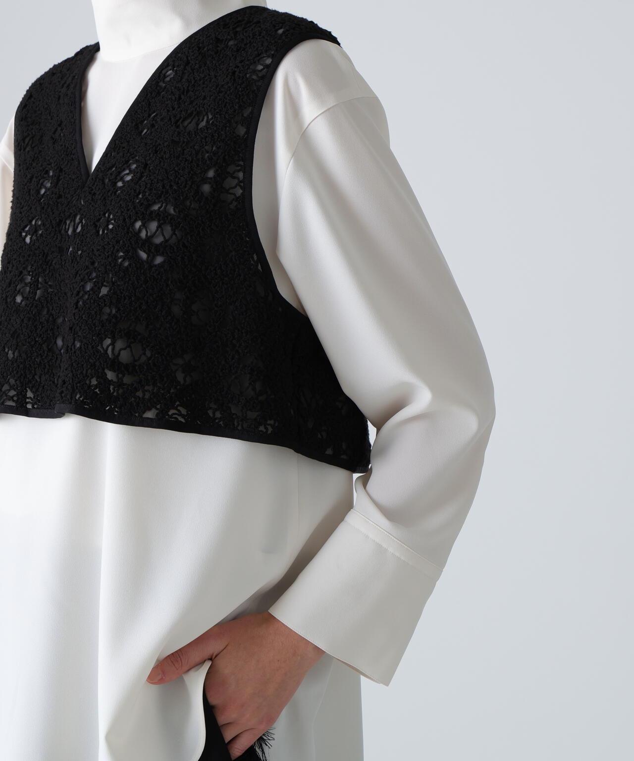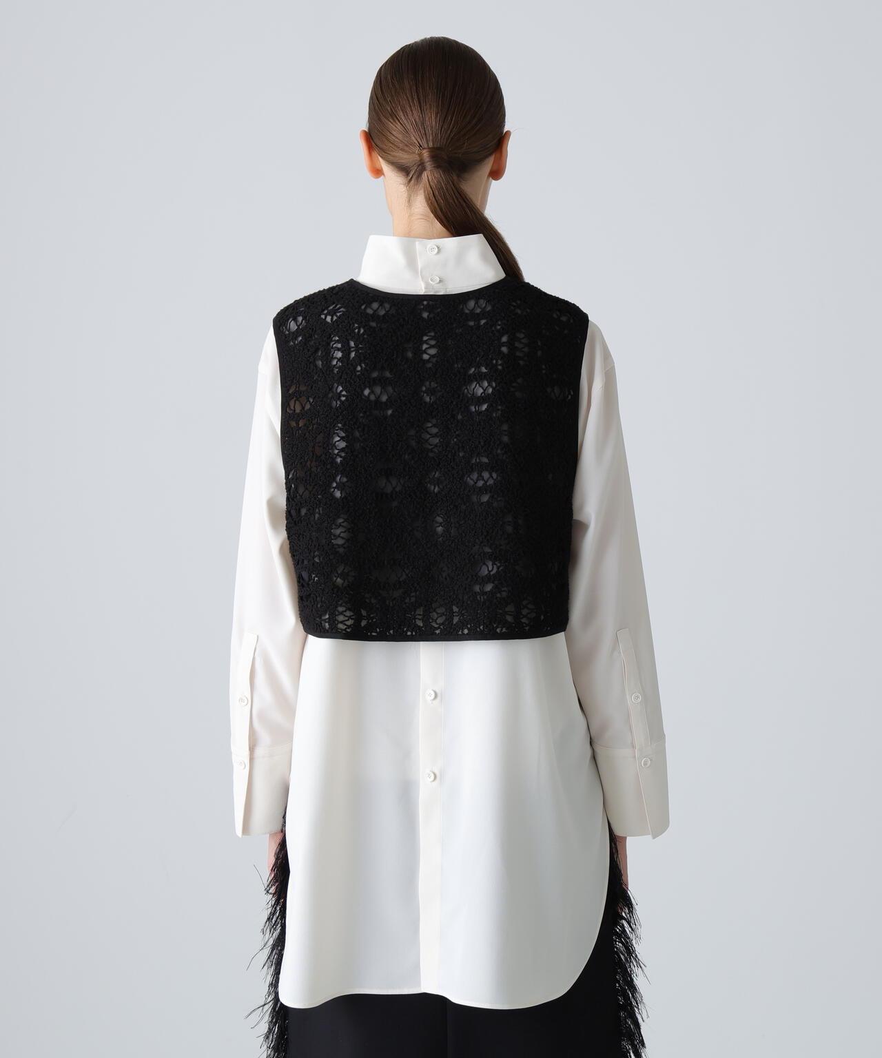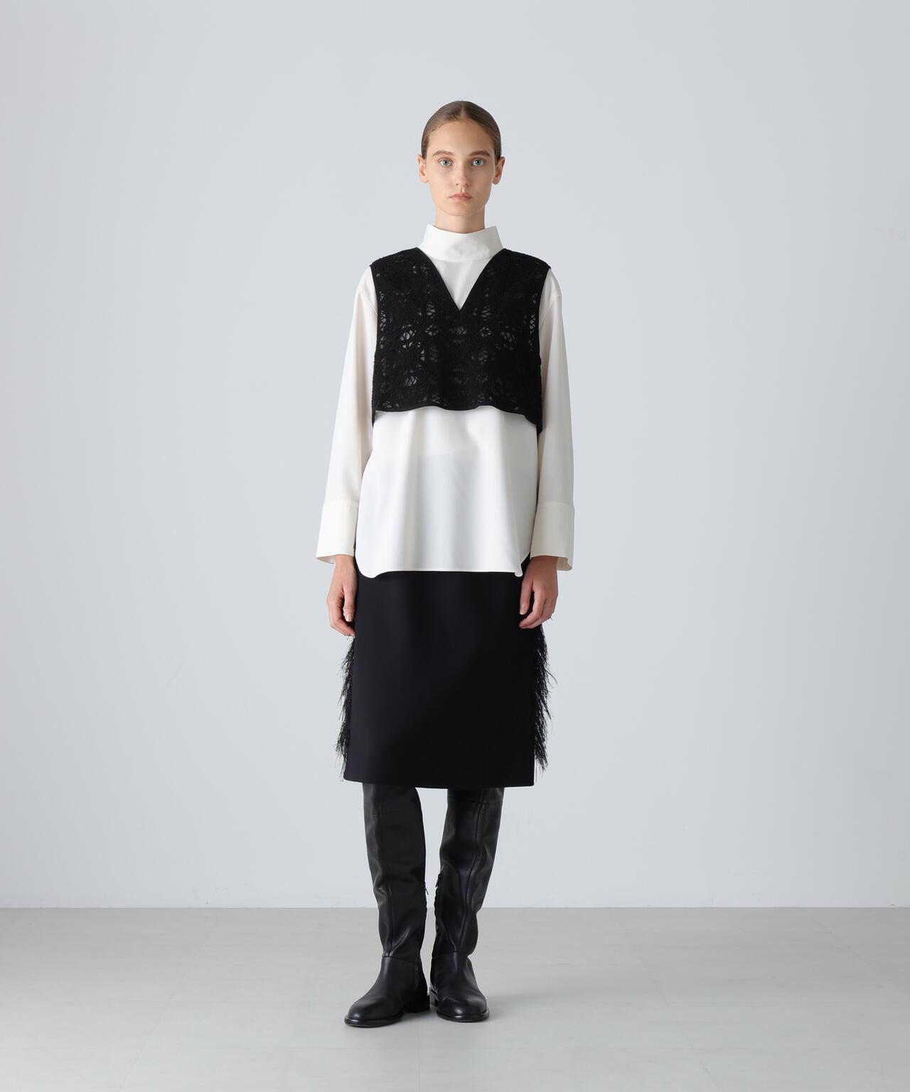 上衣和蕾絲半身裙套裝,打造多層次造型合成材料製成的高領上衣,外面疊穿一件蕾絲半身裙。高領襯衫和獨特的蕾絲半身裙也可分開使用。