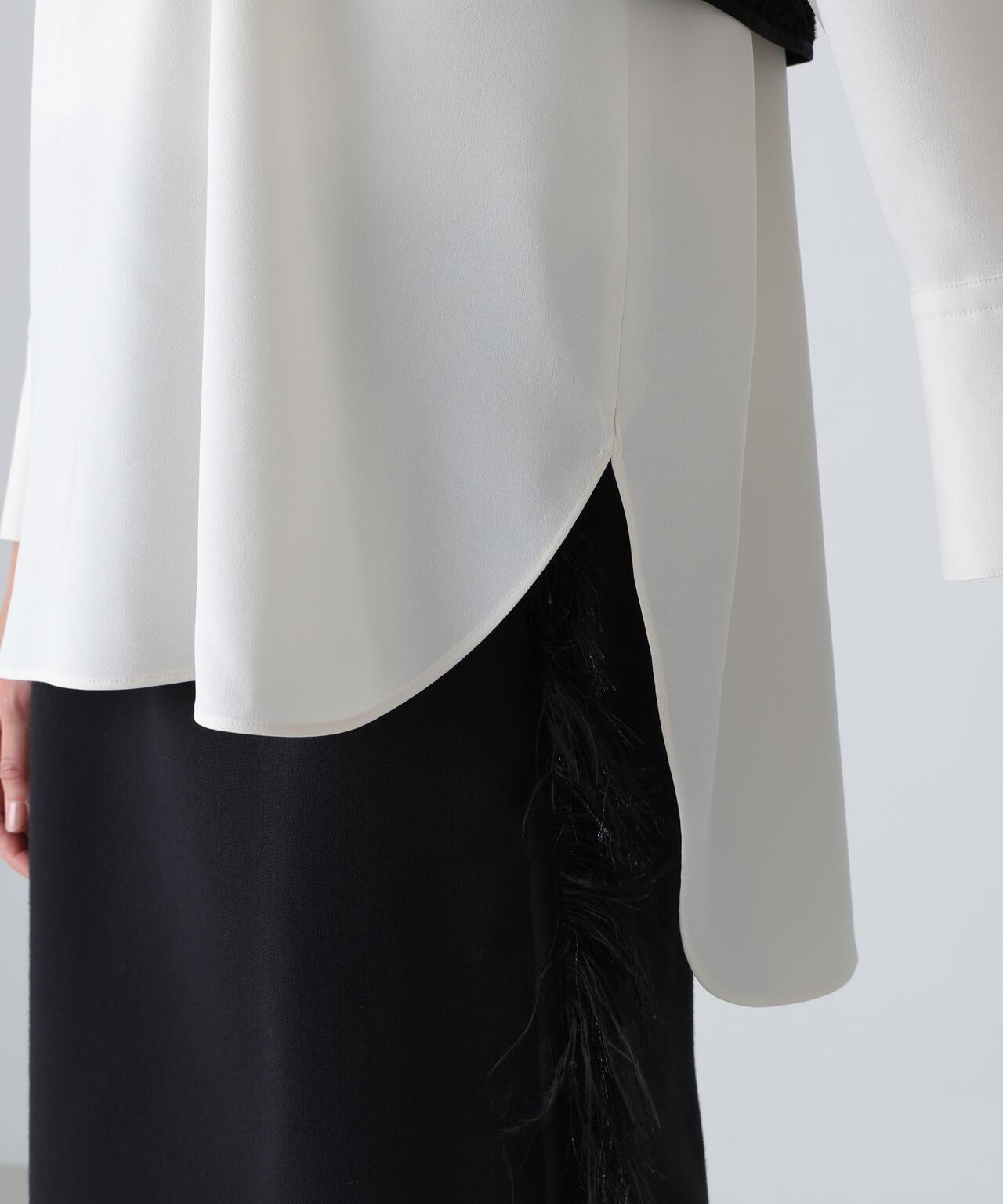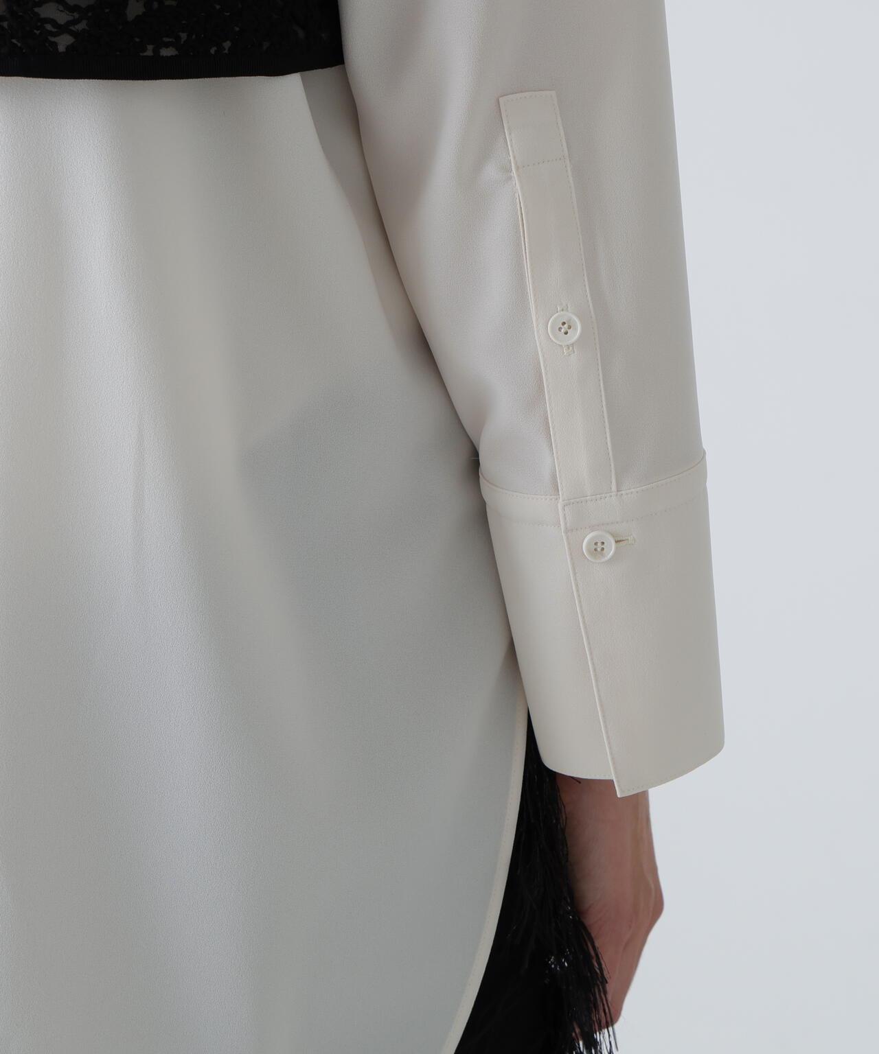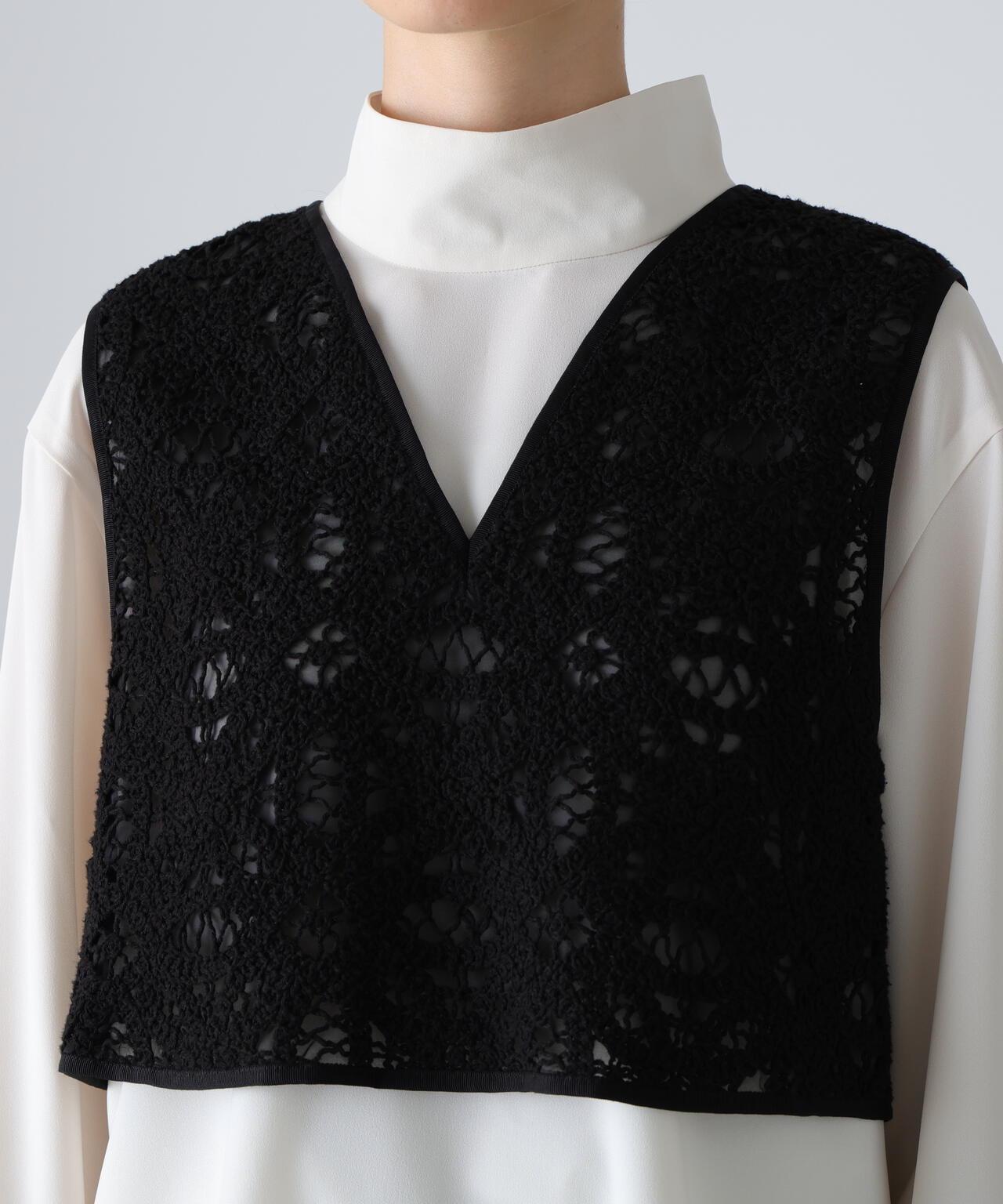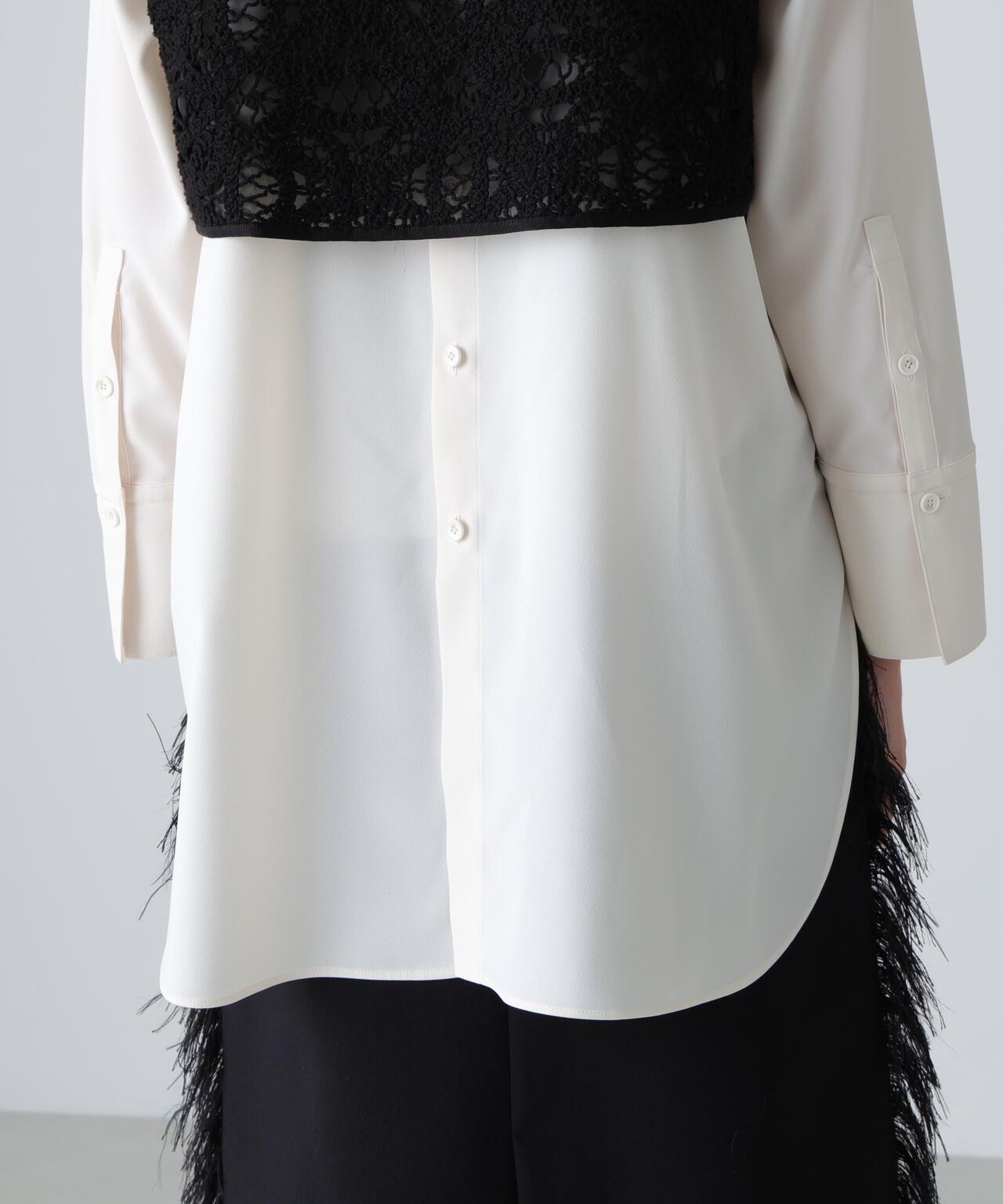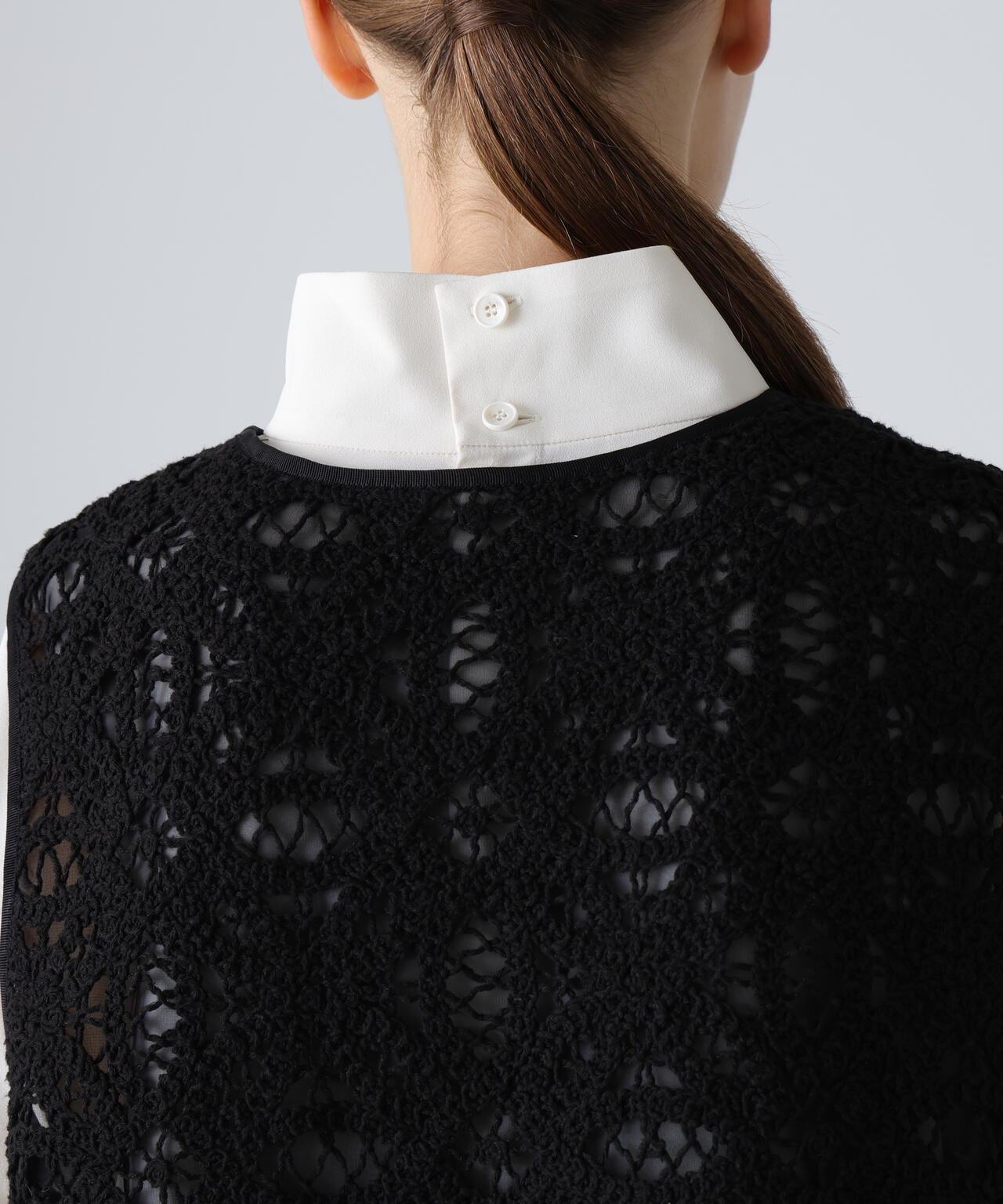 上衣和蕾絲半身裙套裝,打造多層次造型合成材料製成的高領上衣,外面疊穿一件蕾絲半身裙。高領襯衫和獨特的蕾絲半身裙也可分開使用。