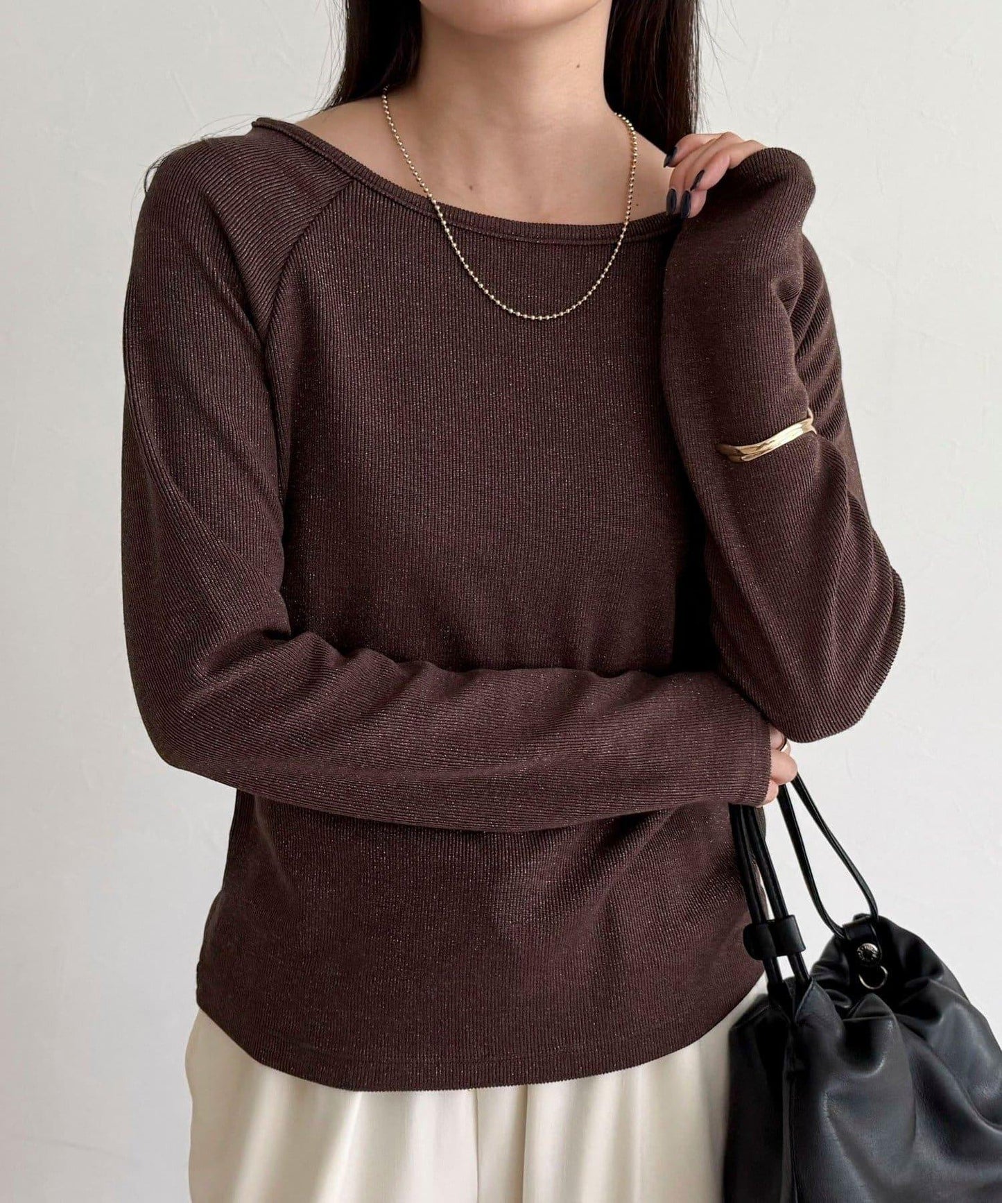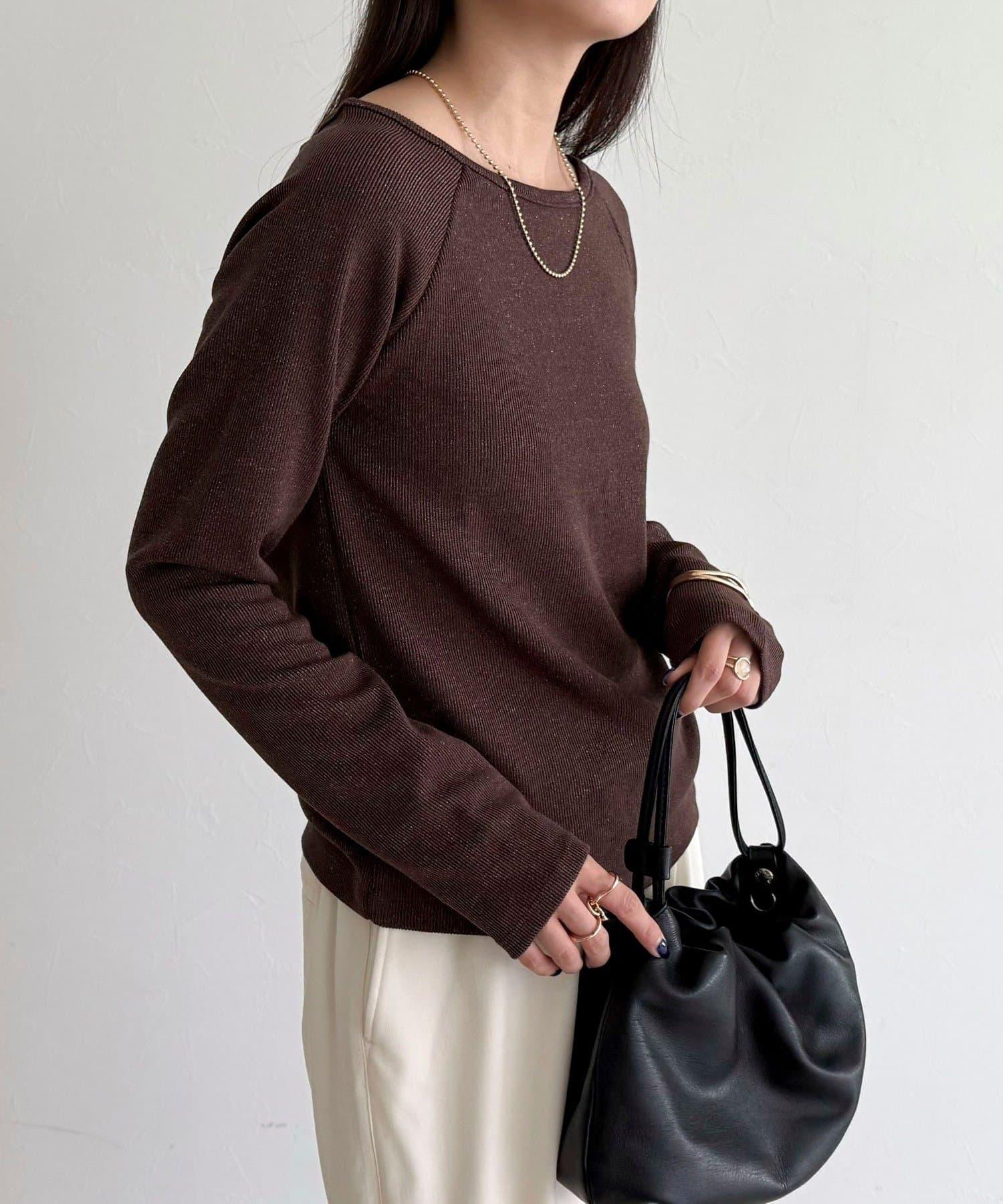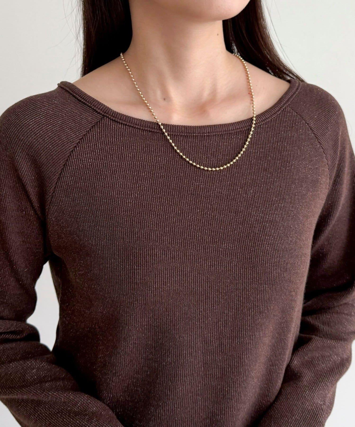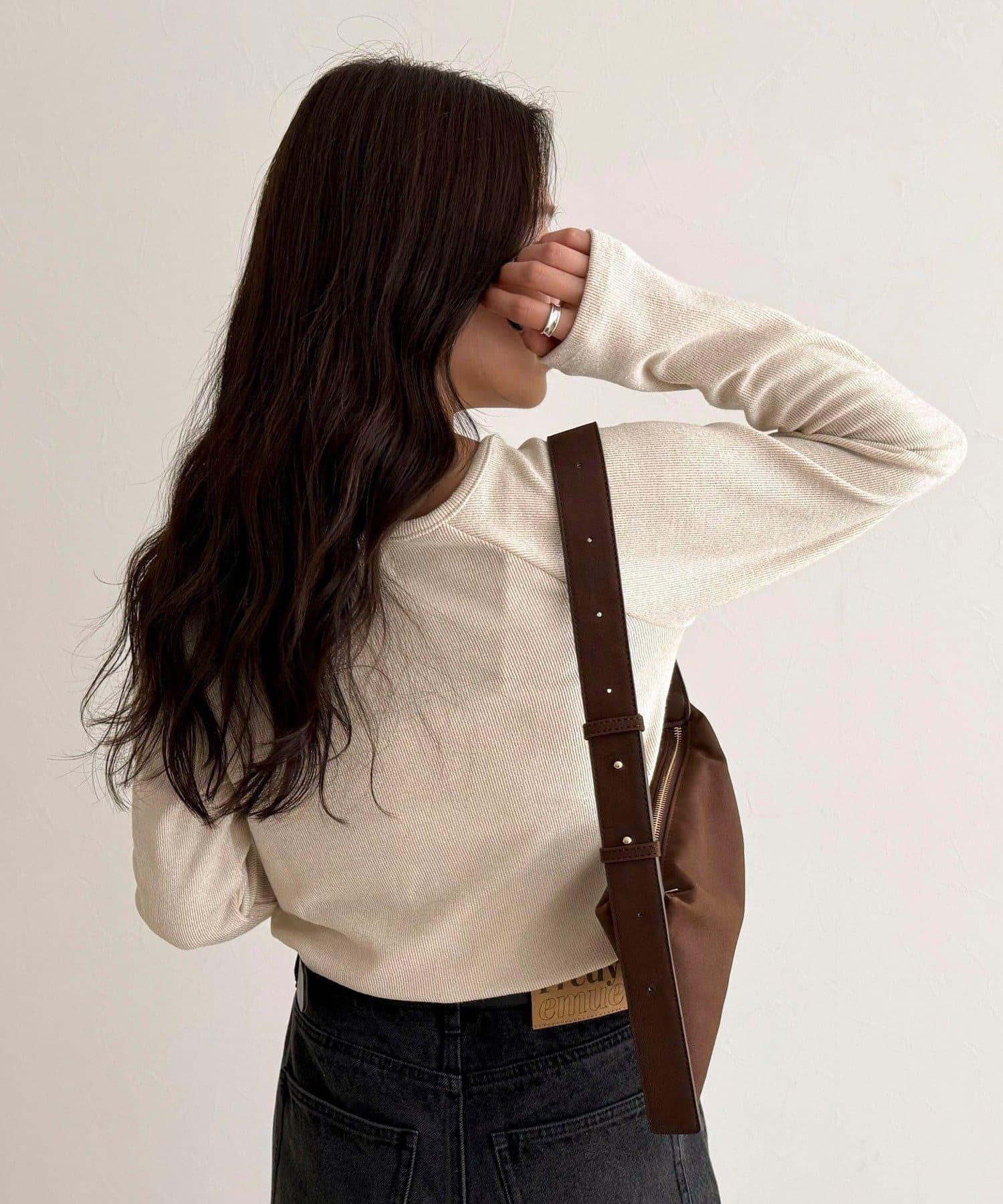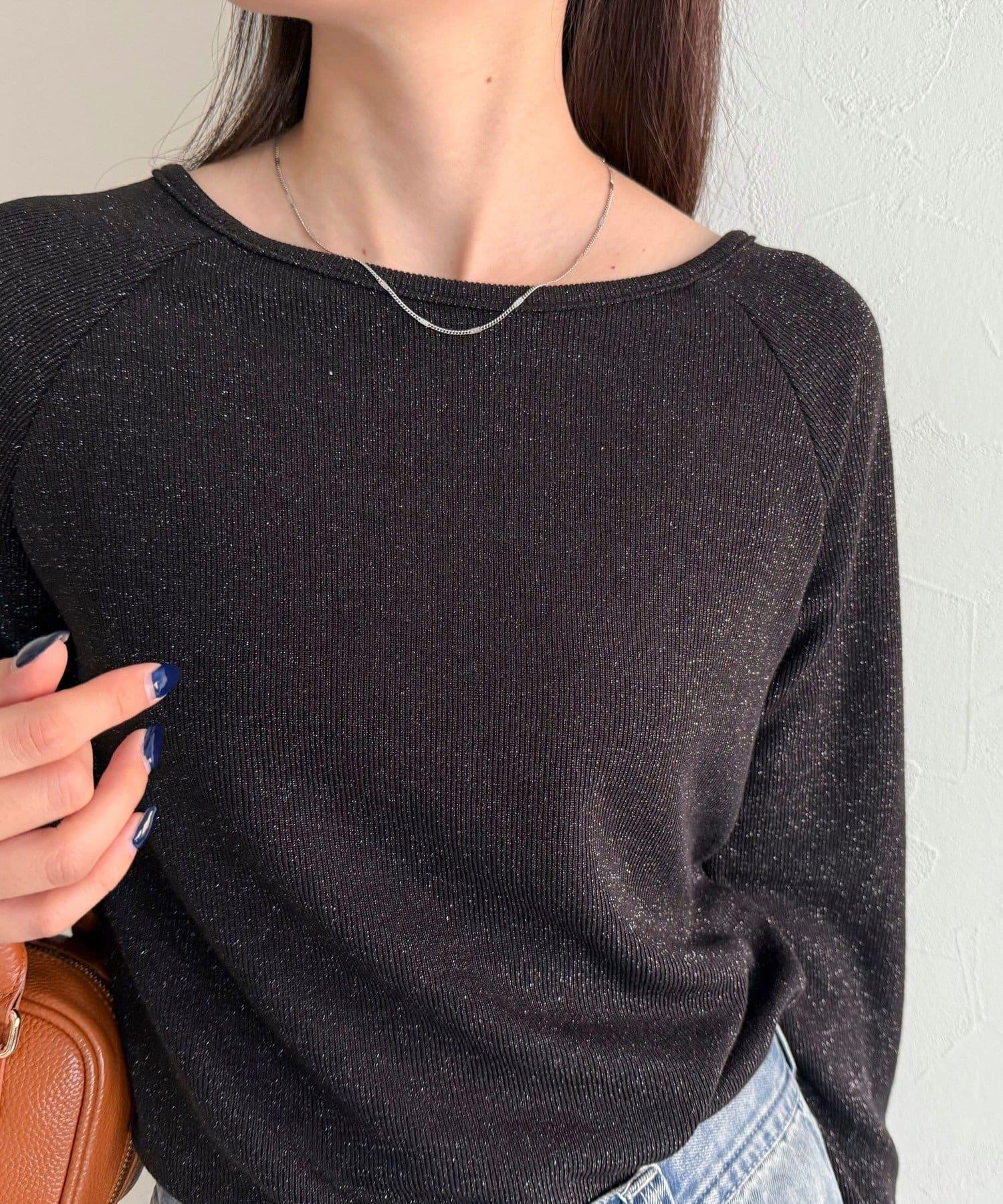 身高 156 厘米的工作人員(穿 38 號):恰到好處地貼合身體,肩部和腰部線條優美。彈性好,穿起來活動自如,很舒服。柔軟的面料貼膚感很好,薄片巧妙地閃耀著光澤,是提亮臉龐的好點子。領口處的船形領口設計,將骨架筆直的鎖骨線條展現得淋漓盡致,女人味十足。