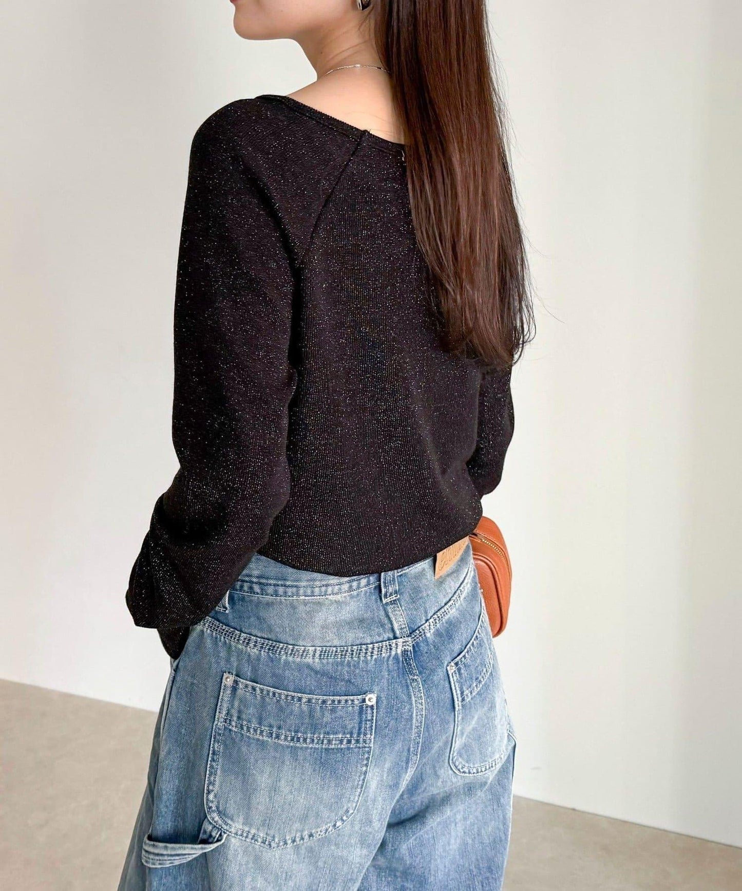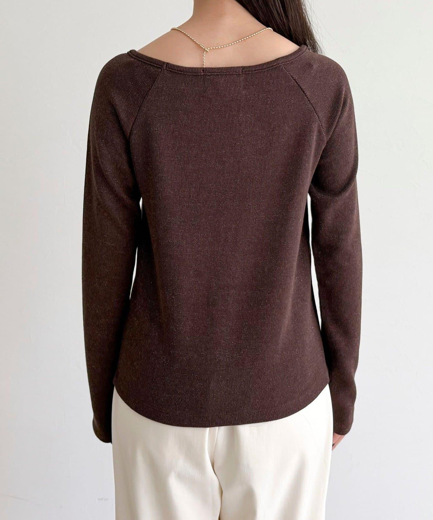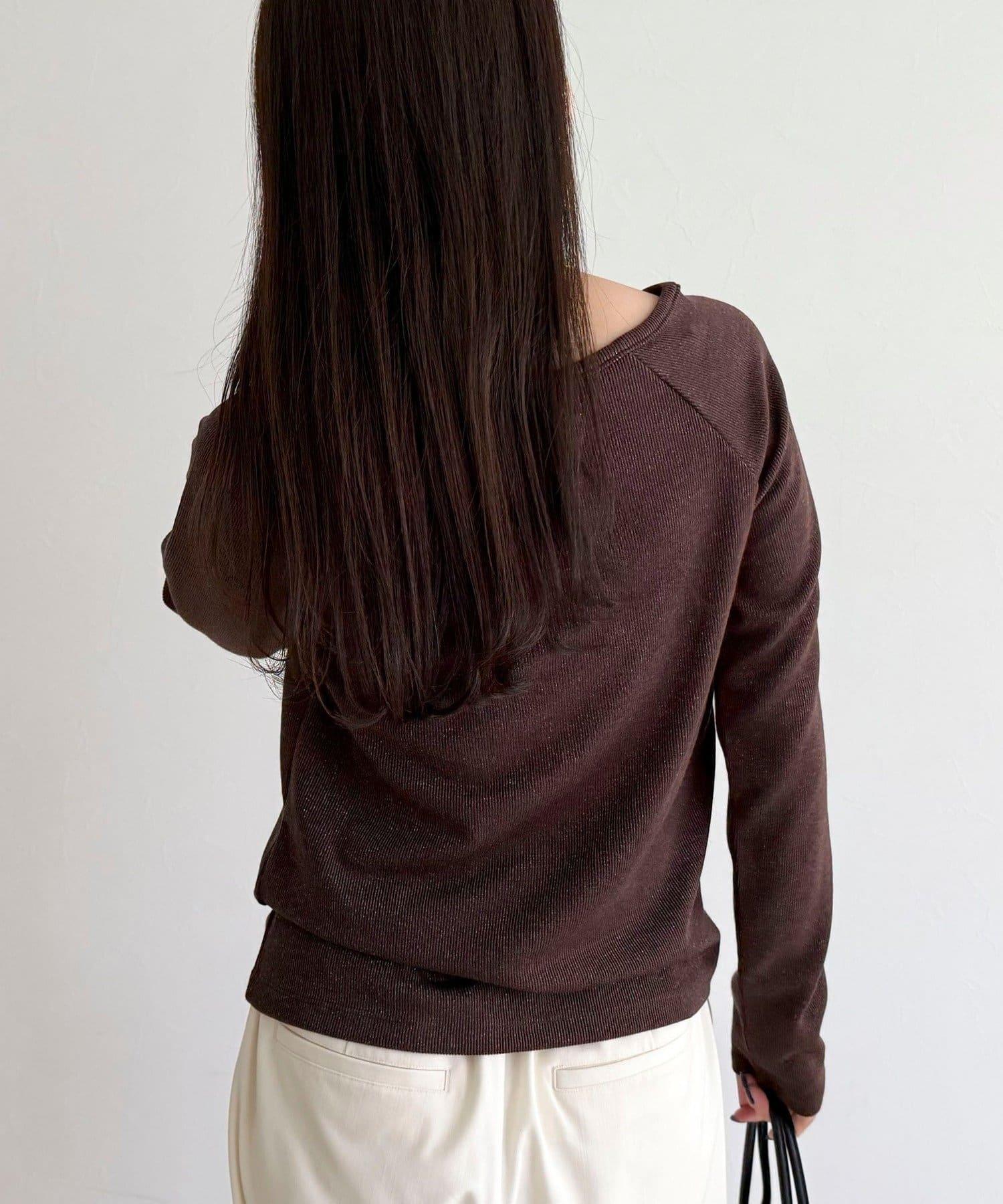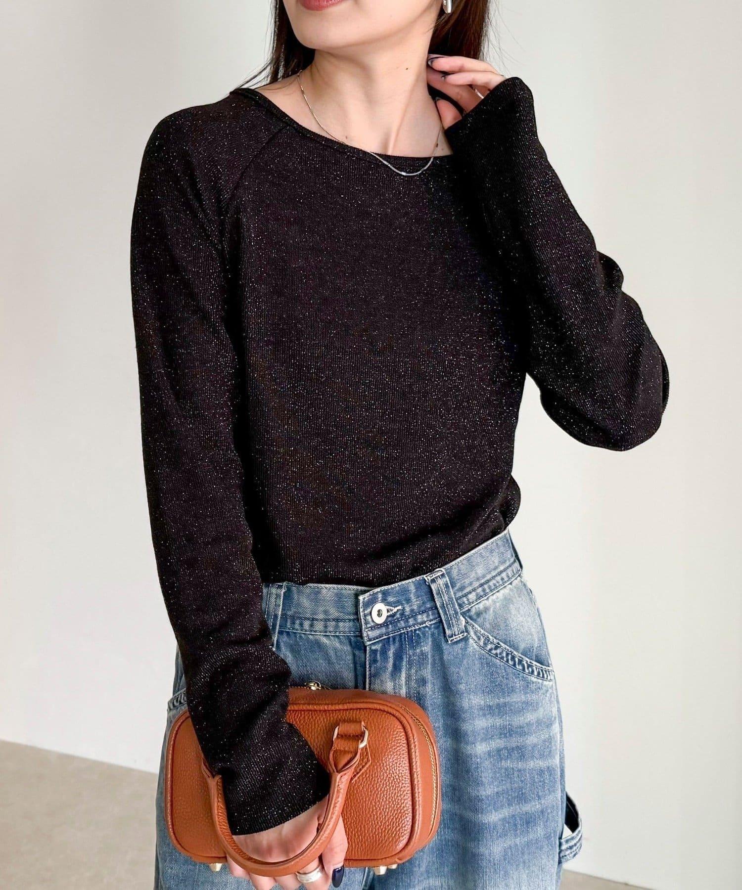 身高 156 厘米的工作人員(穿 38 號):恰到好處地貼合身體,肩部和腰部線條優美。彈性好,穿起來活動自如,很舒服。柔軟的面料貼膚感很好,薄片巧妙地閃耀著光澤,是提亮臉龐的好點子。領口處的船形領口設計,將骨架筆直的鎖骨線條展現得淋漓盡致,女人味十足。