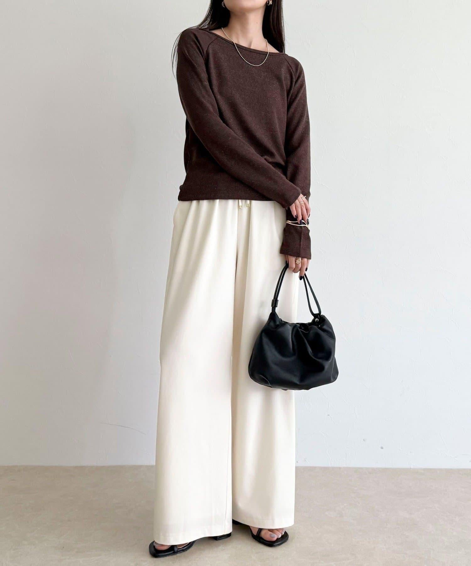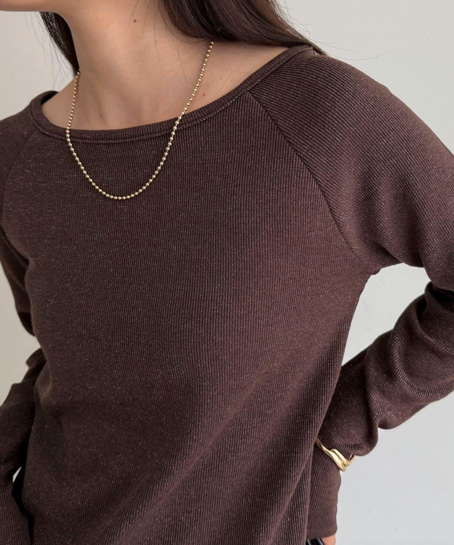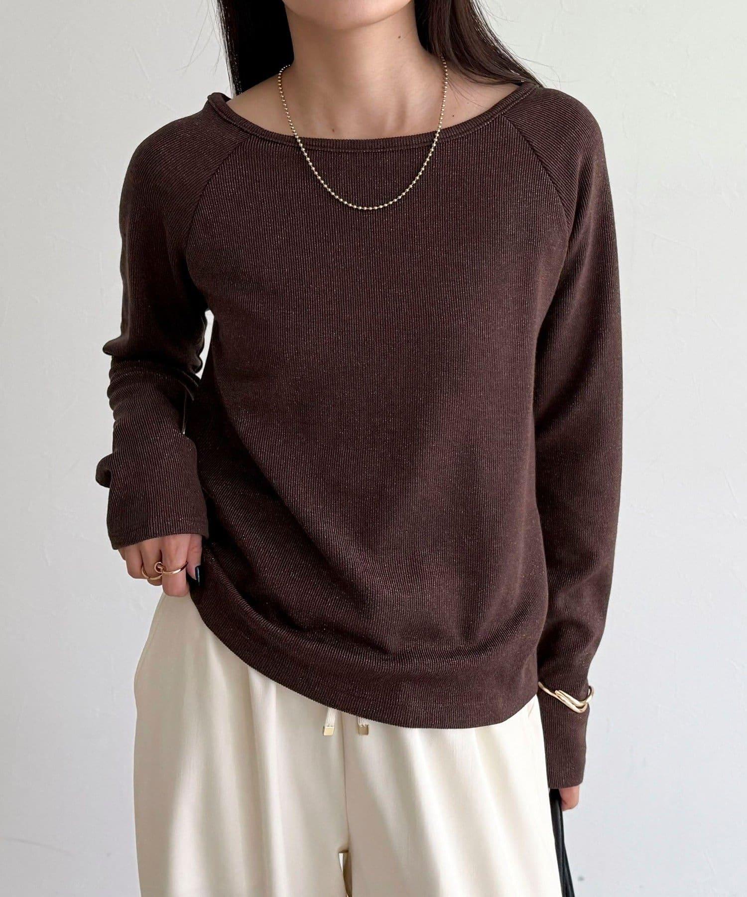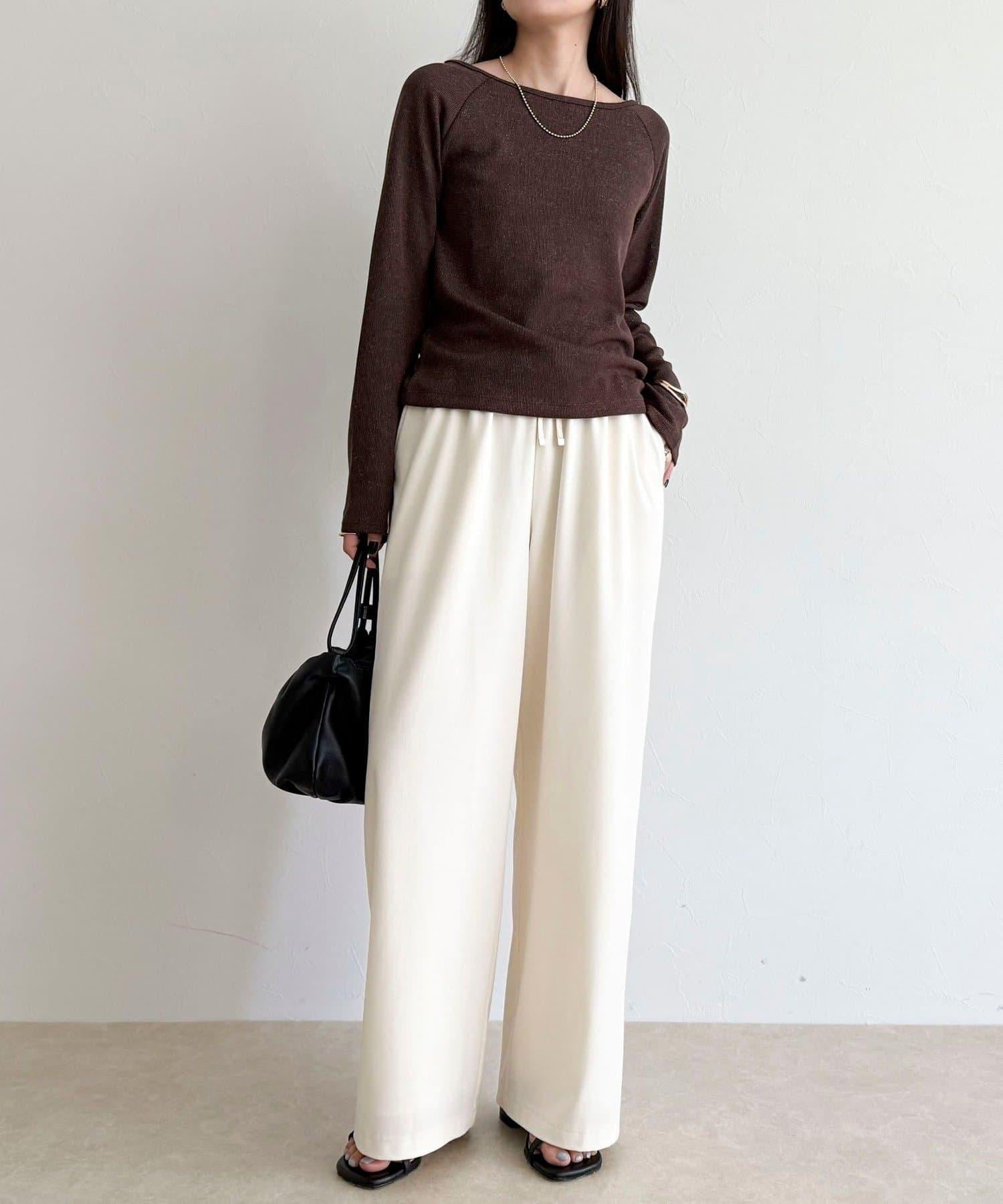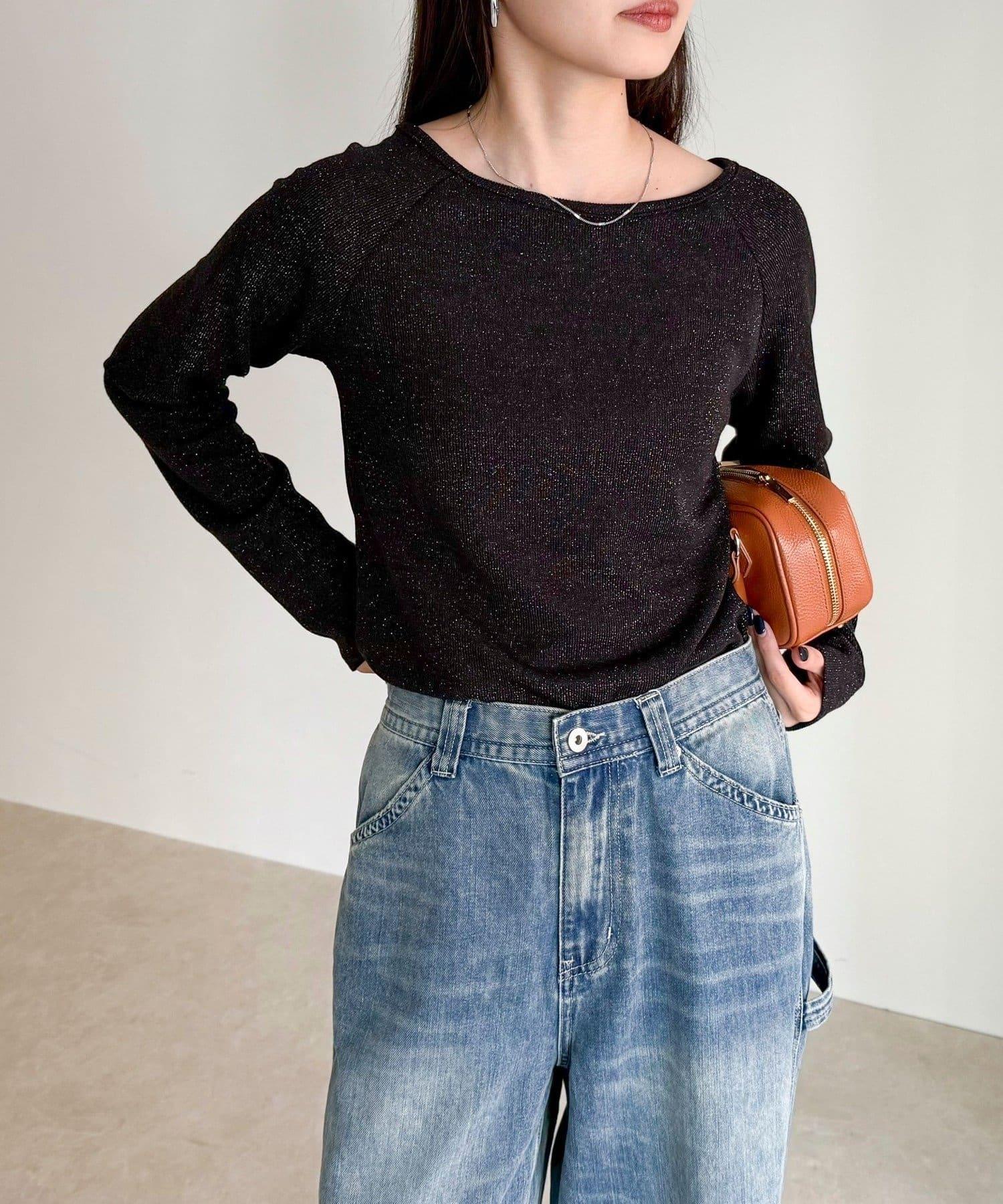 身高 156 厘米的工作人員(穿 38 號):恰到好處地貼合身體,肩部和腰部線條優美。彈性好,穿起來活動自如,很舒服。柔軟的面料貼膚感很好,薄片巧妙地閃耀著光澤,是提亮臉龐的好點子。領口處的船形領口設計,將骨架筆直的鎖骨線條展現得淋漓盡致,女人味十足。
