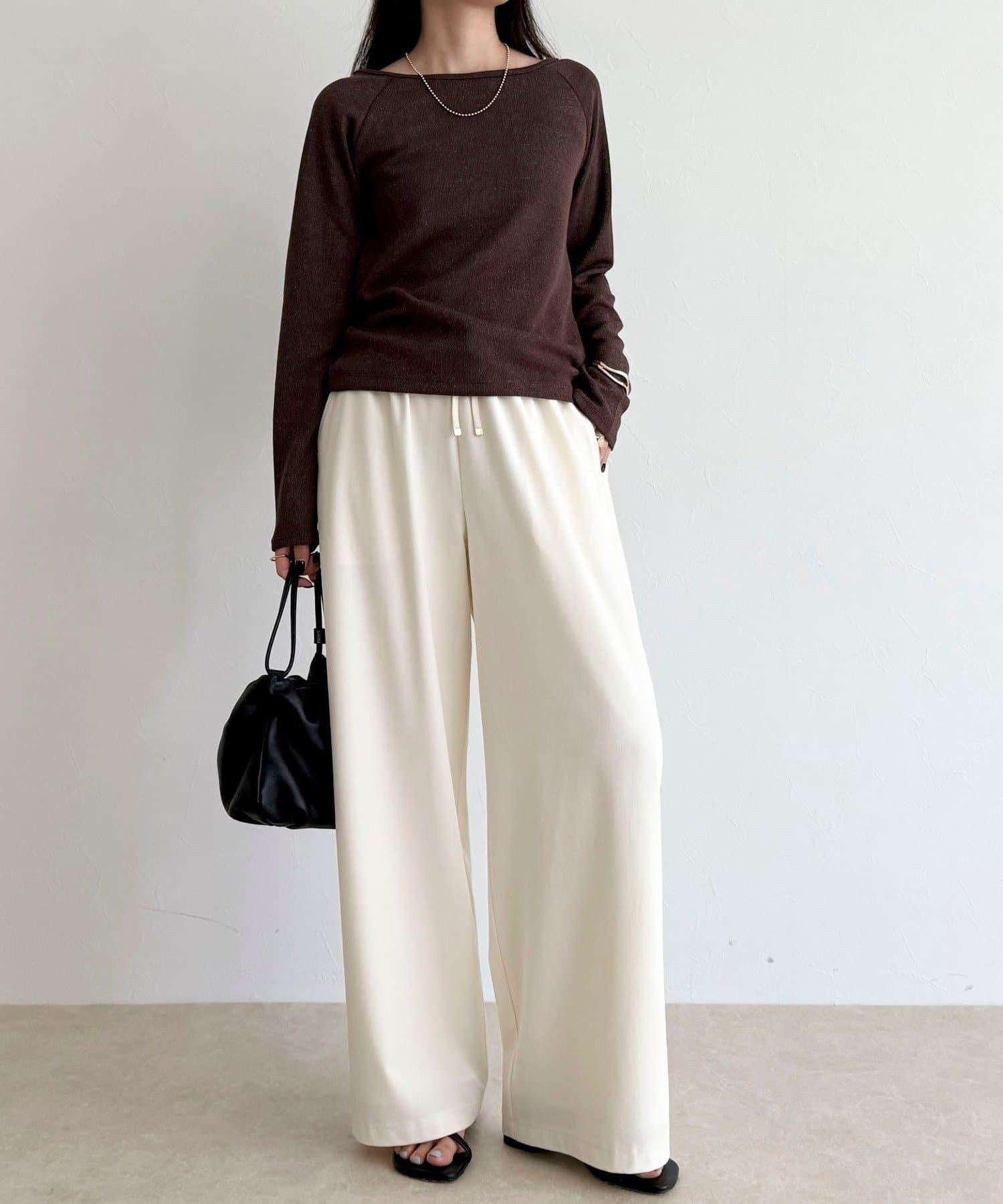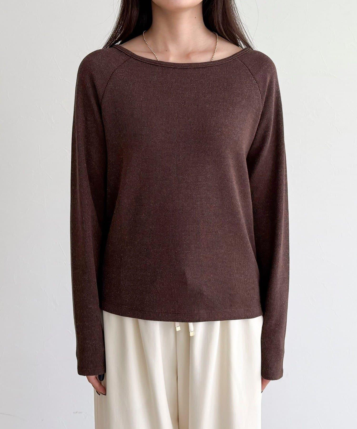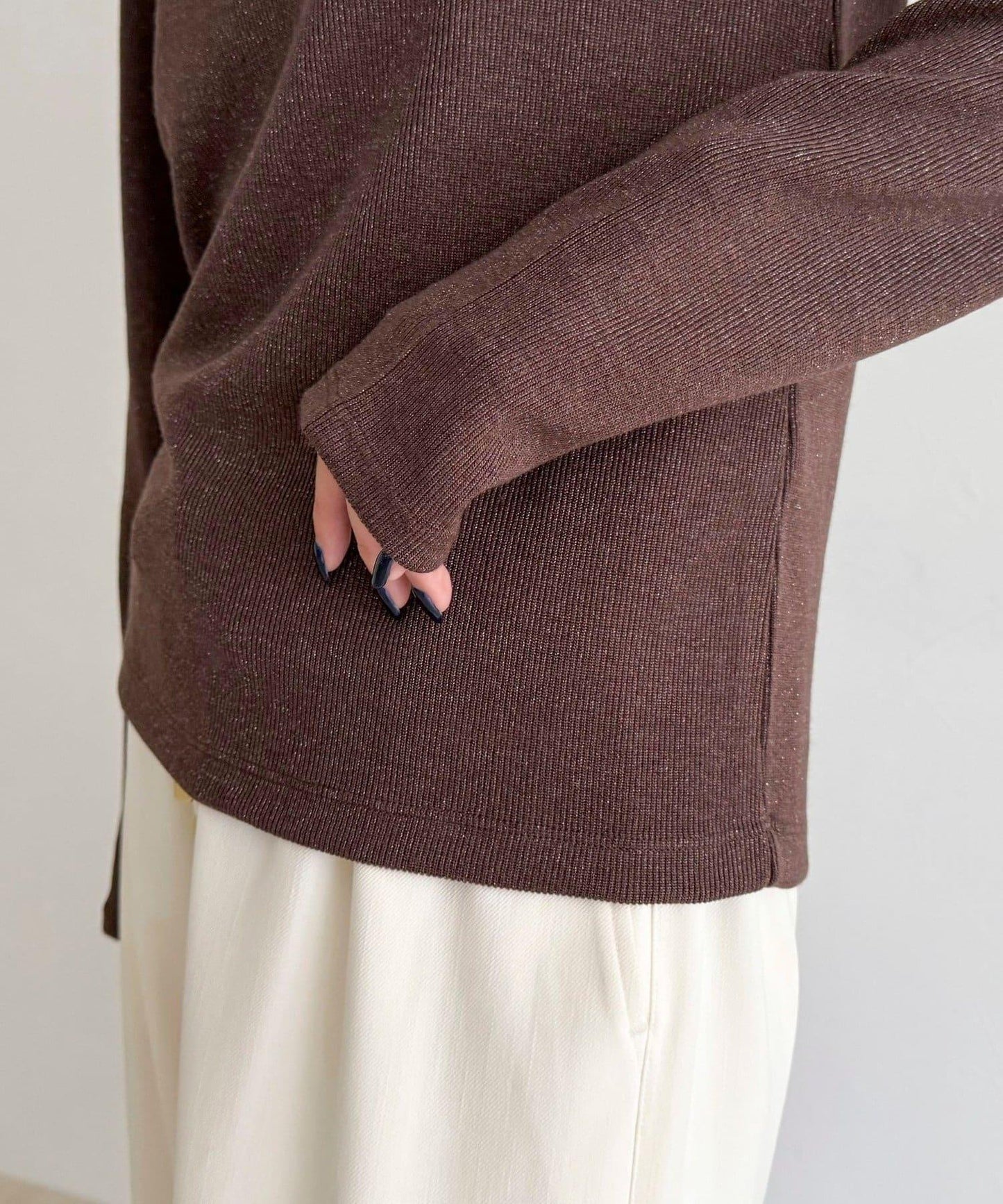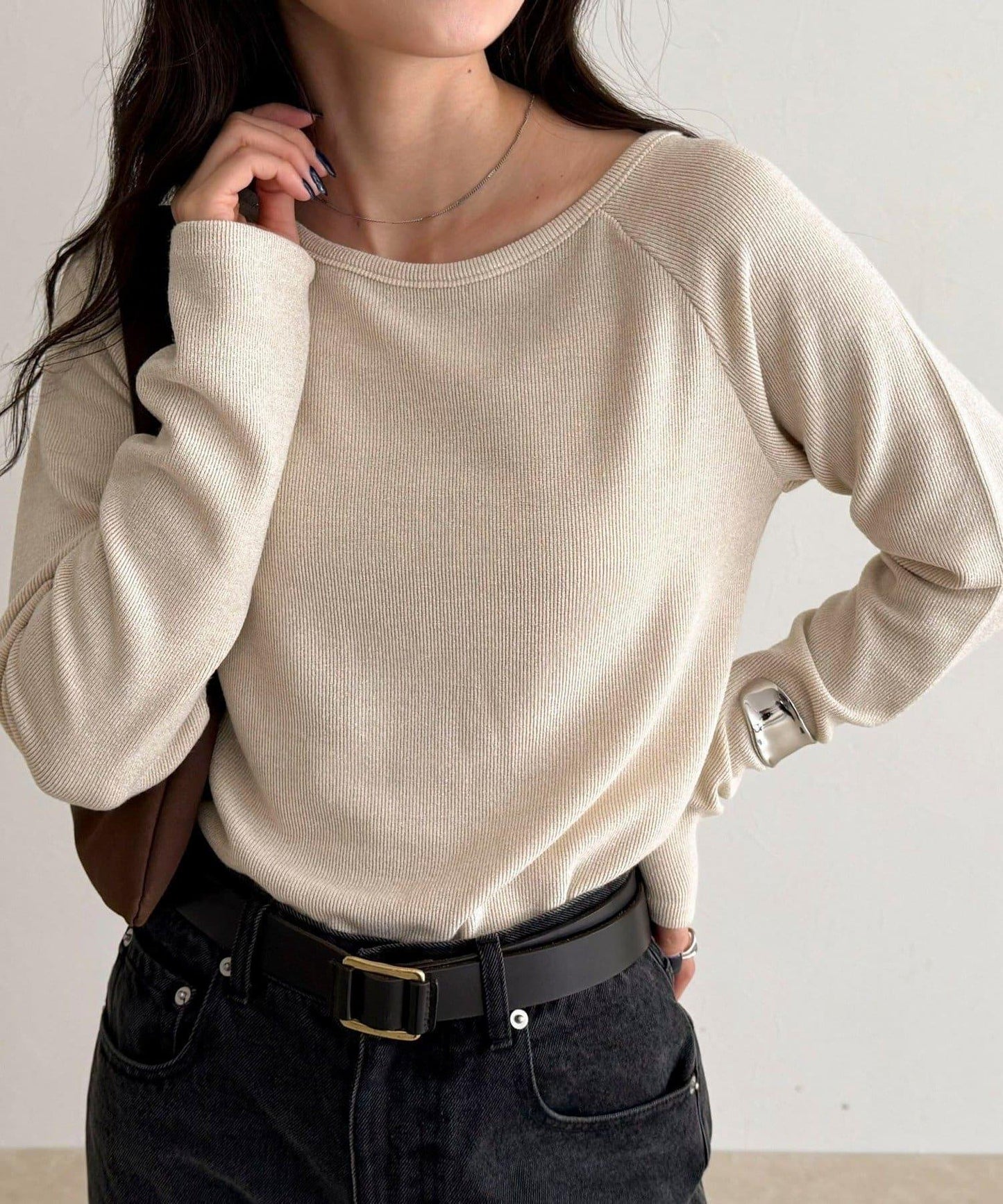 身高 156 厘米的工作人員(穿 38 號):恰到好處地貼合身體,肩部和腰部線條優美。彈性好,穿起來活動自如,很舒服。柔軟的面料貼膚感很好,薄片巧妙地閃耀著光澤,是提亮臉龐的好點子。領口處的船形領口設計,將骨架筆直的鎖骨線條展現得淋漓盡致,女人味十足。